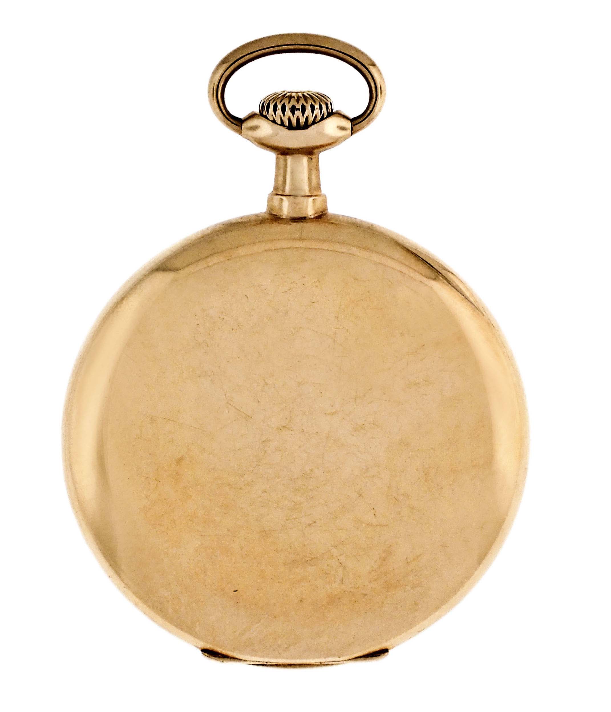 CASE: Small dents, band; Numerous fine scratches on outer surface of case; Case knife scratches on cuvette; Crown shell worn through; Precious metal content marked. DIAL: Faint hairlines; Small flakes at edge near setting lever. HANDS: Minor losses to color; Seconds replaced. MOVEMENT PLATES: Fine scratches on train bridge and balance cock; Scratch at one barrel bridge screw; Regulator, winding wheels, and click screw with specks of oxide; Balance cock with small gouge at jewel setting screw. MOVEMENT FUNCTION: Running order (winds, sets and ticks).