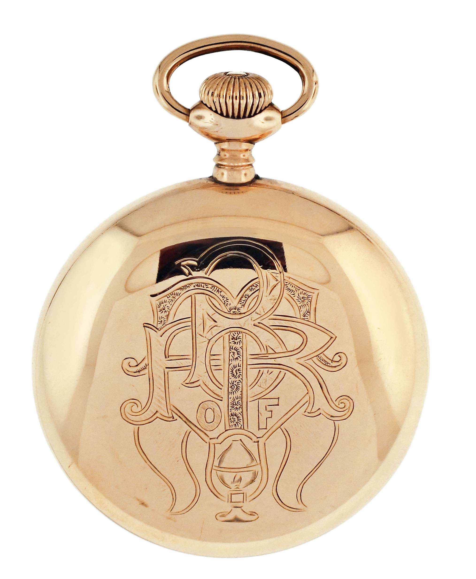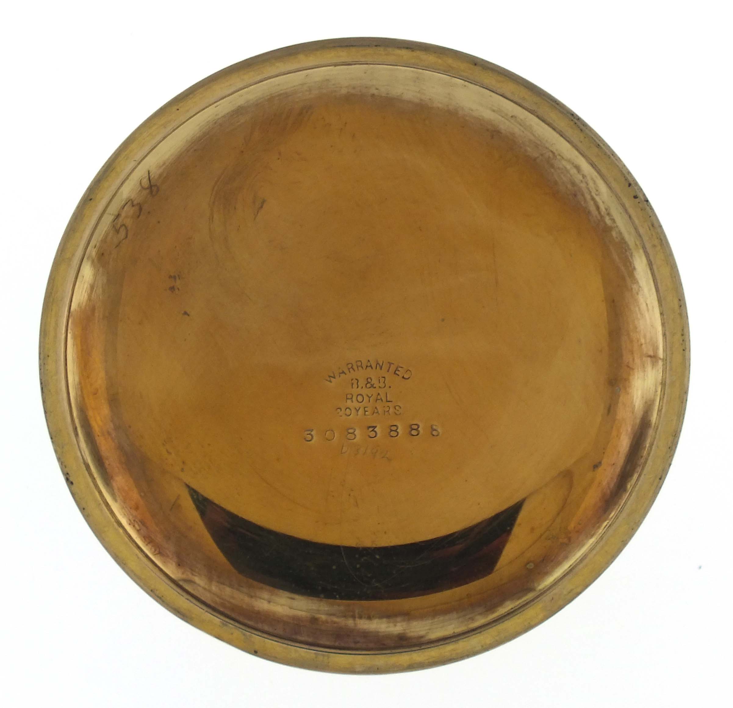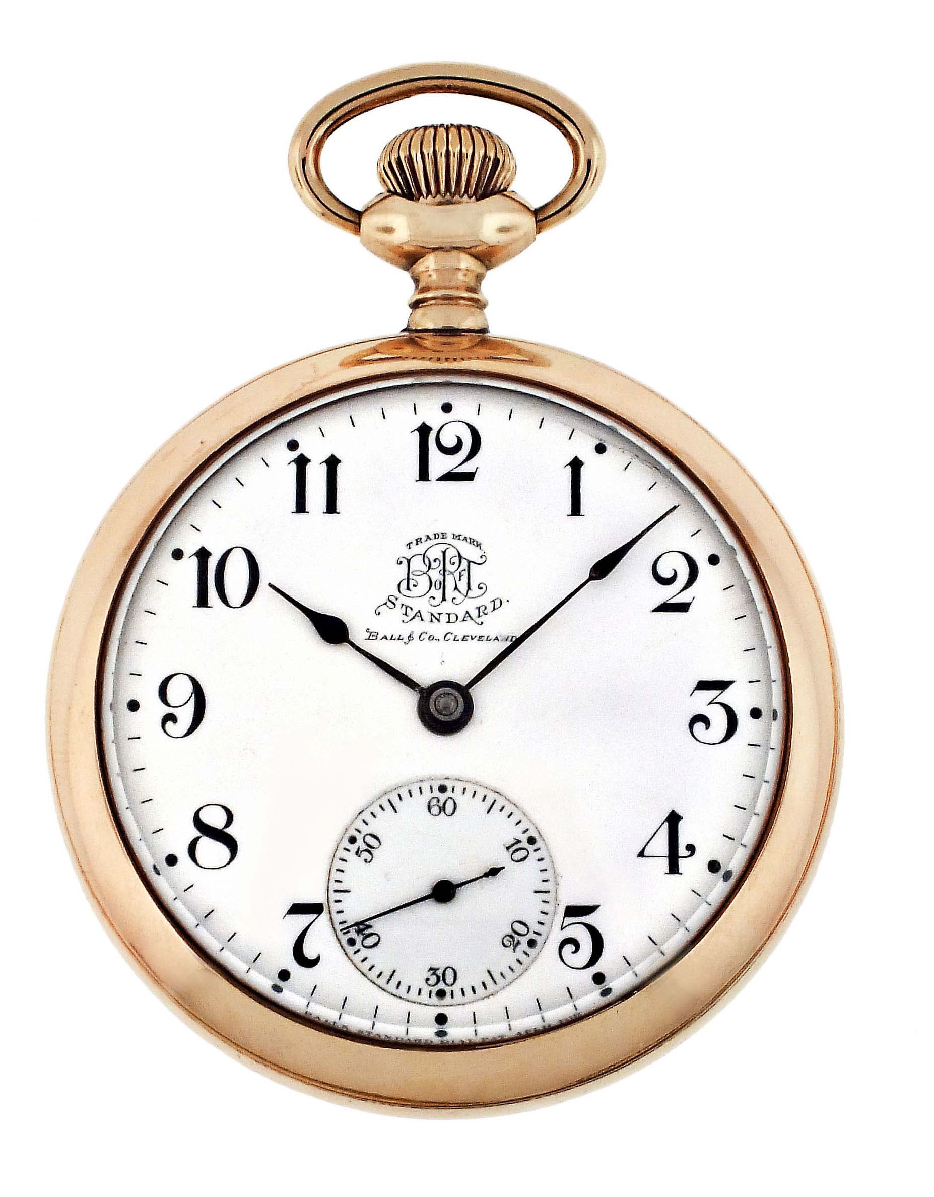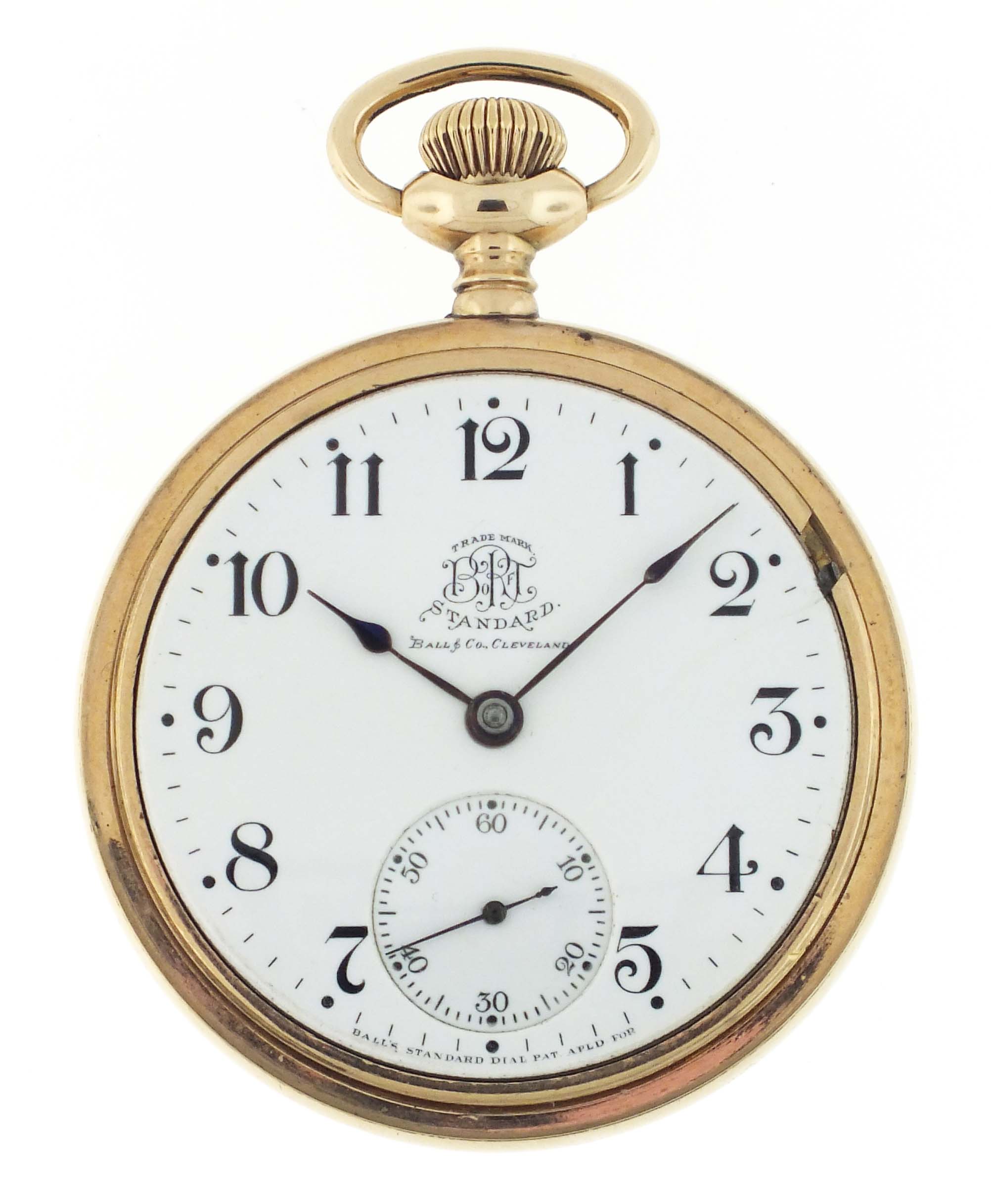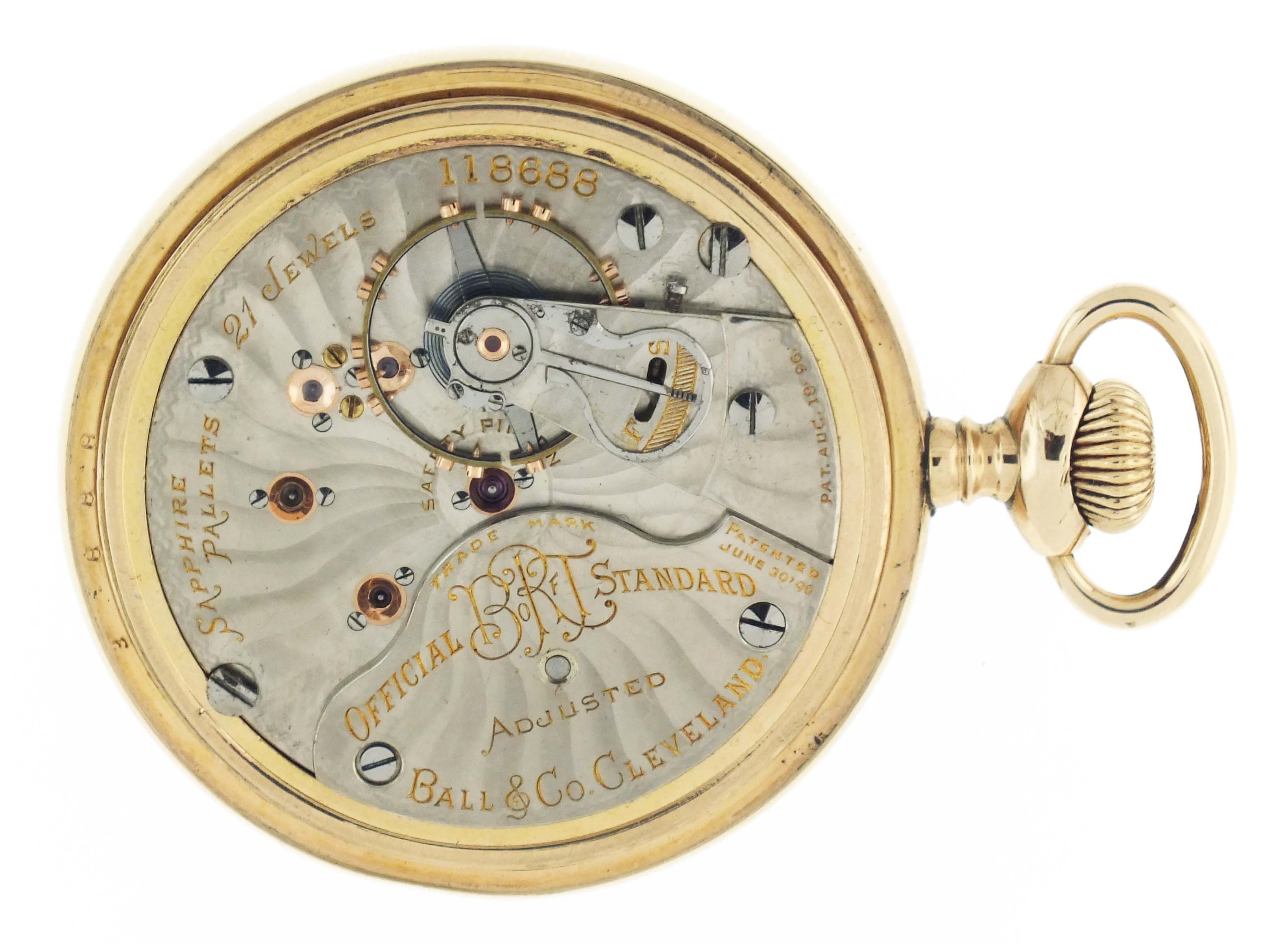Ball Watch Co., Cleveland, Ohio, a Hamilton 999A "Brotherhood of Railroad Trainmen" pocket watch, 18 size, 21 jewels, stem wind and lever set, adjusted to 5 positions and temperature, sunburst damascened nickel plate movement with lever escapement, cut bimetallic balance with gold screws, gold jewel settings, and micrometric regulator in a gold filled, screw back and bezel open face case with engraved B of RT cipher on back, arabic numeral, single sunk white enamel dial with plum colored steel spade hands, serial #118688