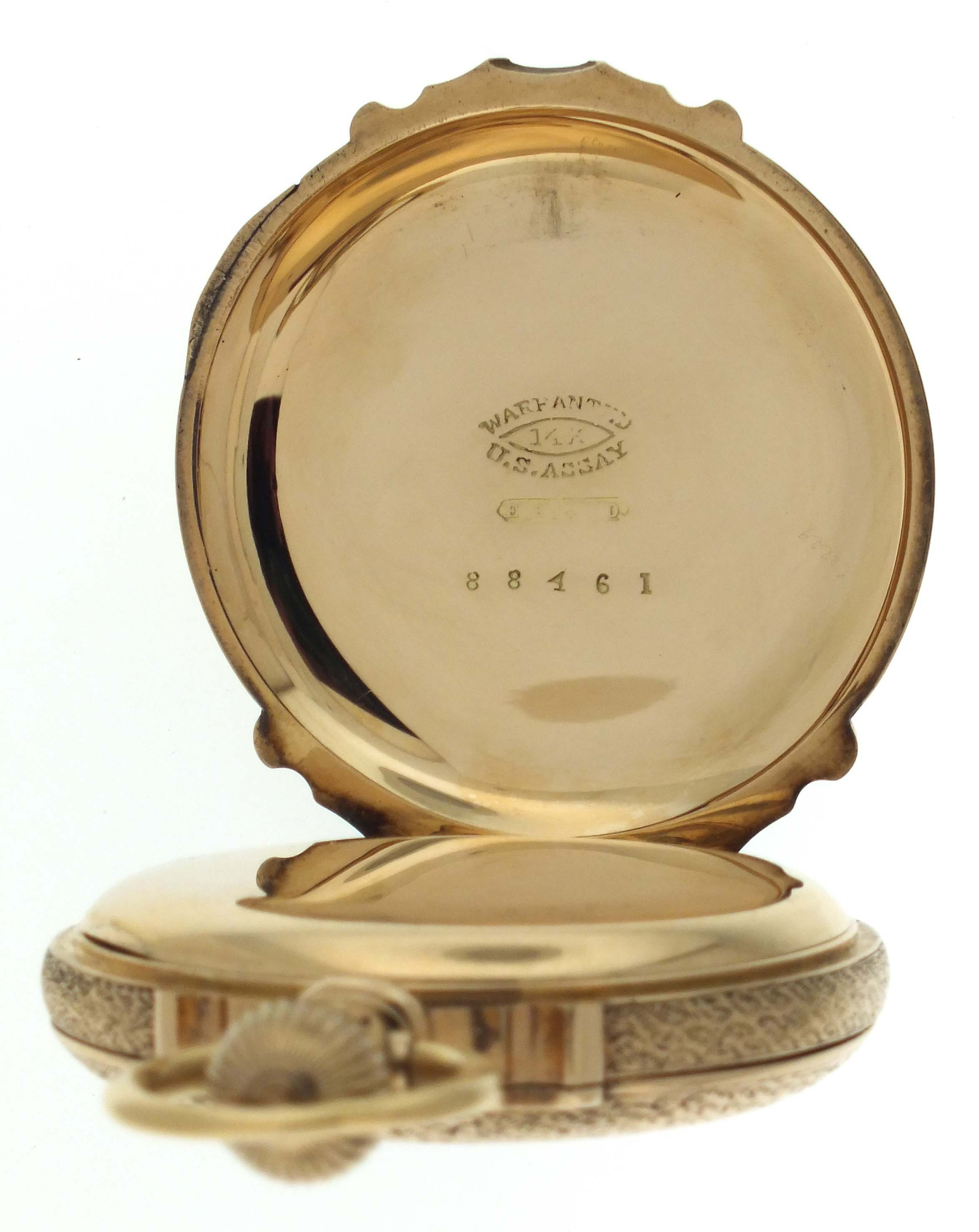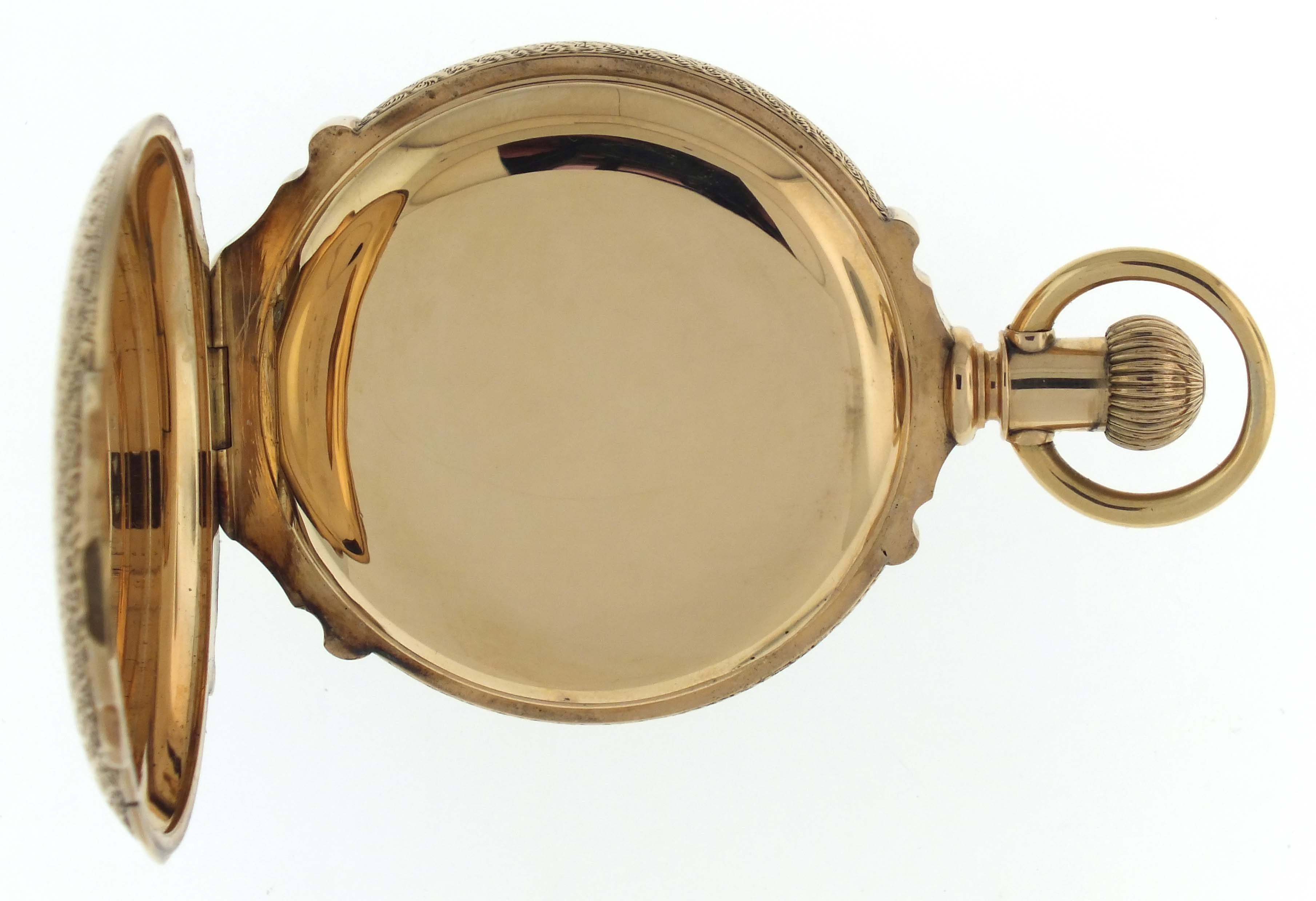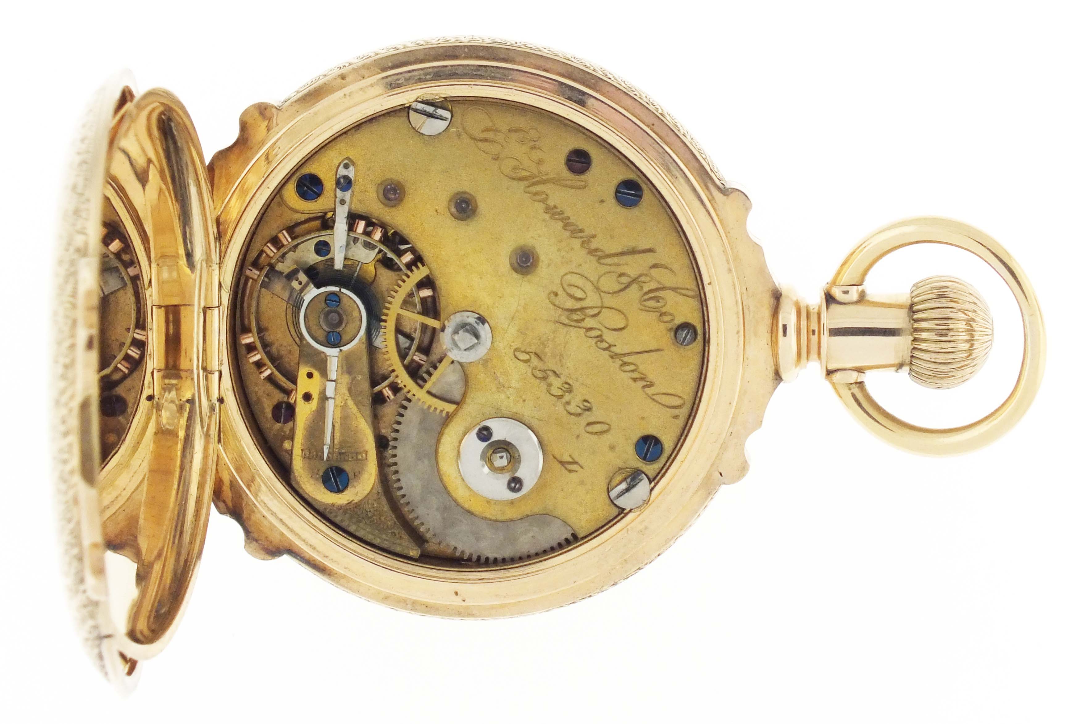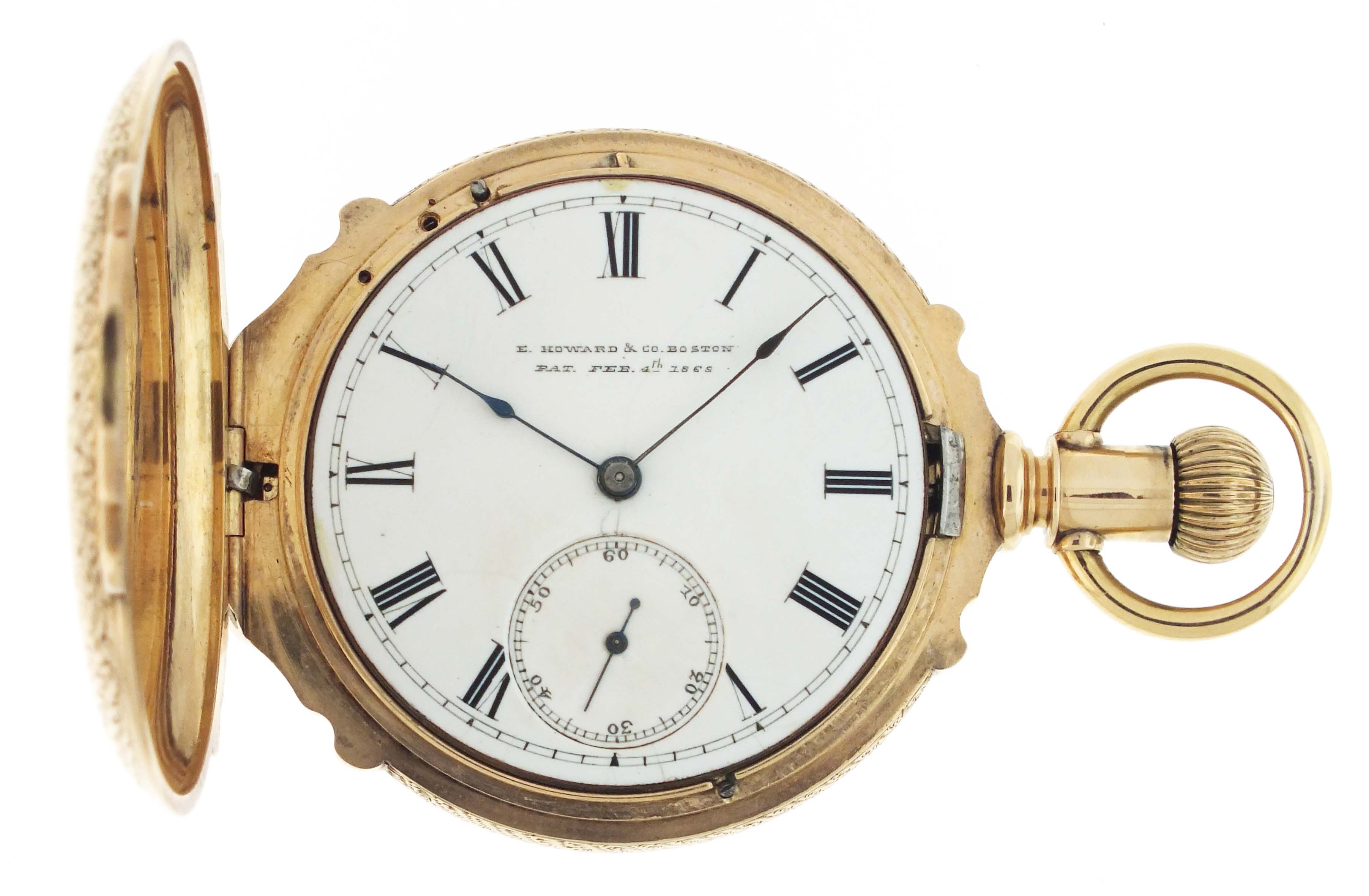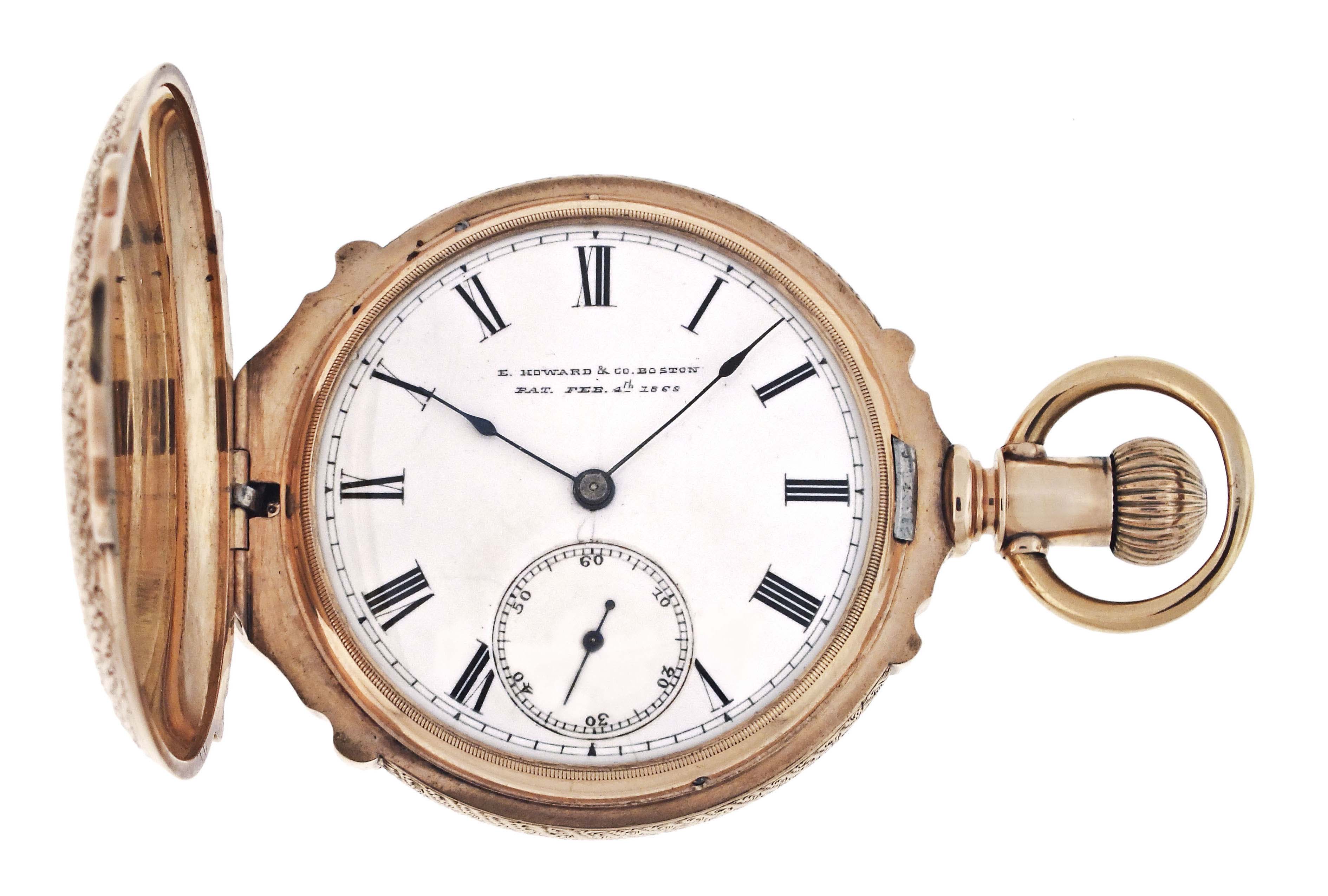E. Howard & Co., Boston, Mass., a gold series V pocket watch, L size, 15 jewels, stem wind and set gilt plate movement with lever escapement and cut bimetallic balance with gold screws in a 14 karat, yellow gold, engraved hunting case, arabic numeral, single sunk white enamel dial with blued steel spade hands, serial #55330, 121.1g TW