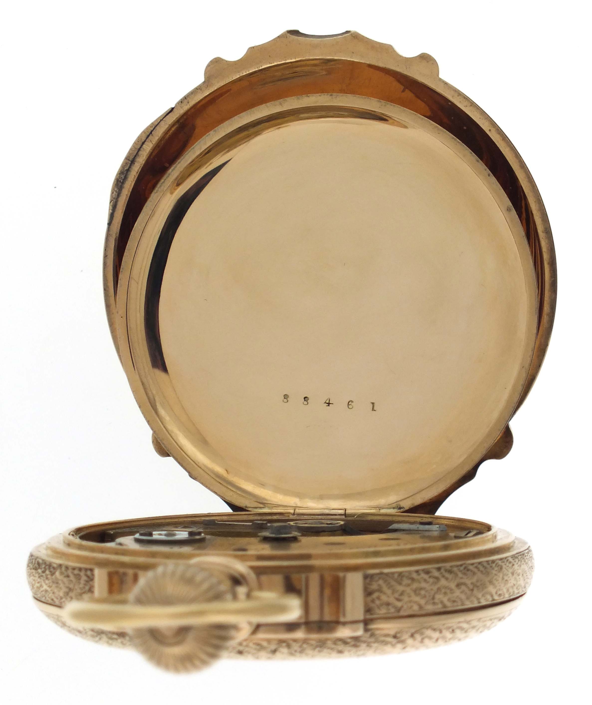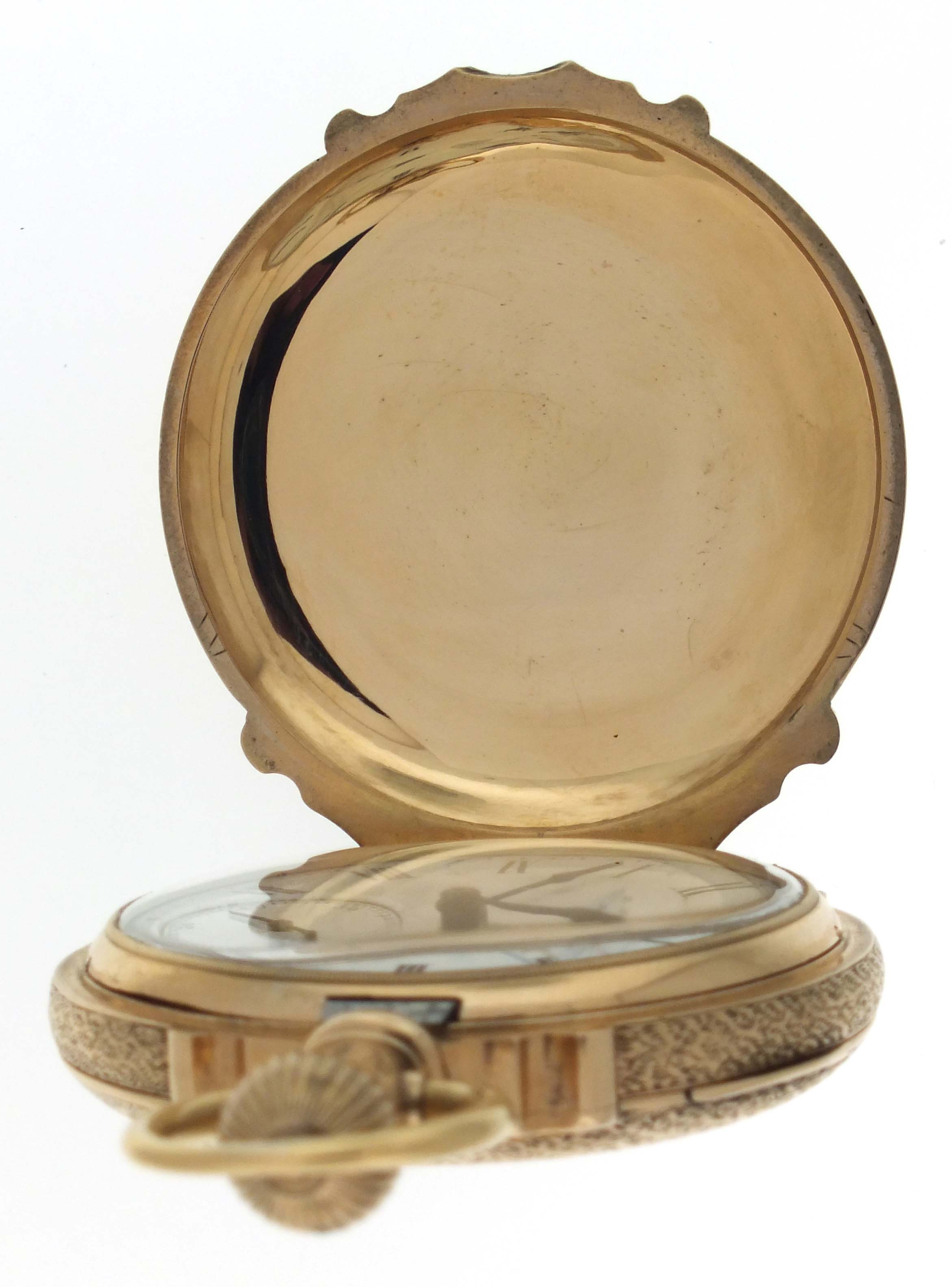 CASE: Very fine scratches on outer surface of case; Very fine scratches on cuvette; Engraving with minor wear; Stem/ crown sticking when pressed, must be pulled up to return catch to locking position, tube needs replacement; One corner of front hinge with significant wear/ rounding; Bow with minor wear; Crown worn; Precious metal content marked. DIAL: Hairlines; Chip at center of seconds bit. HANDS: Replaced. MOVEMENT PLATES: Fine scratches on plate; Spotting; Losses to gilding; Lacking regulator spring; Regulator with a few specks of oxide; Dirty. MOVEMENT FUNCTION: Running order (winds, sets and ticks); Low amplitude, needs service.