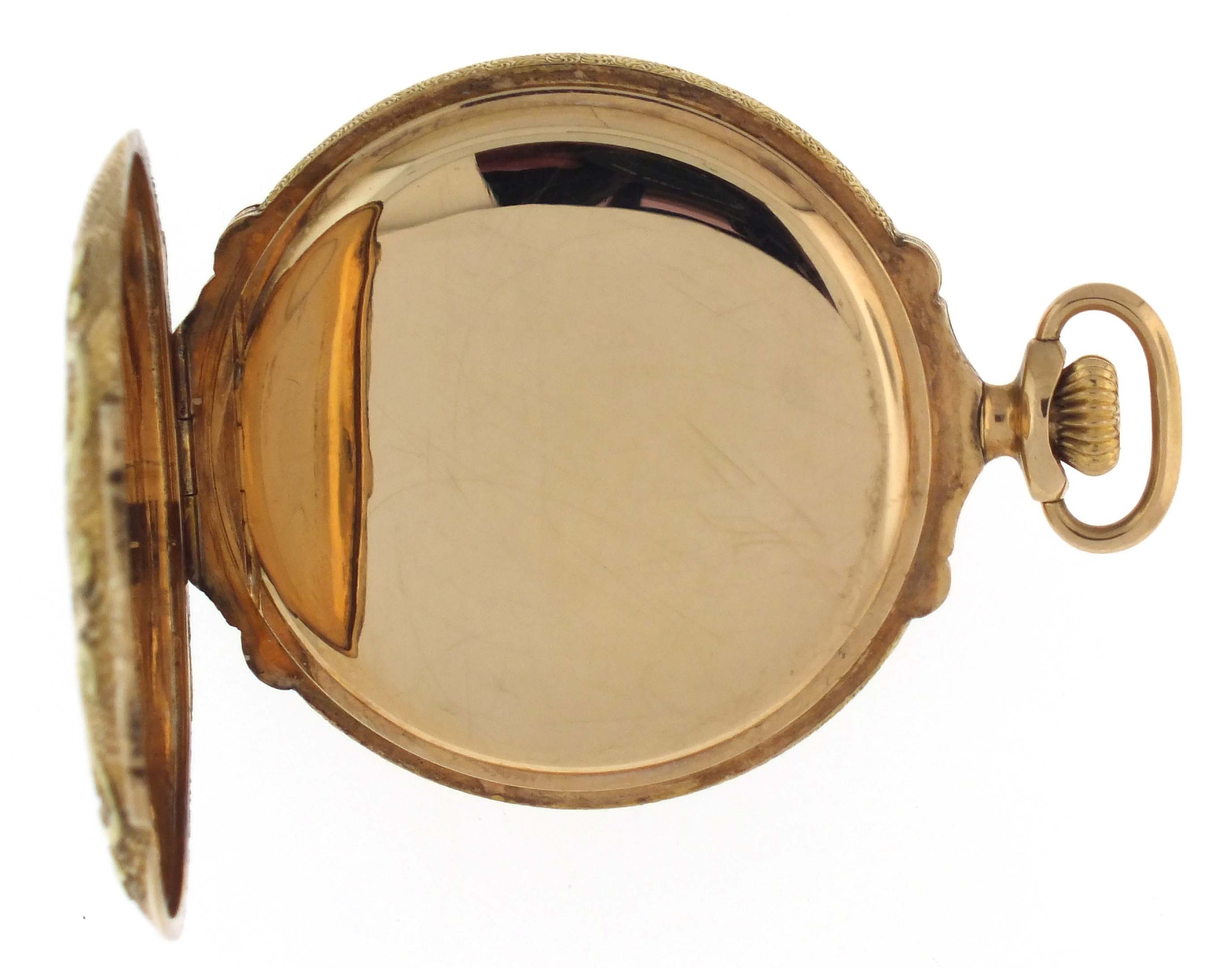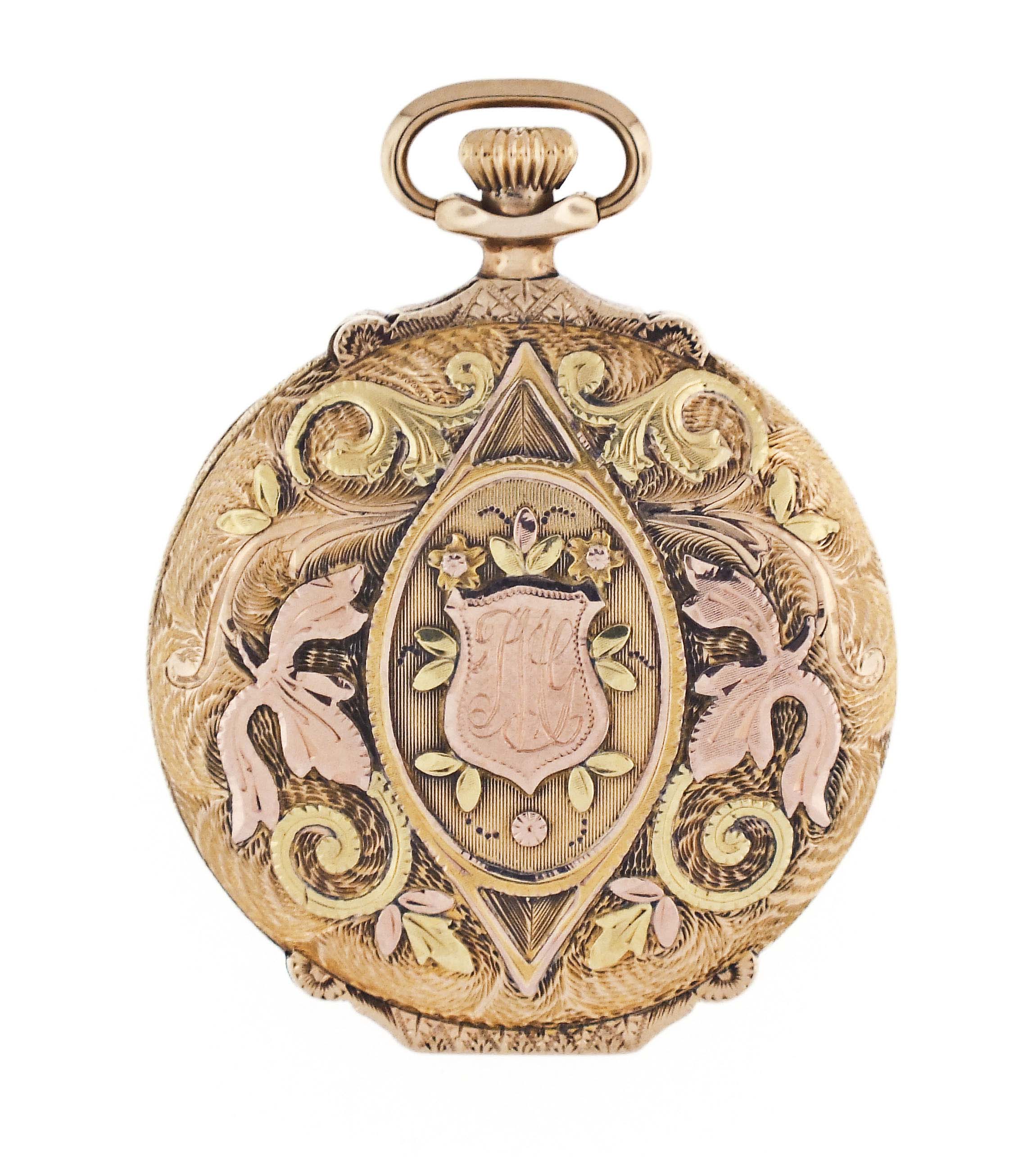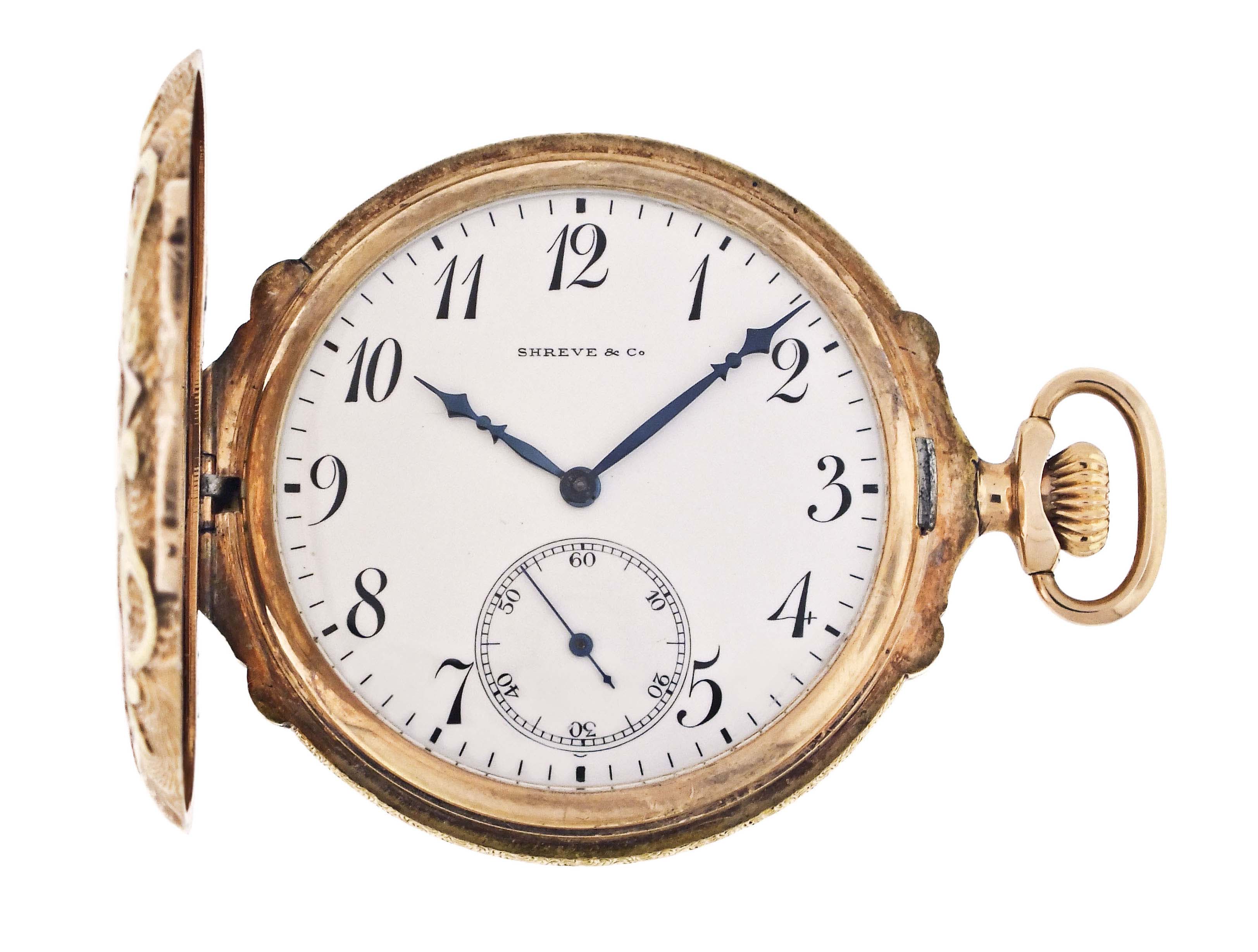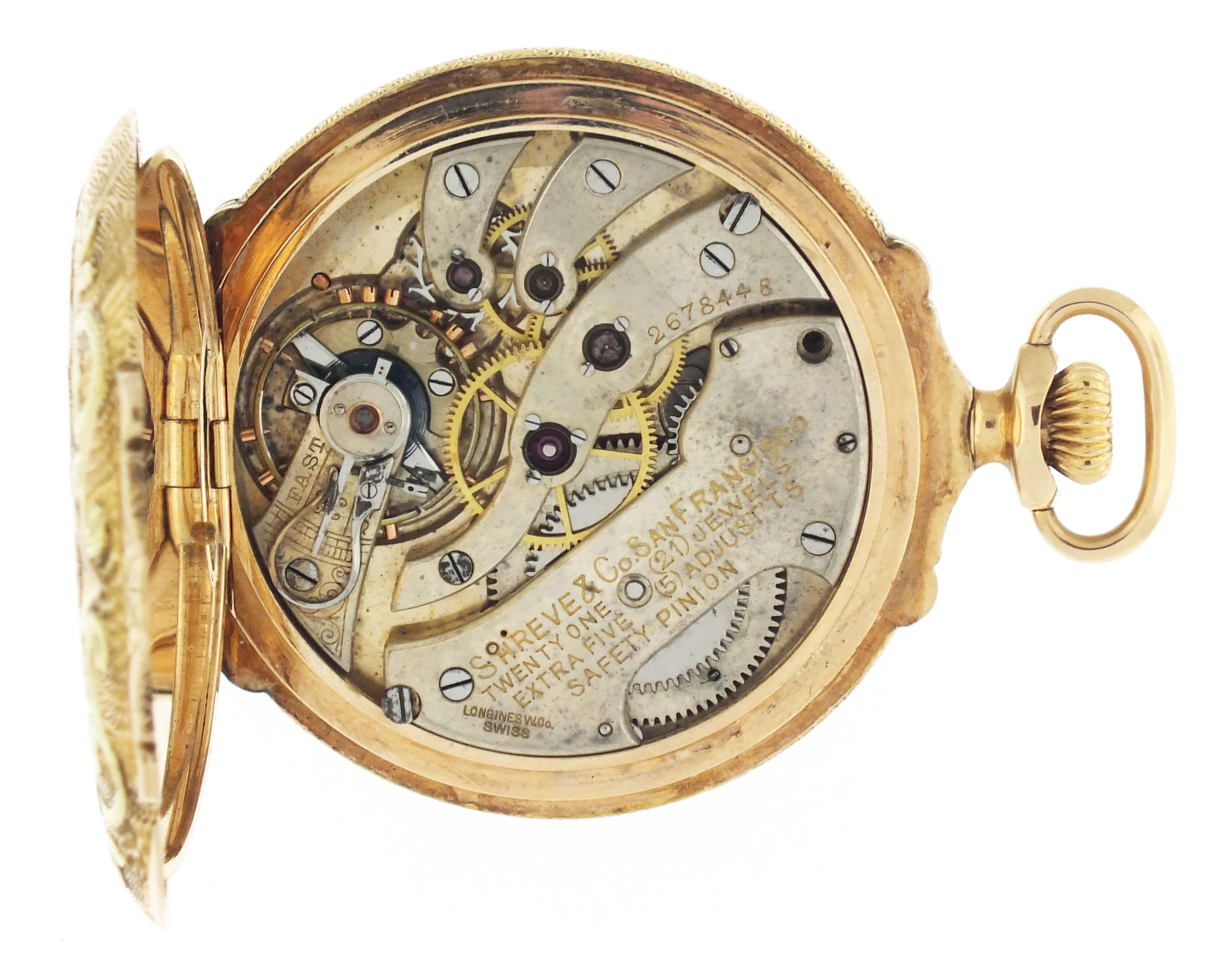 Longines, Switzerland, for Shreve & Co., San Francisco, an early 20th century pocket watch, 21 jewels, stem wind and set, adjusted, cotes de Geneve decorated nickel bar movement with lever escapement, cut bimetallic balance with gold screws, and whiplash micrometric regulator in a 14 karat, yellow gold, engraved, box hinge hunting case with applied three color gold floral and foliate ornament, arabic numeral, single sunk white enamel dial with blued steel hands, serial #2678448, 45.5mm, 75.7g TW
