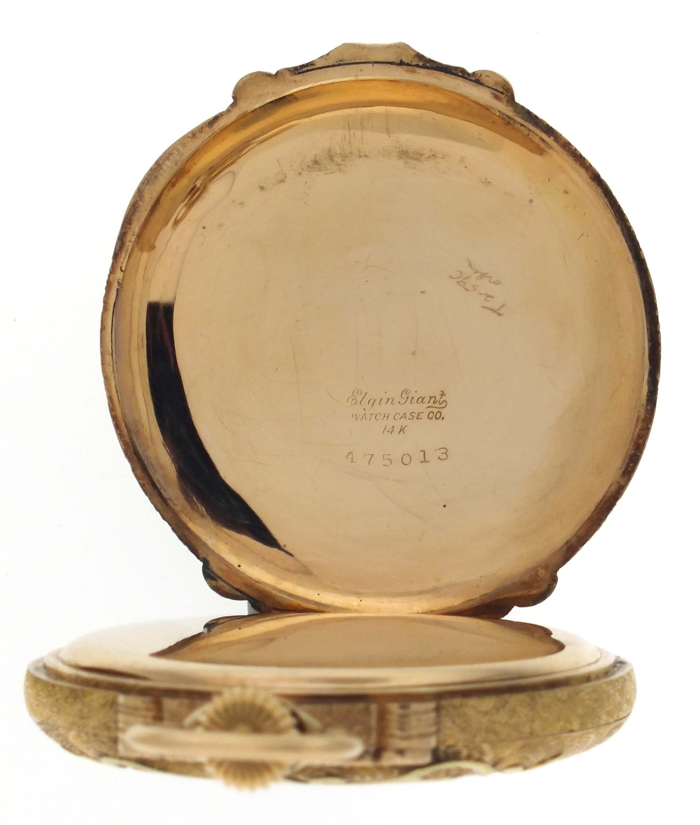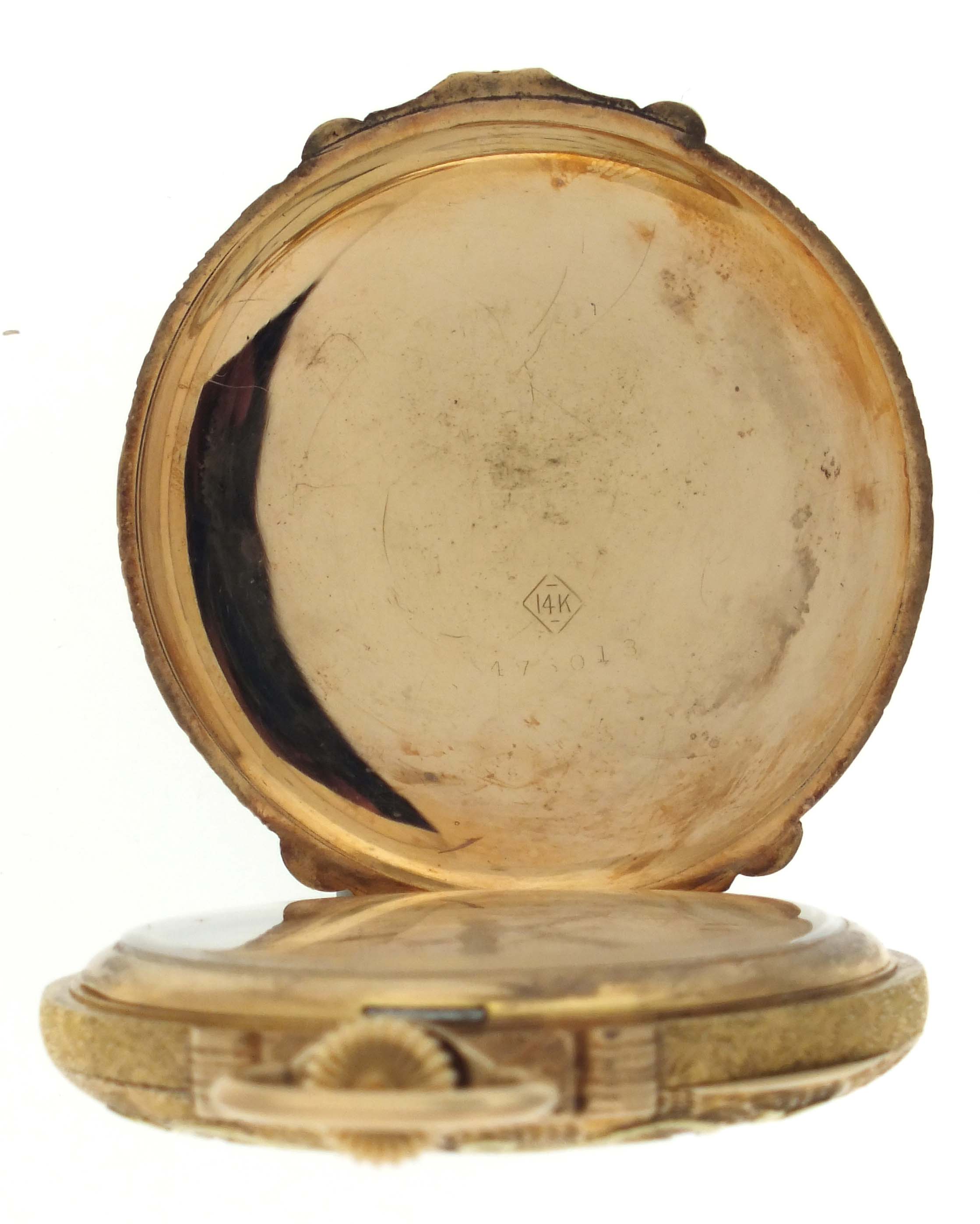 CASE: Case with very little wear; Shallow dent, back; Very fine scratches on outer surface of case; Very fine scratches on cuvette; Fine case knife scratches on cuvette; Significant pressure on crown required to release catch; Acrylic crystal; Bow with minor wear; Precious metal content marked. DIAL: Very faint hairline, 10:00. HANDS: Very good. MOVEMENT PLATES: Very fine scratches on plate; Spotting; Lacking one barrel bridge screw; Regulator assembly and a few screws with oxide; Upper center wheel jewel cracked; Upper third wheel jewel fractured; Dirty. MOVEMENT FUNCTION: Not running, good staff, needs service and repairs.