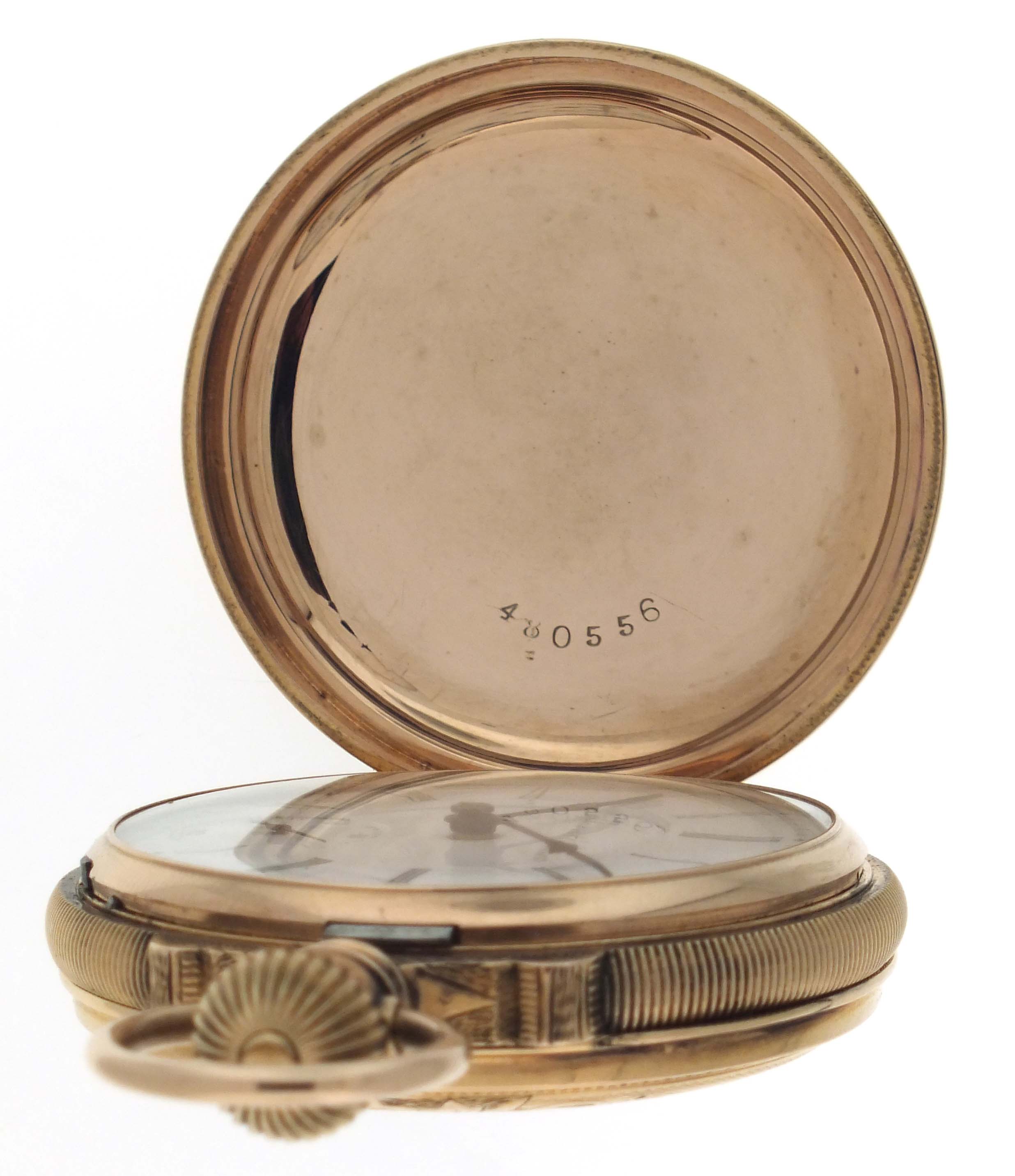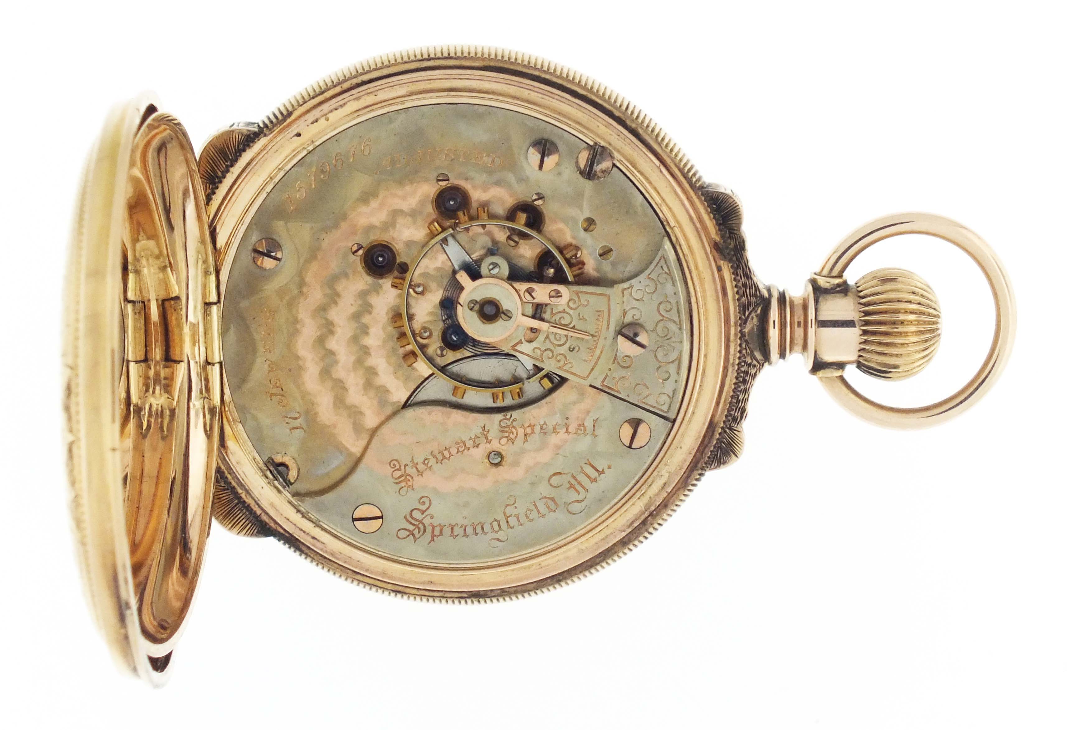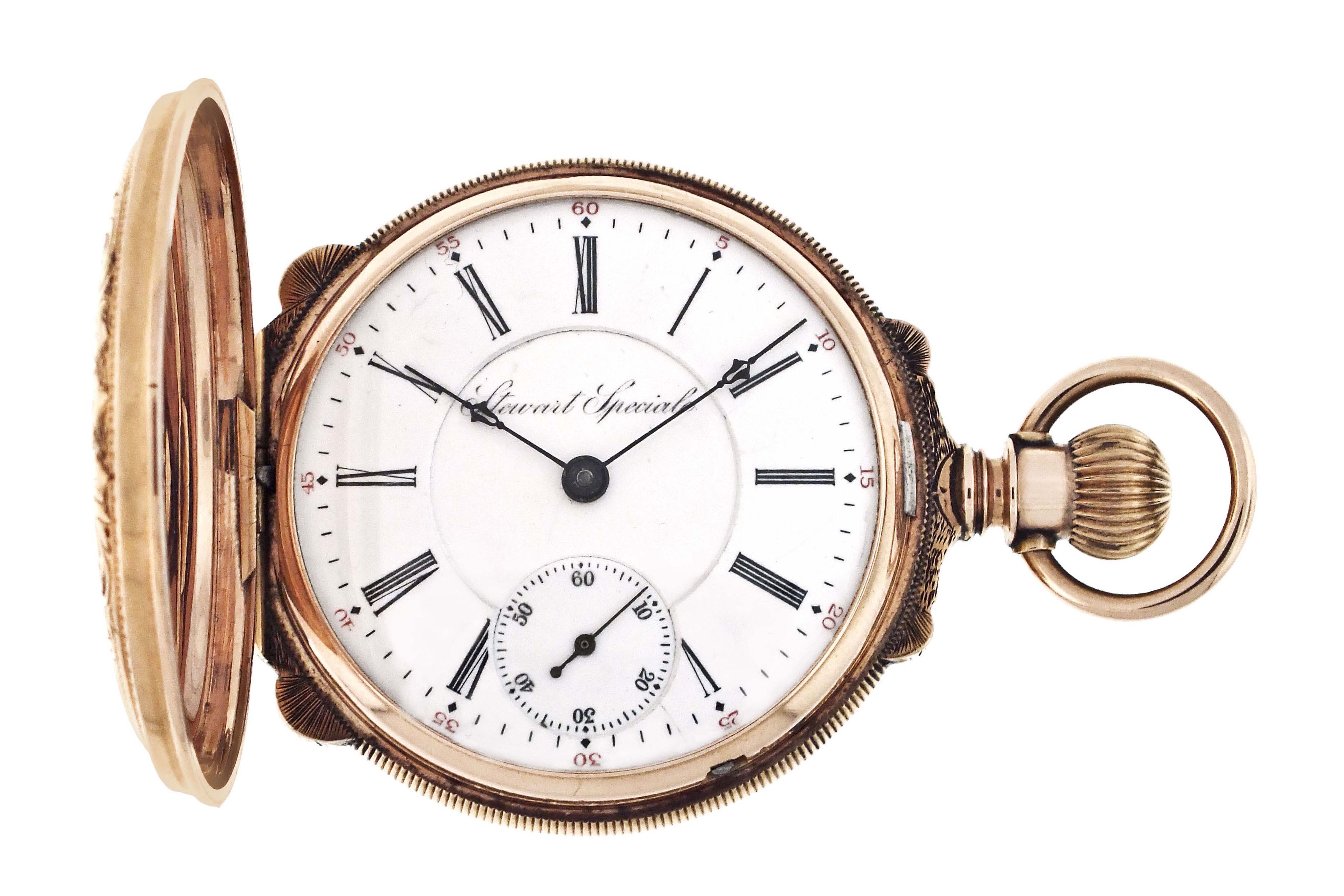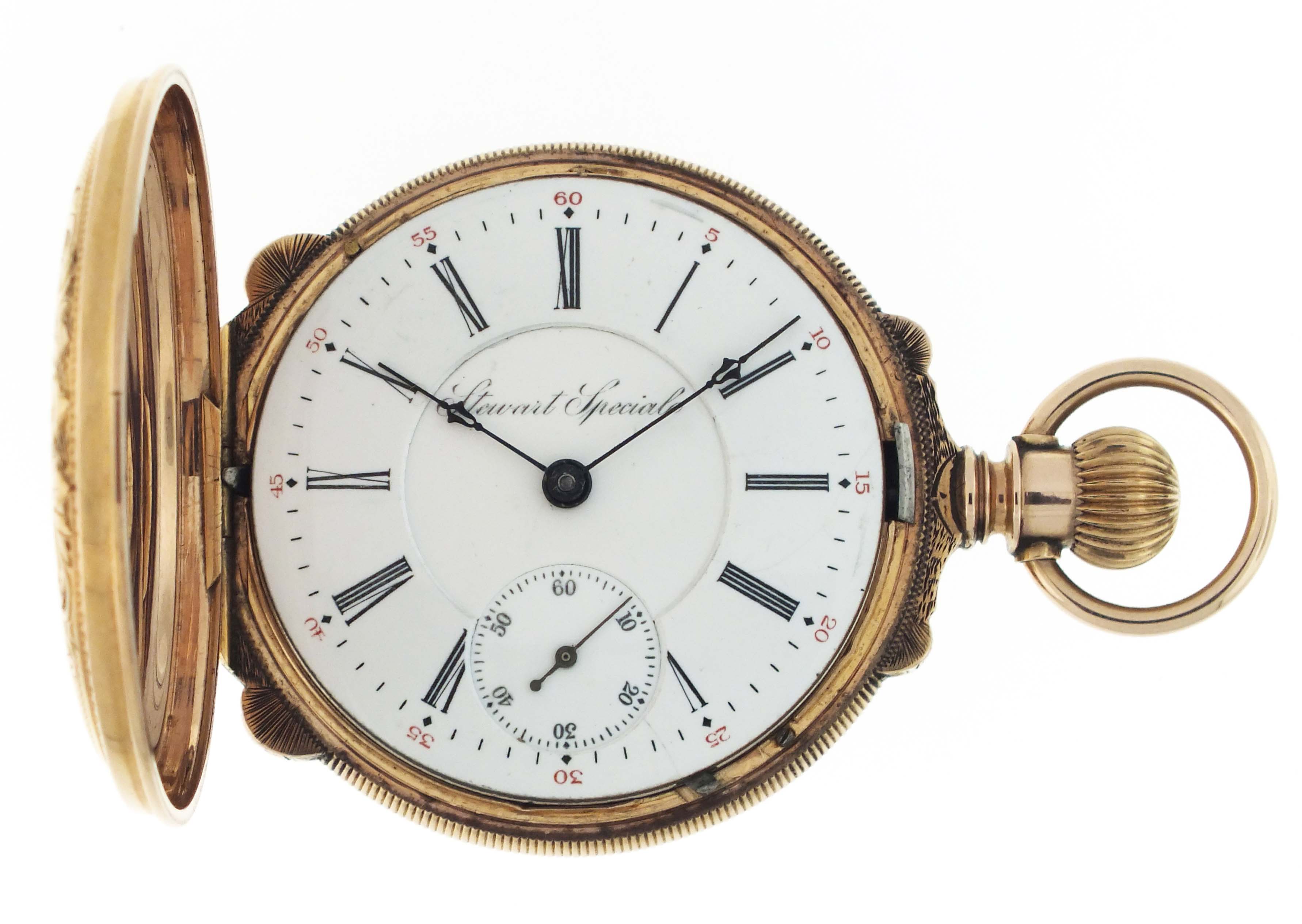 Illinois Watch Co., Springfield, Illinois, an early 20th century "Stewart Special" pocket watch, 18 size, 17 jewels, stem wind and lever set, adjusted, two tone damascened nickel plate movement with lever escapement, cut bimetallic balance with gold screws, gold jewel settings, and micrometric regulator in an 8 and 14 karat yellow gold, reeded edge, engine turned and engraved, faux box hinge hunting case, roman numeral, outer red 5-minute markers, double sunk white enamel dial signed "Stewart Special", and with blued steel open morning glory hands, serial #1579676, 119.2g TW