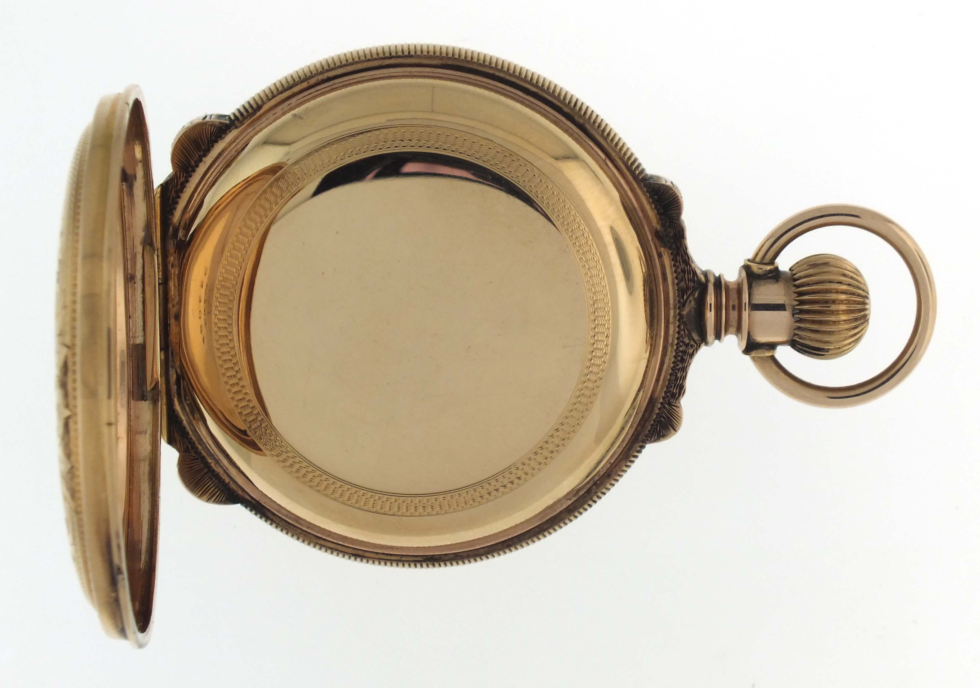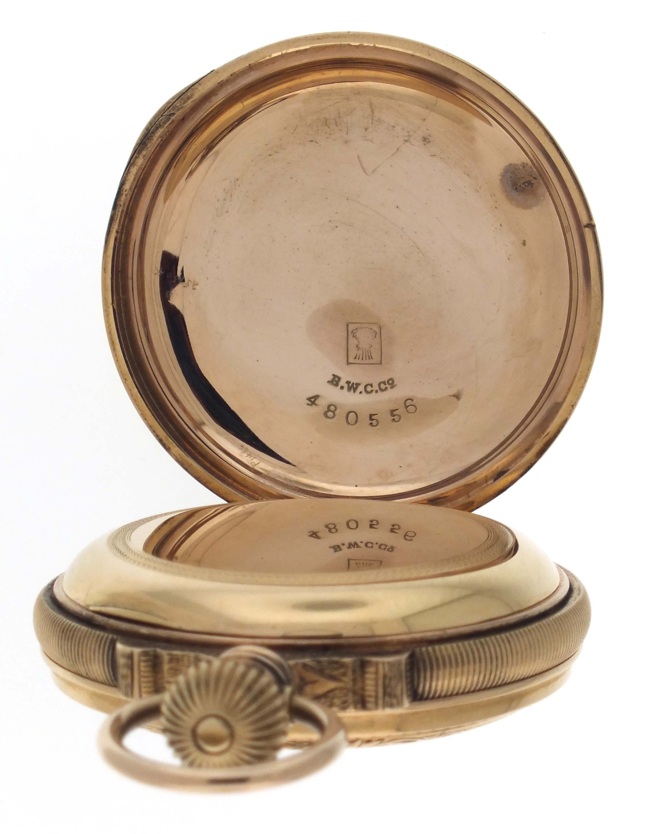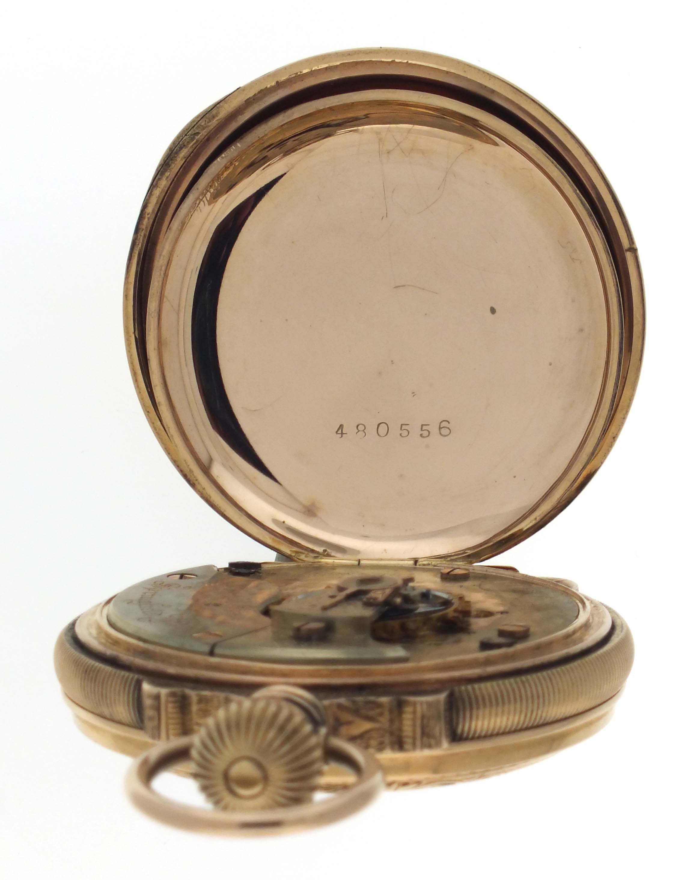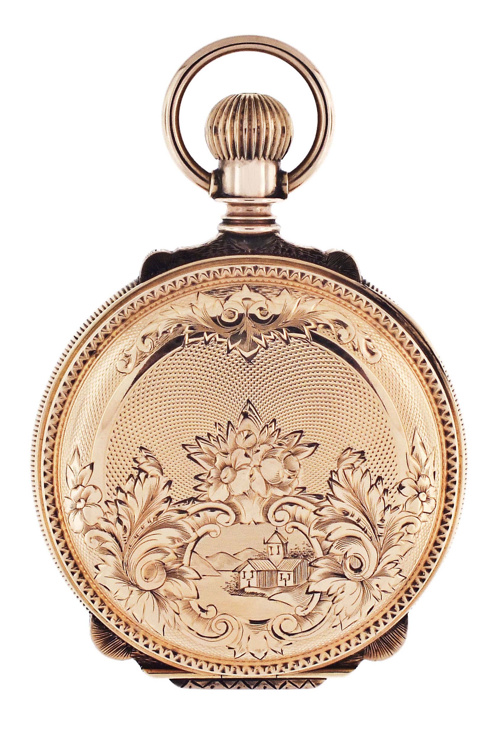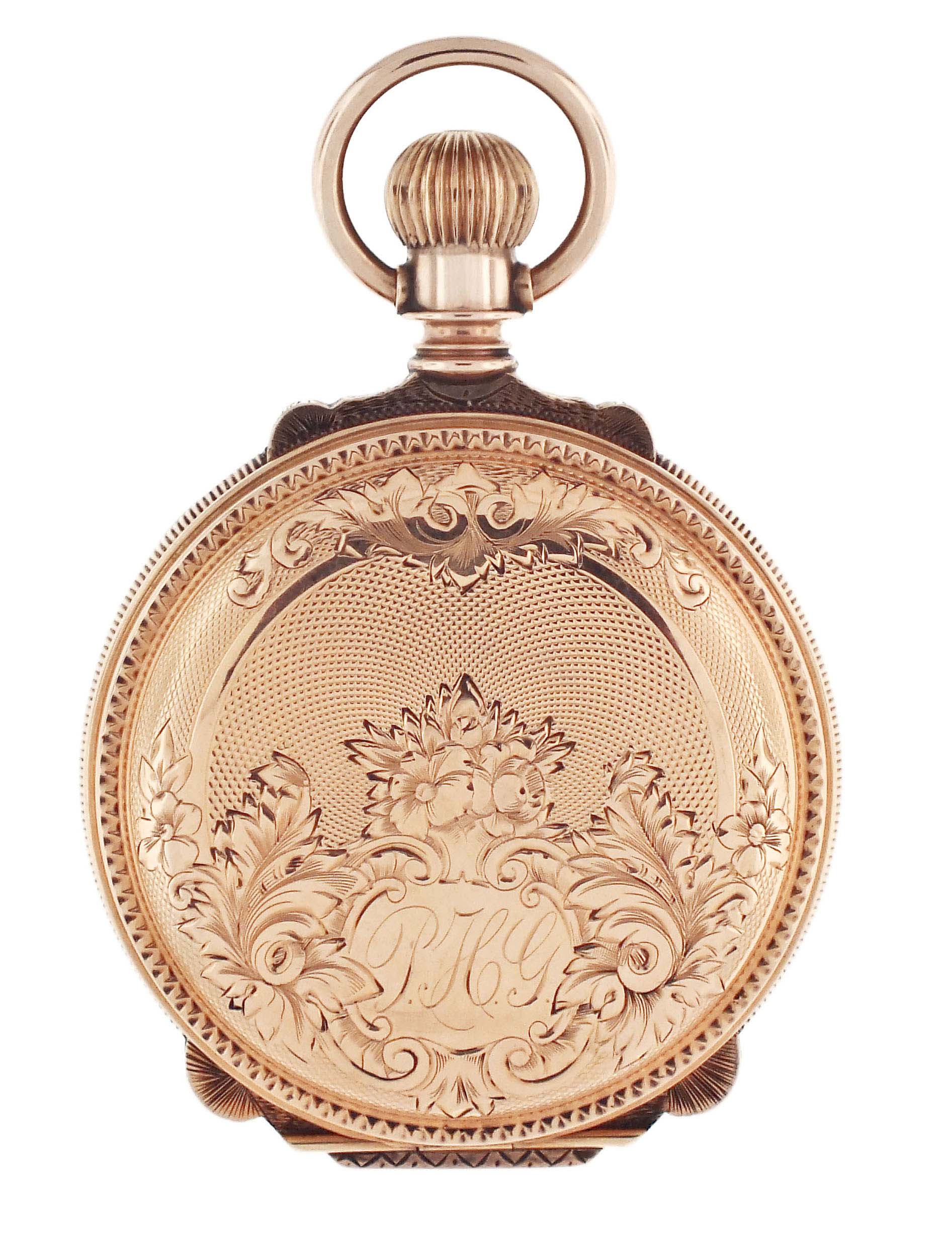 Illinois Watch Co., Springfield, Illinois, an early 20th century "Stewart Special" pocket watch, 18 size, 17 jewels, stem wind and lever set, adjusted, two tone damascened nickel plate movement with lever escapement, cut bimetallic balance with gold screws, gold jewel settings, and micrometric regulator in an 8 and 14 karat yellow gold, reeded edge, engine turned and engraved, faux box hinge hunting case, roman numeral, outer red 5-minute markers, double sunk white enamel dial signed "Stewart Special", and with blued steel open morning glory hands, serial #1579676, 119.2g TW