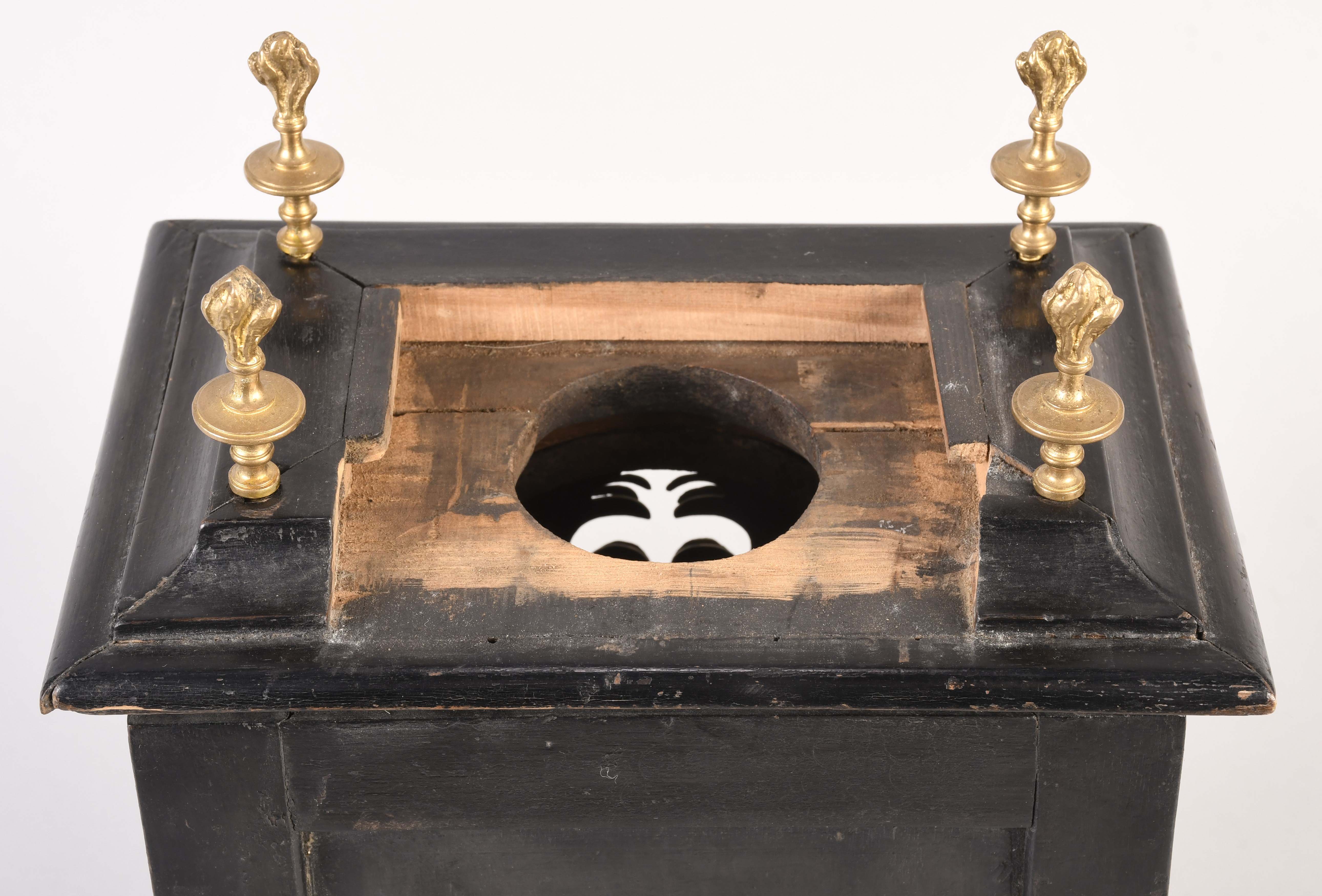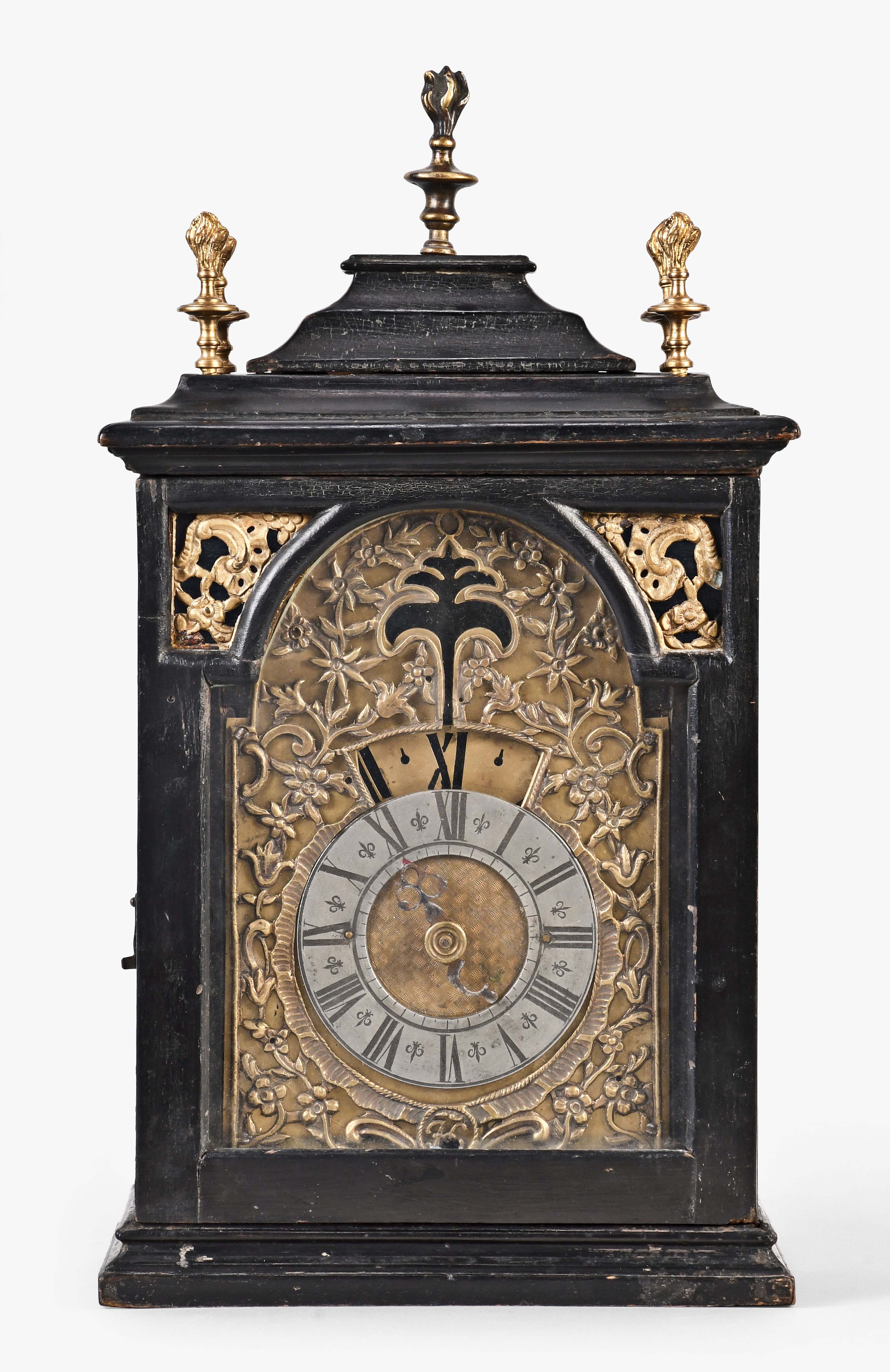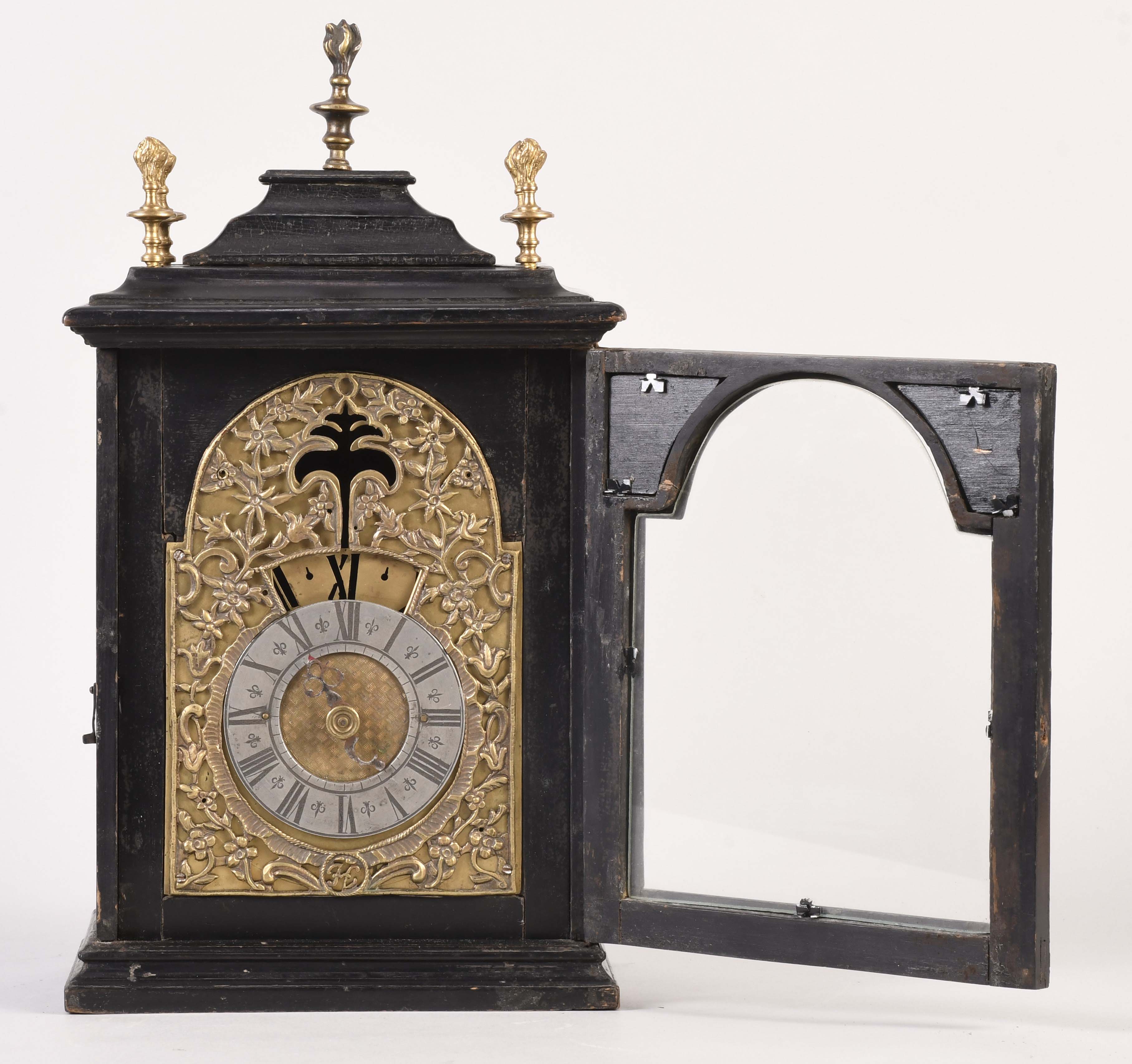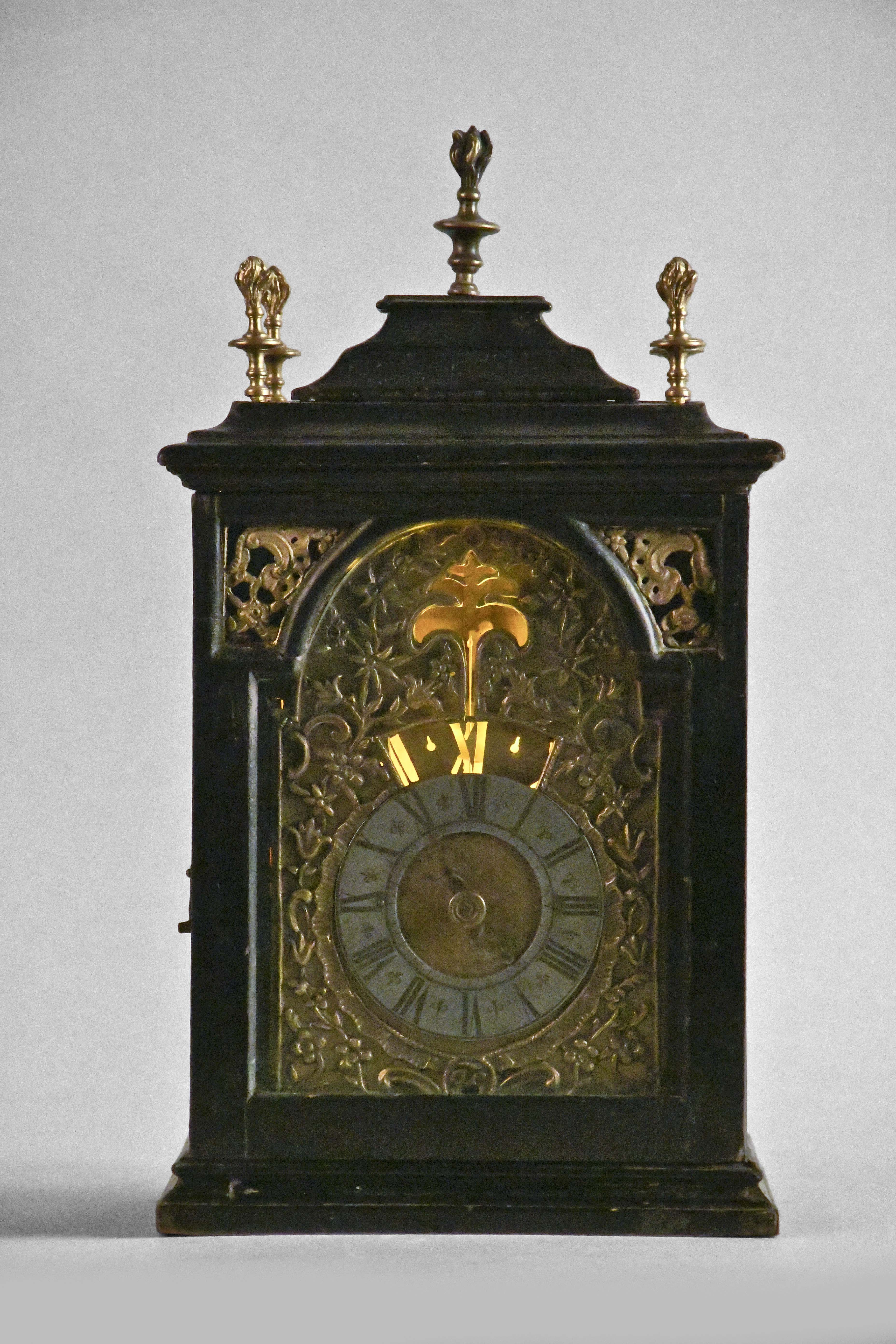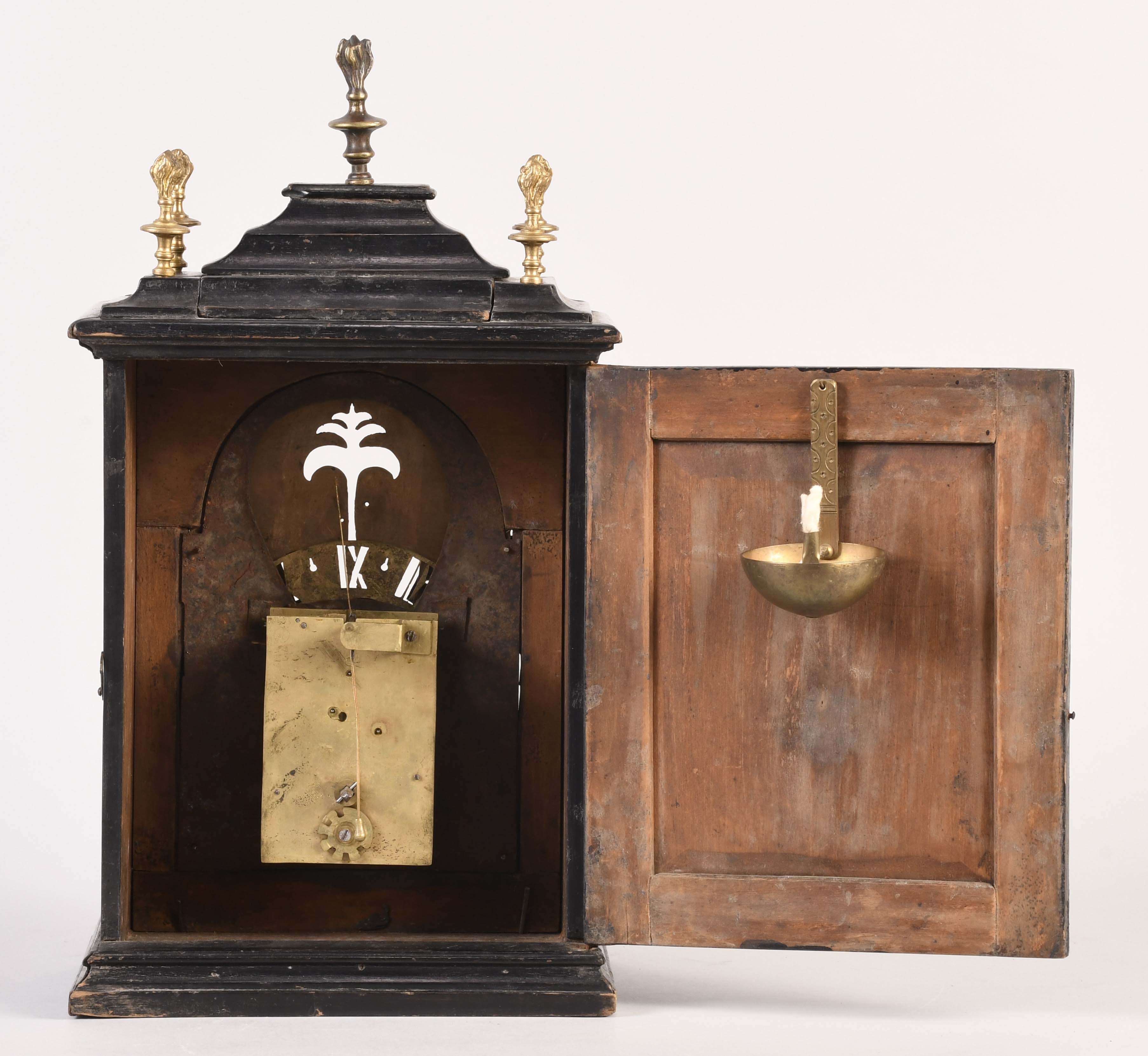 An unusual European night clock of indeterminate age, in the 18th century style, the ebonized, bracket style case with molded base, glazed door with break arch aperture and cast spandrels, molded top with five finials, the central portion sliding backward to reveal a hole for venting the flame, pewter roman numeral chapter ring with a single blued steel hand, and pierced, roman numeral wandering hour disc, illuminated from the back displaying the approximate time at night, brass break arch plate with pierced, cast mask with floral and foliate ornament, and a stylized tree form aperture to allow a view of the flag attached to the pallet arbor, 30 or 60 hour spring driven brass timepiece movement with verge escapement and bob pendulum