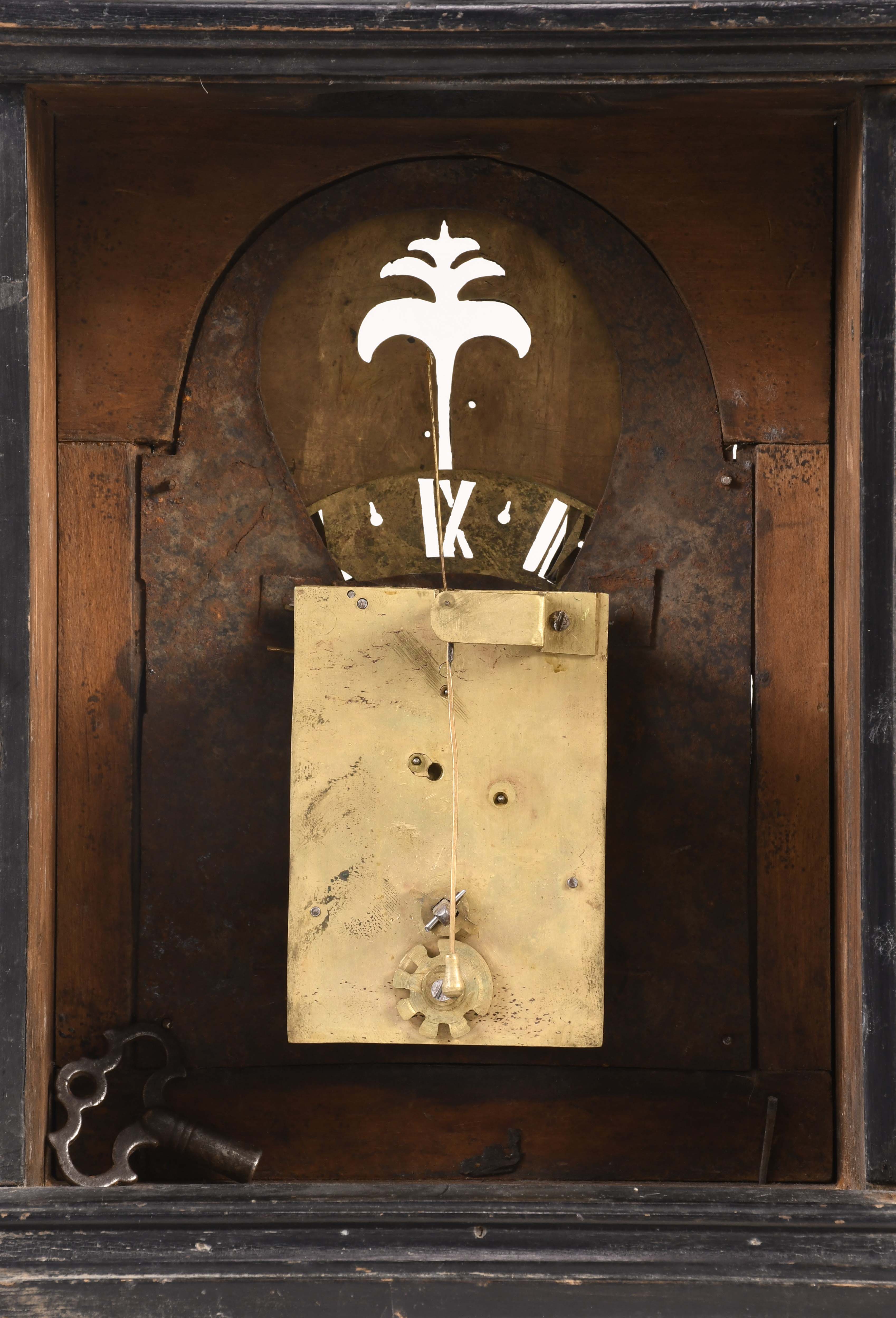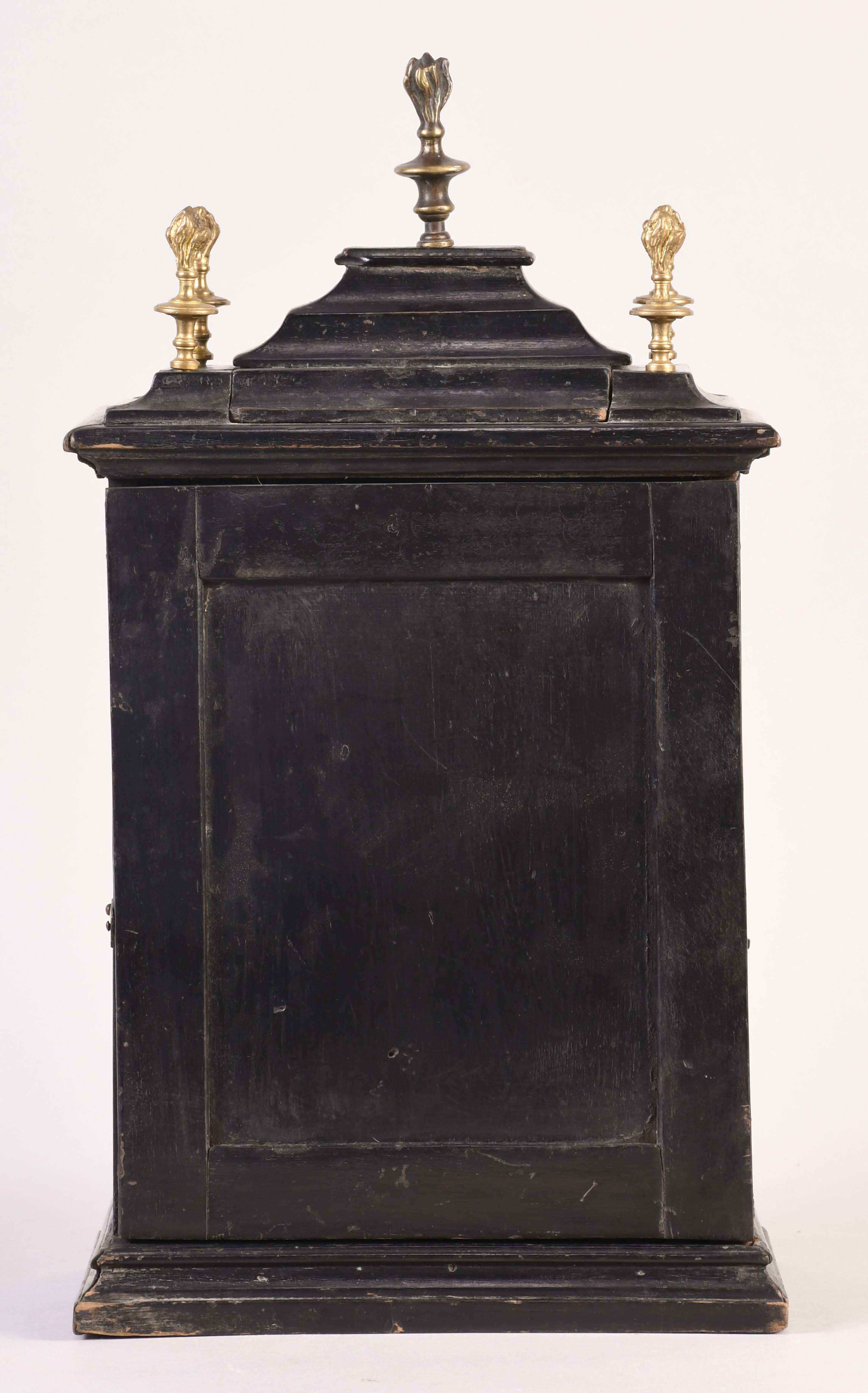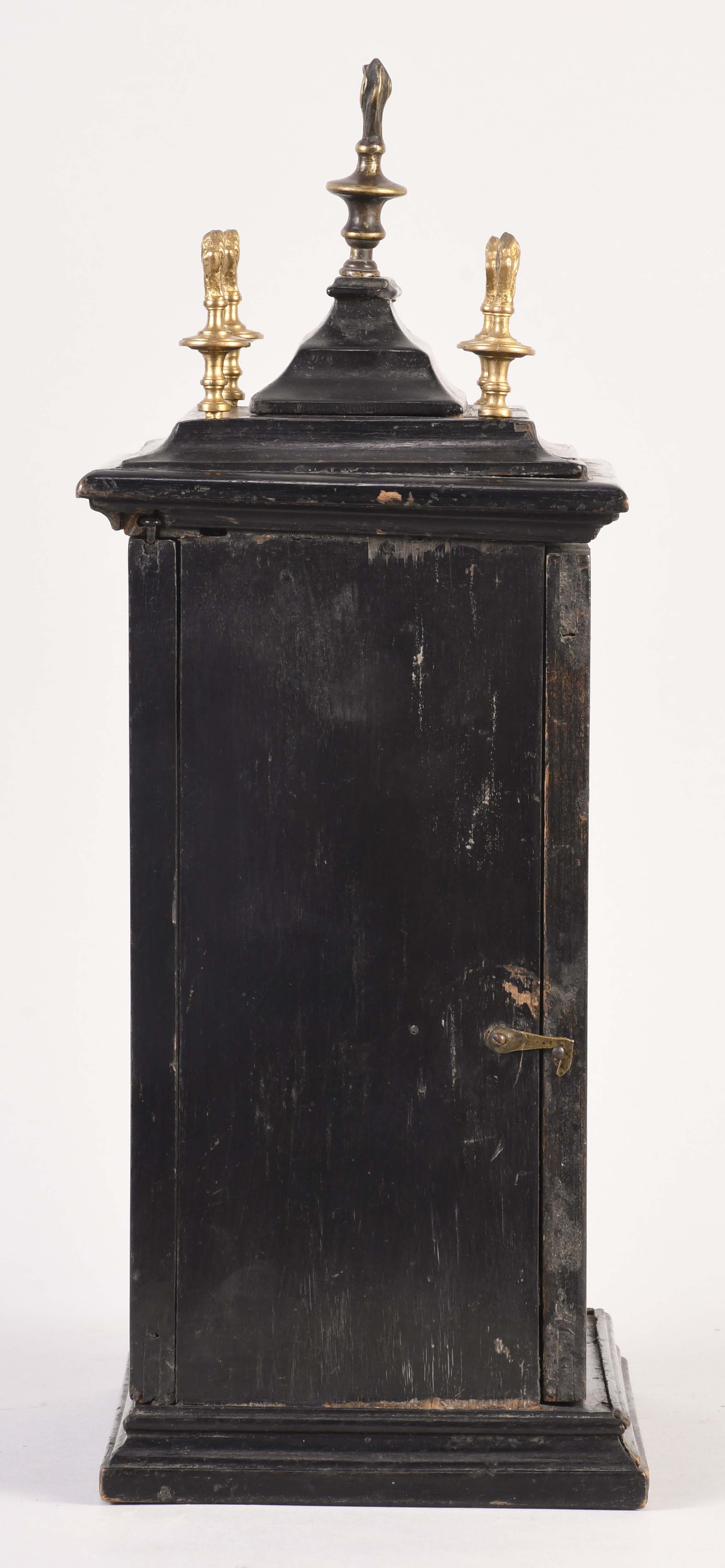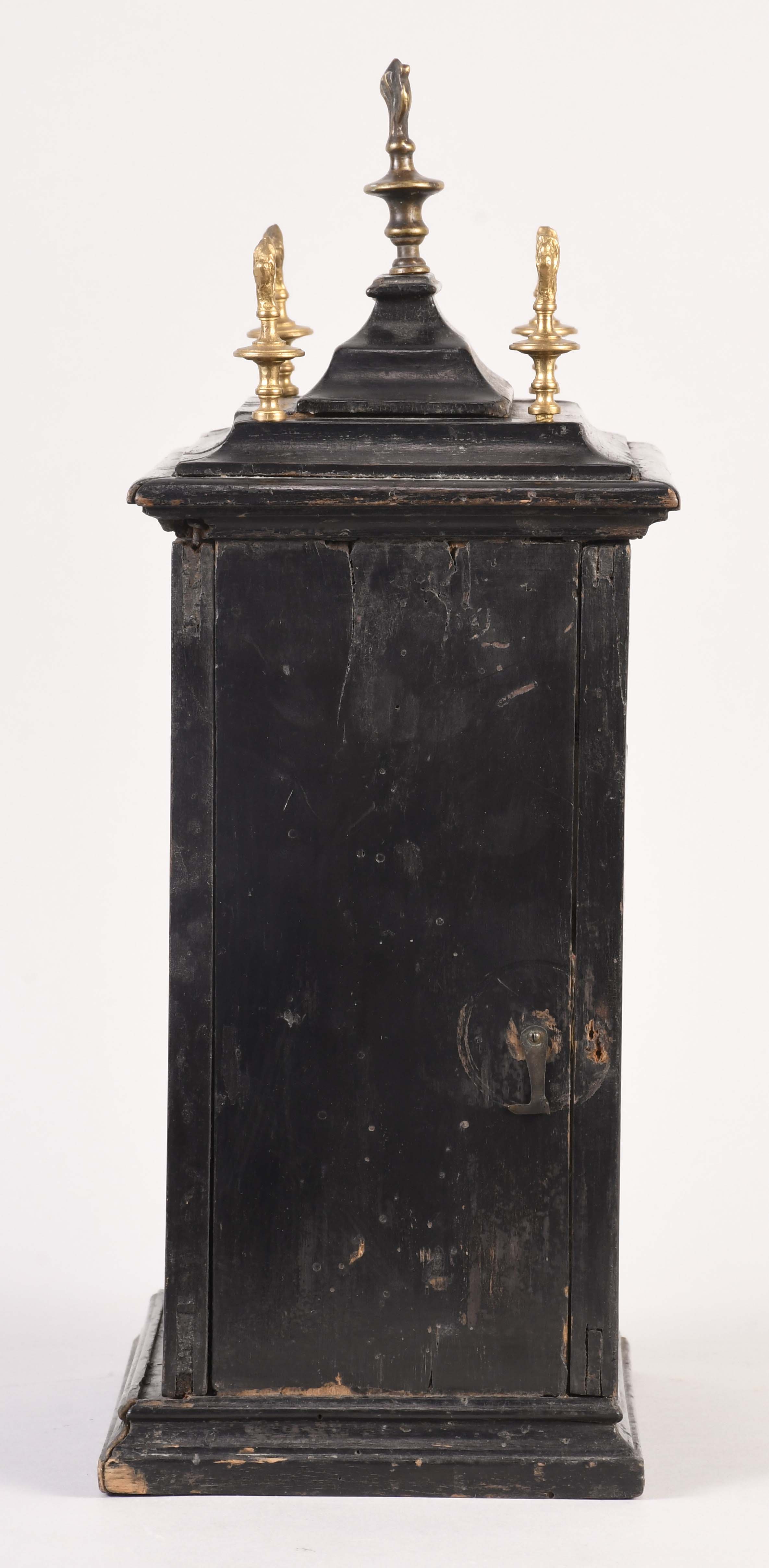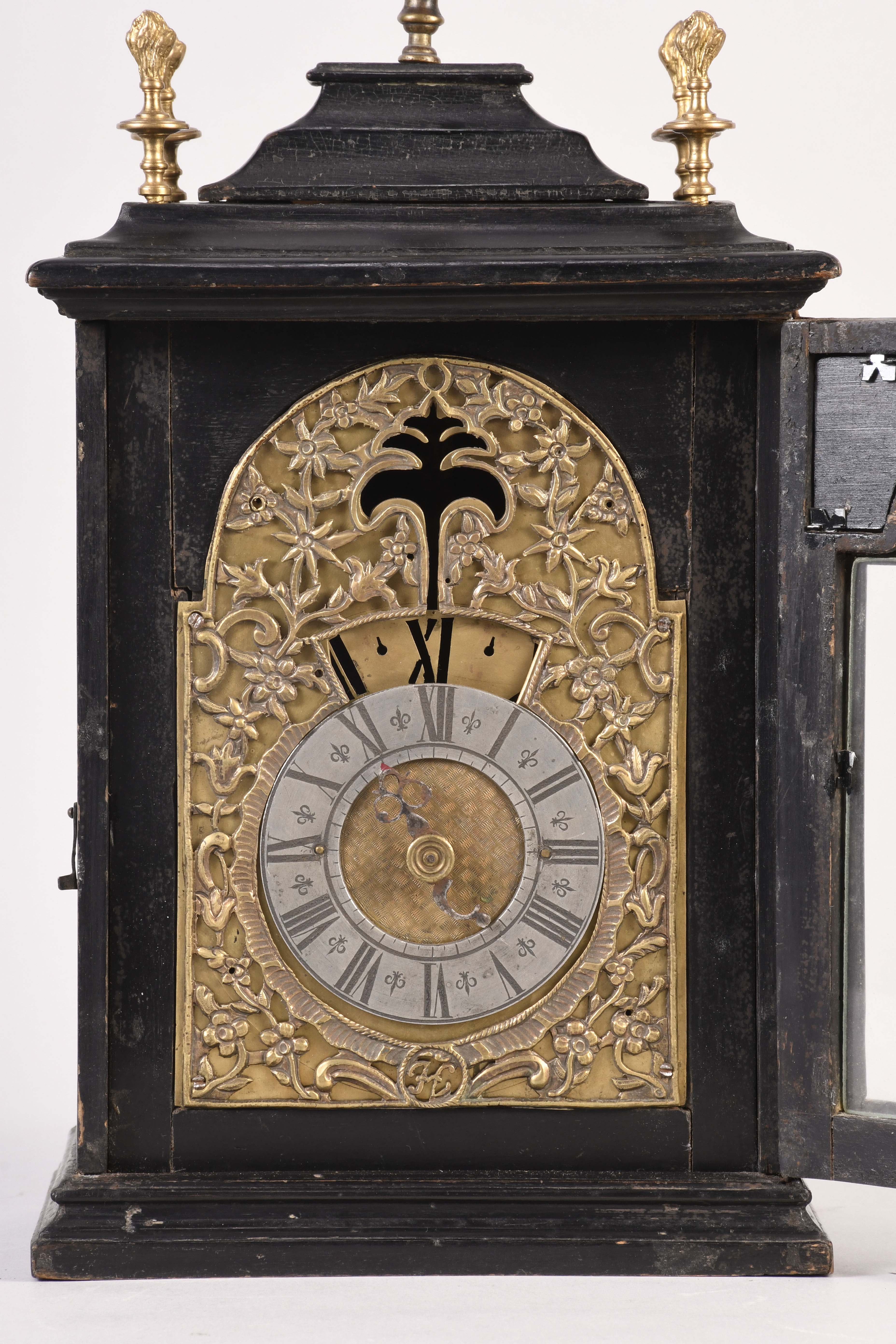 An unusual European night clock of indeterminate age, in the 18th century style, the ebonized, bracket style case with molded base, glazed door with break arch aperture and cast spandrels, molded top with five finials, the central portion sliding backward to reveal a hole for venting the flame, pewter roman numeral chapter ring with a single blued steel hand, and pierced, roman numeral wandering hour disc, illuminated from the back displaying the approximate time at night, brass break arch plate with pierced, cast mask with floral and foliate ornament, and a stylized tree form aperture to allow a view of the flag attached to the pallet arbor, 30 or 60 hour spring driven brass timepiece movement with verge escapement and bob pendulum