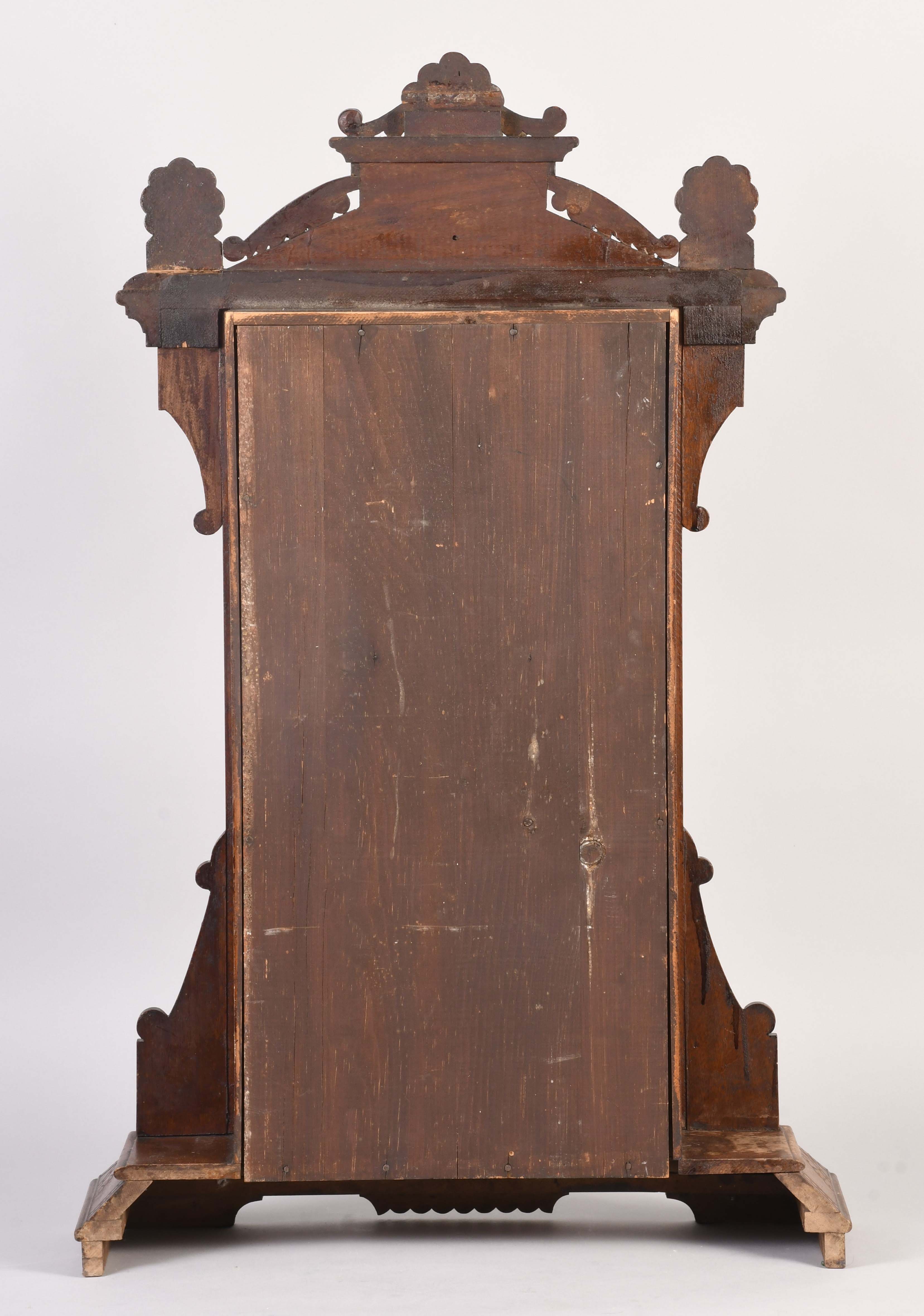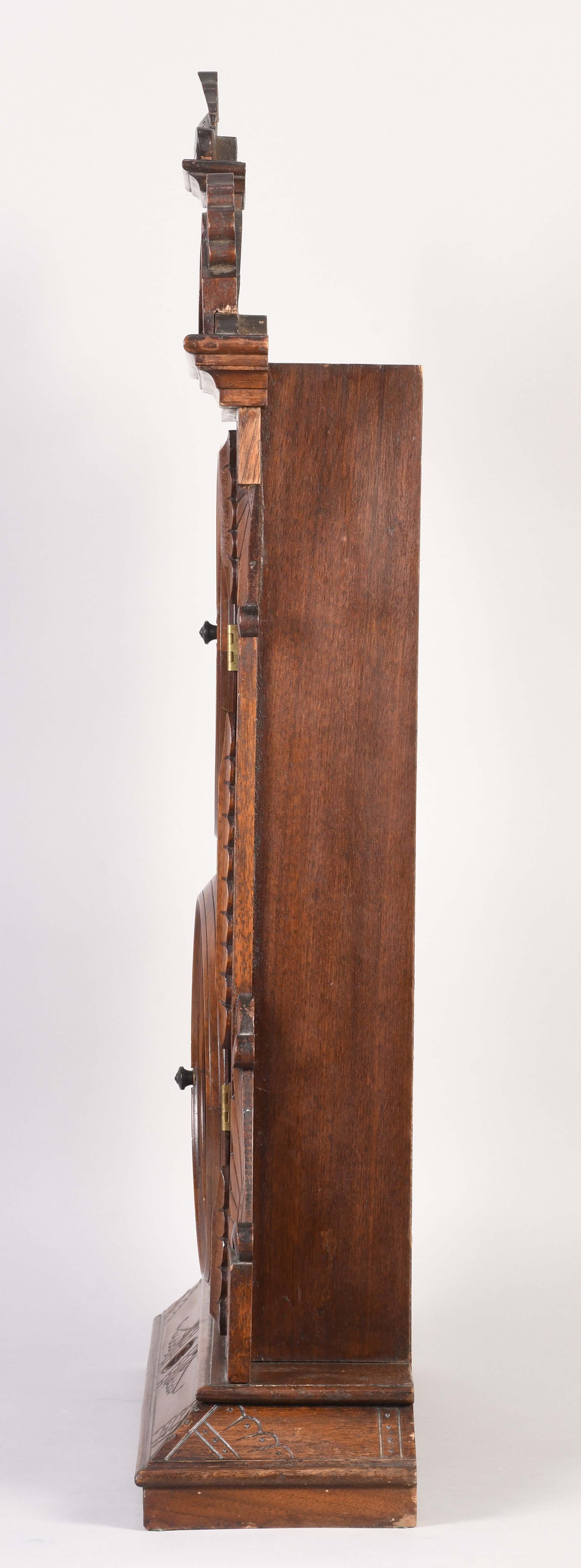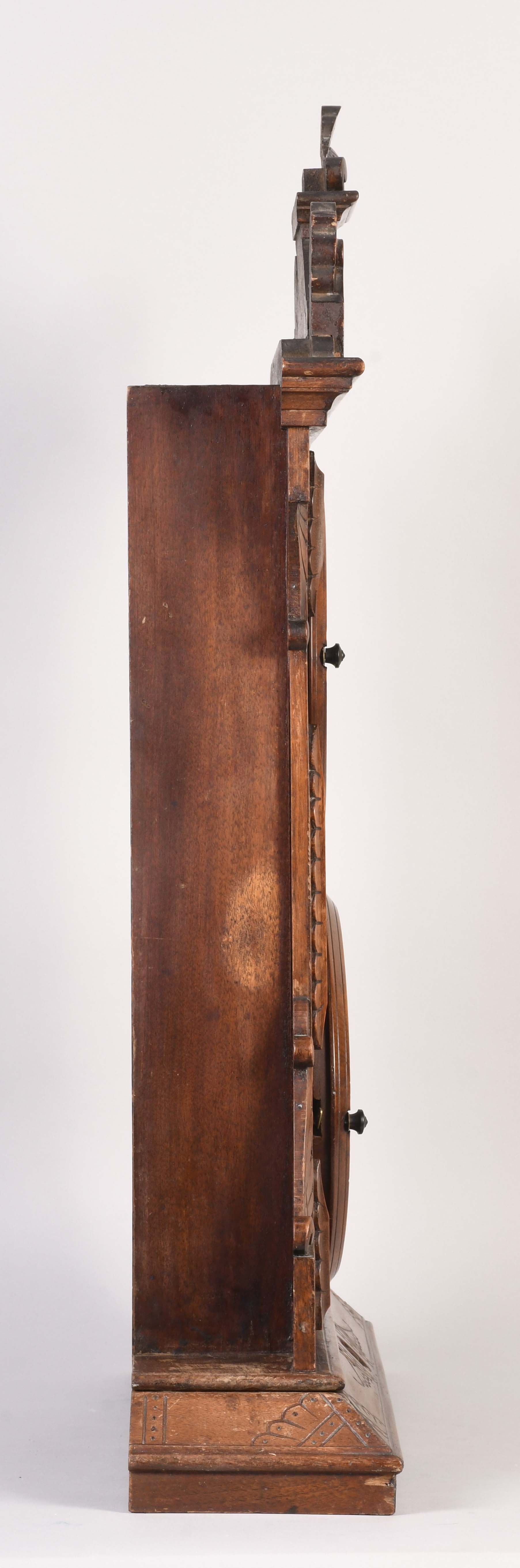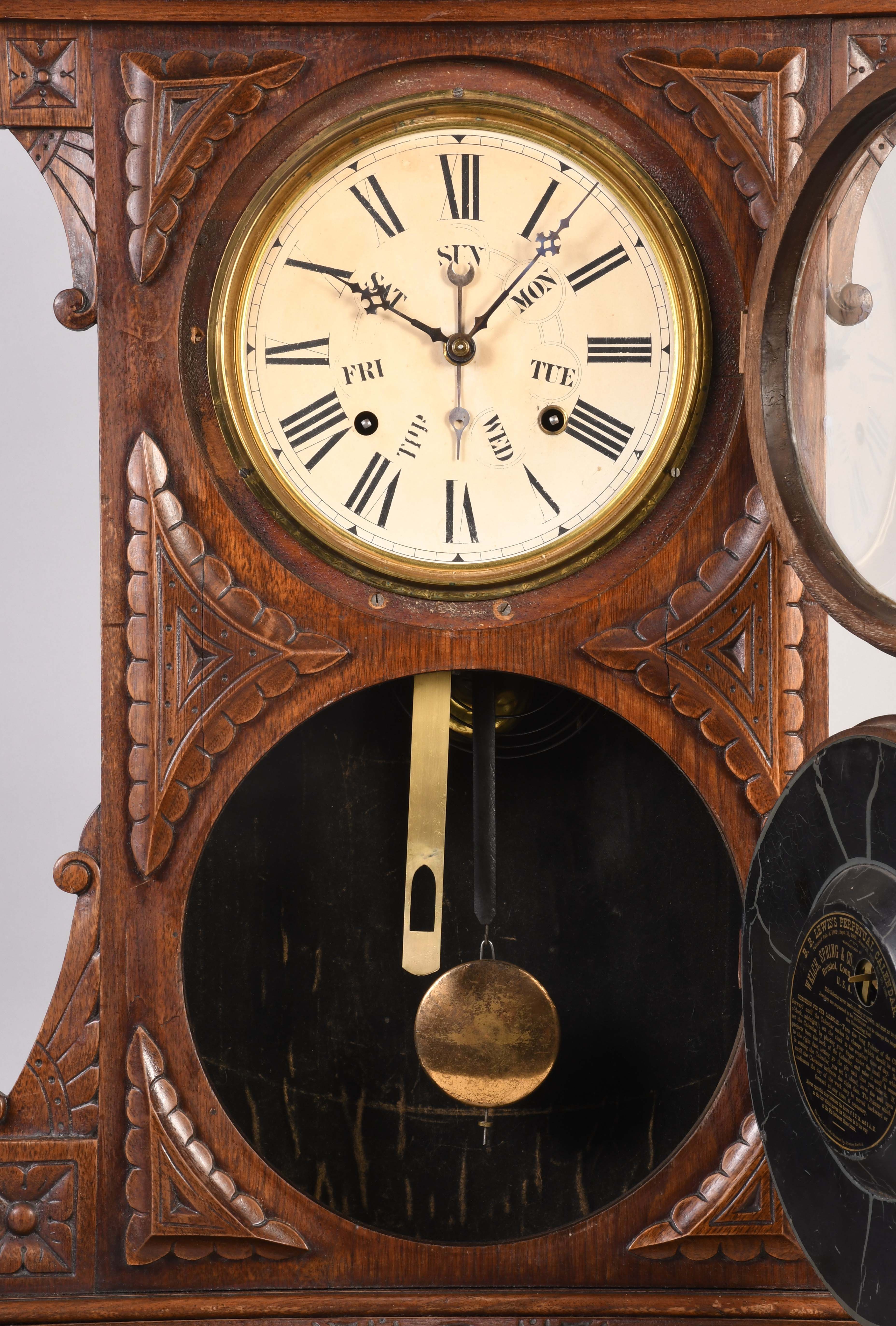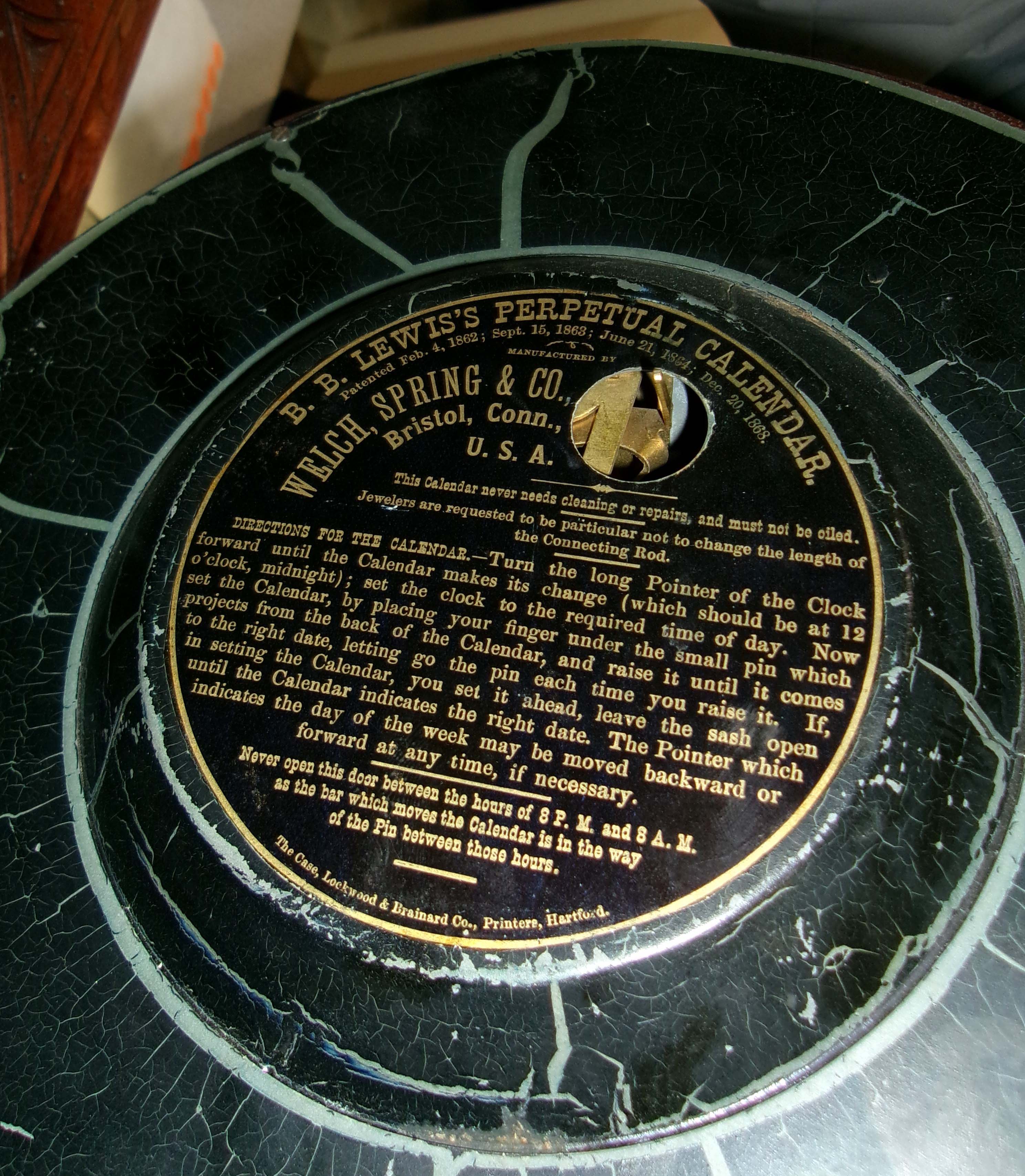 Welch, Spring & Co., Forestville, Conn, "Audran B.W.", double dial calendar mantel clock in a black walnut case, roman numeral papered metal dials, maltese hour and minute hands, spade day of the week calendar hand, eight day, spring driven, time and strike movement with a B. B. Lewis patented perpetual calendar mechanism