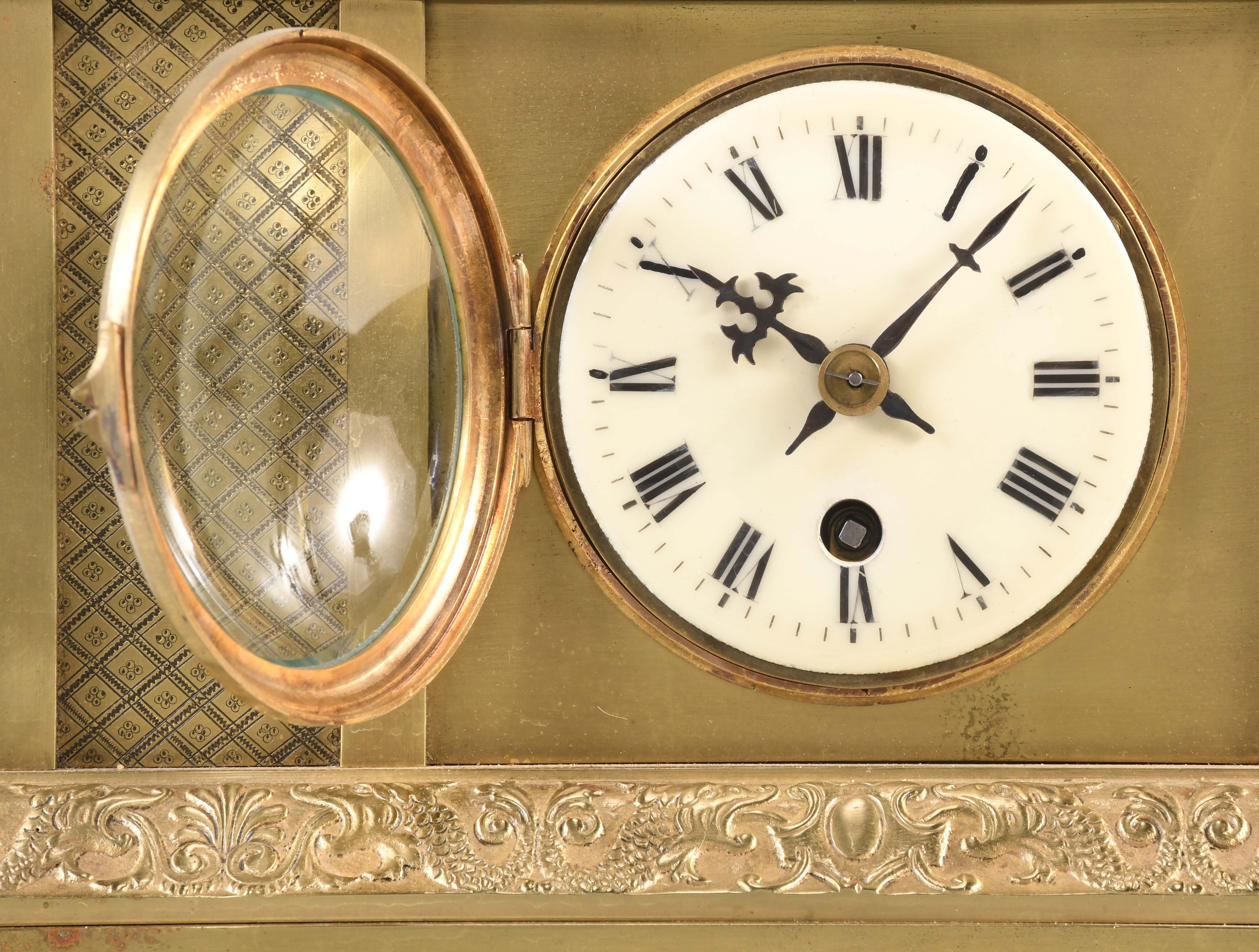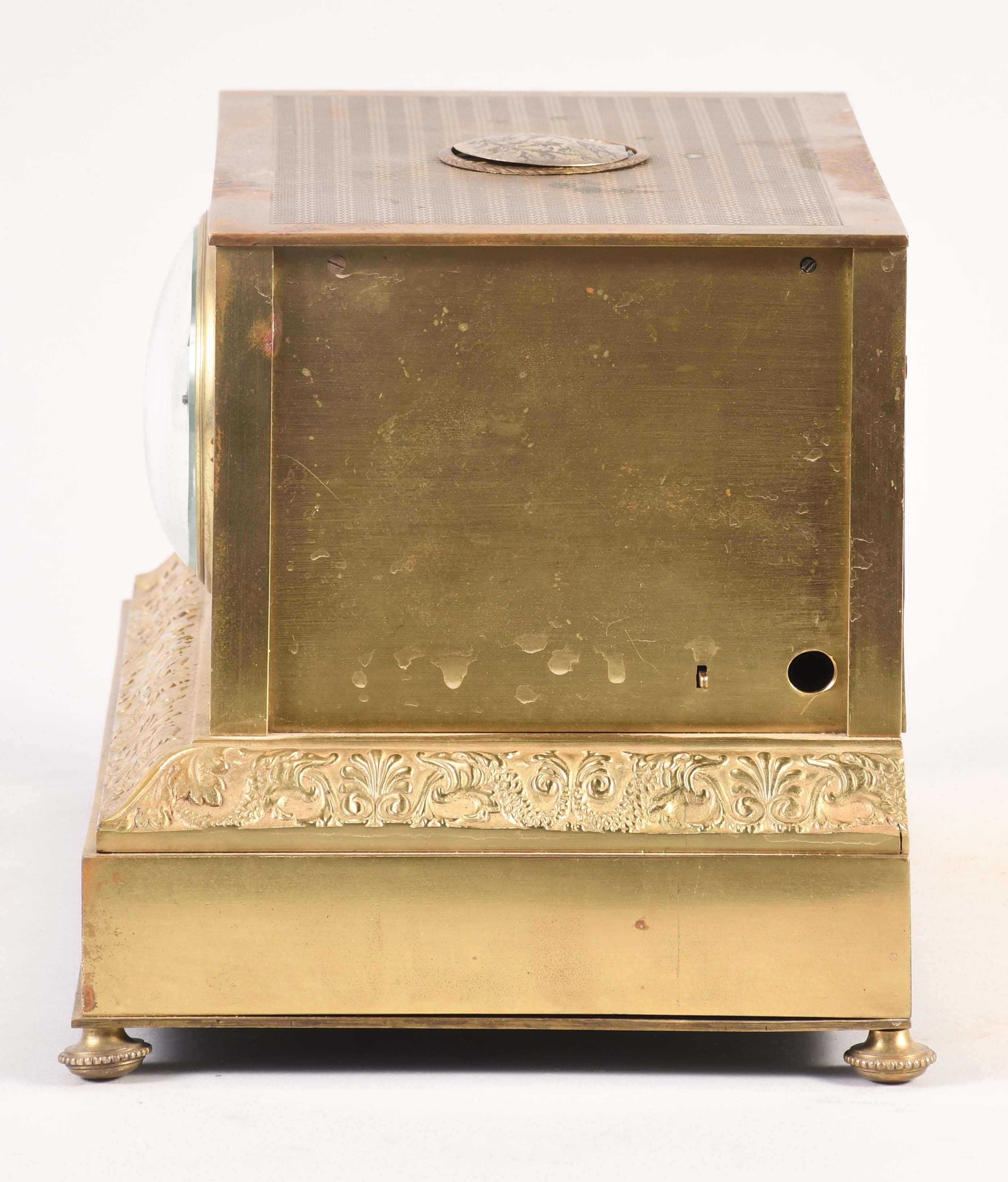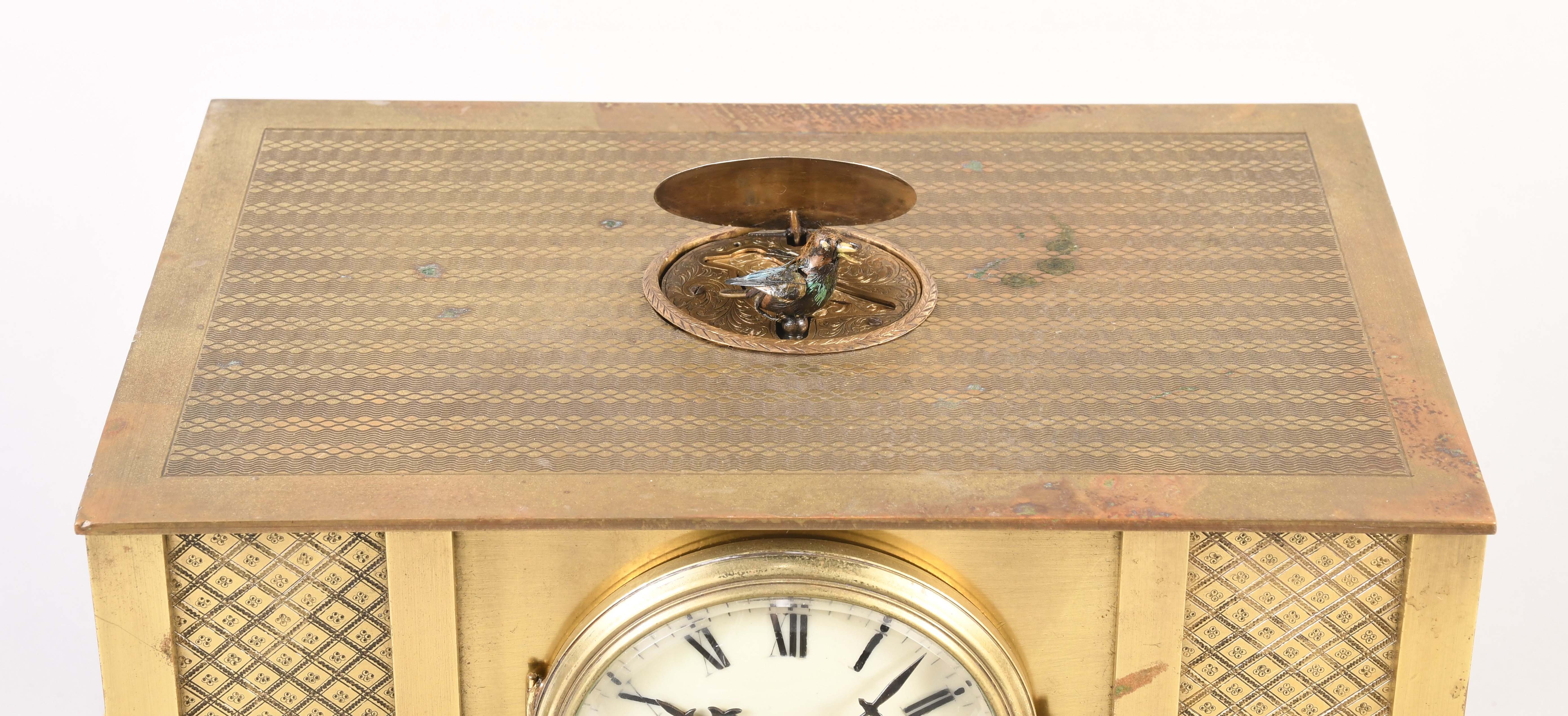 France, mantel clock with singing bird, brass case with cast brass panels and trim, roman numeral white enamel dial, fluer de lis hands, eight day, spring driven brass movement with lever escapement, time only