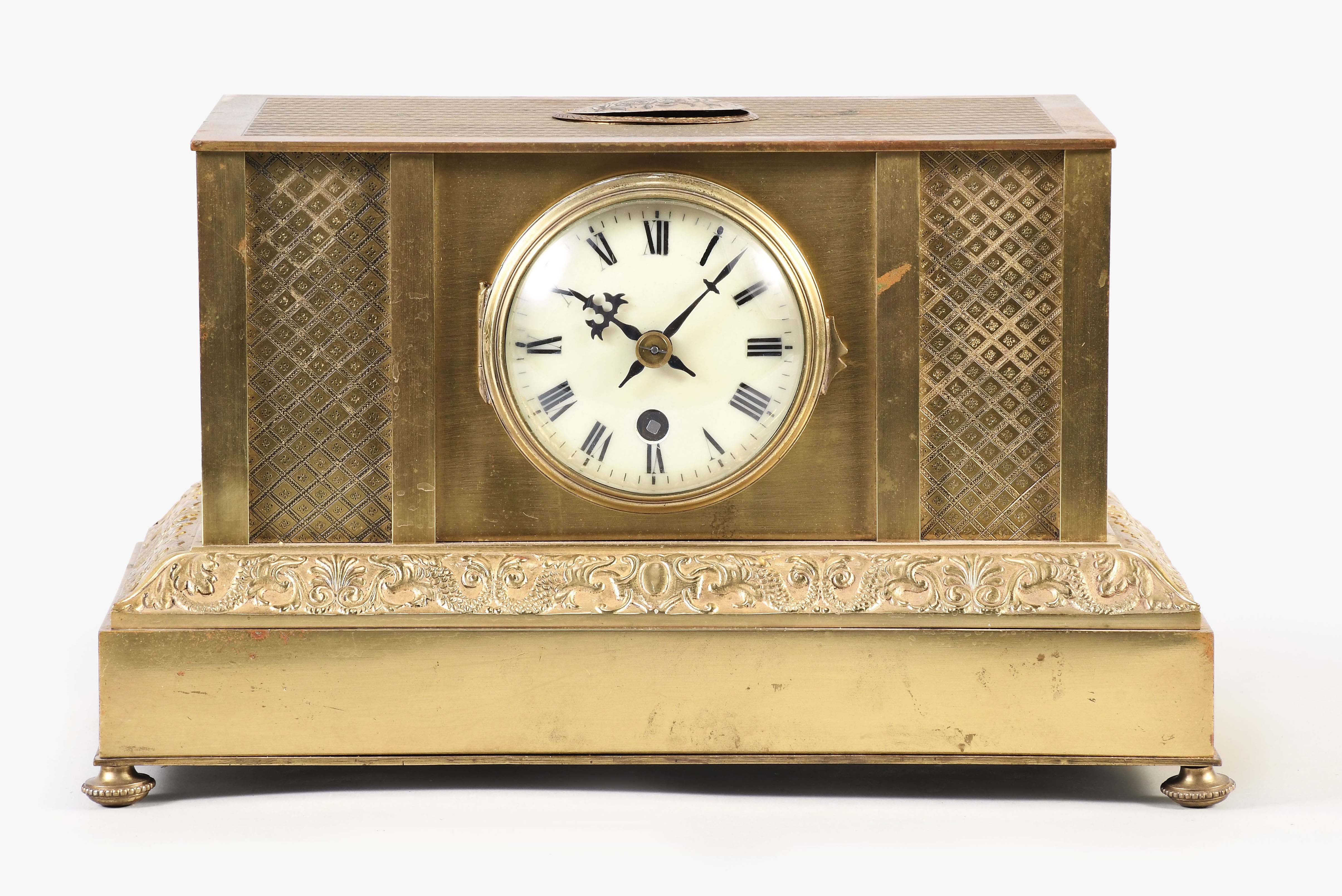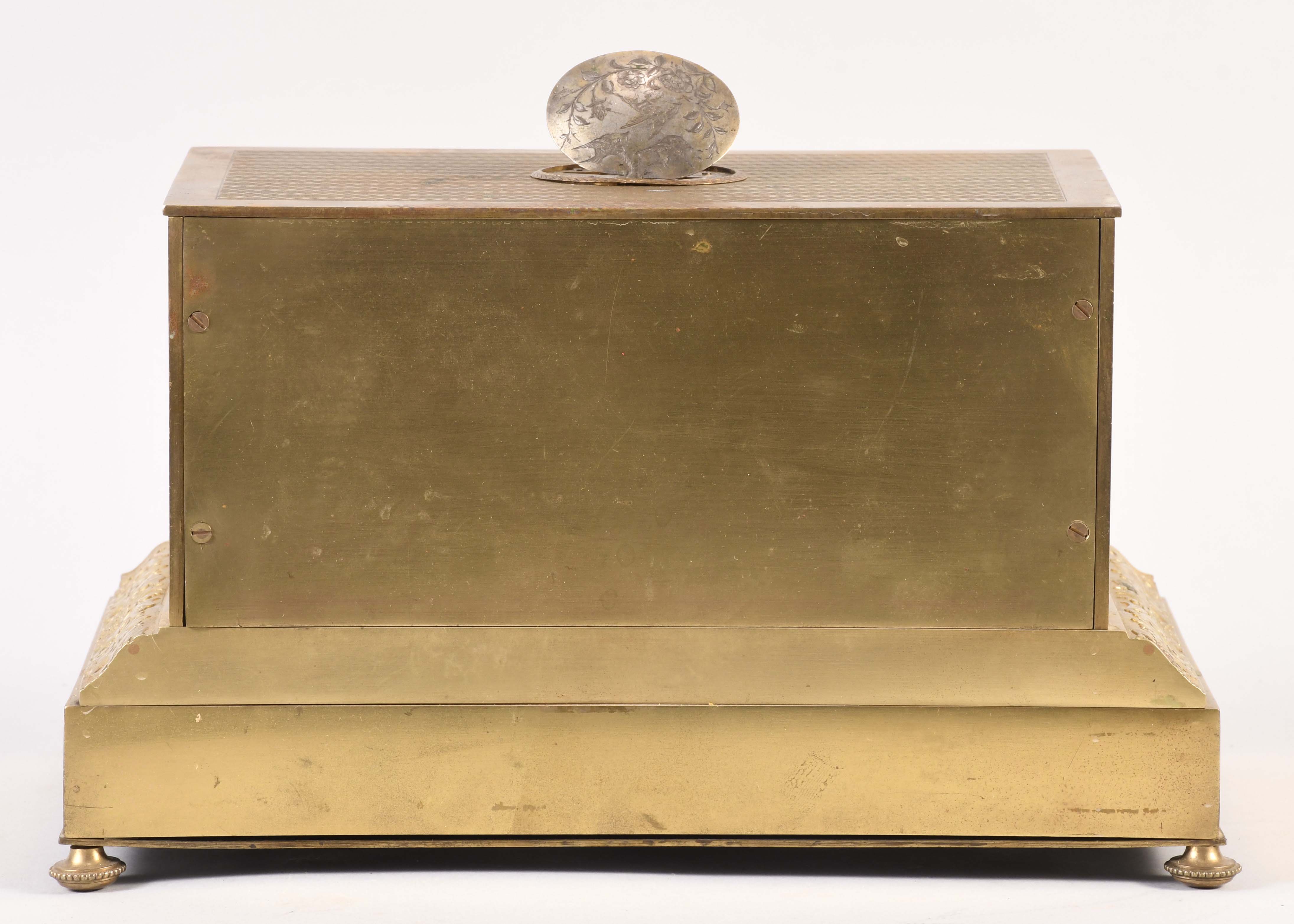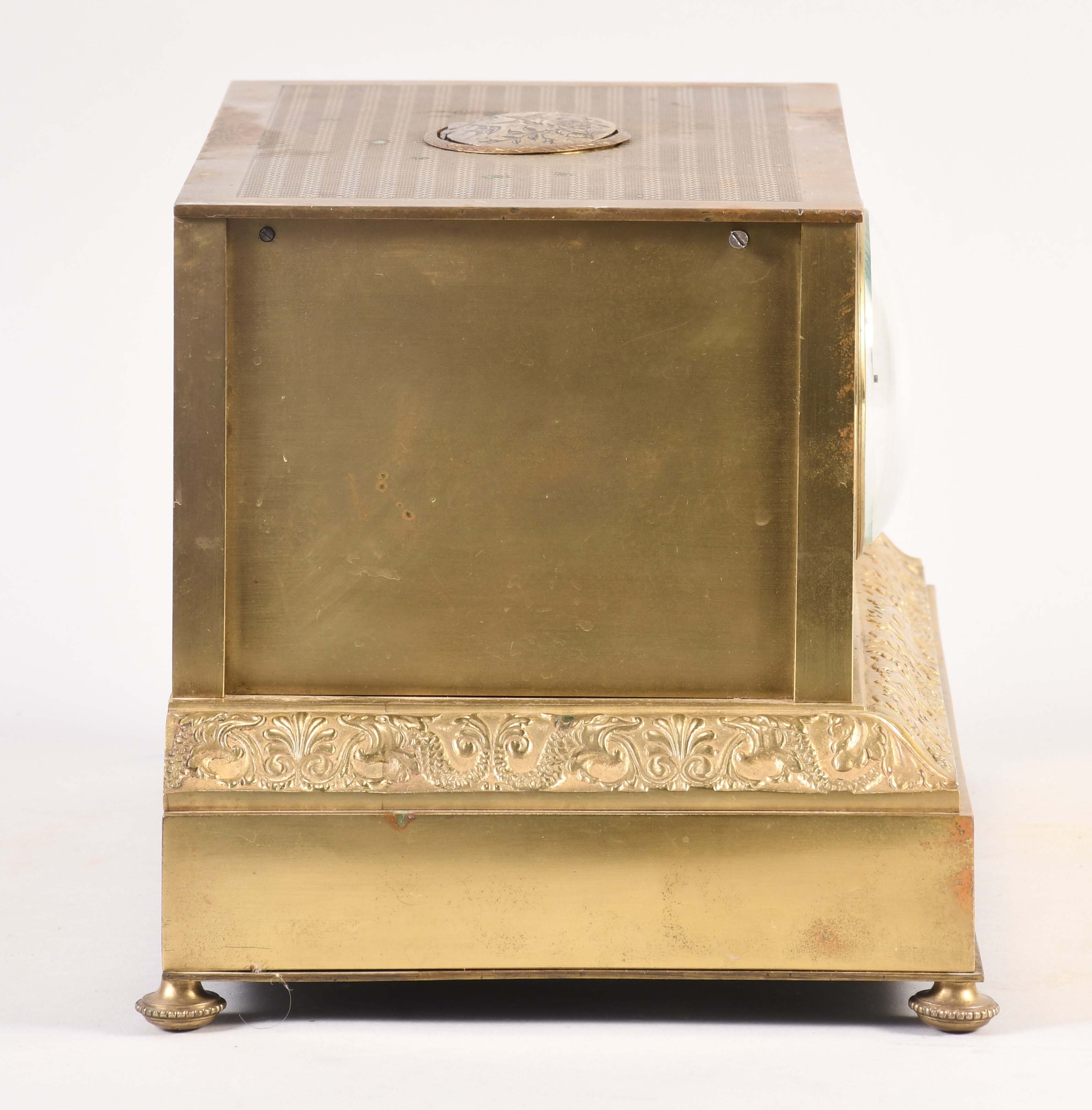 France, mantel clock with singing bird, brass case with cast brass panels and trim, roman numeral white enamel dial, fluer de lis hands, eight day, spring driven brass movement with lever escapement, time only
