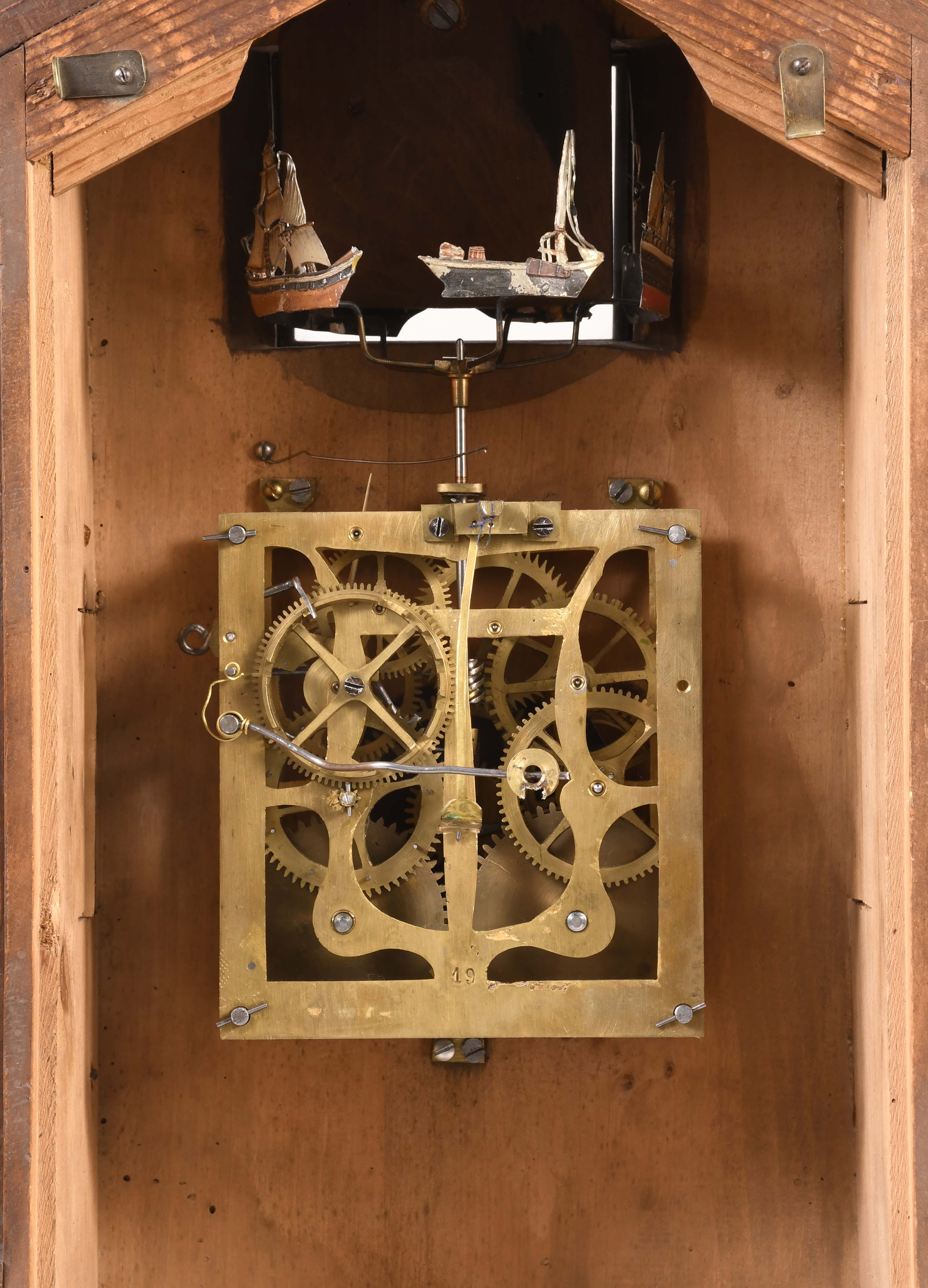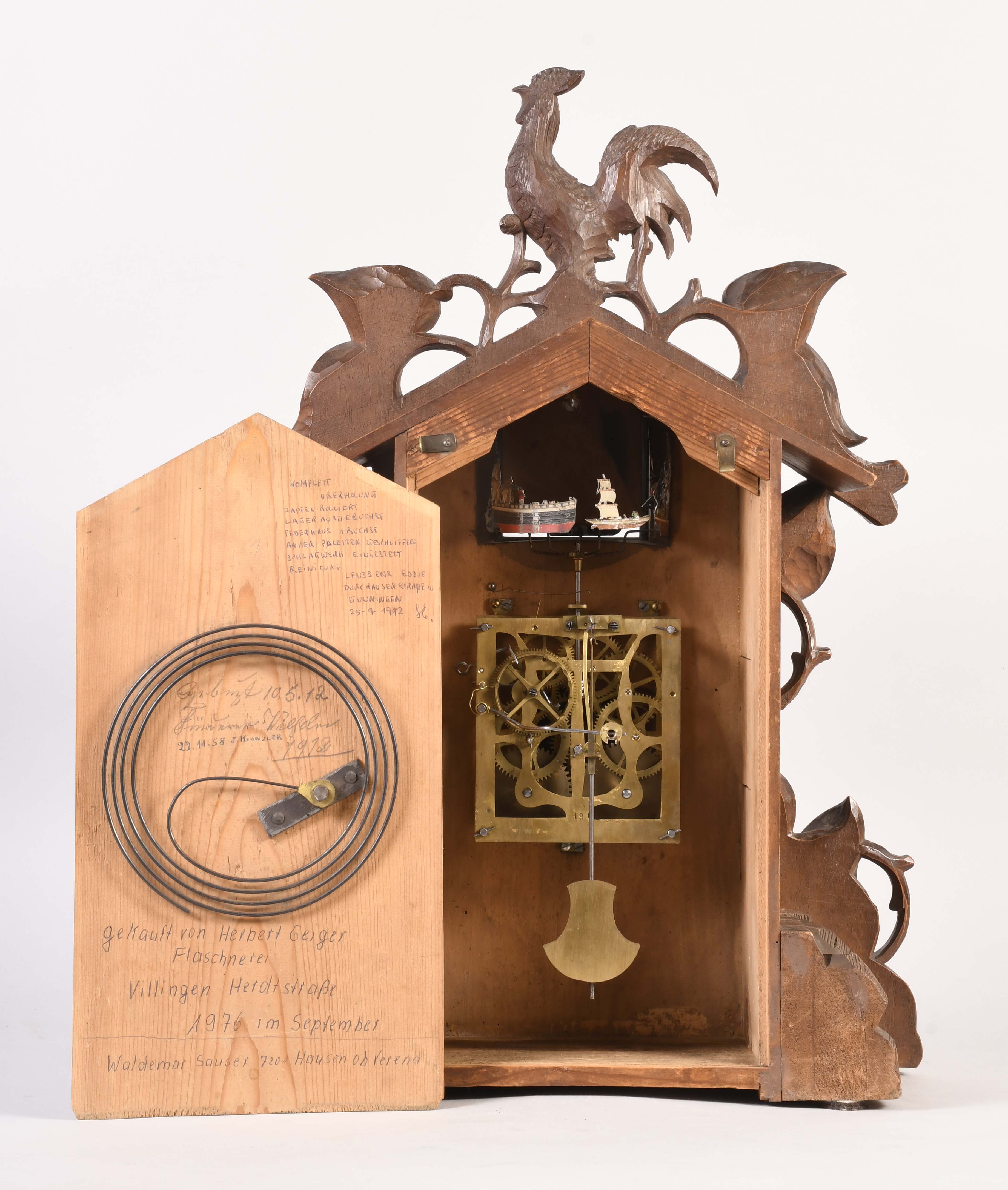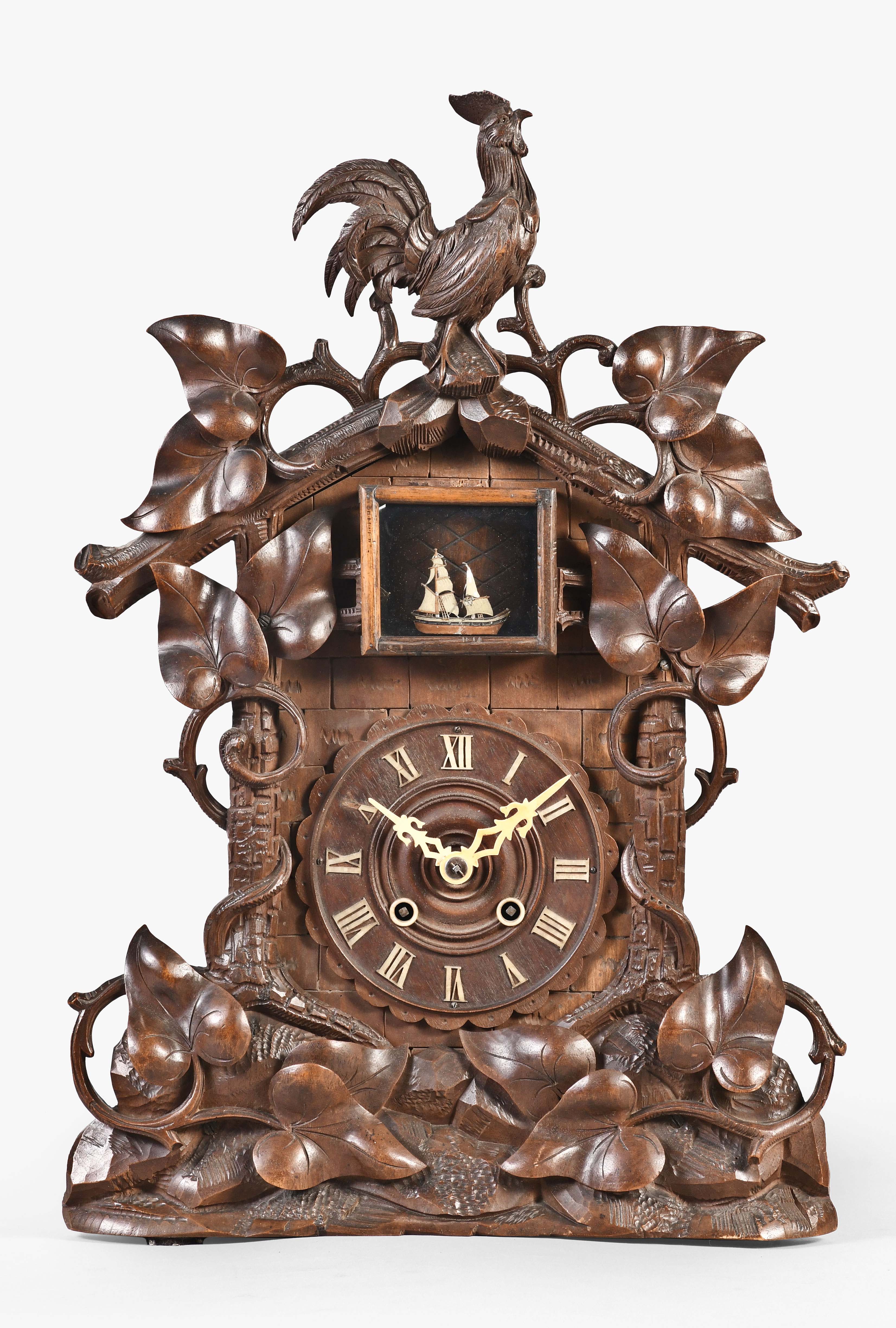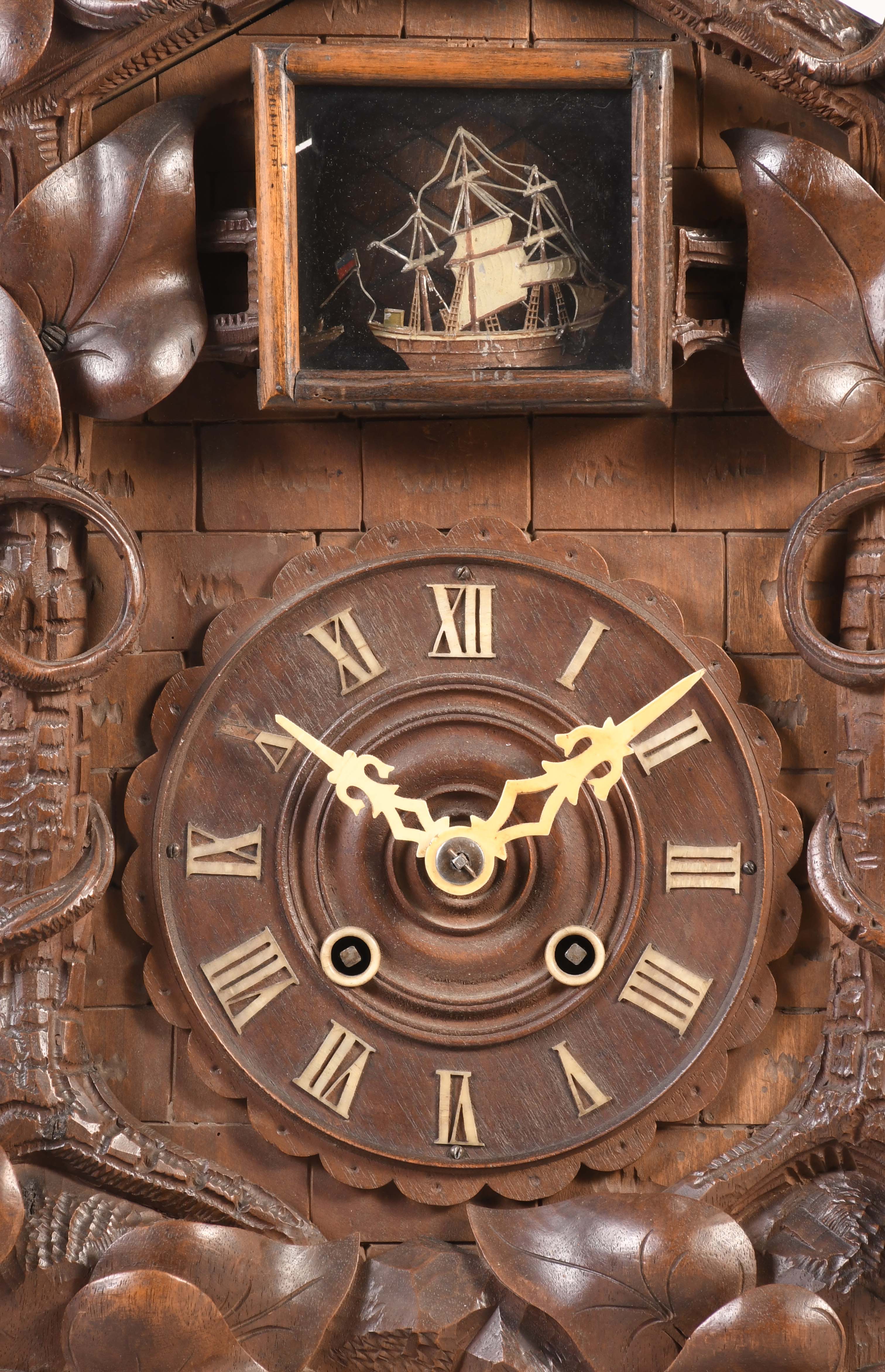 Black Forest, Germany, shelf cuckoo clock in a carved case, round wooden dial with applied numbers, fleur de lis style hands, 30 hour, time and strike, spring driven brass movement. The clock has an unusual feature of a series of ships that rotate with escapement and appear in an aperture above the dial.