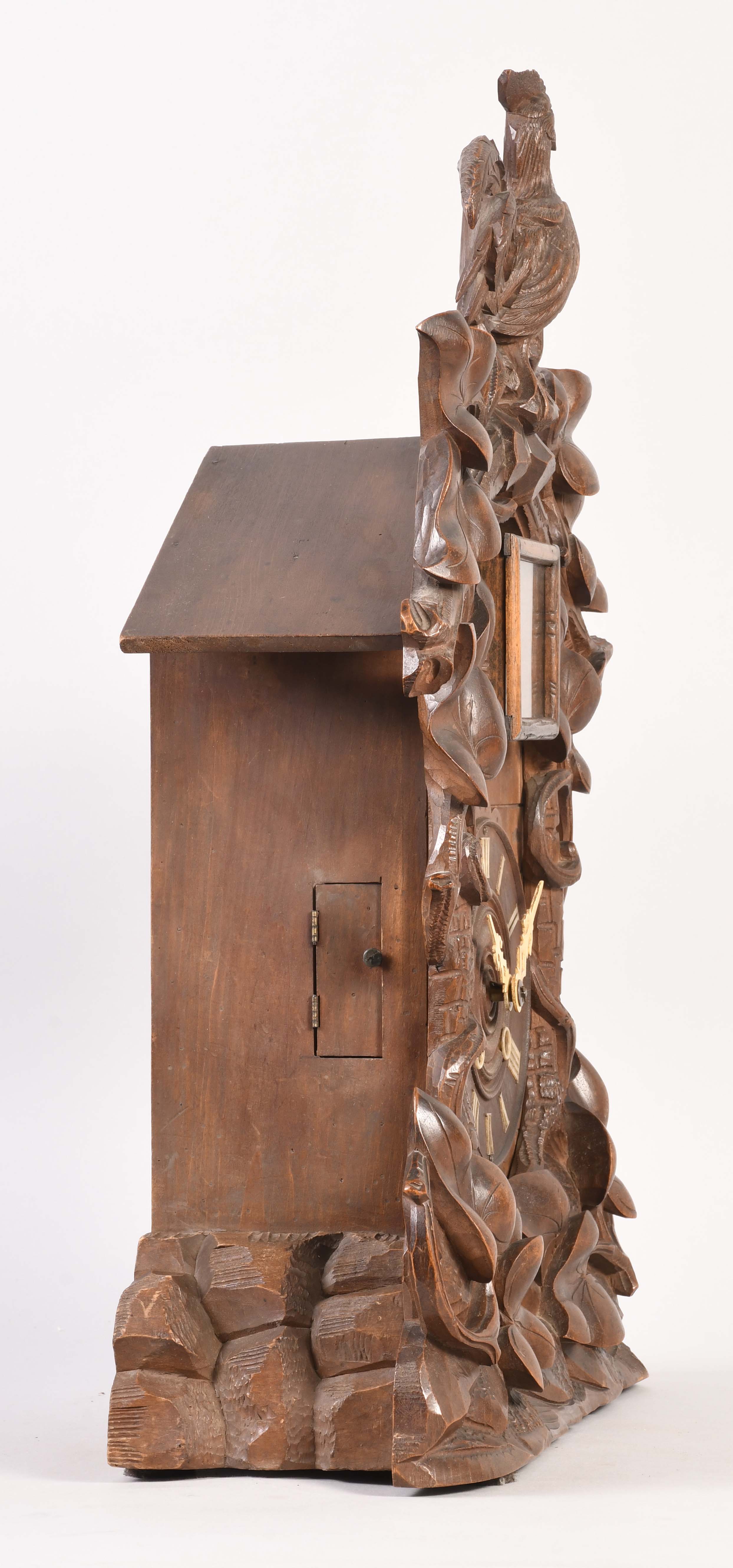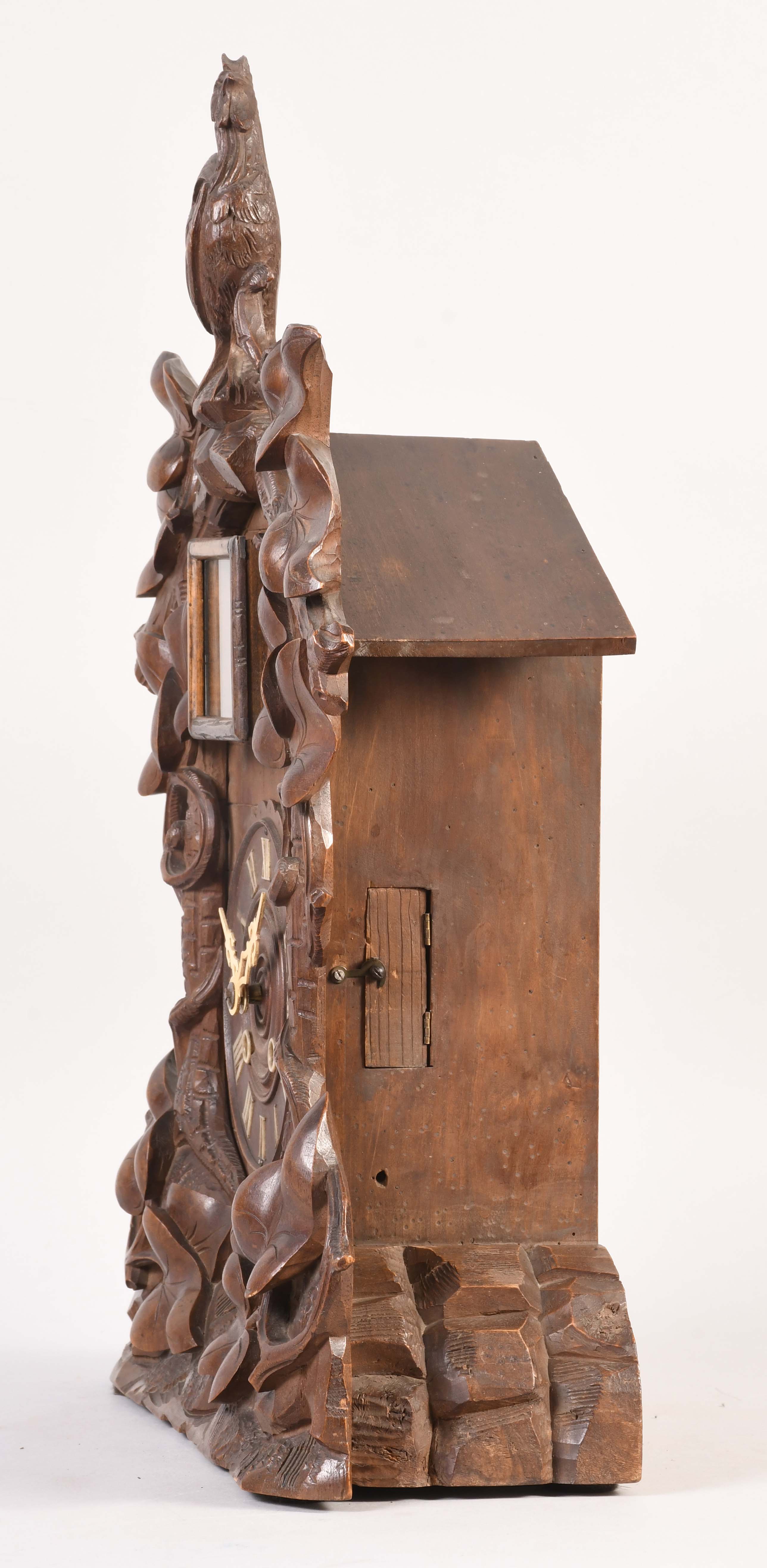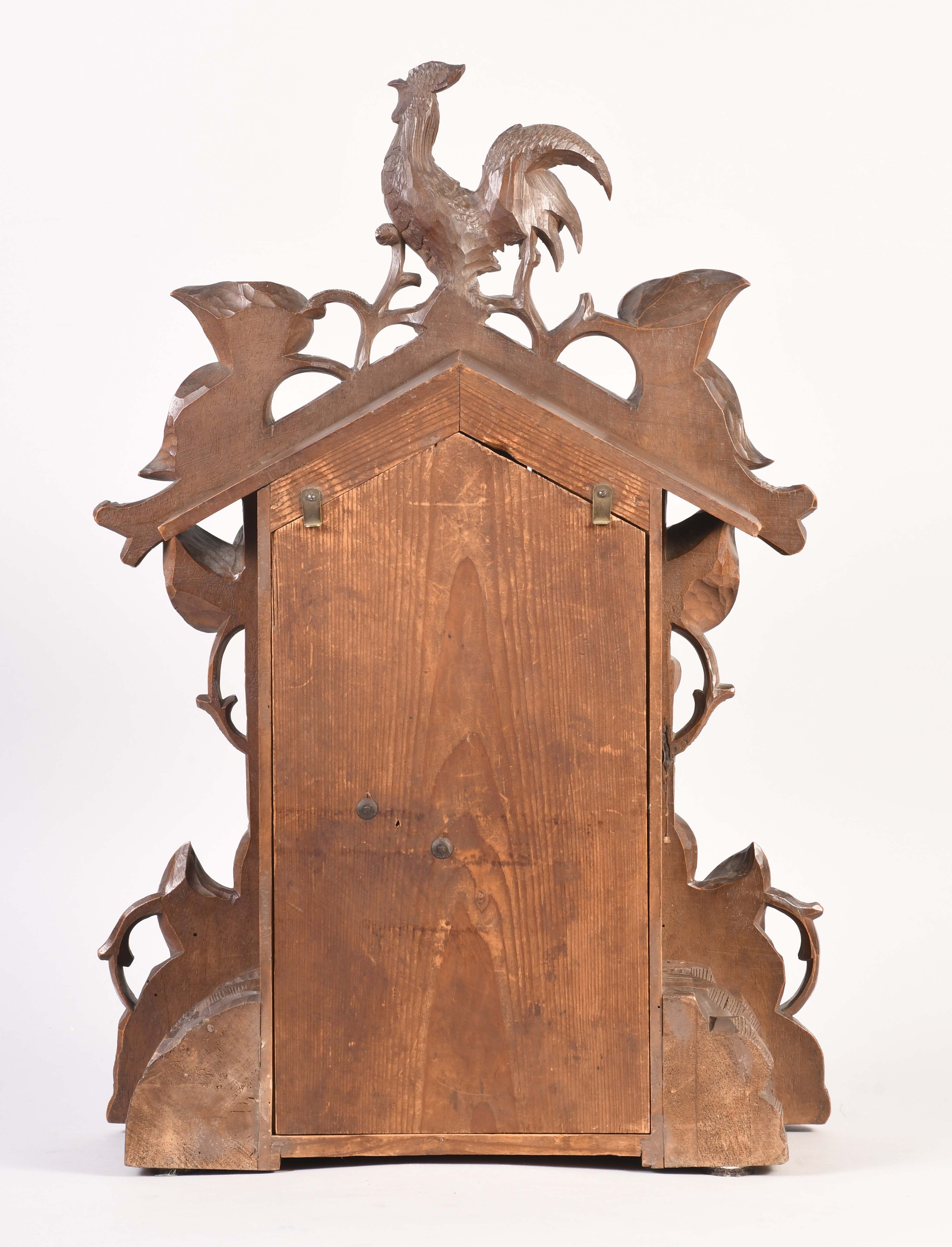carved wood case in nice condition in what looks to have an original finish, the rooster is finely carved, original wood dial has some loss to the number ten, hands appear to be replacements, original pendulum