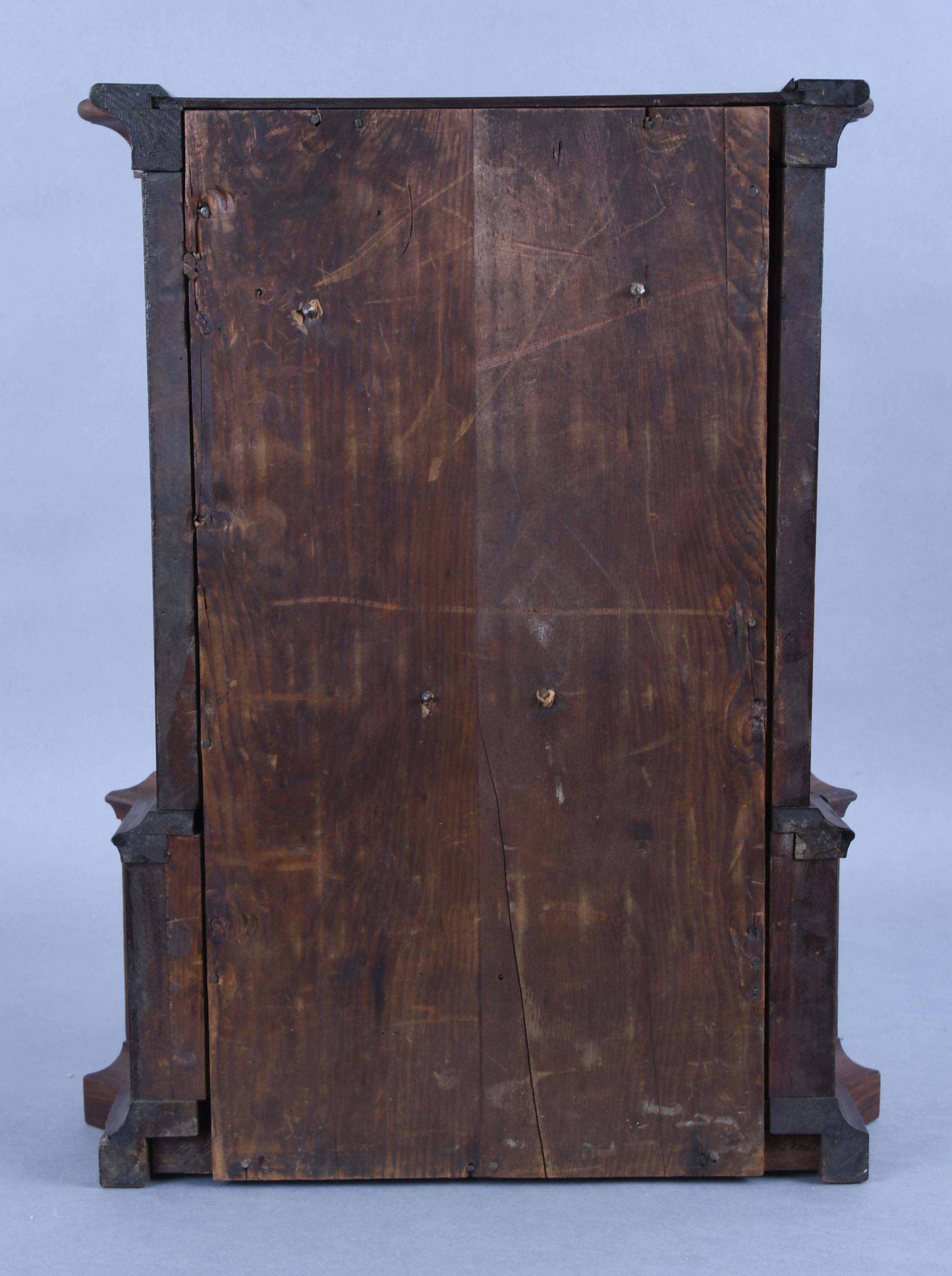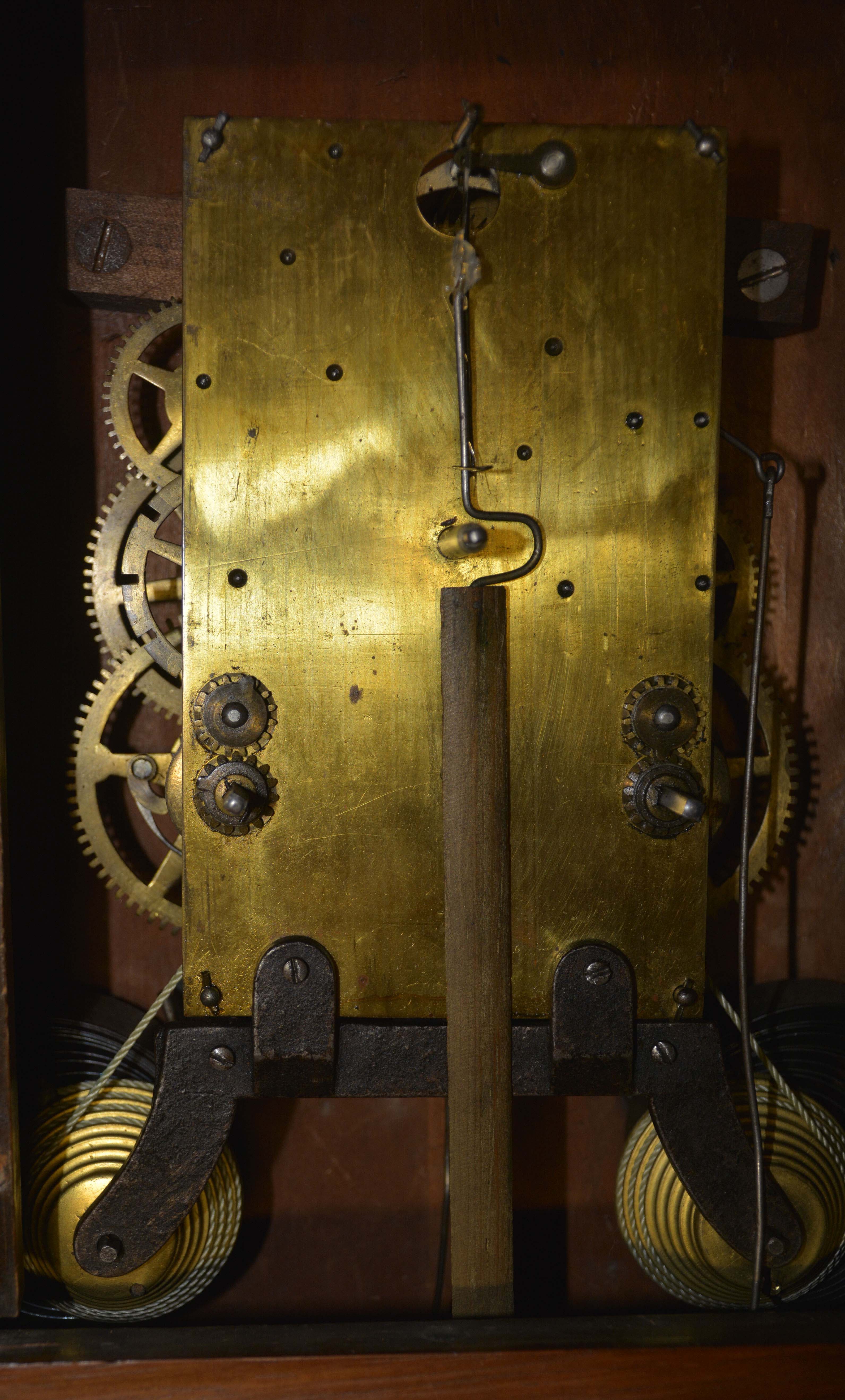 case in nice condition in an old finish has a small chip at the upper left corner. Original tablet and mirror. Original painted dial has turned yellow with some loss to the numbers and some loss at the mounting screws. Original hands. Clean label inside.