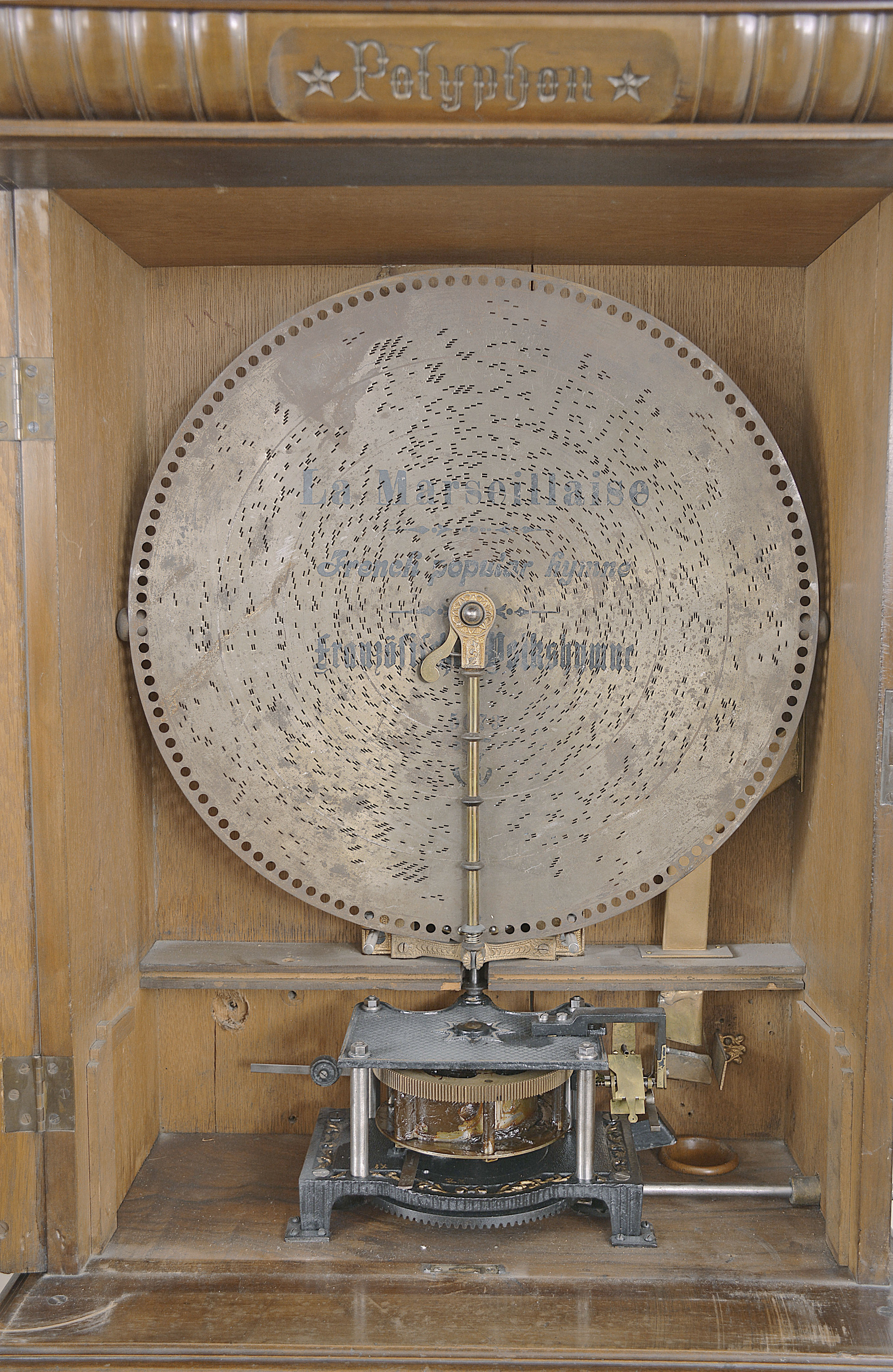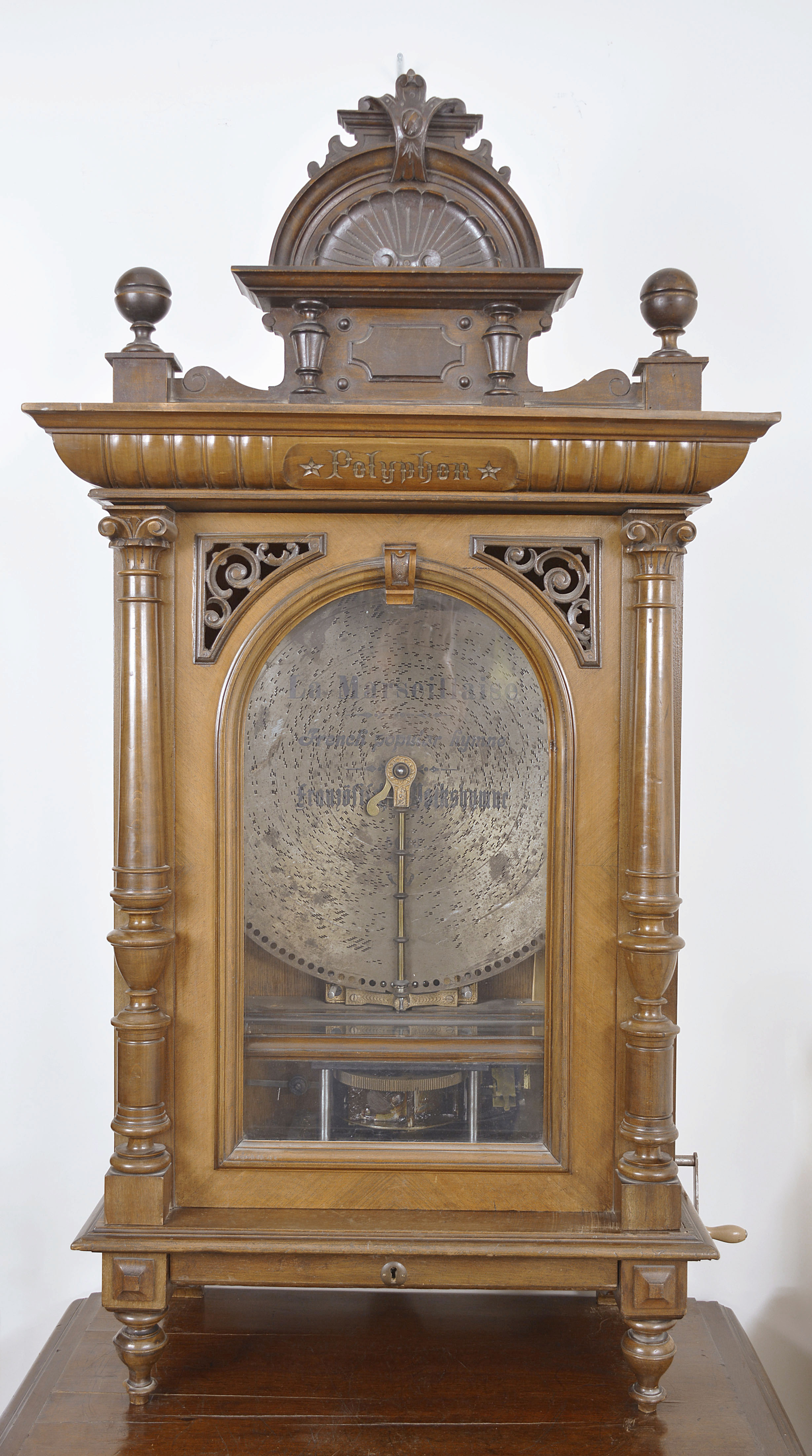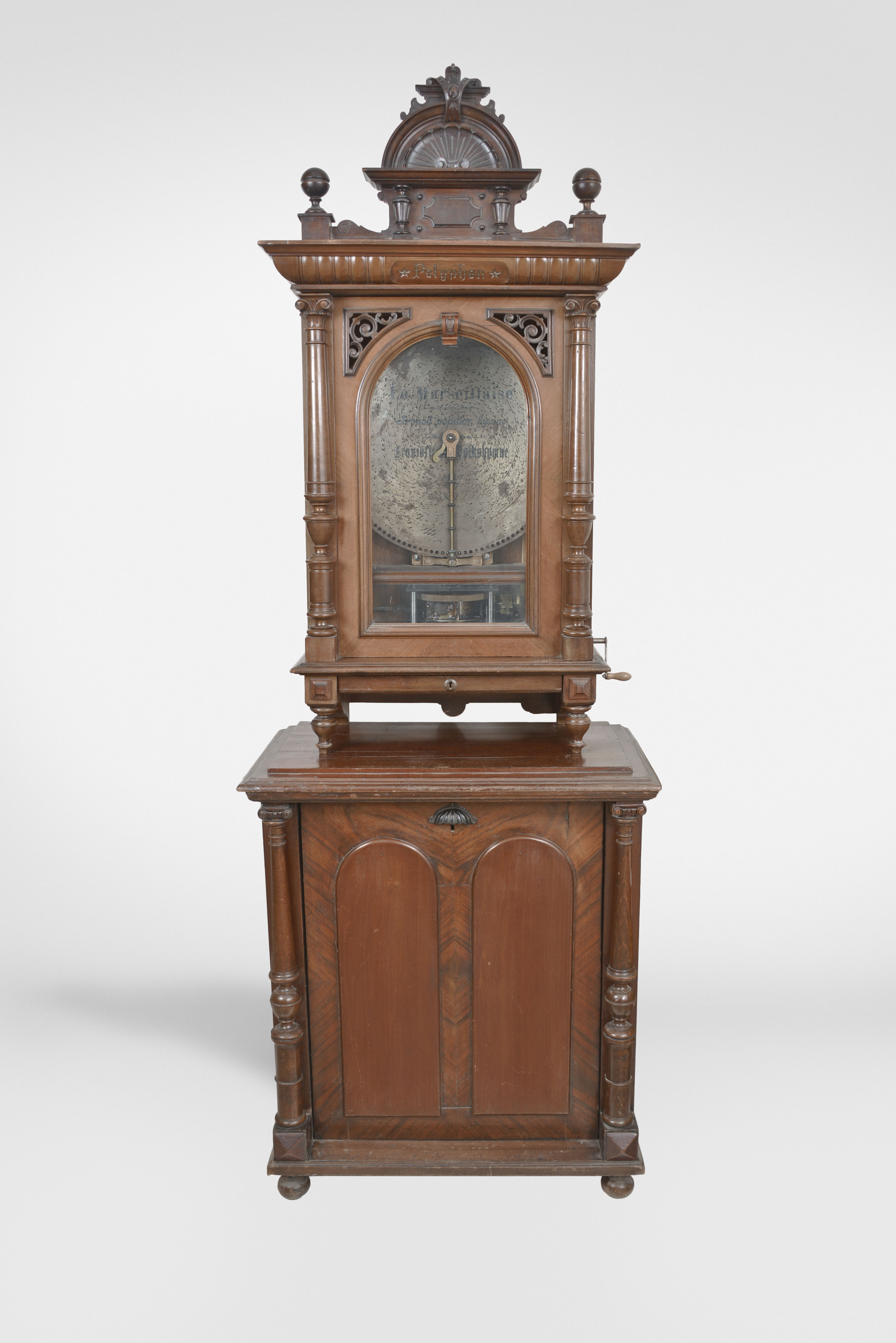 Polyphon Musicwerk, Leipzig, Germany, "Model 104" floor-standing, coin-operated disc music box, playing 19-5/8 inch discs, robust dual comb movement starting upon insertion of a U. S. quarter or Deutschmark piece, the case of mixed walnut and mahogany veneers and solids, all resting on a base cabinet with hinged, locking door. Approximately 2 dozen discs are included.