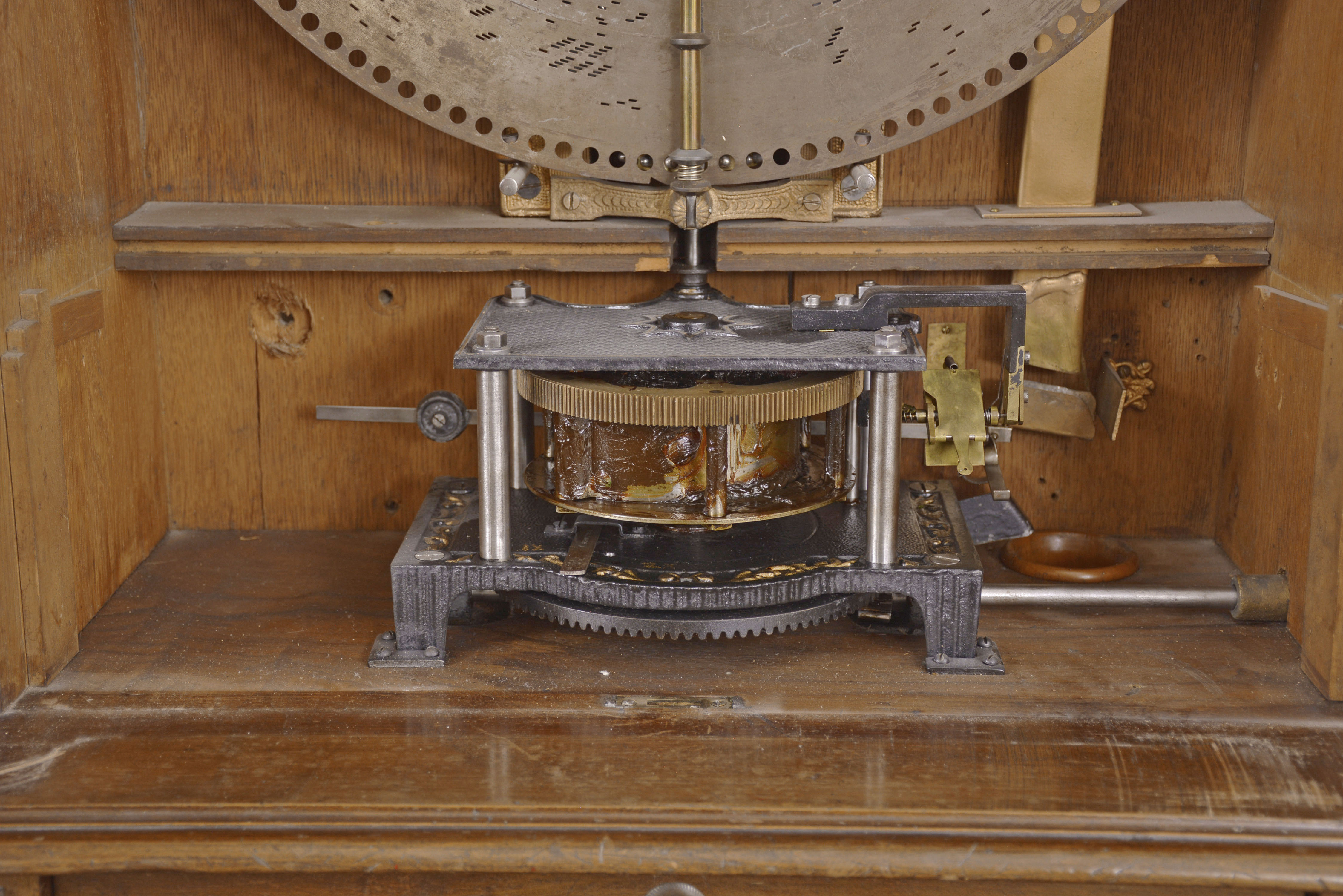 all three pieces, base, box and removable top trim are dusty and in need of polish. There are nicks and scratches commensurate with the age of the piece. The two music combs are excellent, with little damper noise and no broken nor missing teeth. The drive motor is running and the discs do play, however a cleaning is in order. Governor needs adjustment as it snaps to full open easily and does not return to closed at the end of the tune. Coin-op feature is functional, and coin tip-out works as well. Includes seven English pence to play machine.