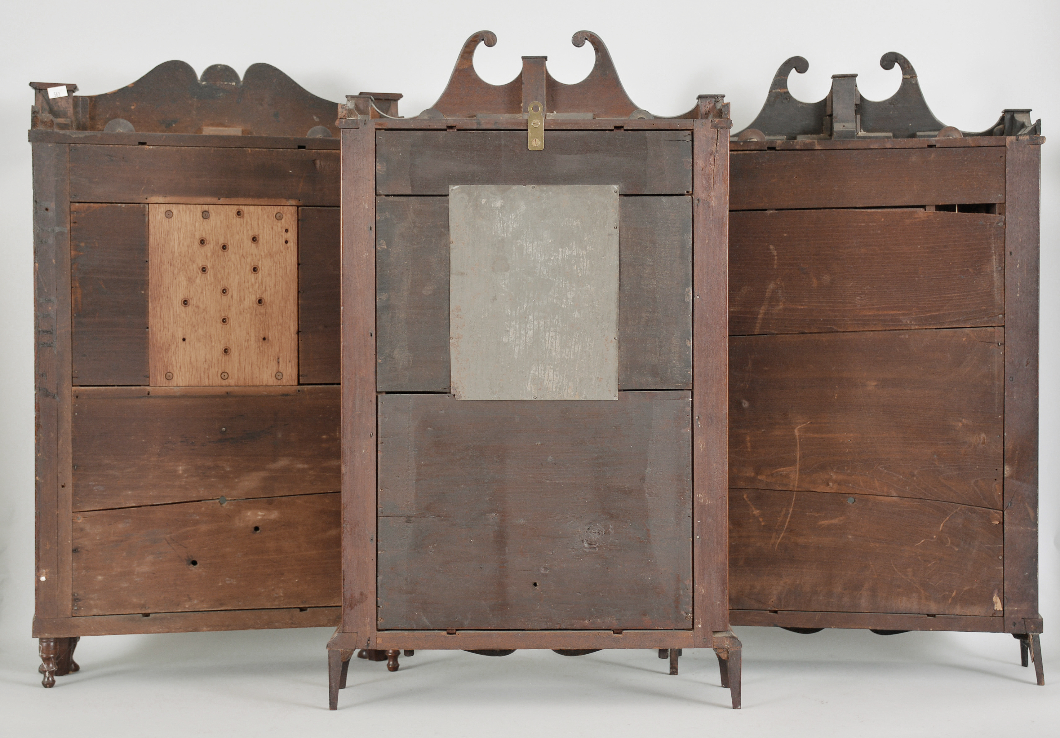 (1) Mahogany and mahogany veneered case in an old finish in nice condition. Original stenciling. Tablet by Tom Moberg was restored in place. Original dial has some wear to the numbers. Original hands. (2) Mahogany and mahogany veneered case in an old finish. Original scrolls have a repair at the right scroll. There is damage to the tips on the bottom skirt. Reverse painted tablet has had some restoration. The dial looks replaced. Period hands. There no finials. (3) Mahogany and mahogany veneered in an old finish. A couple of veneer chips on the door. Feet have been replaced. The original scrolls are a bit rough with repairs to both scrolls. Original tablet has some small scattered loss. Movement probably by Ephraim Downs. The dial is lightly soiled with some light wear to the chapter ring. There are no finials.