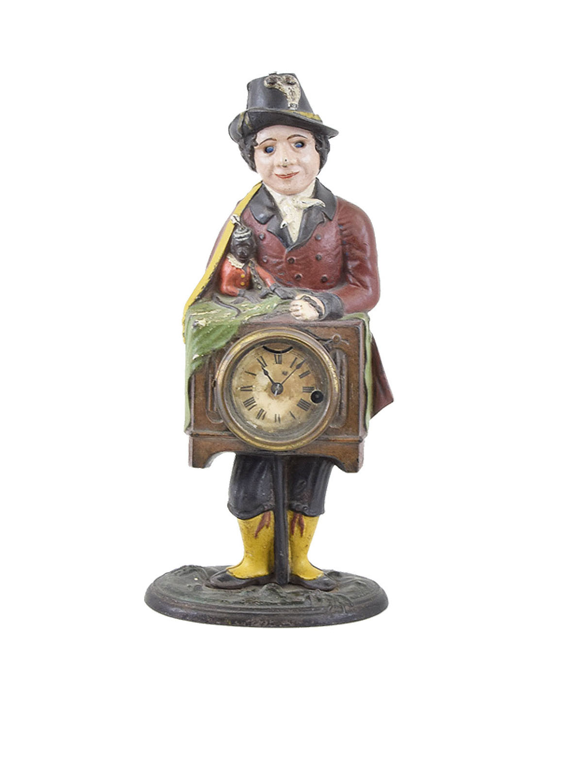 Bradley & Hubbard, Meriden, Conn., a rare Organ Grinder moving eye timepiece, the cast iron case with oval, green painted base, the figure dressed in yellow stockings, red coat and top hat with plume, his barrel organ hung with a yellow strap and draped with a green blanket, the monkey wearing a red coat with white collar and cap, and seated on the blanket at his right, roman numeral paper dial with brass bezel and spade hands, brass, spring driven lever movement with large brass balance, the organ grinders eyes controlled by the rocking pallet