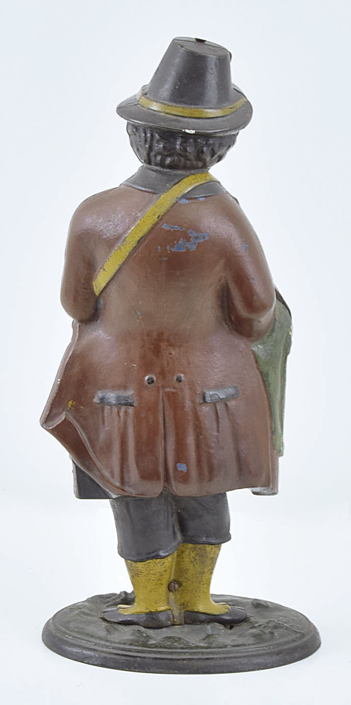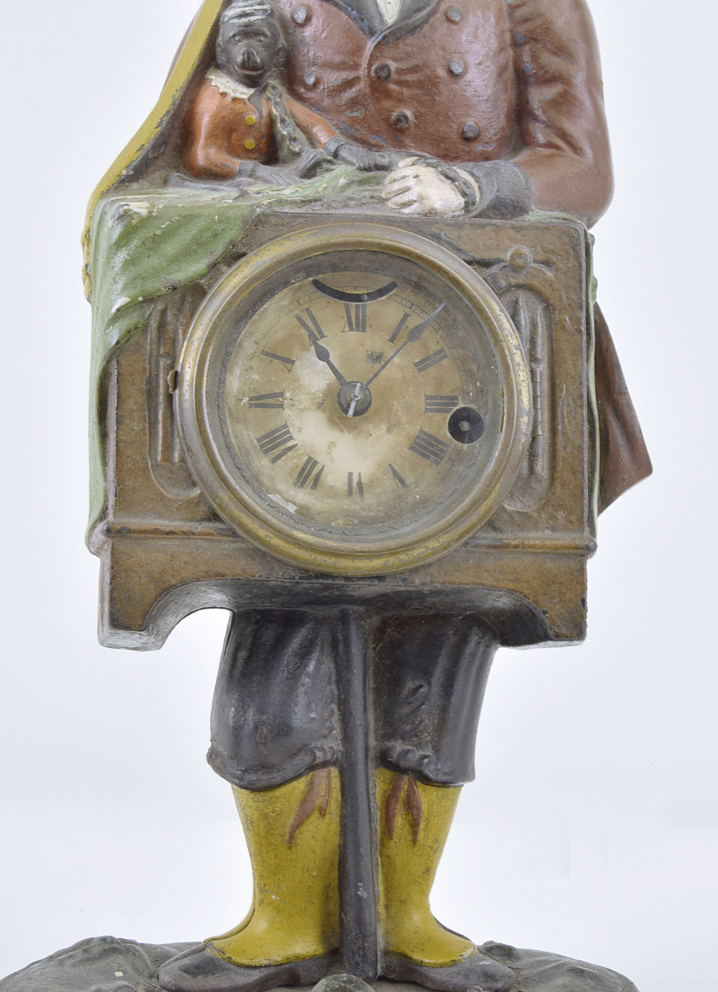 dirty, retains much of its original surface, red paint over layer of blue on the figure's coat, base with minor oxidation, bezel dirty, dial very dirty and with significant staining, movement very dirty,. will tick briefly
