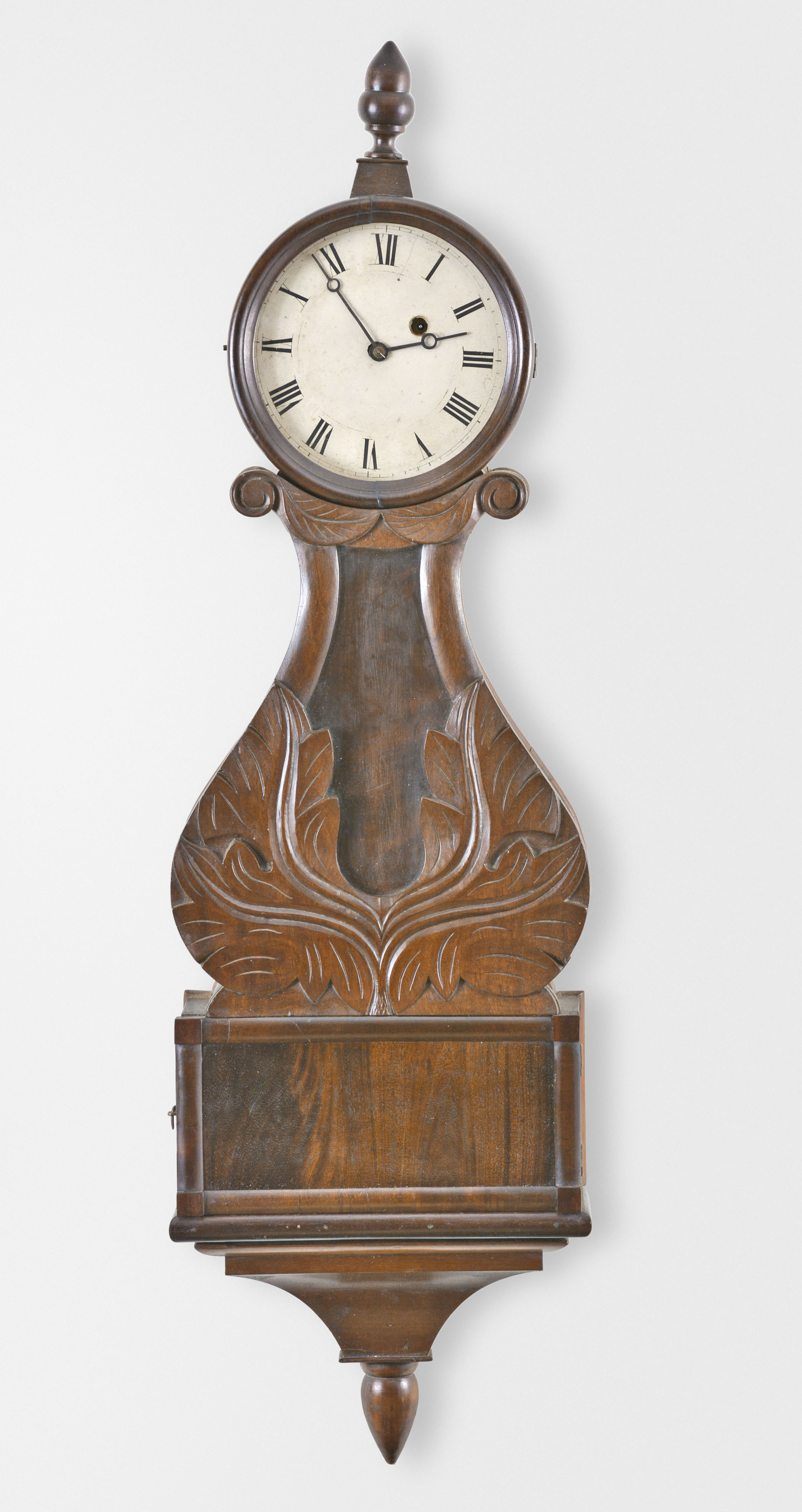 New Hampshire, 8 day, weight driven brass movement box lyre banjo wall timepiece. This example has carving similar to a L. W. Noyes, Nashua, New Hampshire timepiece pictured in "Willard's Patent Time Pieces" by Paul J. Foley, page 136.
