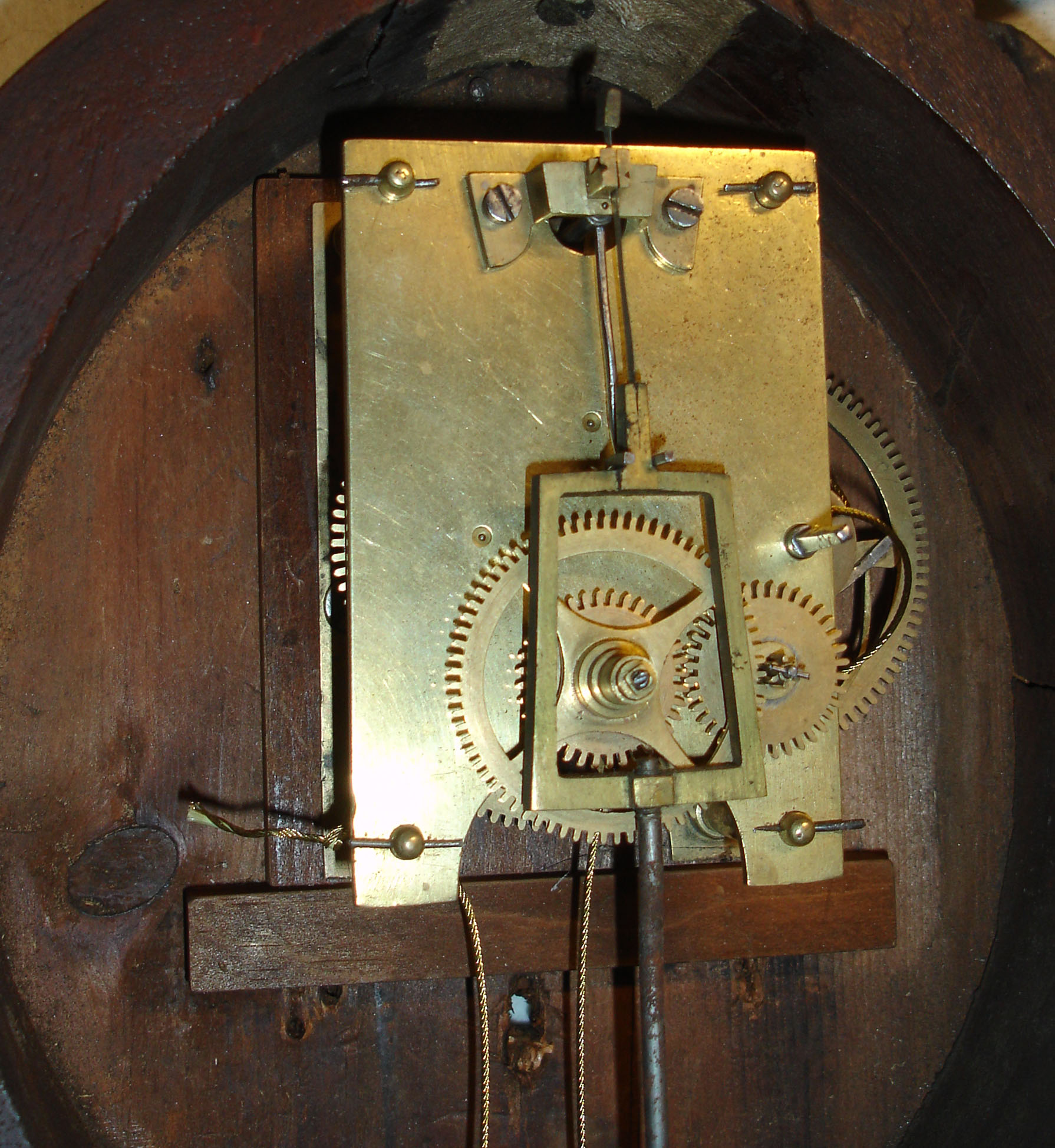 Mahogany and mahogany veneered case in nice condition in an old and possibly original finish. Original painted dial has some loss at the mounting pins and some wear in spots to the chapter ring. Original hands. Movement is mounted to the case with two screws through the backplate.