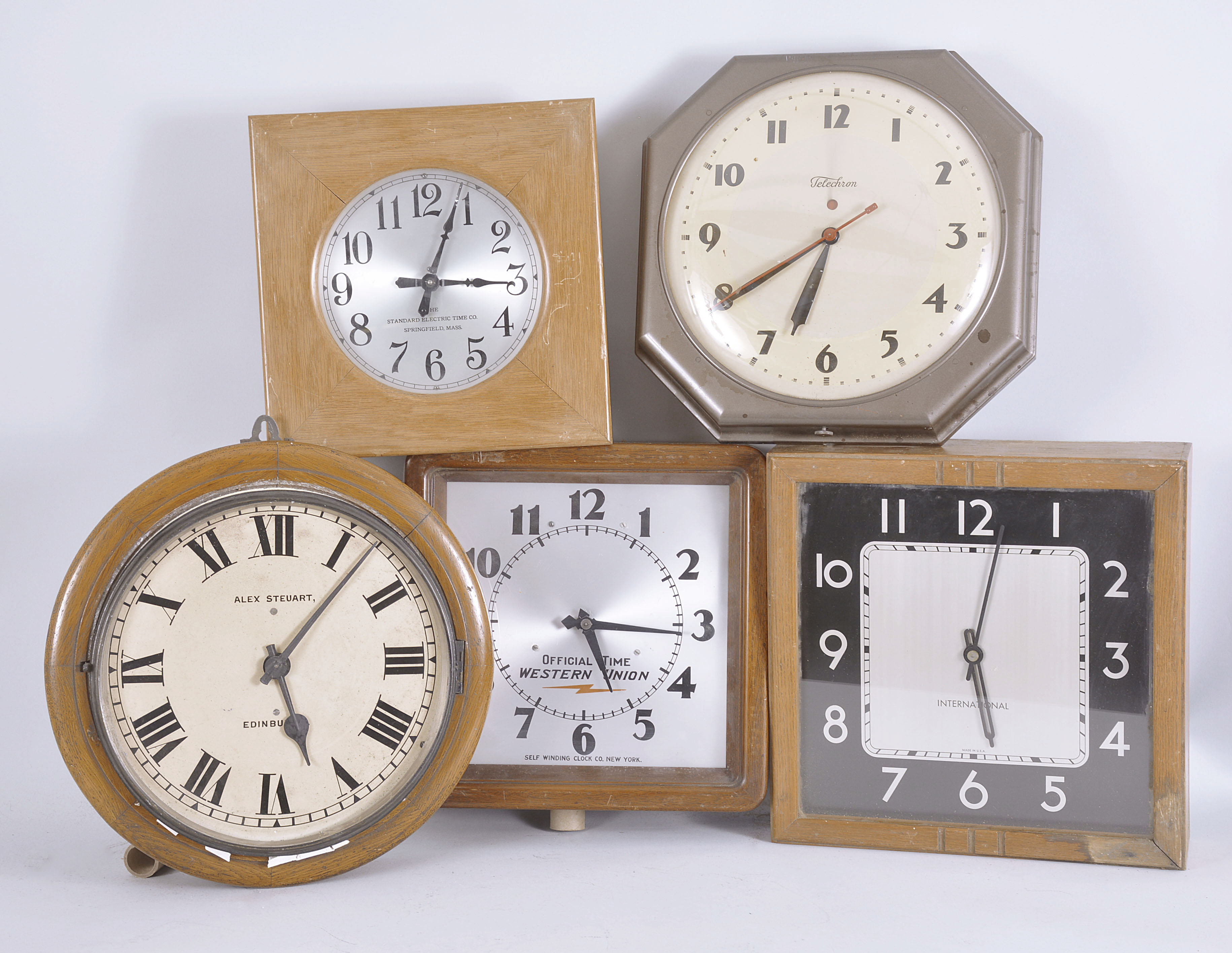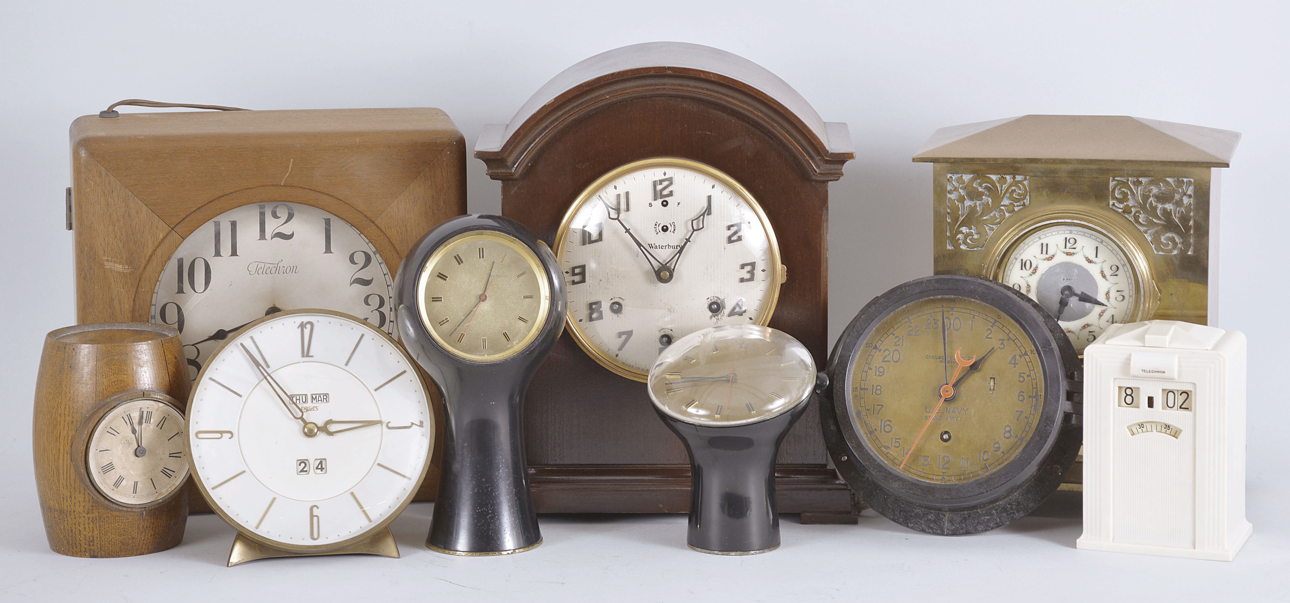 Clocks- 15 (Fifteen): diverse lot of spring driven, electric, and electromechanical clocks by makers such as Standard Electric, Telechron, Self-winding Clock Co., International Business Machines, Forestville Clock Co., New Haven, and others. Also included is a deck and engine room clock in a black phenolic case by Chelsea