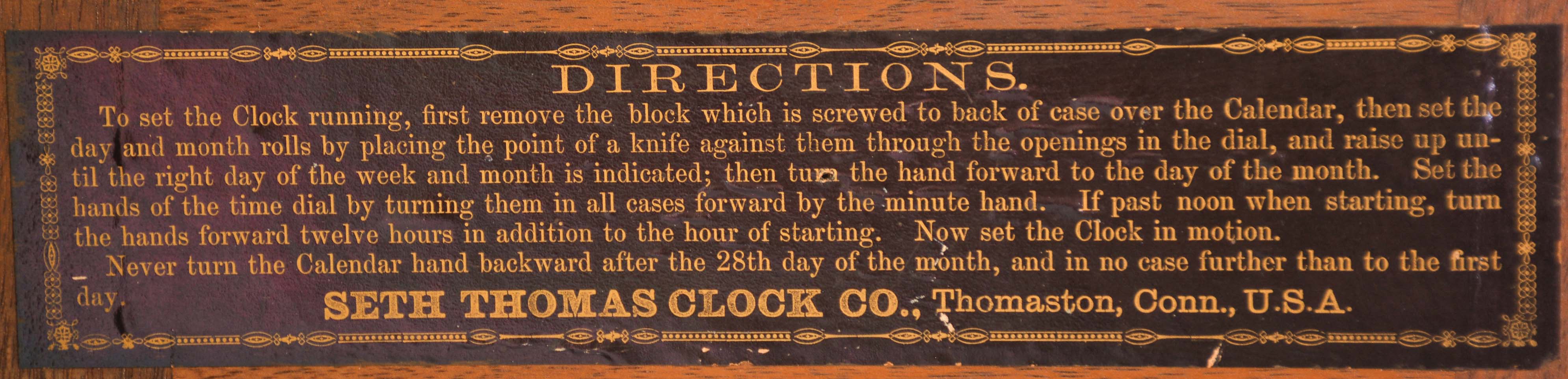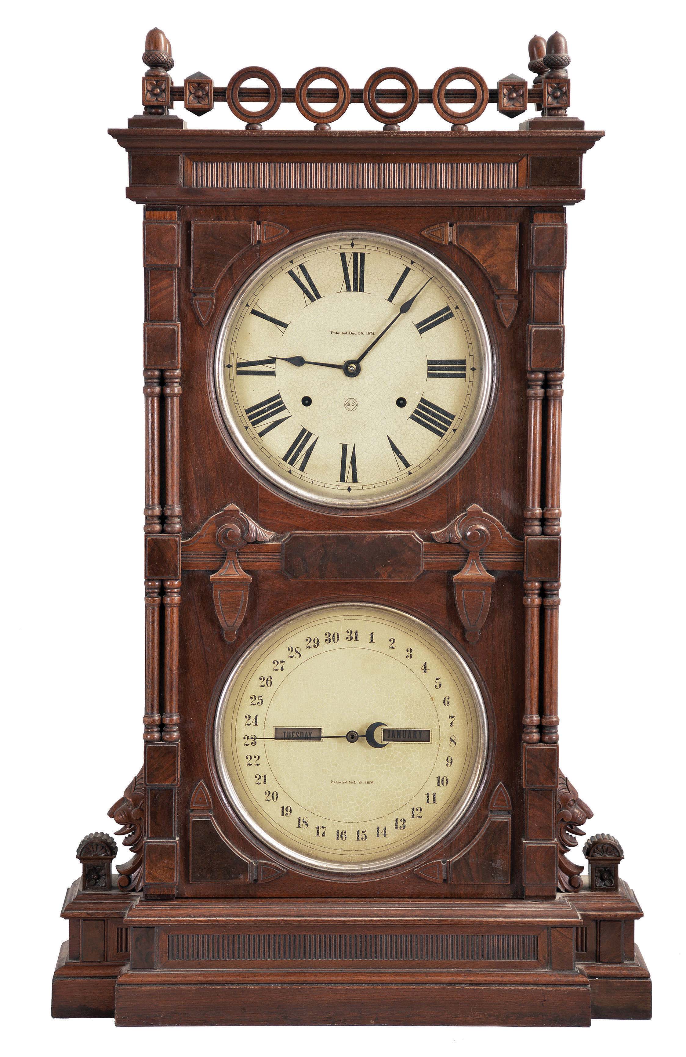 Seth Thomas Clock Co., Thomaston, Conn., "Parlor Calendar No. 10" shelf clock, 8 day, time, cathedral gong strike and perpetual calendar, weight driven movement in an ornately carved walnut case with painted metal dials