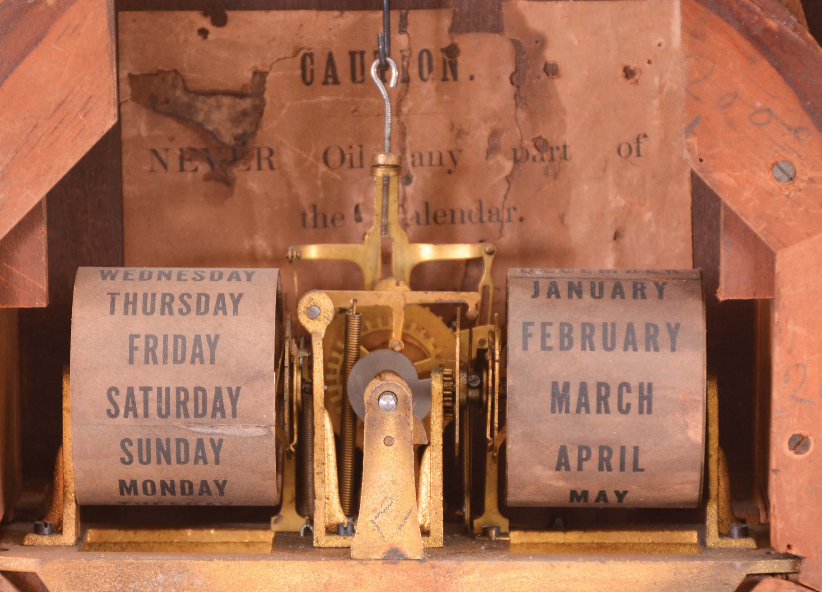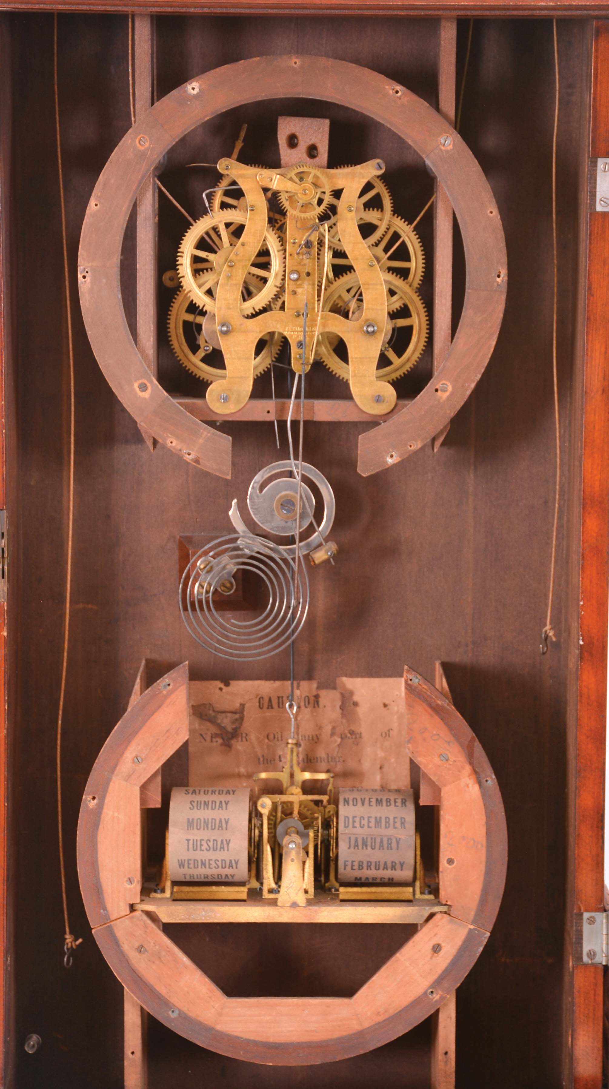 the case retains its original finish. The upper dial has several extra mounting holes beneath. The lower dial pan is original but has been repainted. The arcaded top has some loose elements packed within the case. The weights and calendar rolls are original.