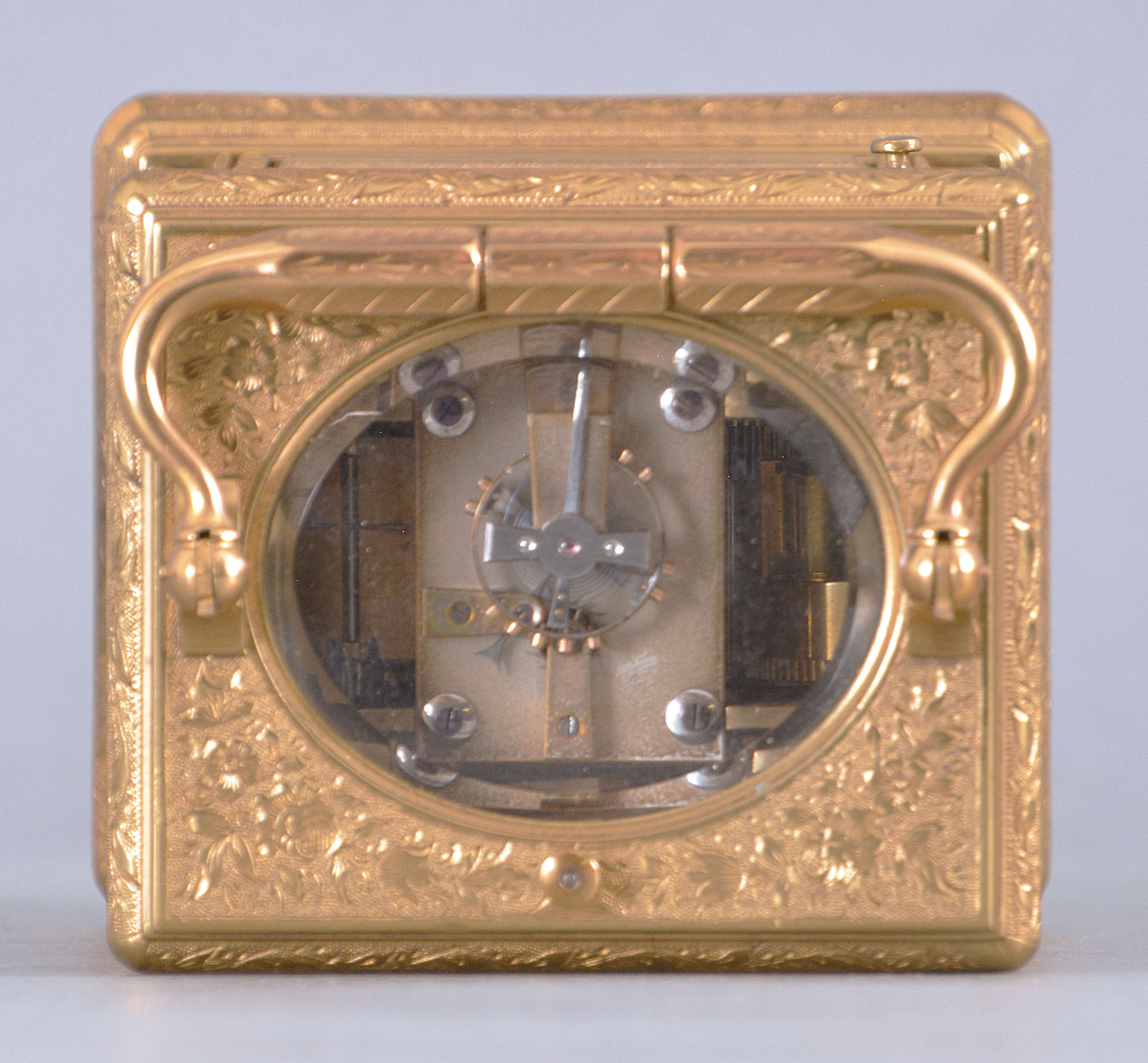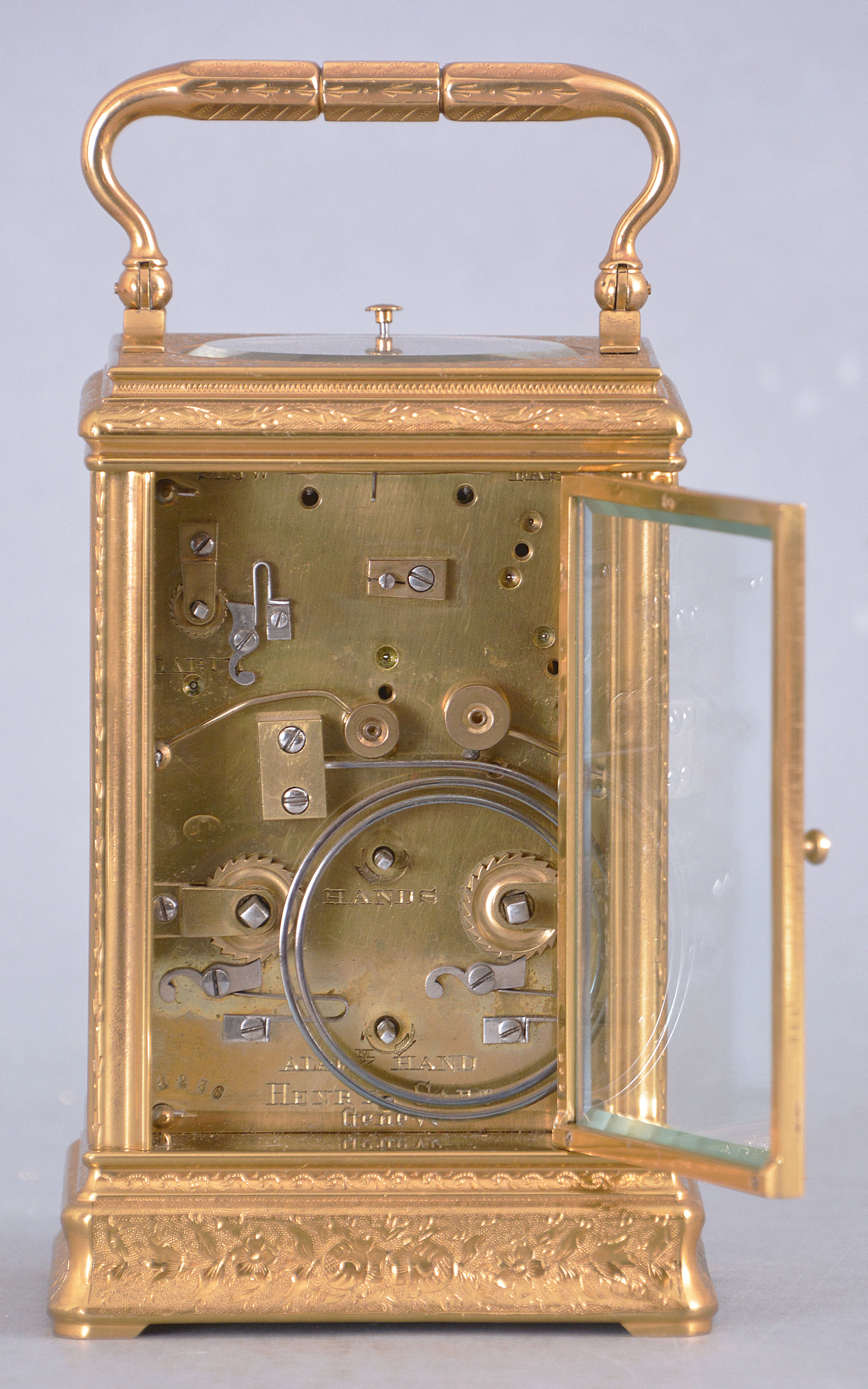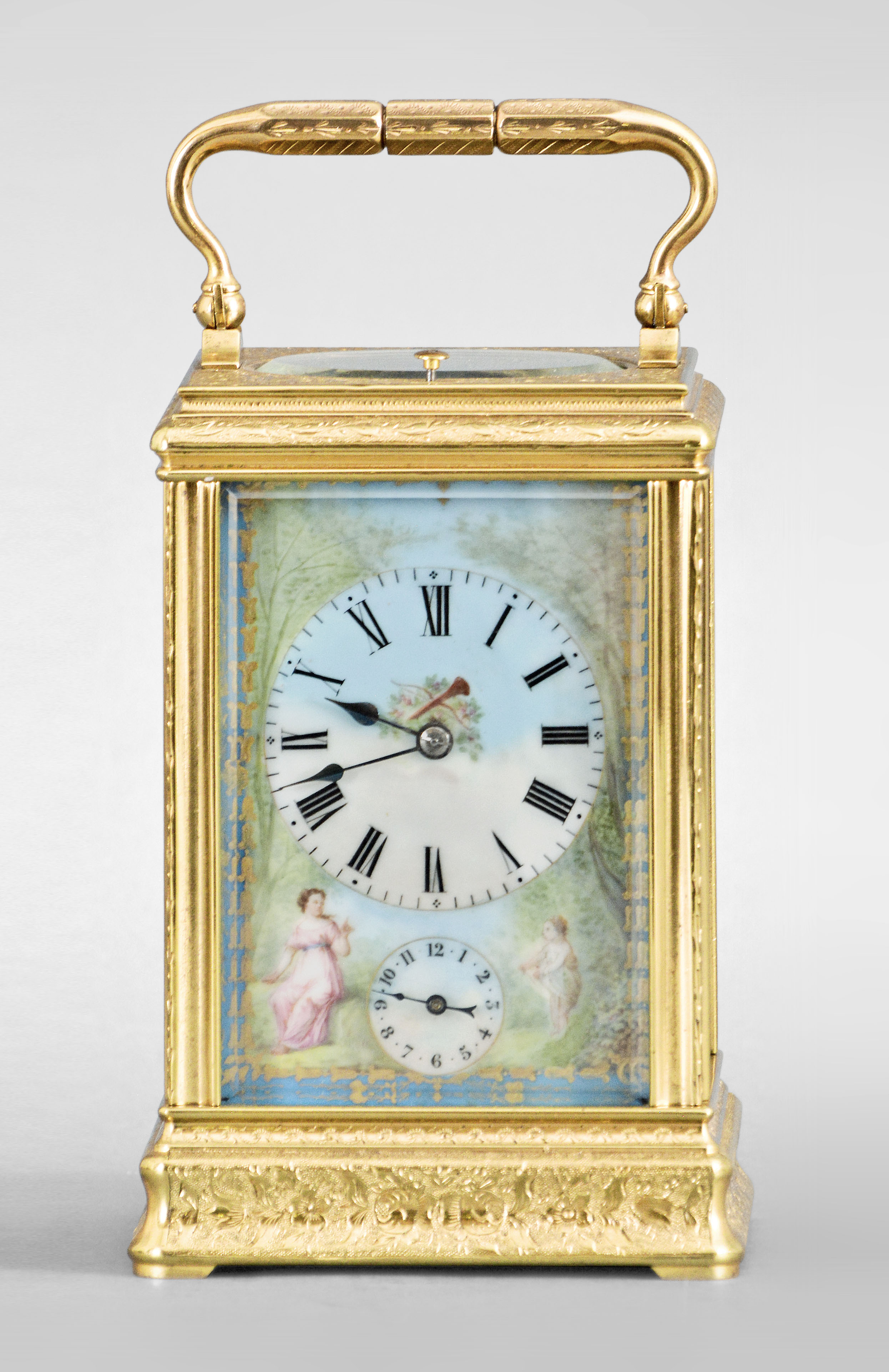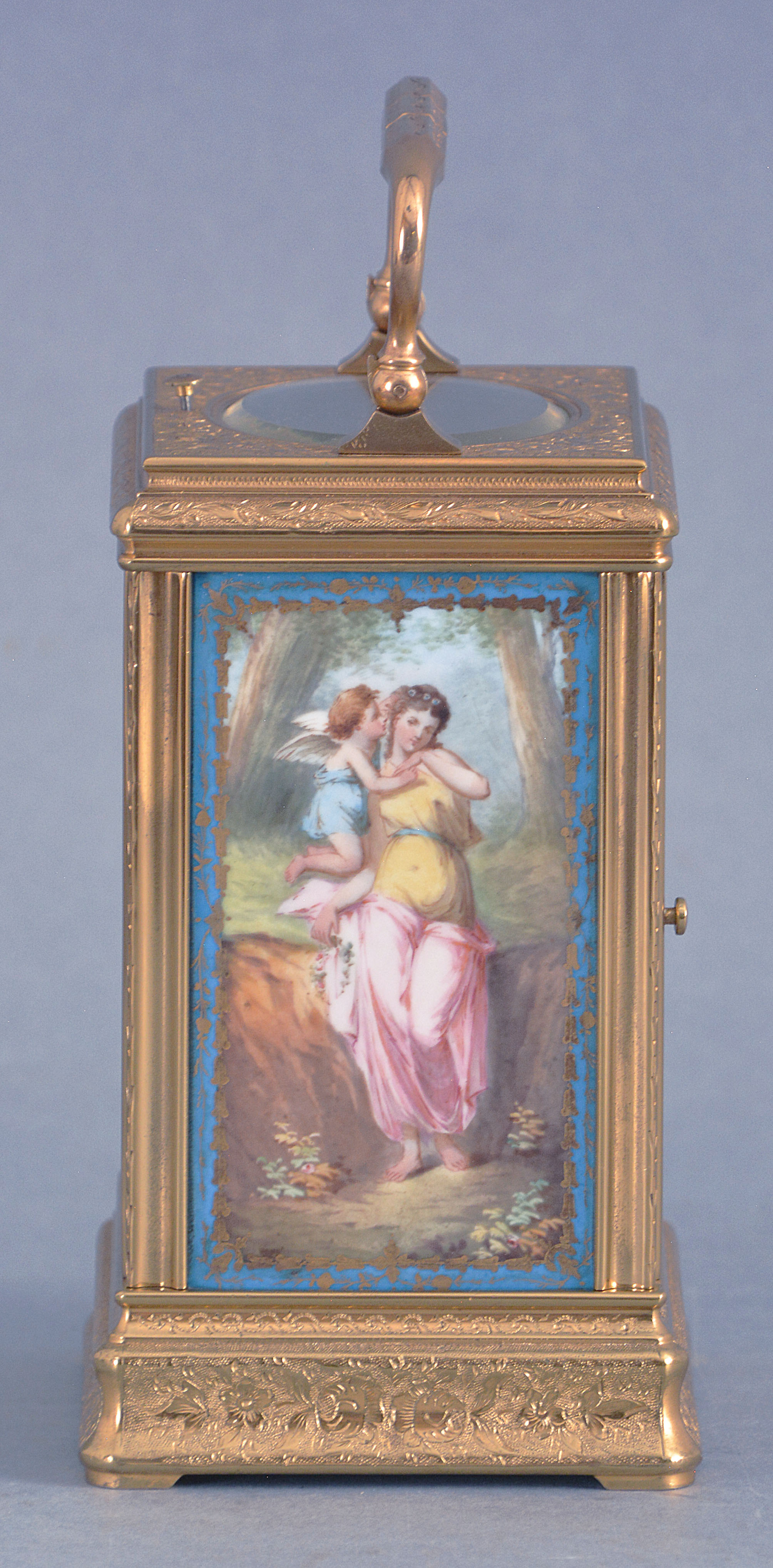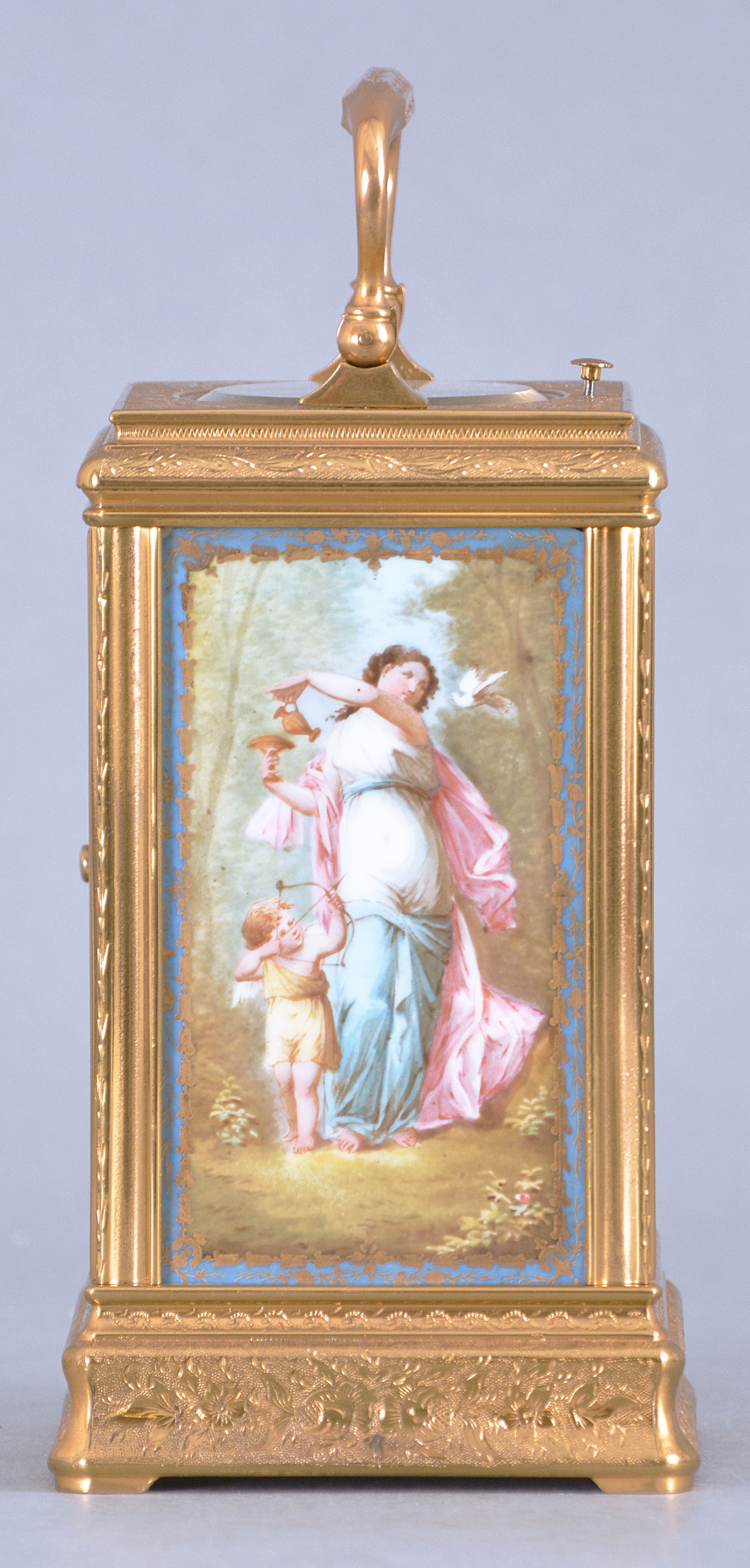 Drocourt, Paris, for Henry Capt, Geneve, a very decorative, engraved gorge cased carriage clock with polychrome porcelain panels, the case of typical gorge form, richly engraved with foliate ornament, the front, top, and back with bevelled glasses, the dial and sides with colorful porcelain panels, the sides with female figures in forested landscapes, each under the influence of cupid, the dial also with a forest scene, but with the woman seated, and warning cupid off, and roman numeral chapter ring with subsidiary alarm dial, blued steel hands, 8 day, three train movement with 12 jewel lever platform, sounding the hours and half hour in passing, and repeating the last hour on demand, serial # 11236, case bottom engraved "London Branch 151 Regent St.", Capt's London address