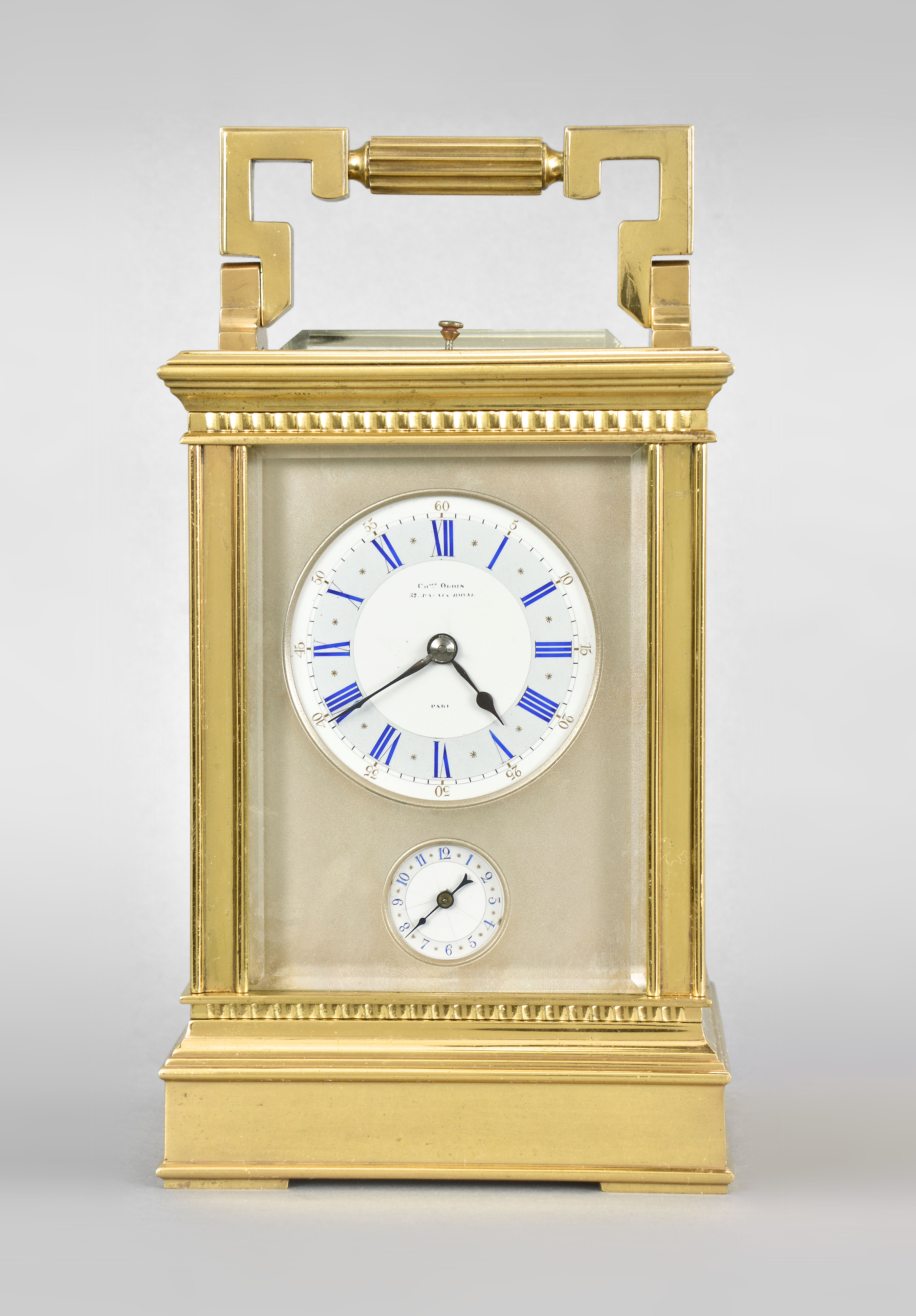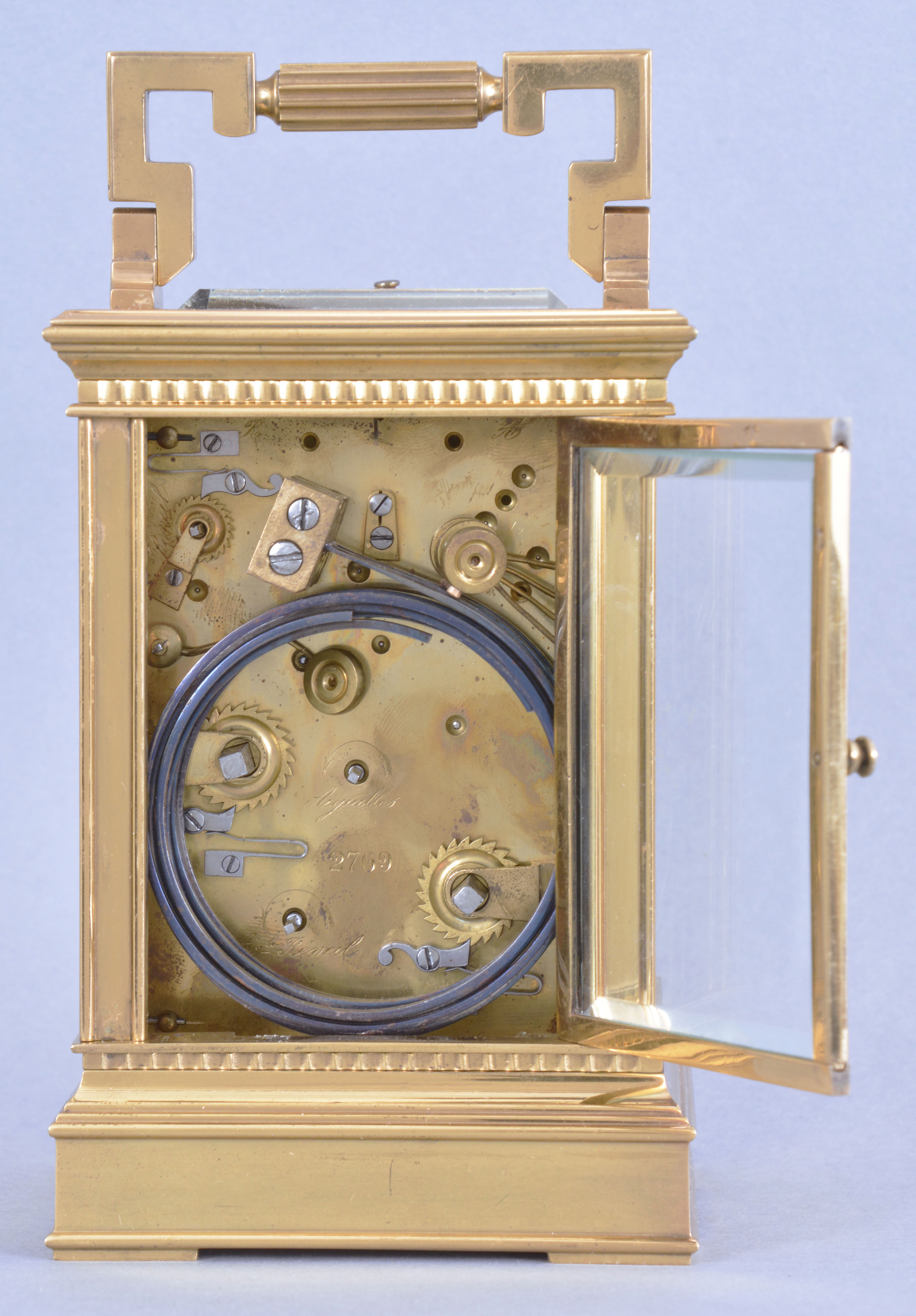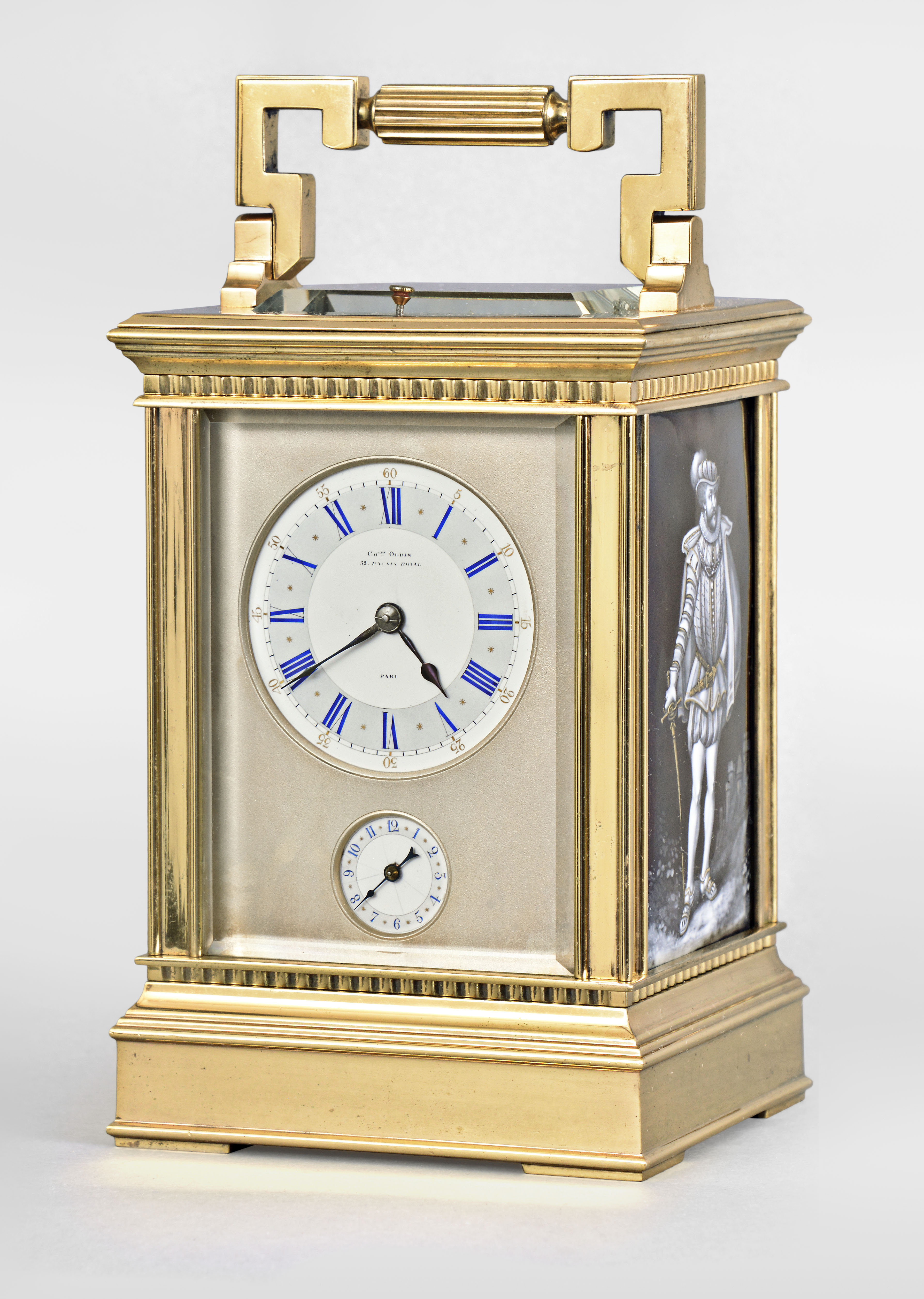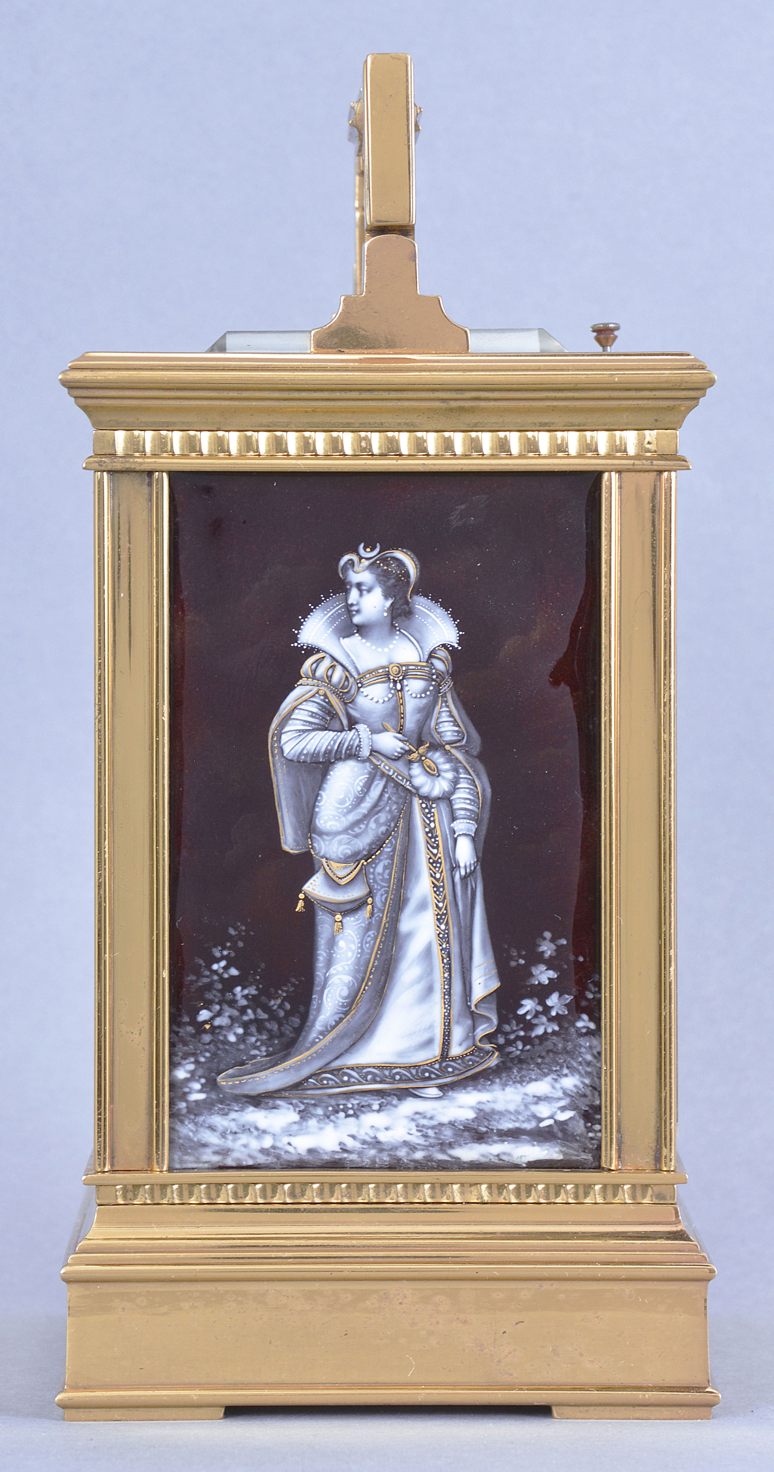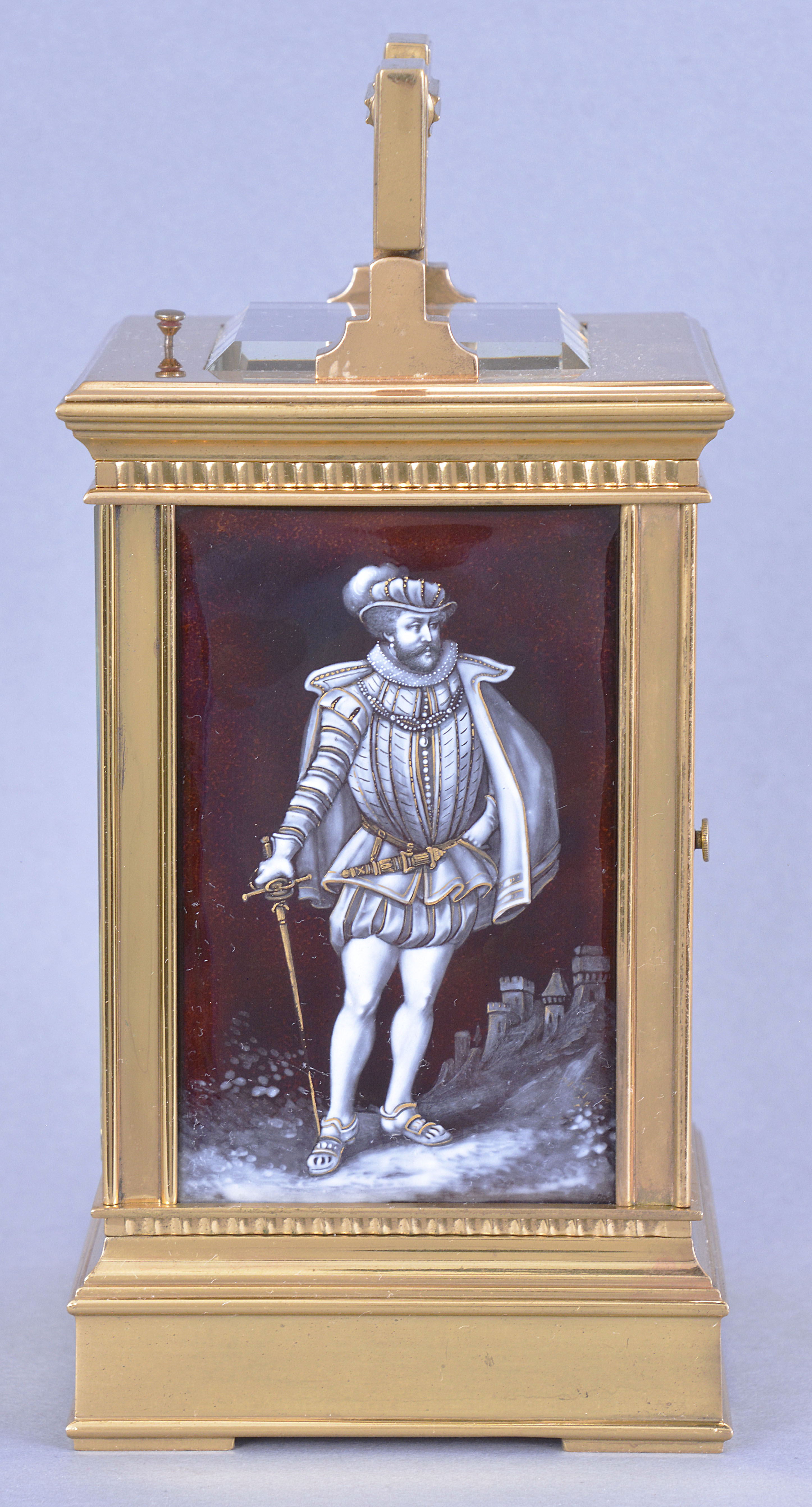 Alfred Baveux for Charles Oudin, 52 Palais Royal, Paris, an exceptional Anglaise style, Limoges panelled, grand sonnerie carriage clock striking on four gongs, the gilt case of typical Anglaise Riche form, the sides with Limoges grisaille enamel panels with transparent plum ground, the right side with a man standing in a landscape with a castle in the background, the left side with a woman standing in a landscape, both figures in Elizabethan dress, each rendered in stunning detail and with gold highlights, matte silvered mask with roman numeral white enamel dial having blue numerals on a pale blue ground, with gold outer five minute markers, above a matching, subsidiary arabic alarm chapter, blued steel hands 8 day, three train movement with 13 jewel counterpoised lever platform and cut, bimetallic balance, sounding the hours and quarters in passing on four gongs, and repeating the last hour and quarter on demand, base with three position lever for selecting strike mode, with Alfred Baveux's mark on the inside of the back plate, Baveux serial #3882, Oudin serial #2769