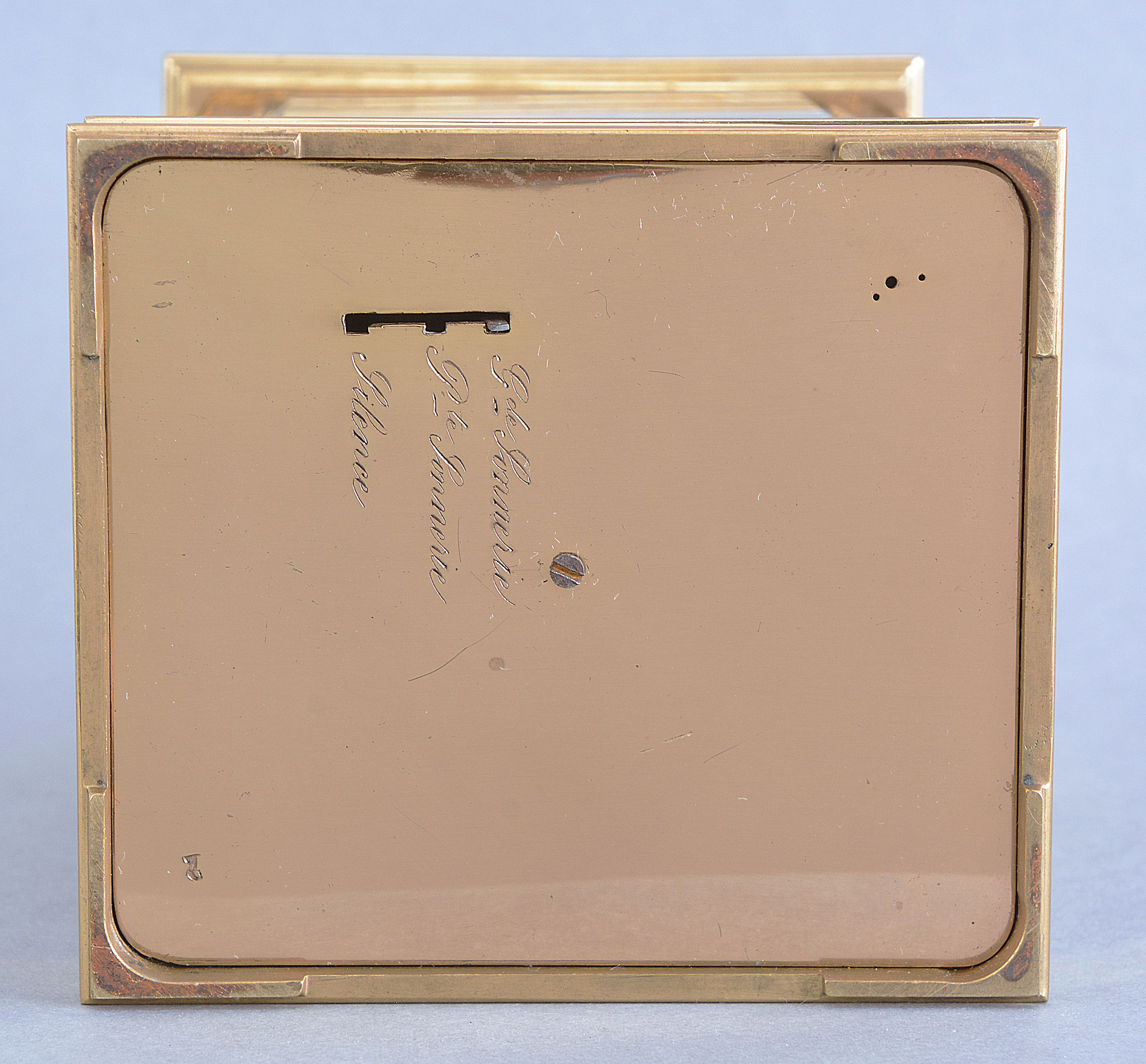 gilding restored, case with scattered spotting, top glass with chips at right edge, rear glass with chip at lower right, enamel panels very good, with minor wear to gold, dial mask with minor discoloration, time dial with minor losses to signature, alarm dial with with hairlines and minor chips, hour hand repaired, movement dirty, but running well, movement with some tarnish and staining, striking and repeating correctly, gongs with specks of oxide