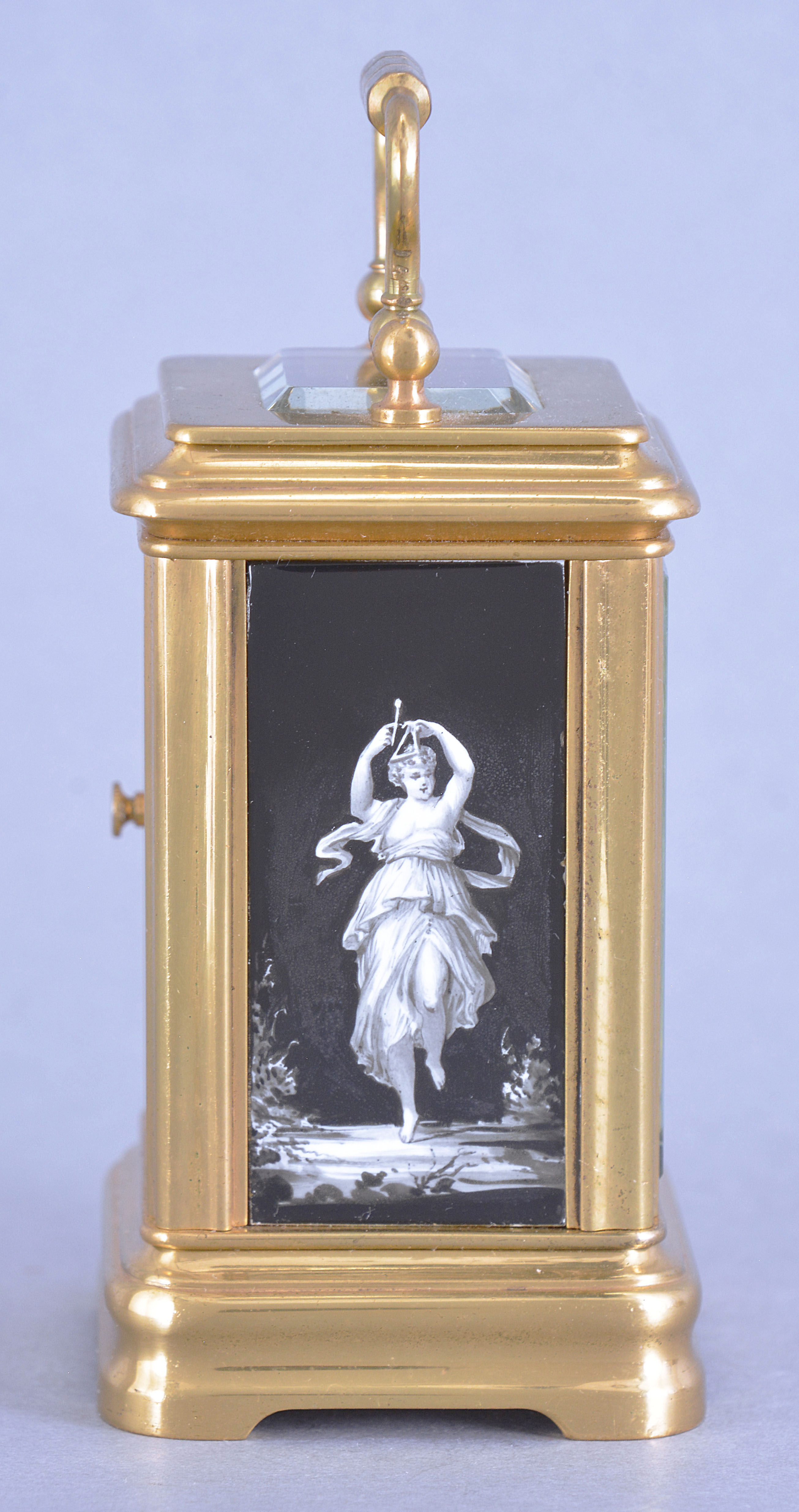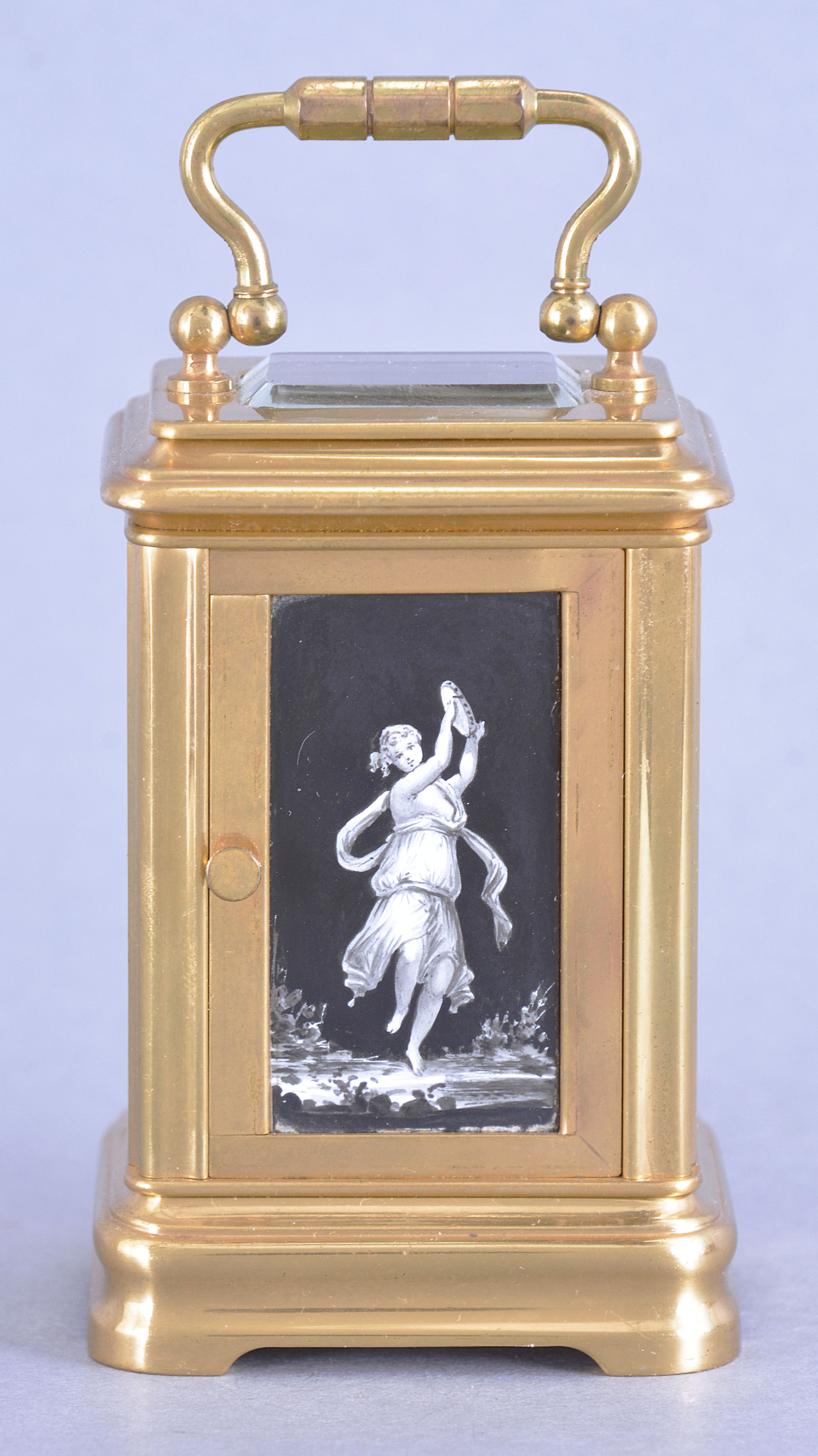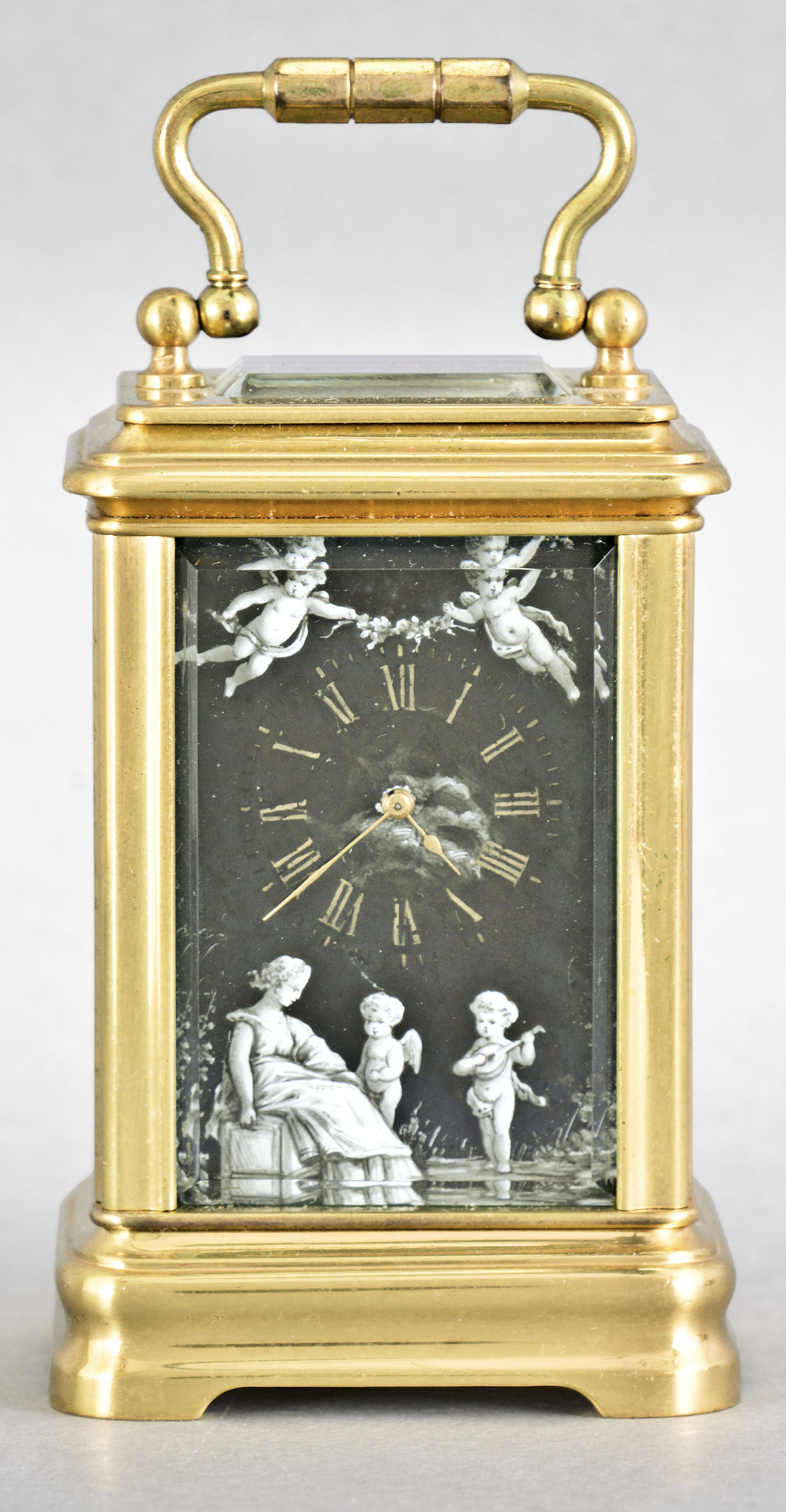 France, a Mignonette #2 size, Gorge case carriage timepiece with grisaille enamel panels and dial, the polished brass case with bevelled glasses at the front and top, black enameled roman numeral dial with gold spade and whip hands, a pair of facing putti above 12:00 suspending a garland of flowers, and a seated female figure at lower left, accompanied by two putti, the sides and back also with dancing female muses in landscapes, executed in varying tones of gray, and 8 day timepiece movement with lever platform