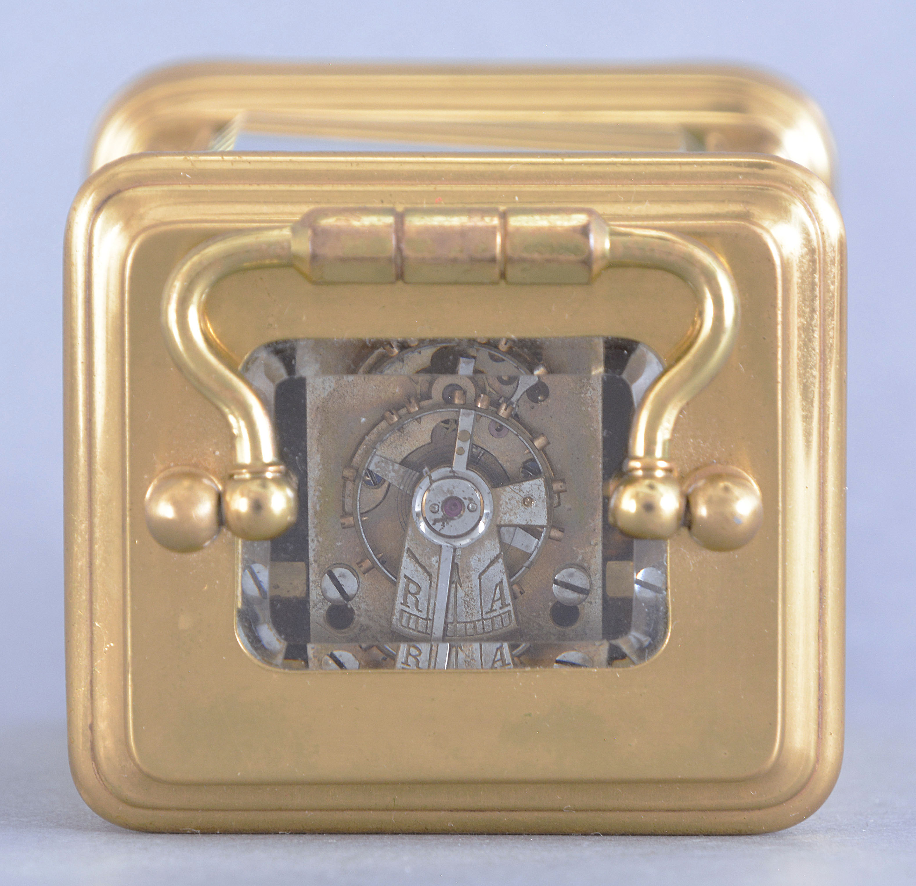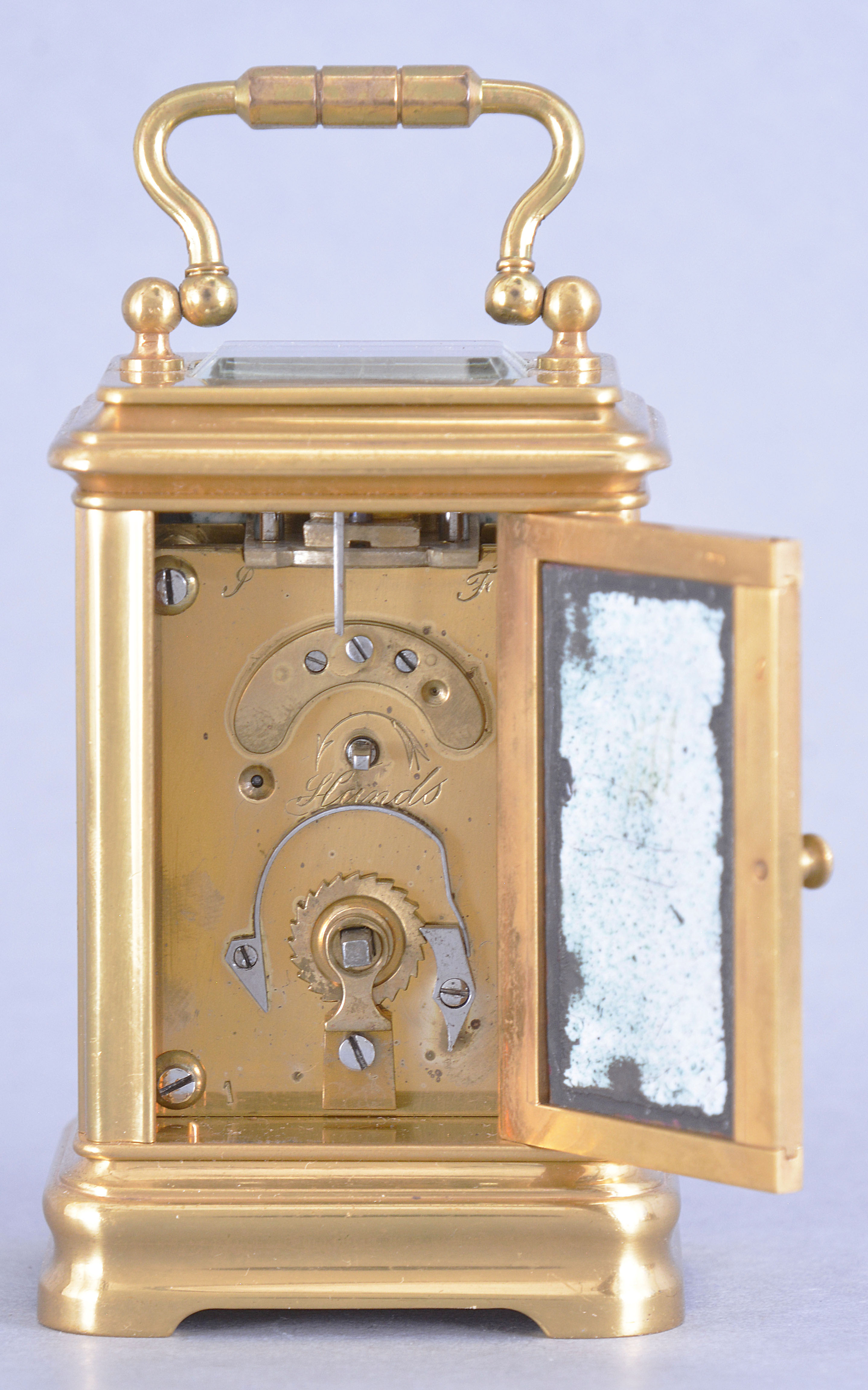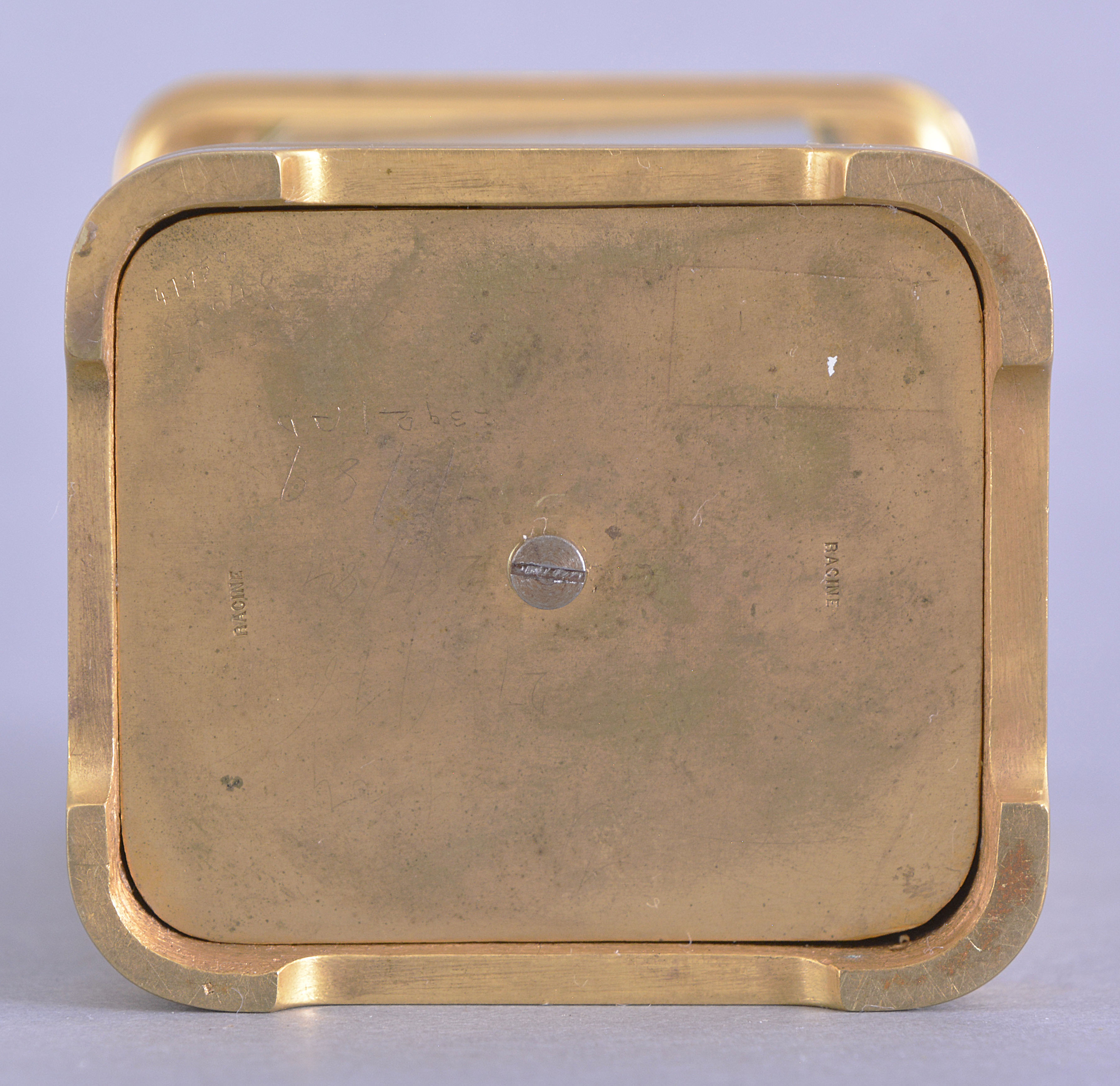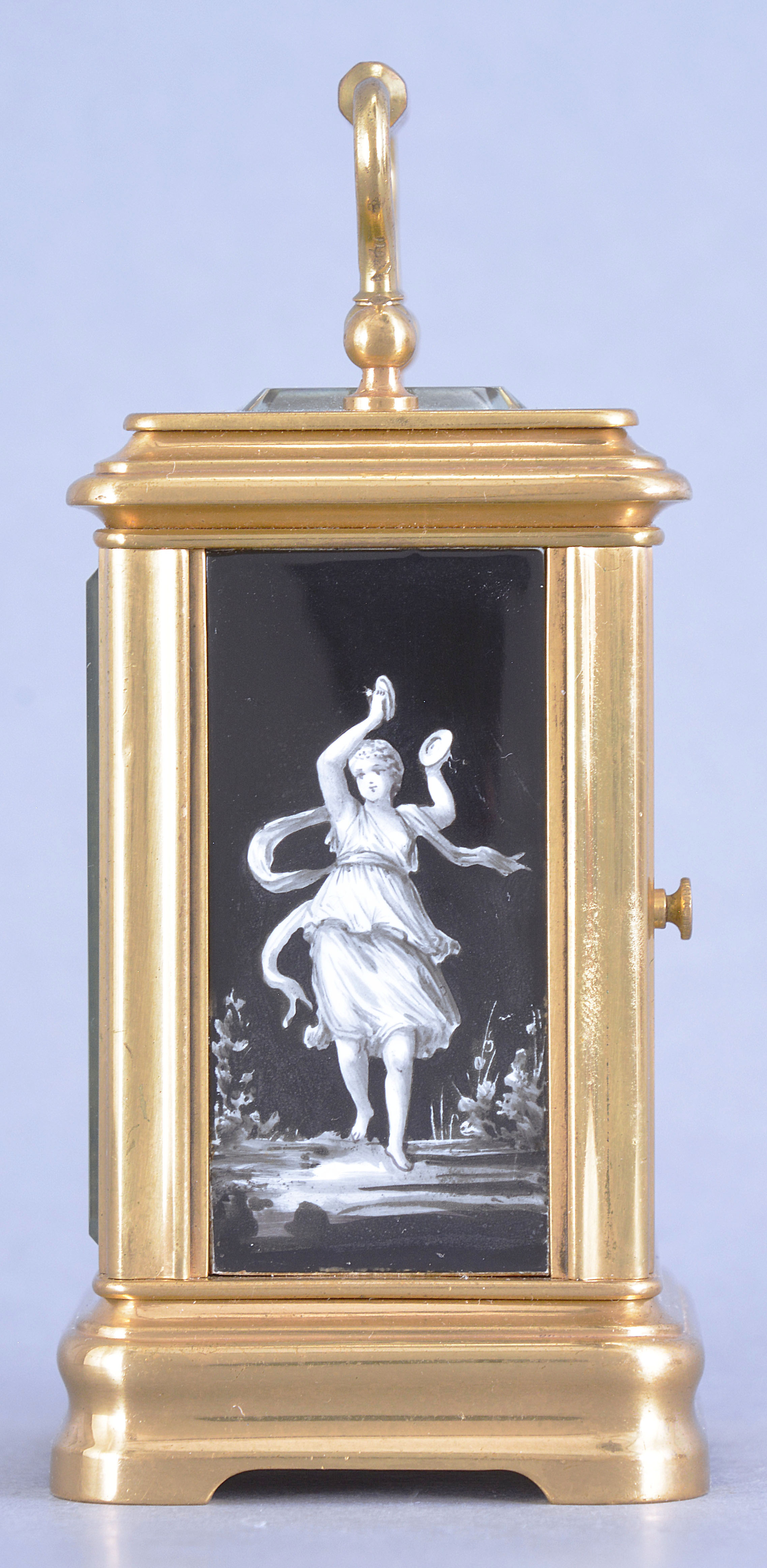 France, a Mignonette #2 size, Gorge case carriage timepiece with grisaille enamel panels and dial, the polished brass case with bevelled glasses at the front and top, black enameled roman numeral dial with gold spade and whip hands, a pair of facing putti above 12:00 suspending a garland of flowers, and a seated female figure at lower left, accompanied by two putti, the sides and back also with dancing female muses in landscapes, executed in varying tones of gray, and 8 day timepiece movement with lever platform