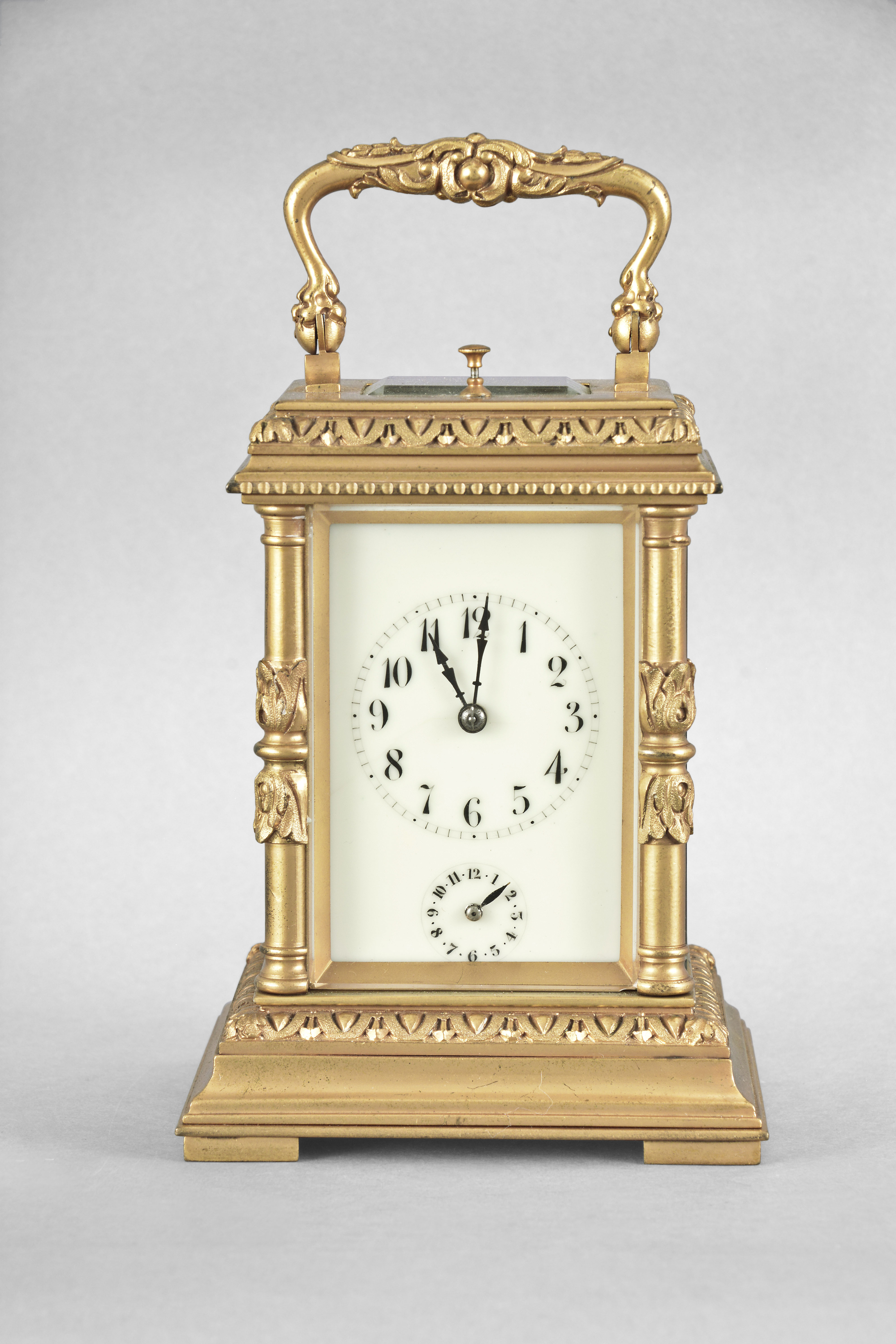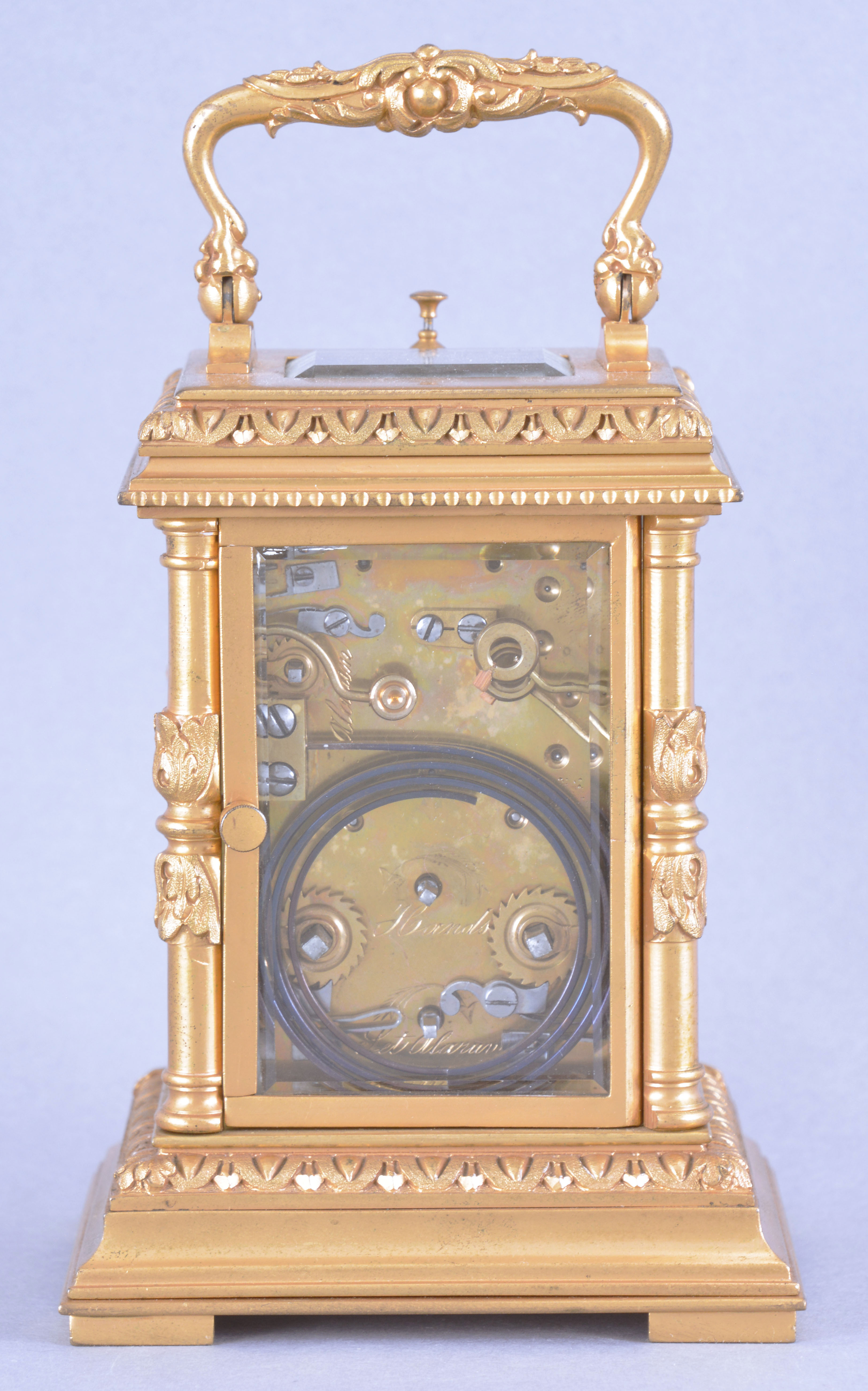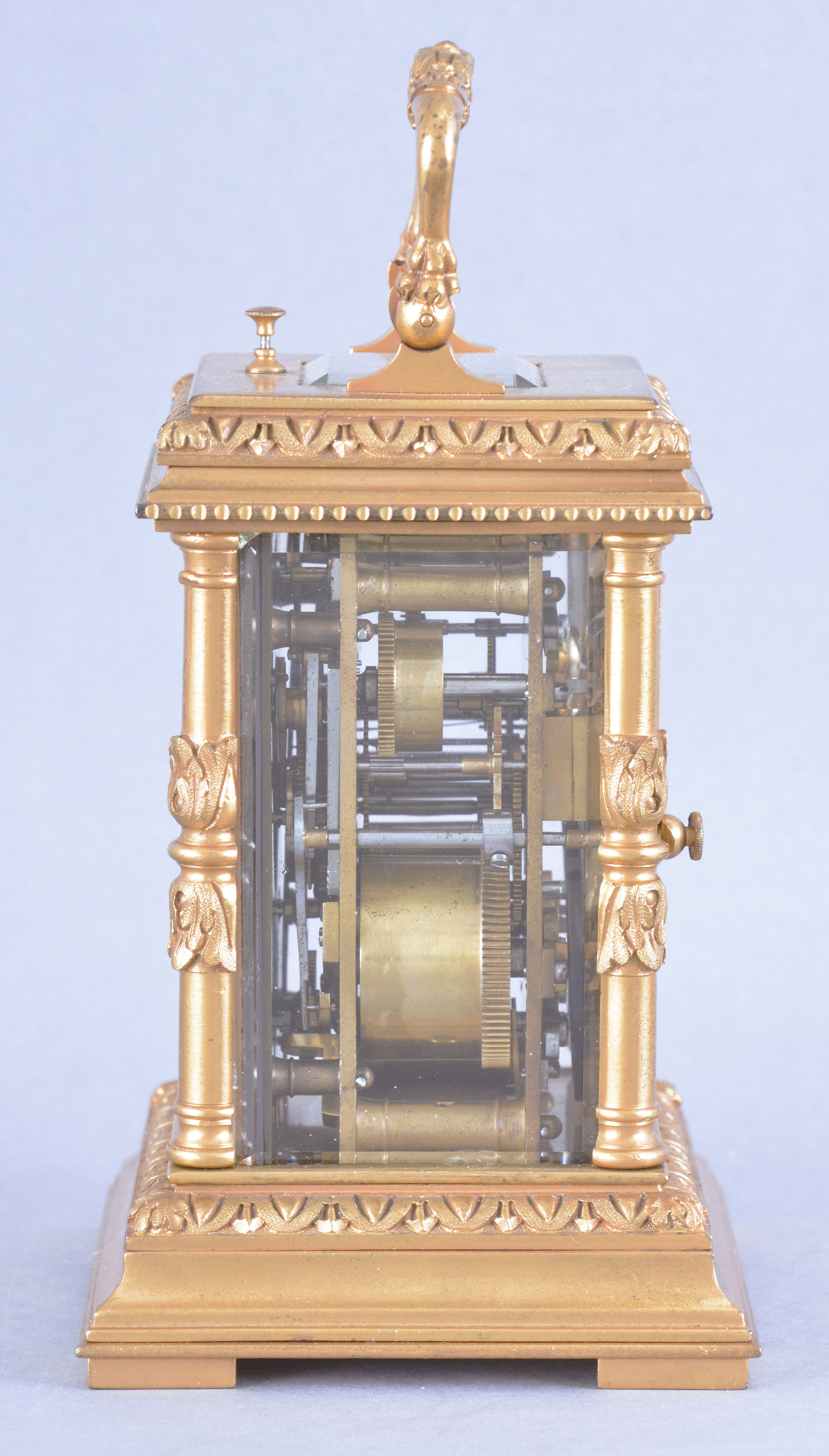 France, a good petite sonnerie striking carriage clock with alarm and pillars variant case, the cavetto molded base on four low square feet below a bold egg and dart molding, the corners with foliate ornamented round columns supporting a molded cornice with narrow fluted band, egg and dart molding, and surmounted by a foliate ornamented handle terminating in paw feet, arabic numeral white enamel dial with subsidiary alarm chapter, blued steel distaff hands, 8 day three train movement with lever platform, striking ting tang quarters in passing, and with full grand sonnerie repeating on demand, the base with lever for selecting chime mode