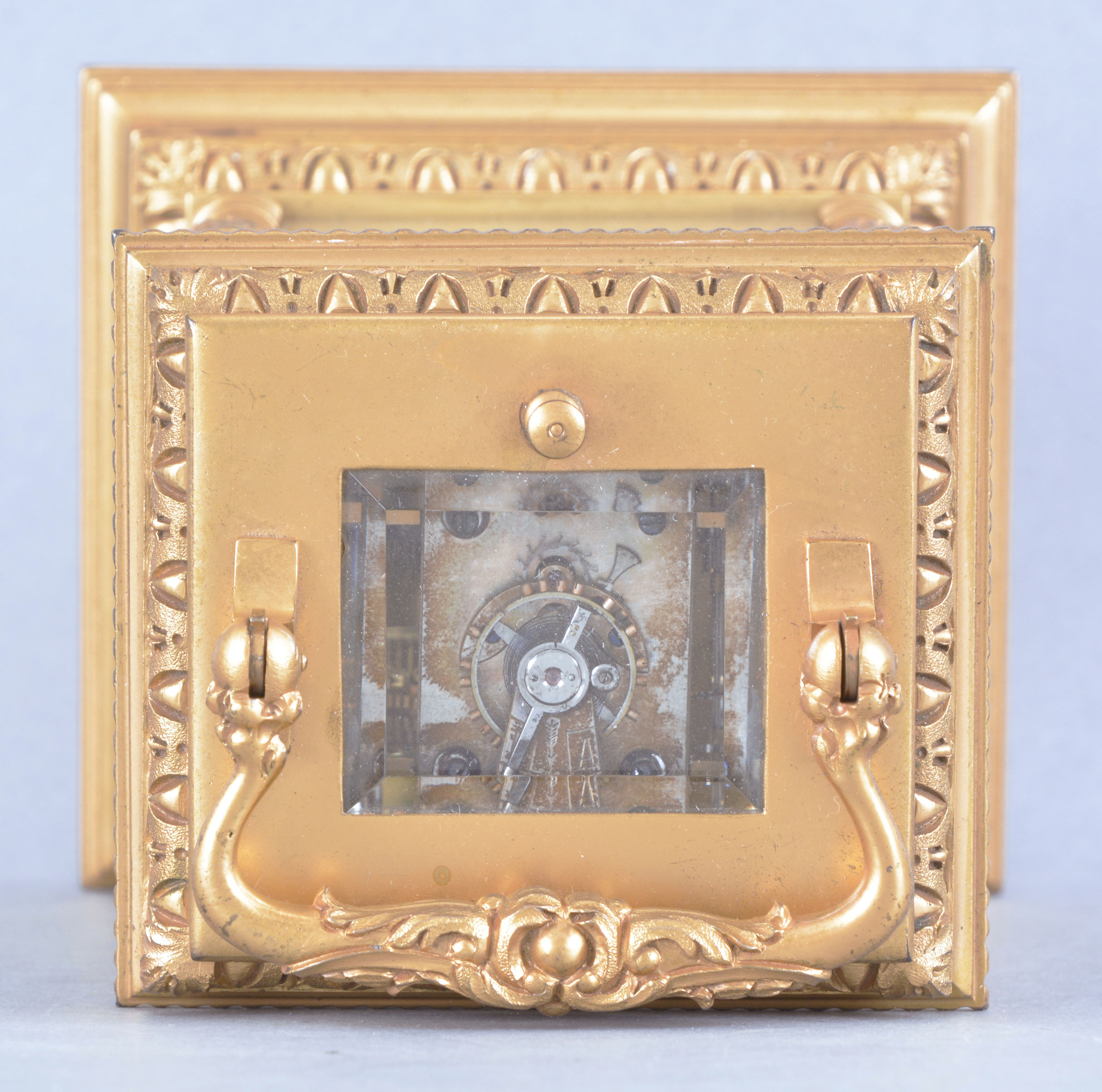 a bit dirty, gilding with very minor wear, front glass with flake at left edge, and small chip at lower right, right side glass with small chips at upper left and lower edge, top glass with small chip at right edge, dial with faint hairline at 8:00, movement with minor staining, running, strikes the petit quarters correctly, sounds the previous hour and three quarters at the hour, repeats the correct hour a few minutes after the hour, alarm functional, alarm hammer replaced, would benefit from service, serial #135