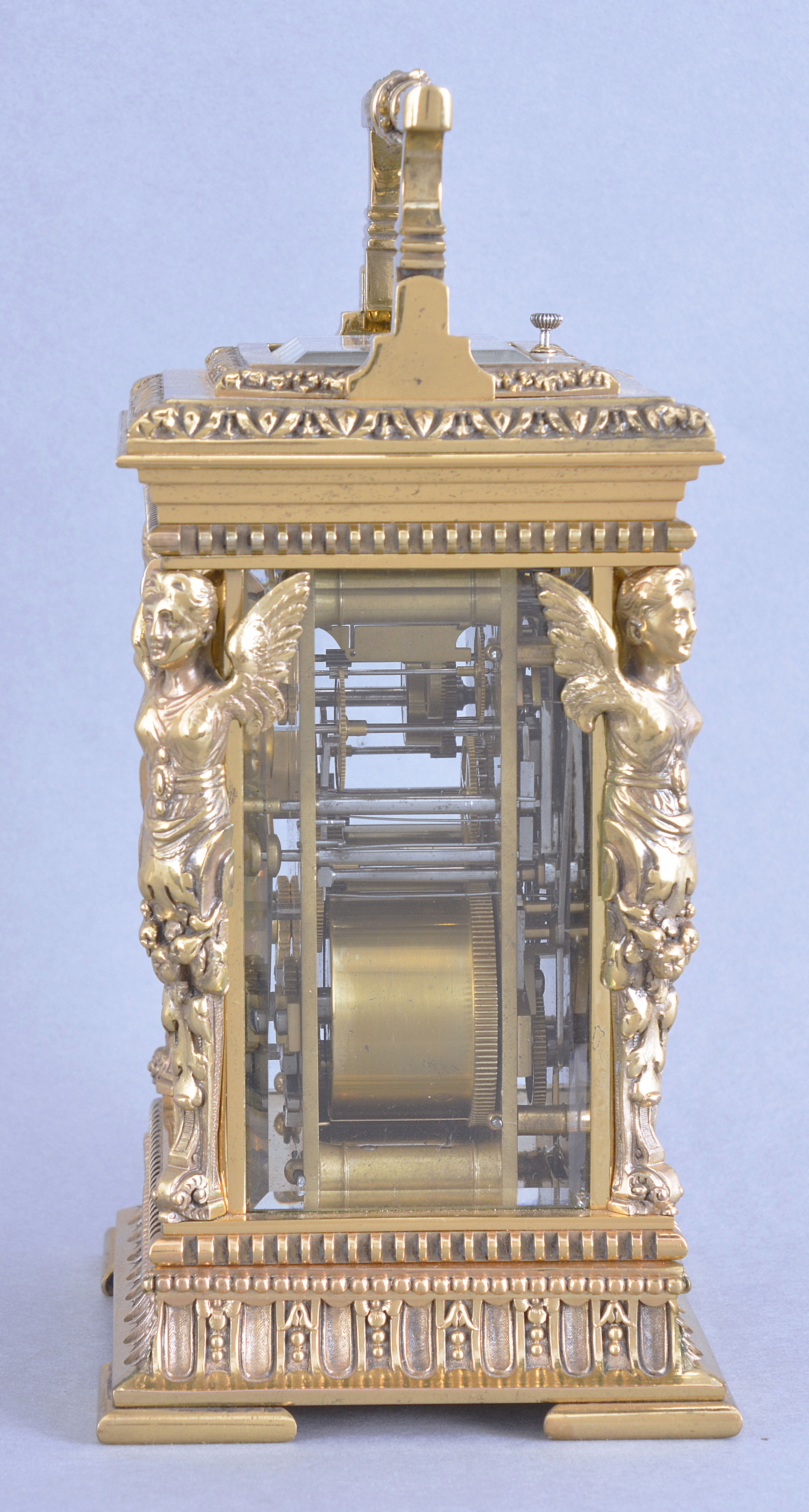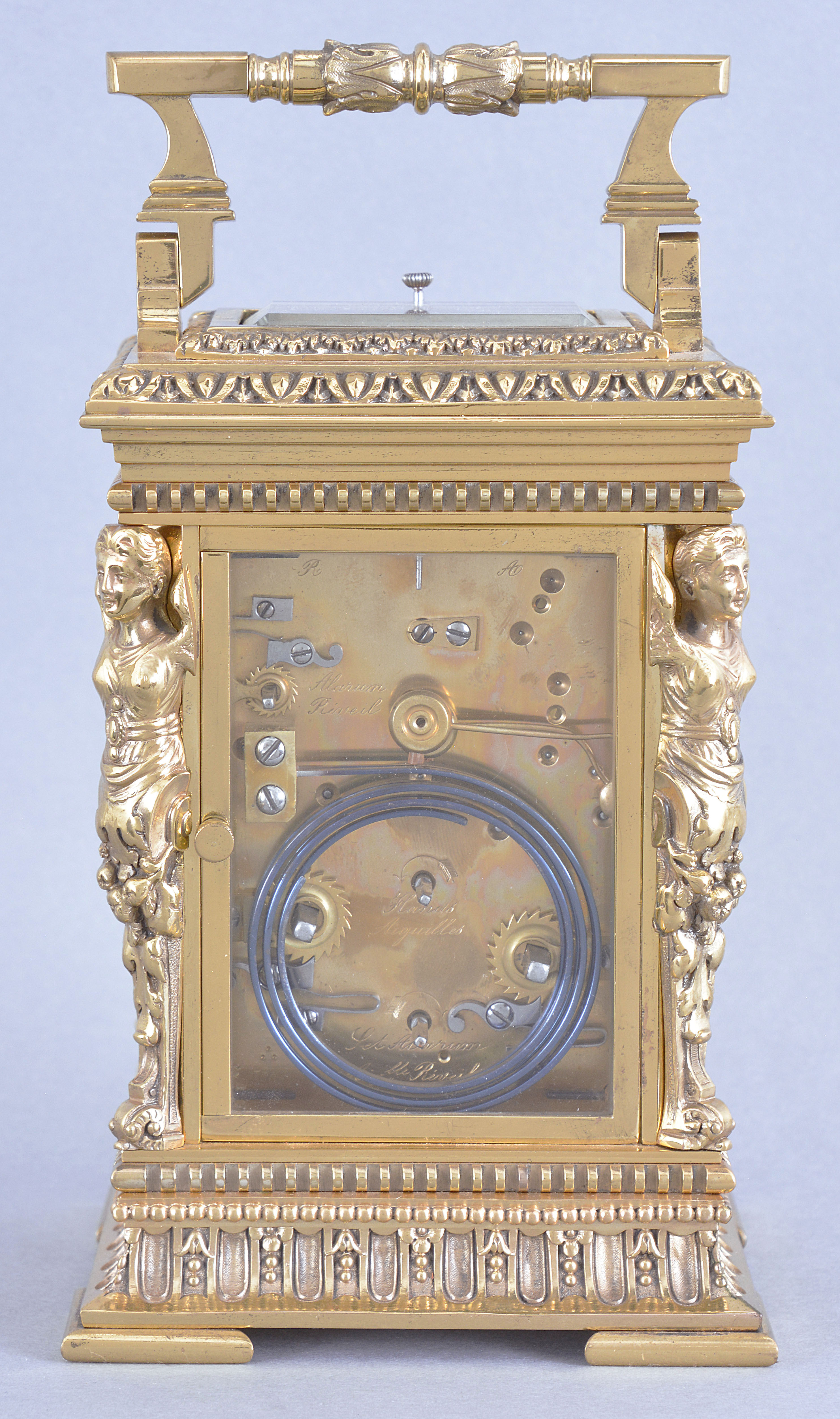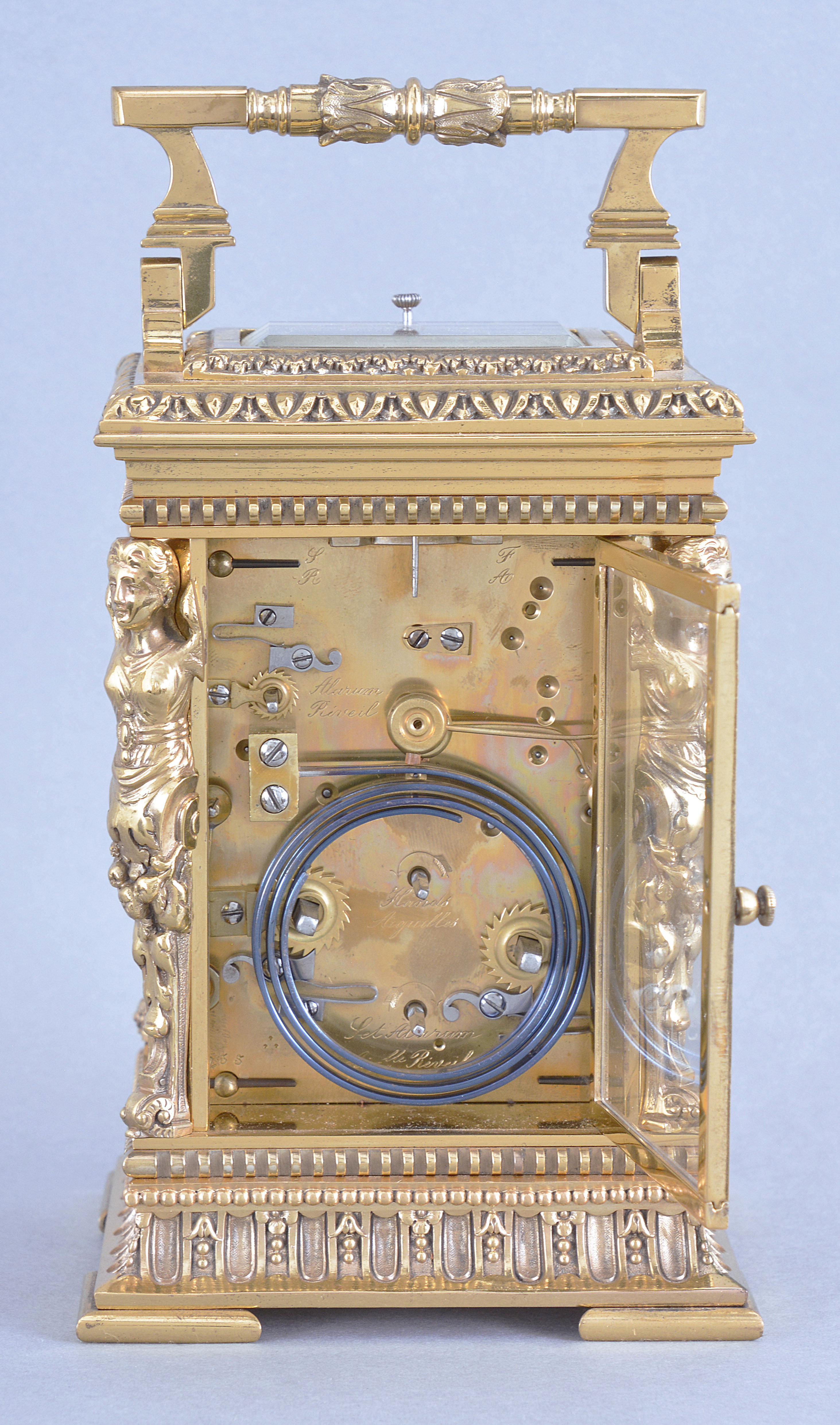 France, a large, Cariatides style, grand sonnerie striking carriage clock, the base with slotted and bead moldings above a fluted cavetto molding with alternating floral and pendant husk ornament, and four cock bead feet, the corners with caryatids supporting a stepped, molded cornice crowned by an egg and dart molding, the top with leaf and dart molded, glazed escapement viewing aperture and folding, foliate ornamented handle, arabic numeral white enamel dial with subsidiary alarm chapter and silver openwork mask with chased and engraved naturalistic ornament, blued steel distaff hands, 8 day, three train movement with 11 jewel lever platform and cut bimetallic balance, sounding the hours and quarters in passing and repeating the last hour and quarter on demand, the base with three position lever for selection of strike mode, serial #255
