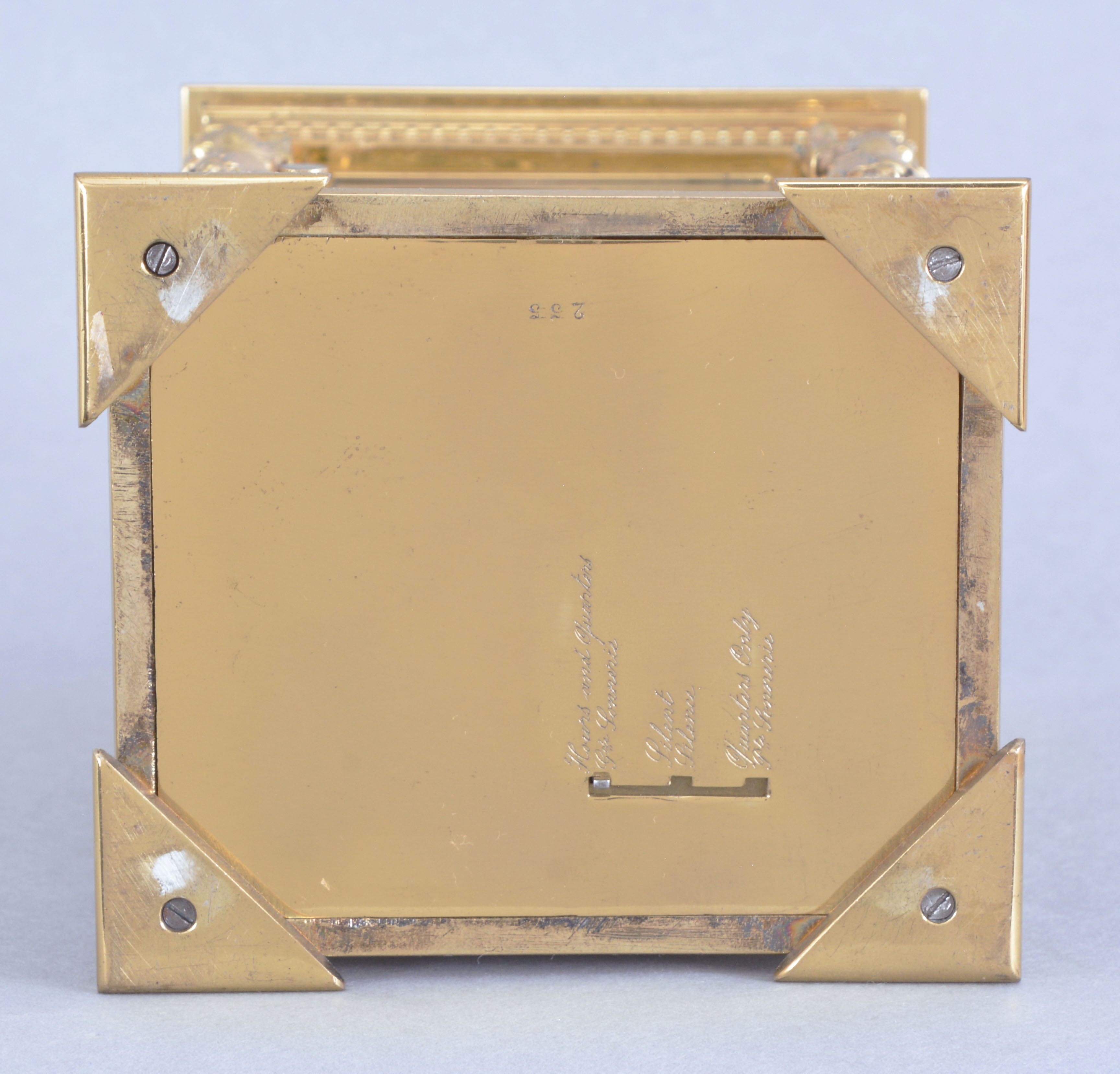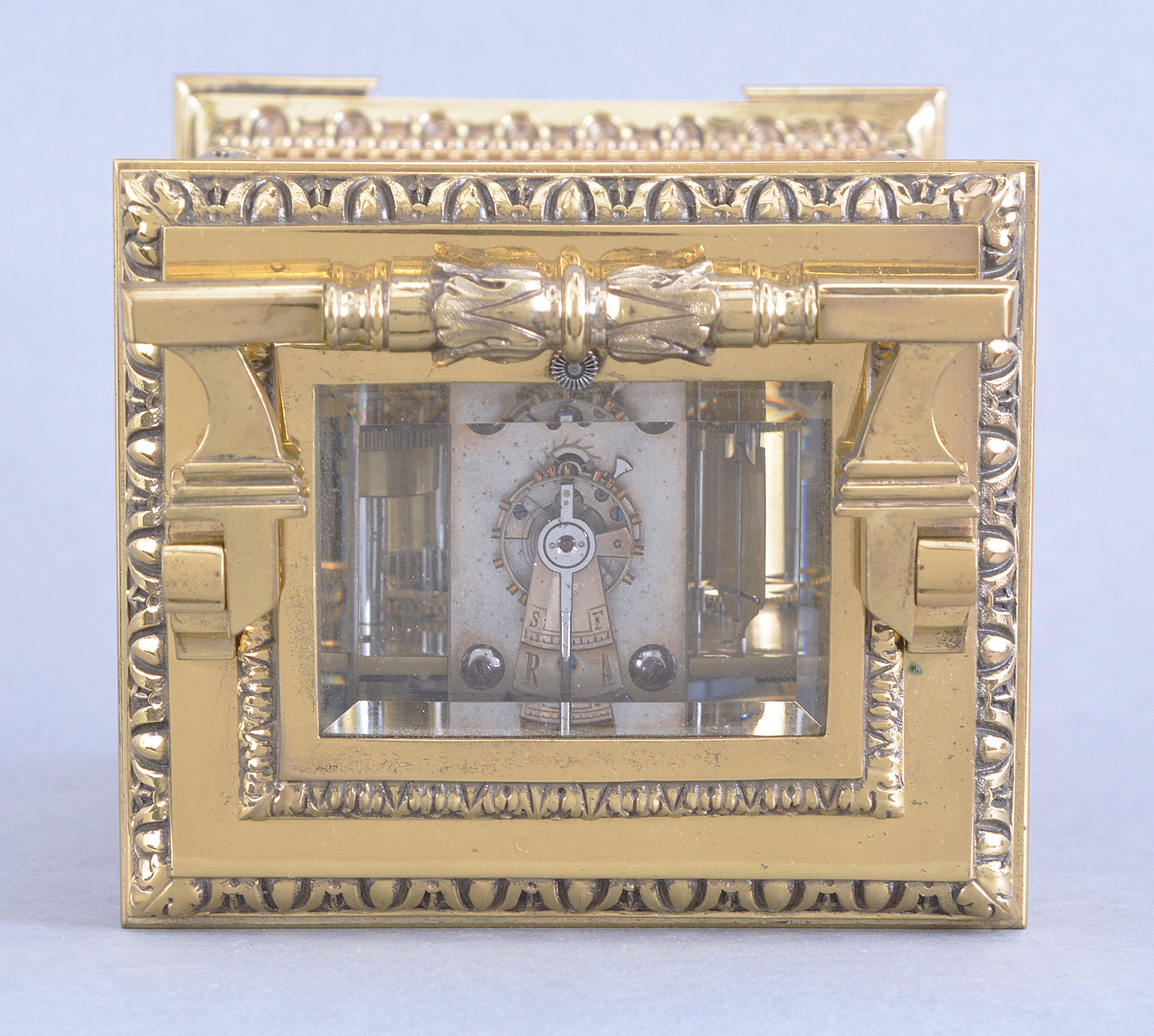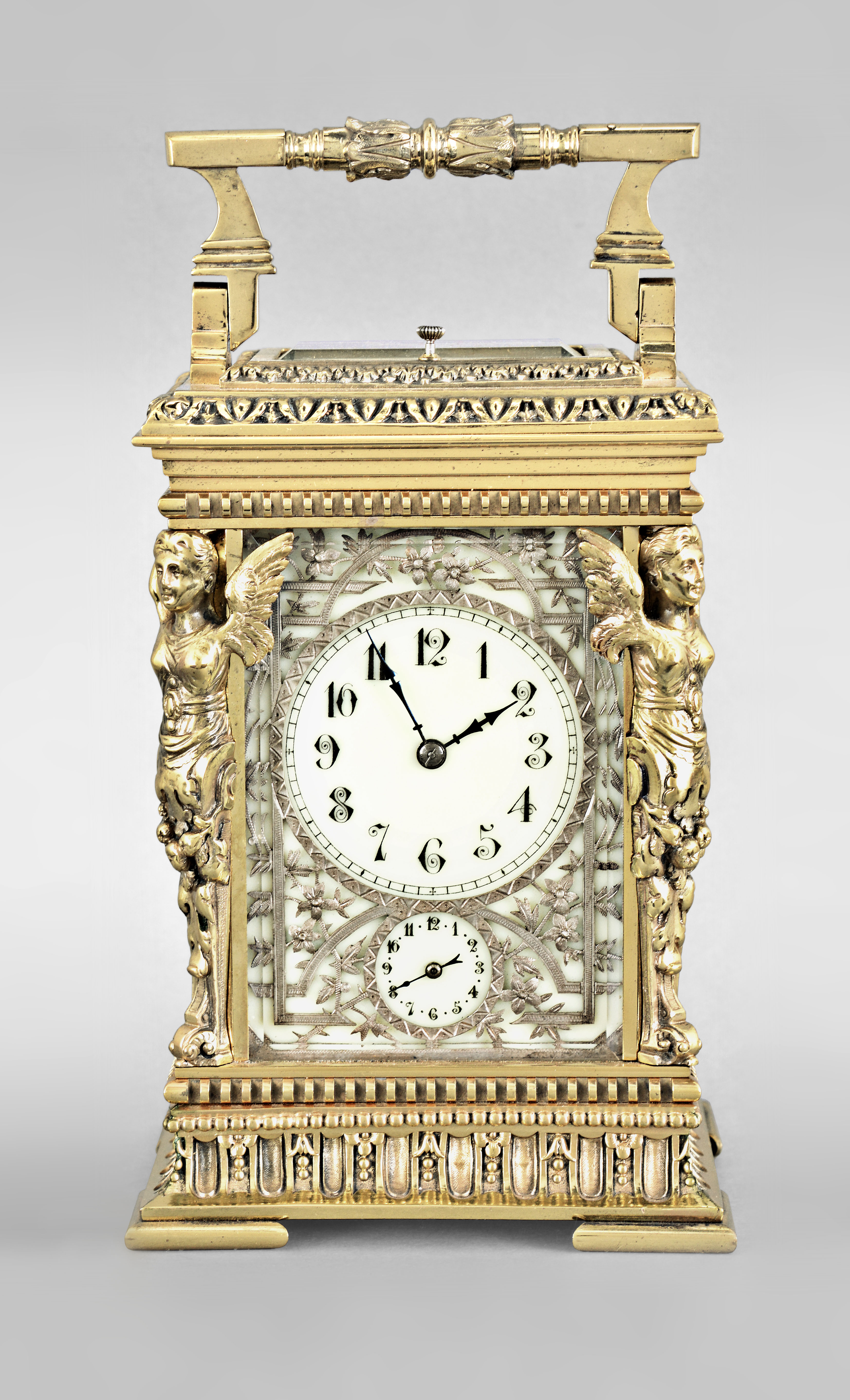 France, a large, Cariatides style, grand sonnerie striking carriage clock, the base with slotted and bead moldings above a fluted cavetto molding with alternating floral and pendant husk ornament, and four cock bead feet, the corners with caryatids supporting a stepped, molded cornice crowned by an egg and dart molding, the top with leaf and dart molded, glazed escapement viewing aperture and folding, foliate ornamented handle, arabic numeral white enamel dial with subsidiary alarm chapter and silver openwork mask with chased and engraved naturalistic ornament, blued steel distaff hands, 8 day, three train movement with 11 jewel lever platform and cut bimetallic balance, sounding the hours and quarters in passing and repeating the last hour and quarter on demand, the base with three position lever for selection of strike mode, serial #255