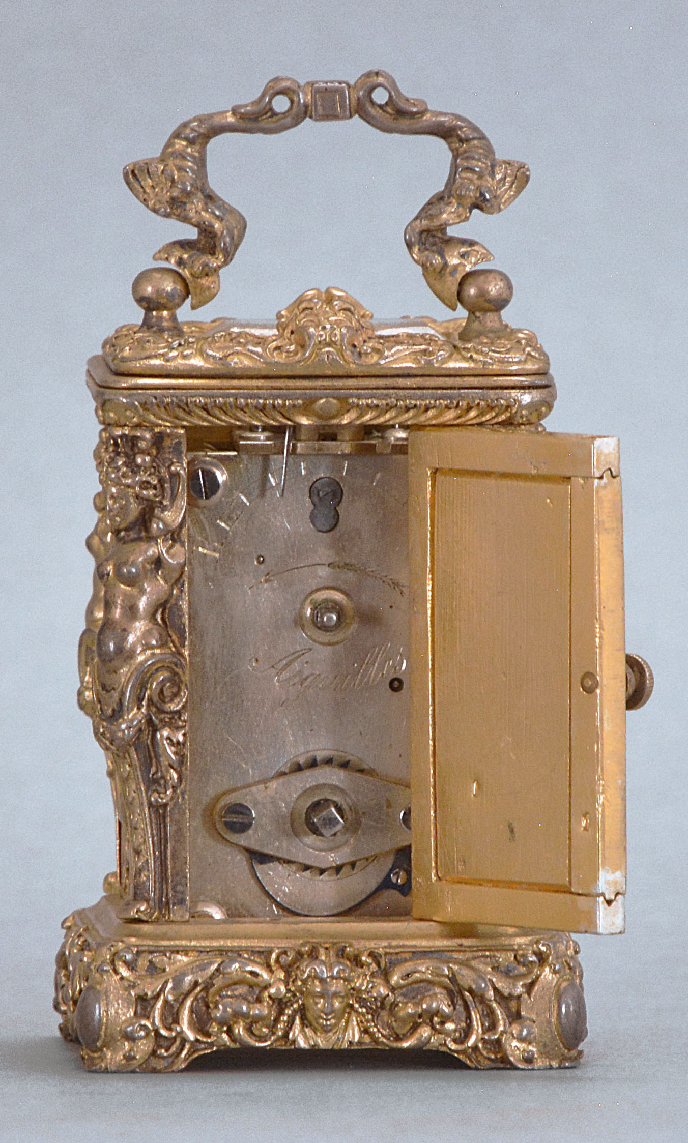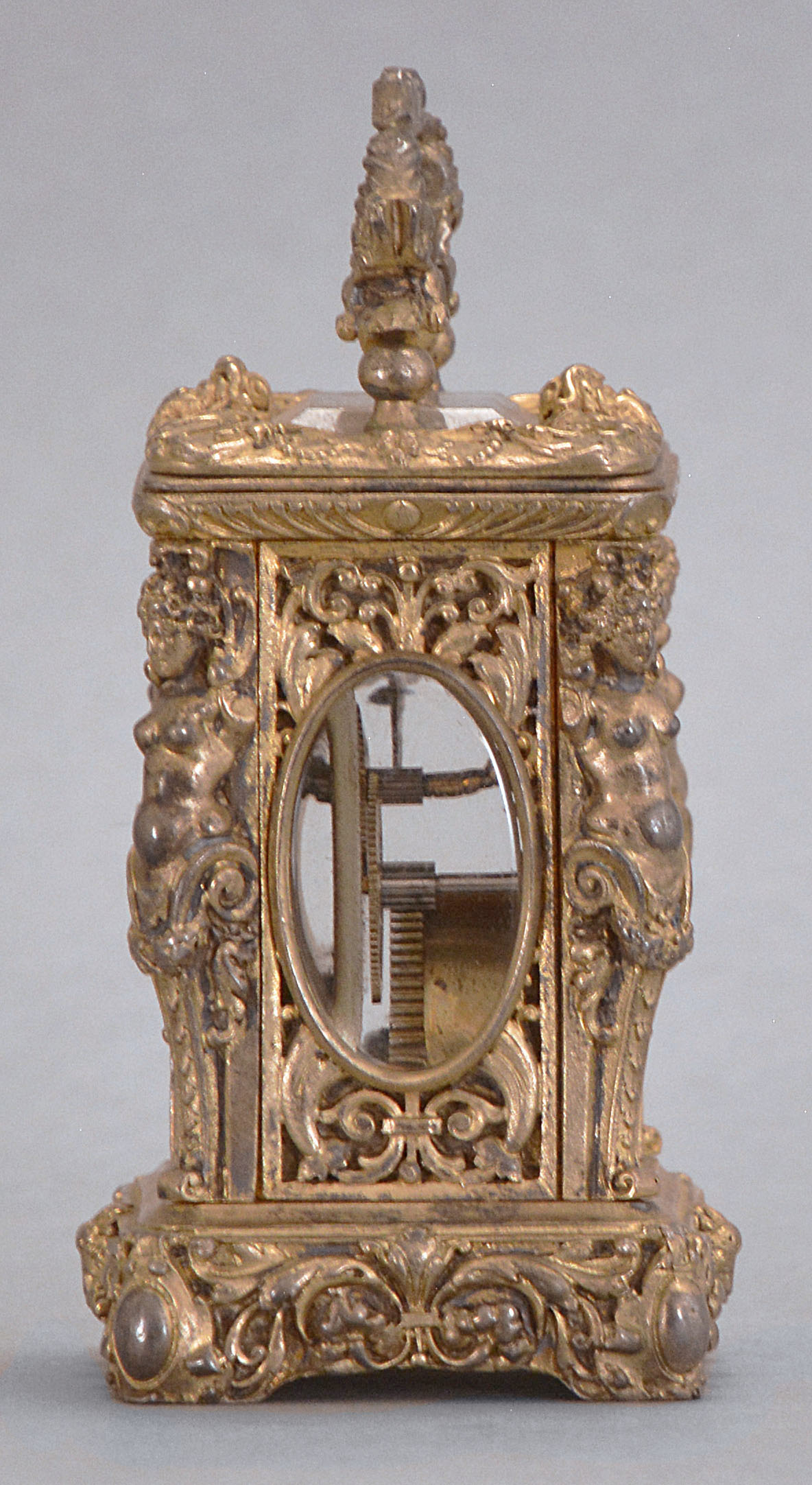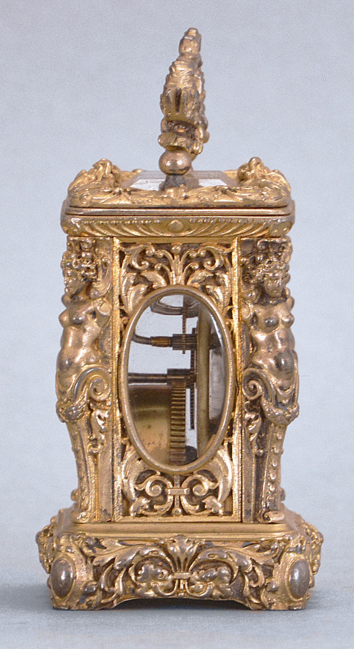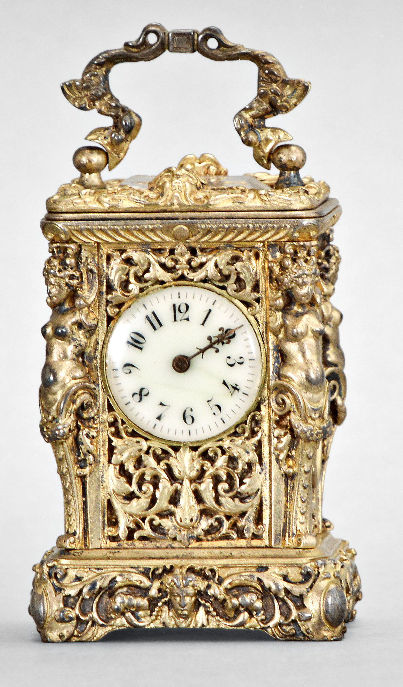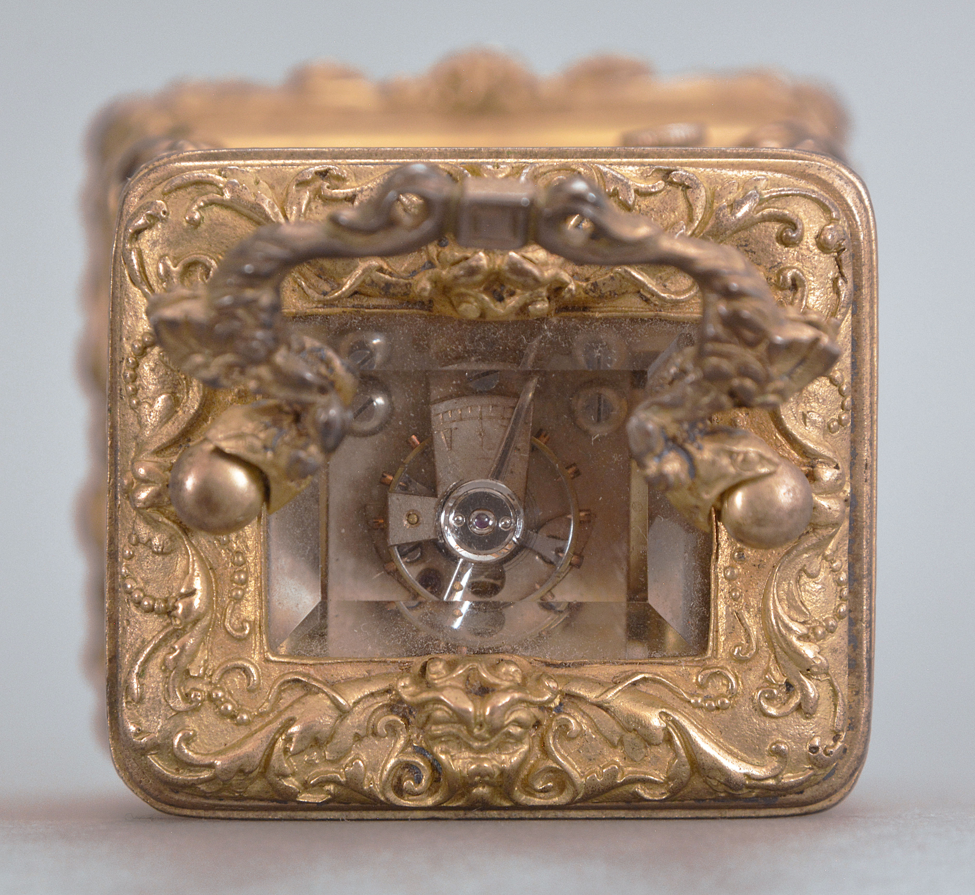 France, a Mignonette #1 size Cariatides cased carriage timepiece, the silver gilt case replete with scrolling foliate ornament, masks, caryatid corners, and top with bevelled glass and dolphin form handle, case sides with glazed oval apertures, and arabic numeral white enamel dial with blued steel fleur de lis hands, 8 day timepiece movement with lever platform