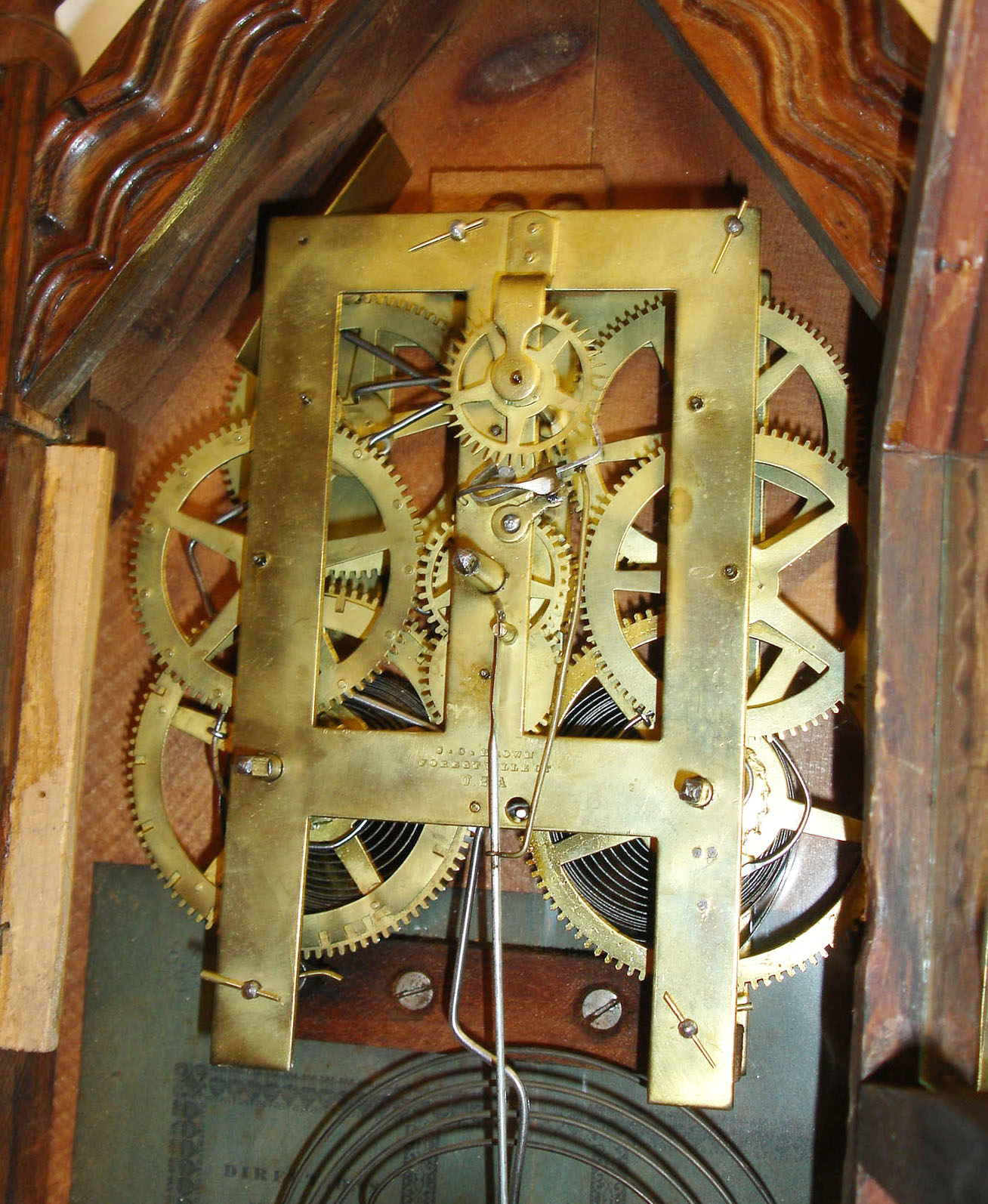 J.C. Brown, Forestville Mfg. Co., Bristol, Conn., 8 day, time and strike spring driven brass movement ripple front sharp gothic or steeple shelf clock.
