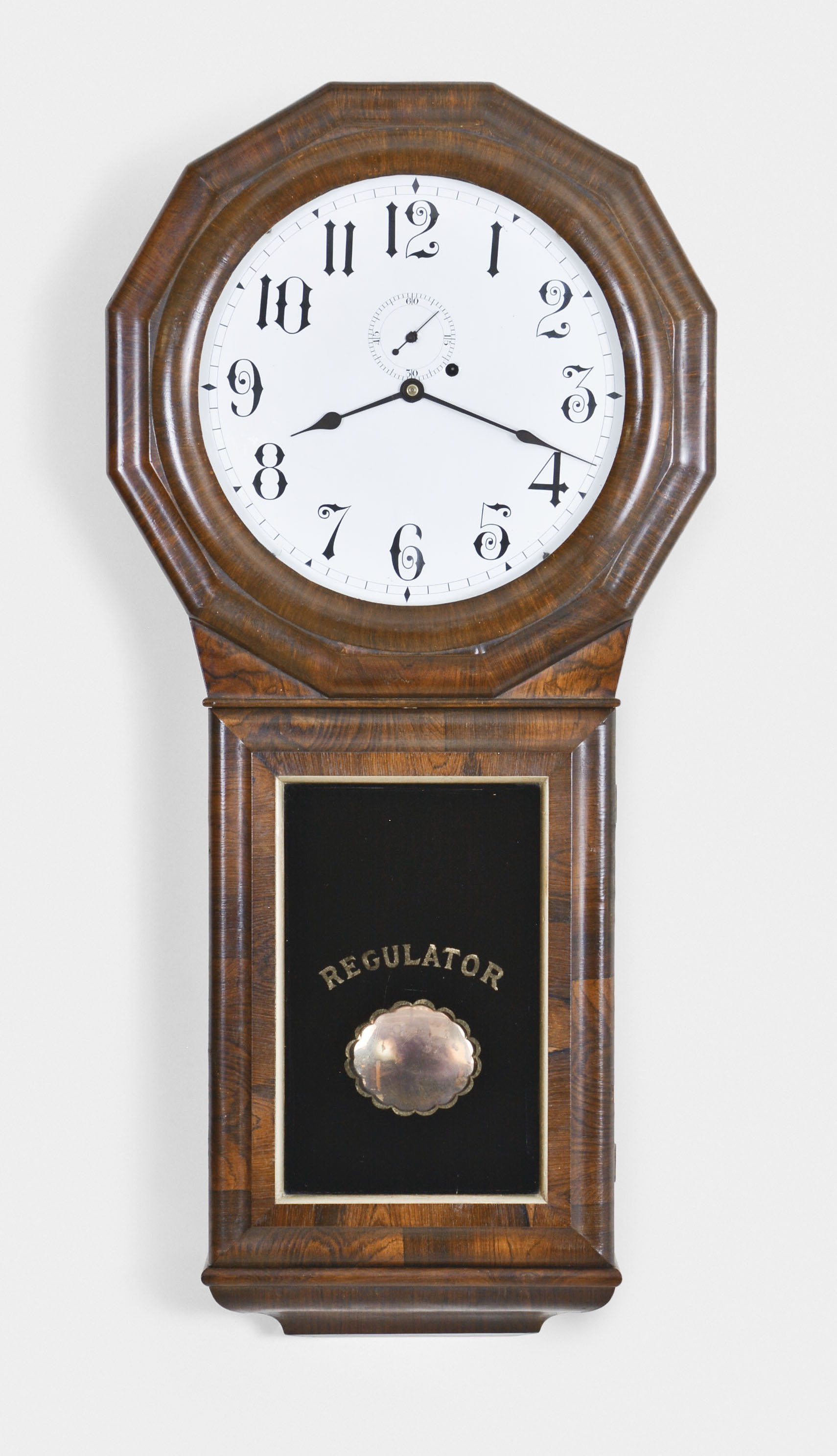 Seth Thomas Clock Co., Thomaston, Conn., "Regulator No. 1 Extra" wall clock with a weight driven 8 day timepiece movement in a rosewood veneered case.