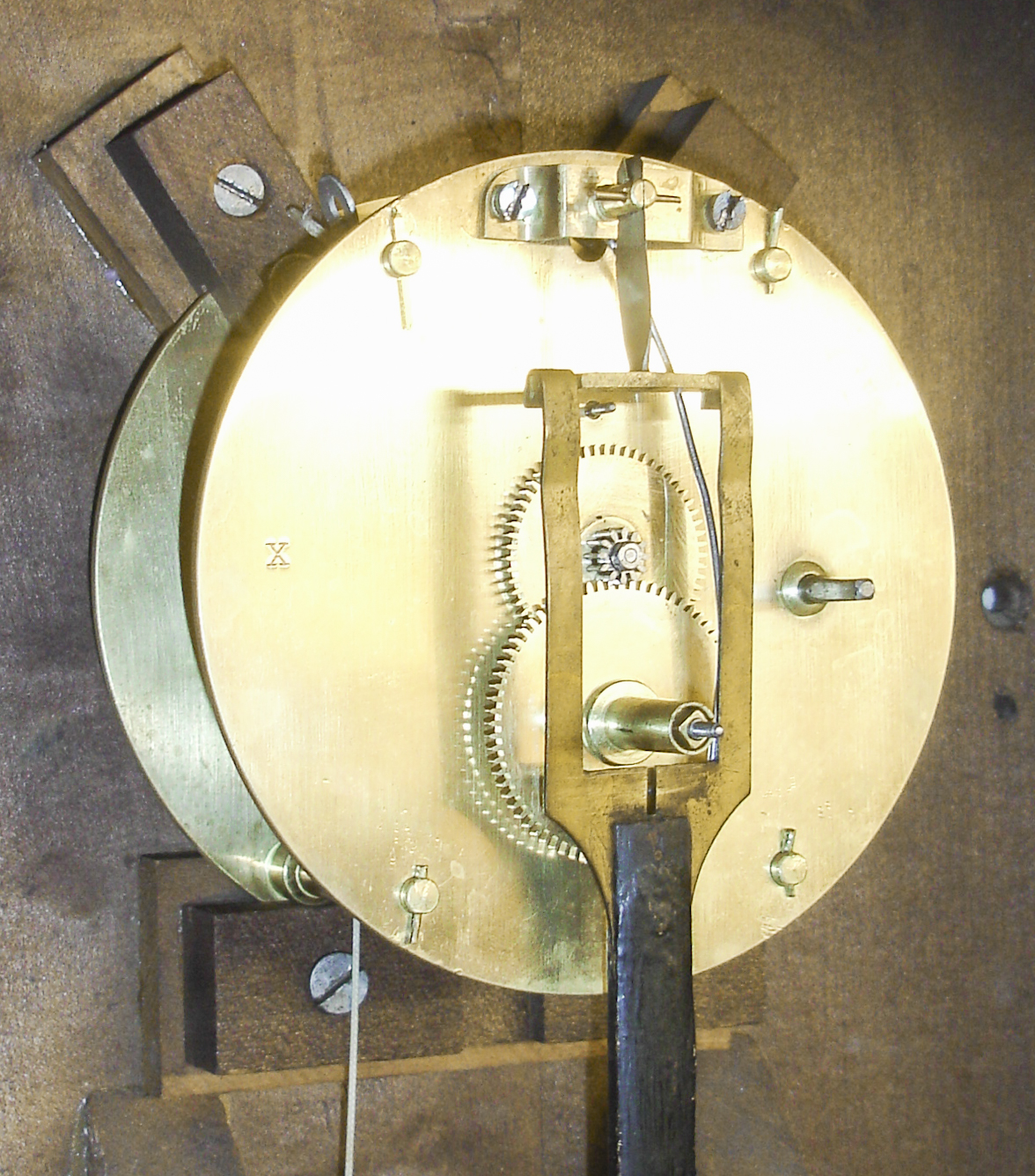 The case is in good condition with a newer finish. The veneer shows some lifting in several areas. The porcelain dial on a cast iron base place is a modern replacement (original was painted on zinc) and there are original dial mounting holes in the case that have been filled in. The hands have age and may be original. The movement is the round plate S. B. Terry type with maintaining power. The paper label inside the case and the paper beat indicator strip are in good condition. The dial door glass is original. The lower tablet has age and has been rebacked with black paint. The original gilt moldings around the tablet have been painted. The cast iron weight appears to be original.