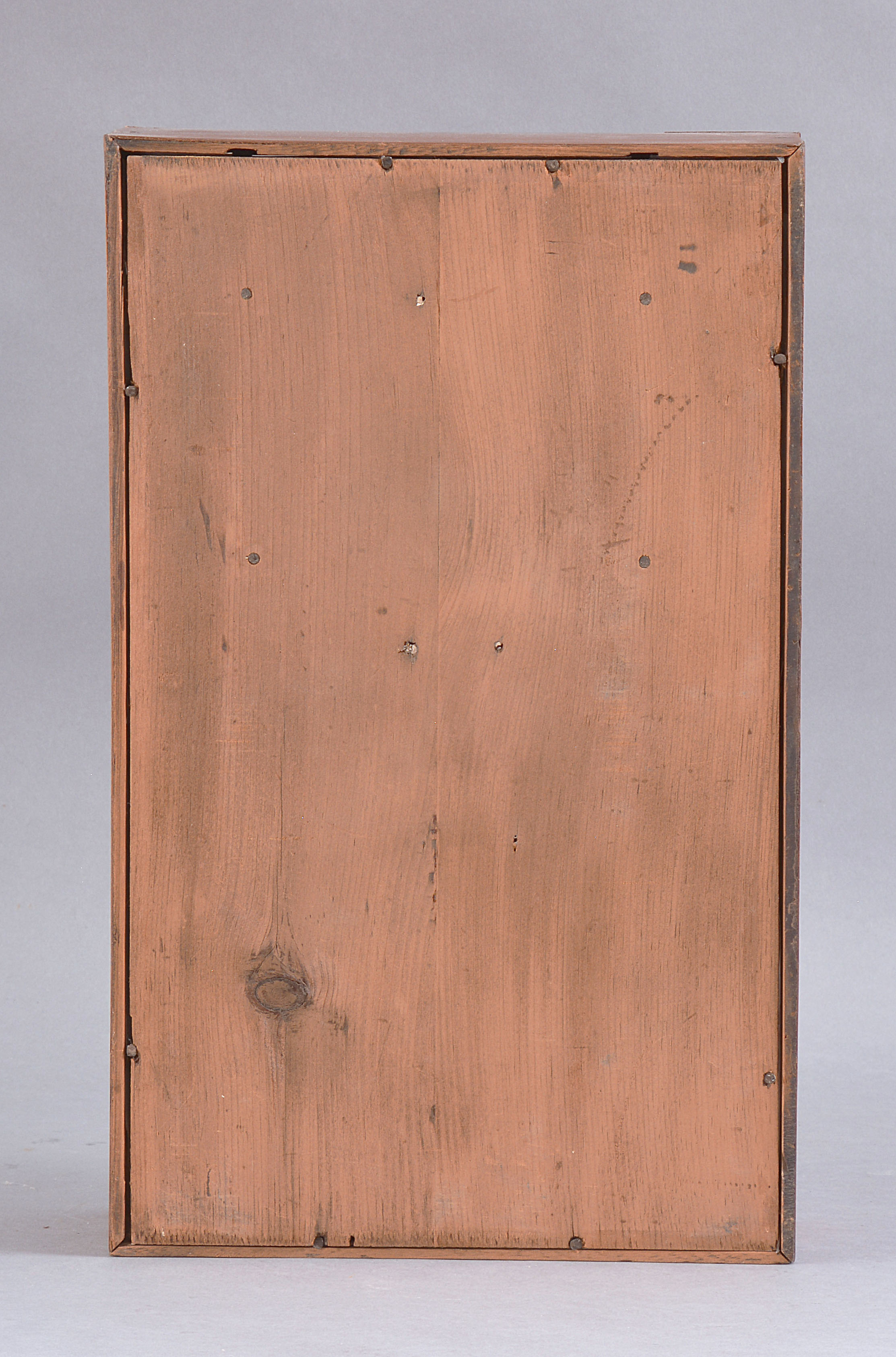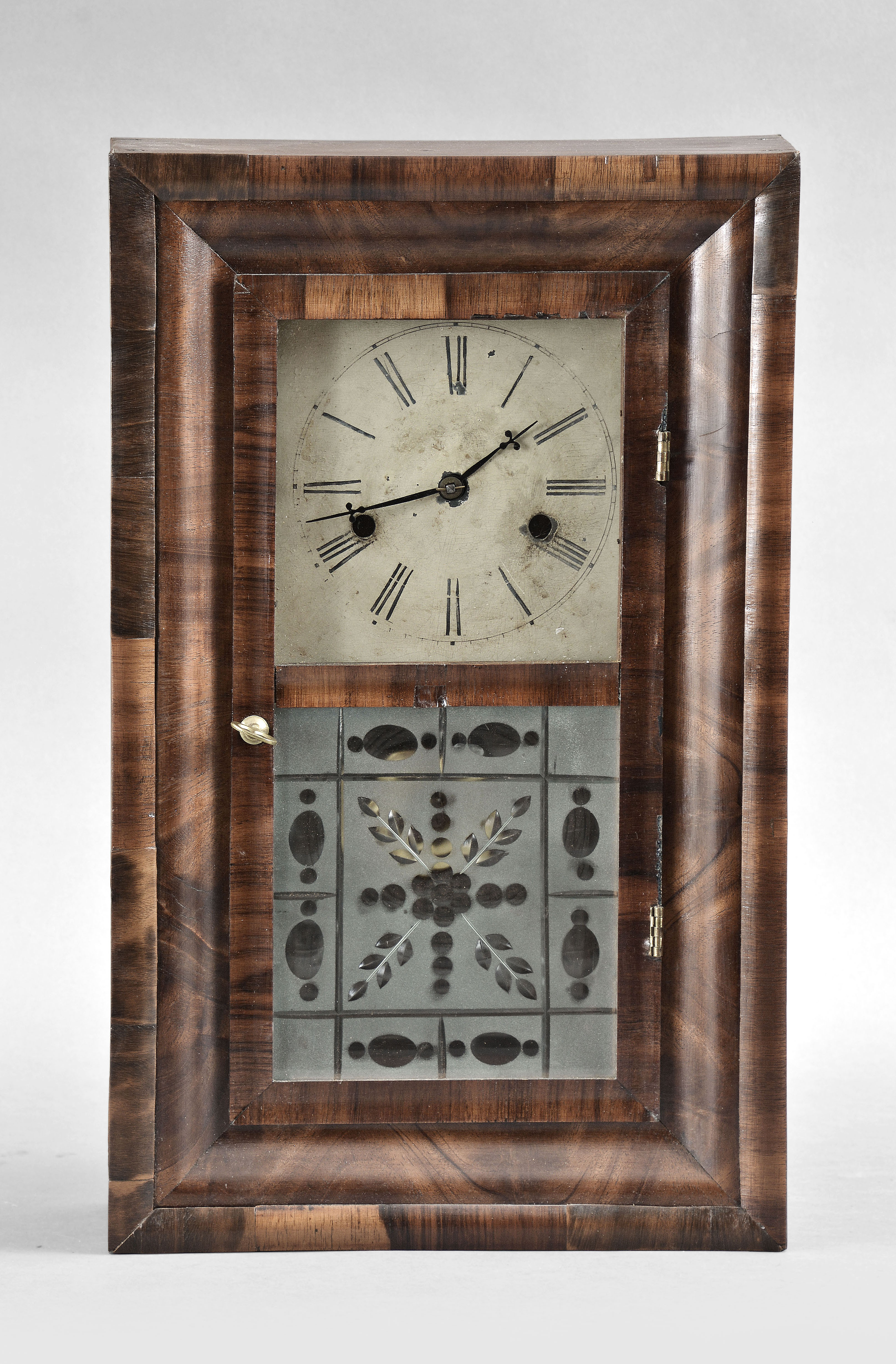 Refinished mahogany and rosewood veneered case has some repairs on the outer band and at the cross strip on the door. Original painted dial is soiled with wear and loss at the winding arbors, the mounting screws and center area. Original hands. Tablet looks to be a replacement.