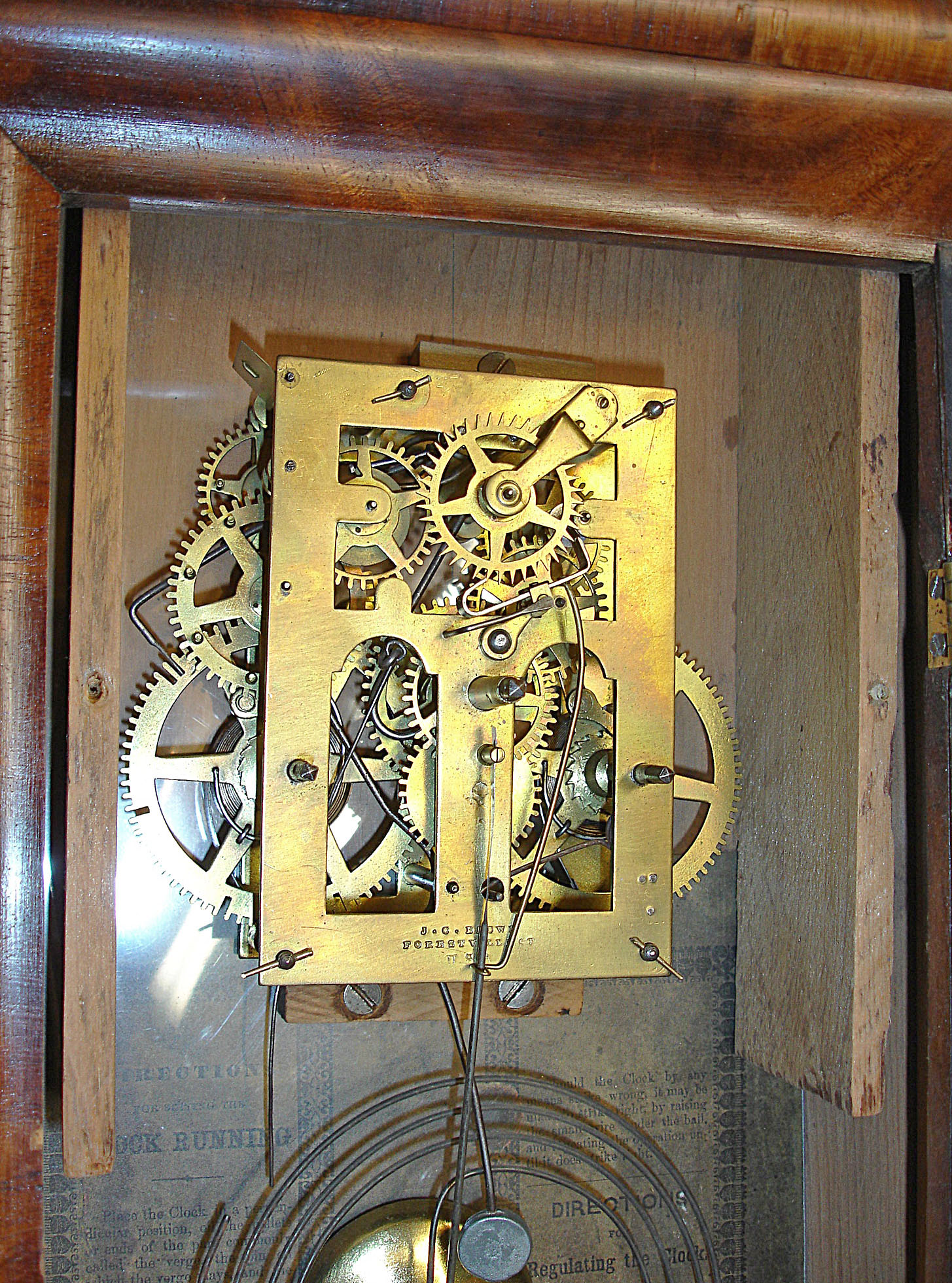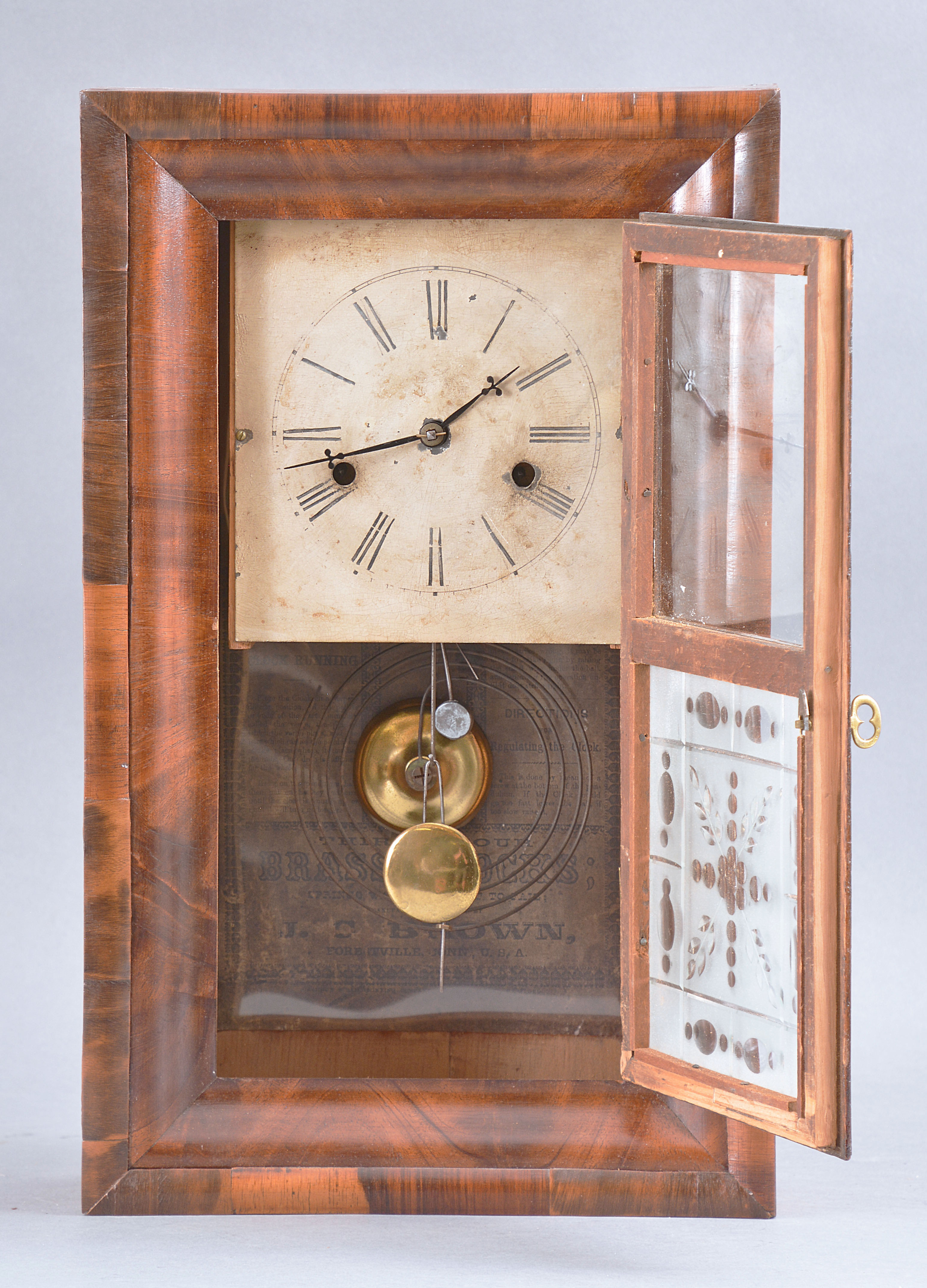 J.C. Brown, Forestville Mfg. Co., Bristol, Conn., 30 hour, time and strike spring driven brass movement regulated by a pendulum miniature OOG shelf clock.