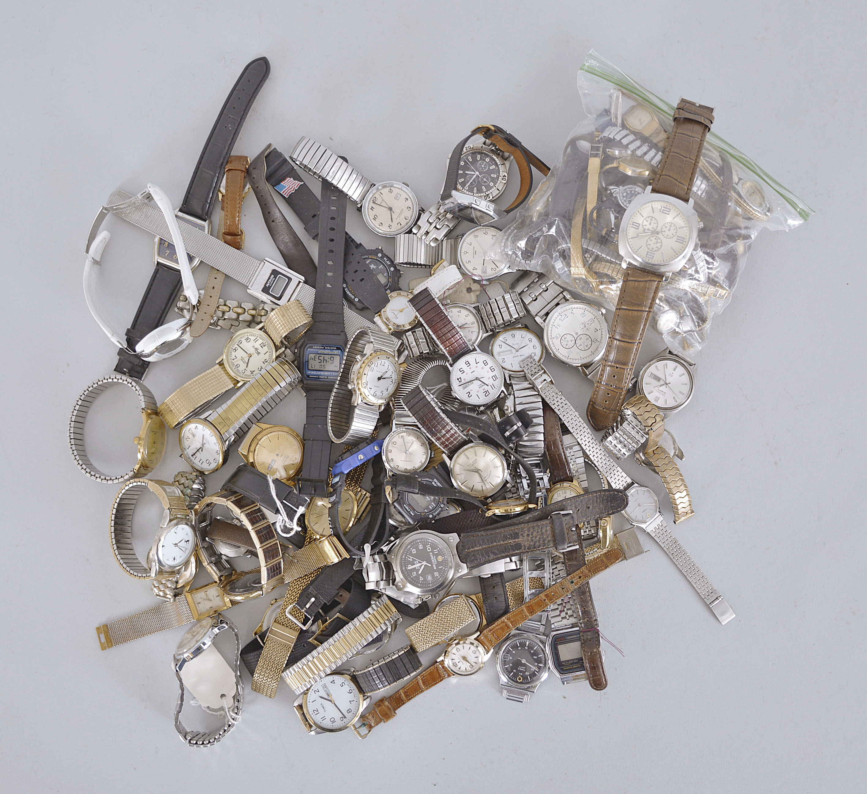 Large lot of men's and women's wrist watches, quartz and mechanical, makers including Seiko, Pulsar, Time Shop, Timex, Bulova, Benrus, Casio, Citizen, Gruen, Cortebert, Vulcain, and others