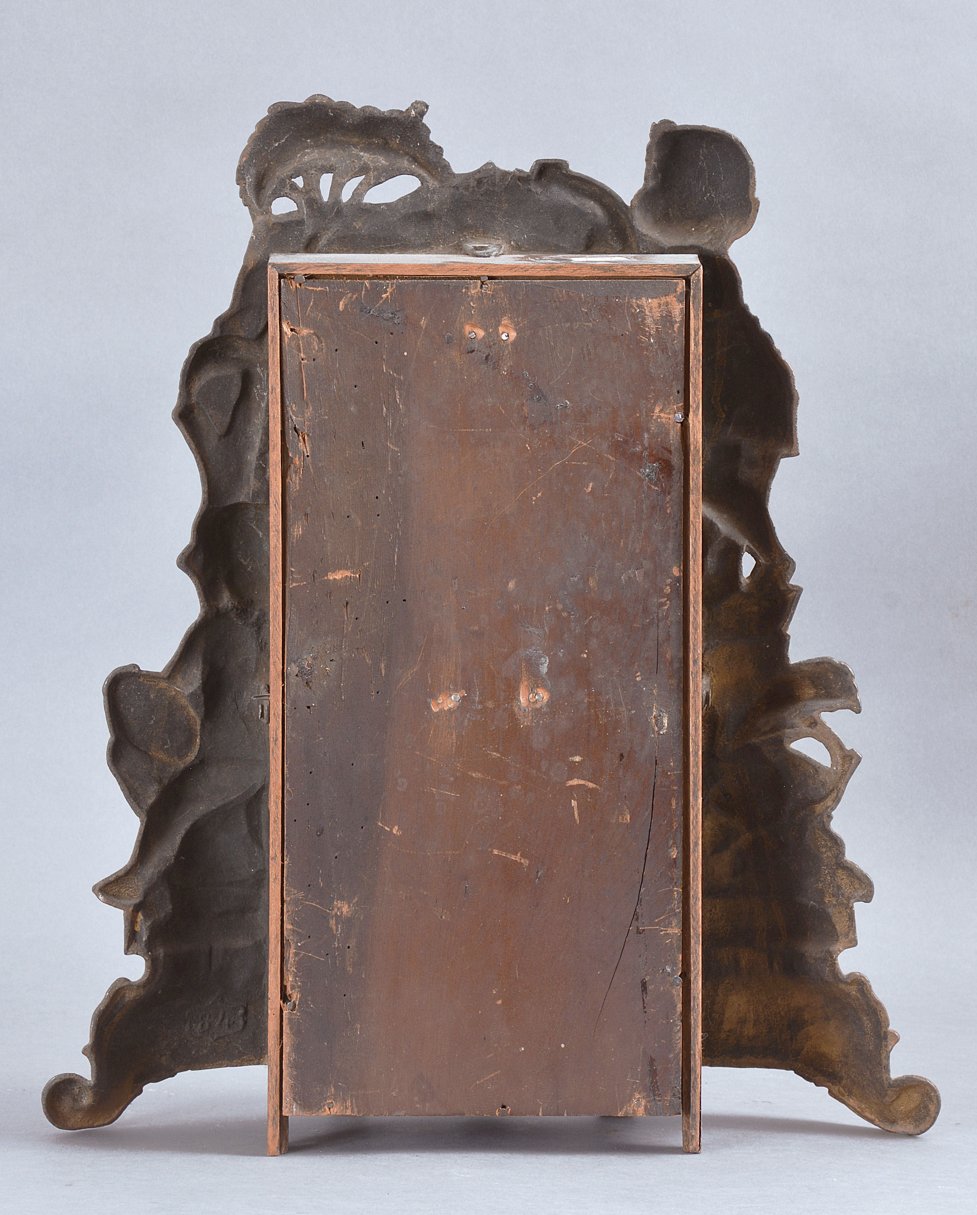 Cast iron case in a gold finish in clean condition. Original dial plate, but repainted. Hour hand is the proper type, but looks to be a replacement. Movement is signed. Original card label inside.