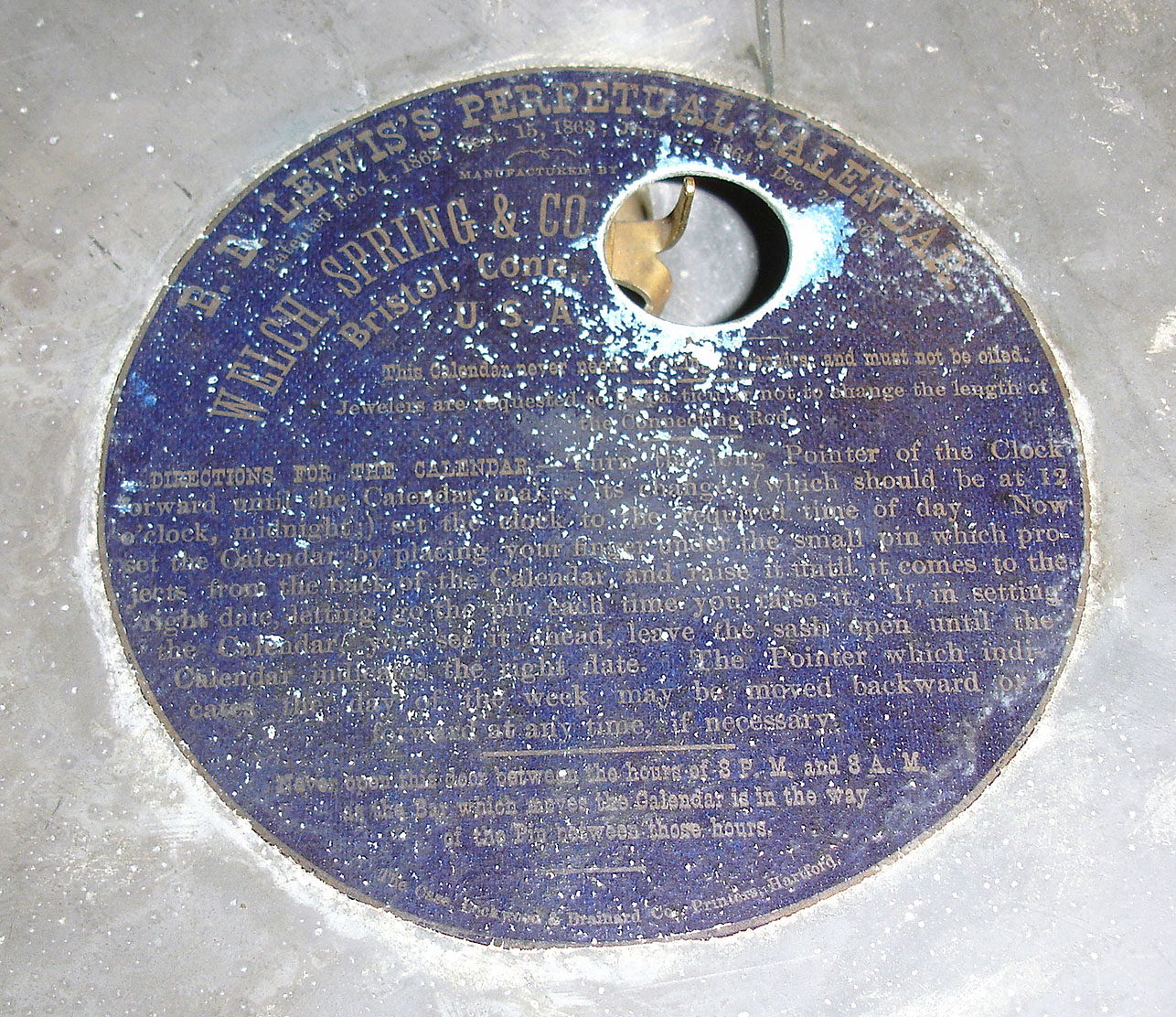 Welch, Spring & Co., Forestville, Conn. Mantel Calendar Clock with a weight driven 8 day time and strike movement and a B. B. Lewis patented perpetual calendar mechanism in a rosewood veneered case.