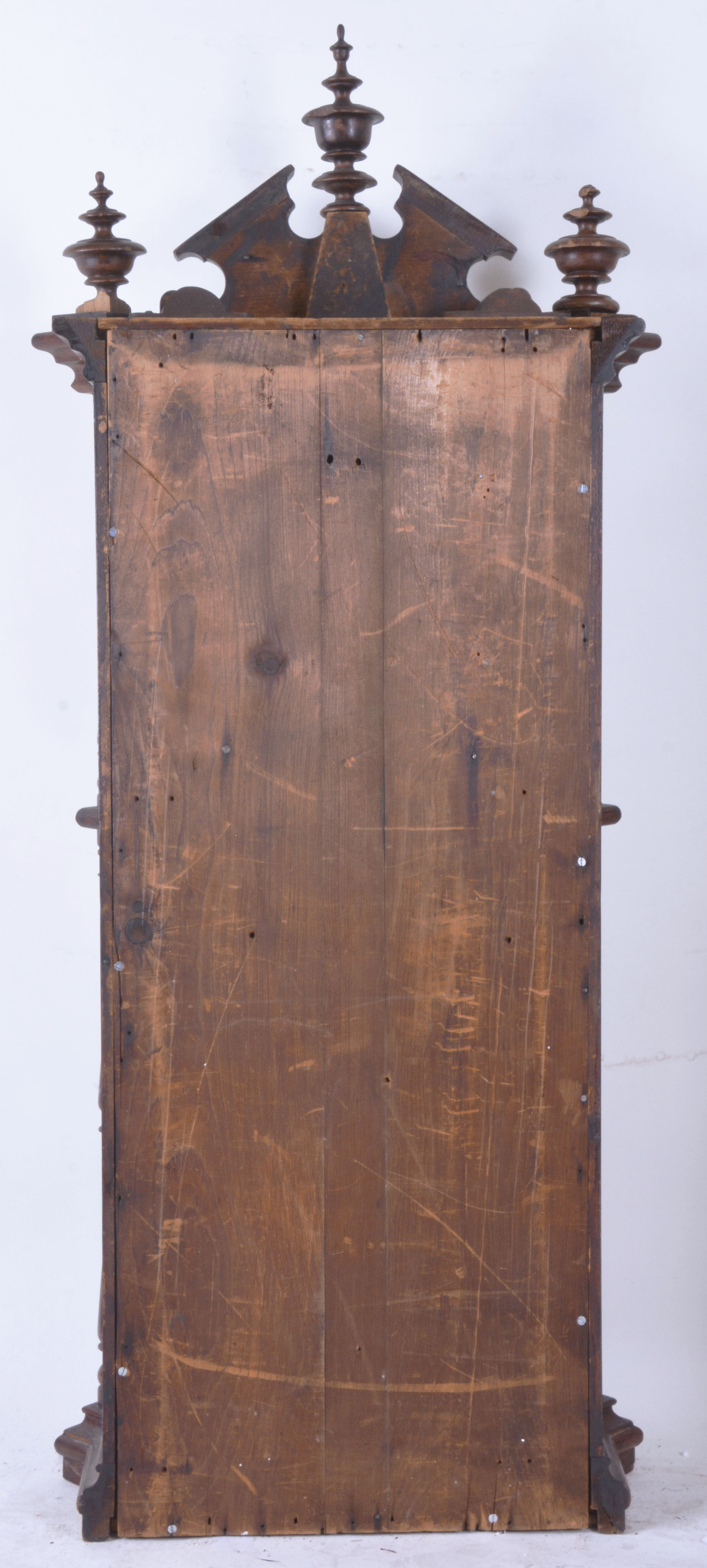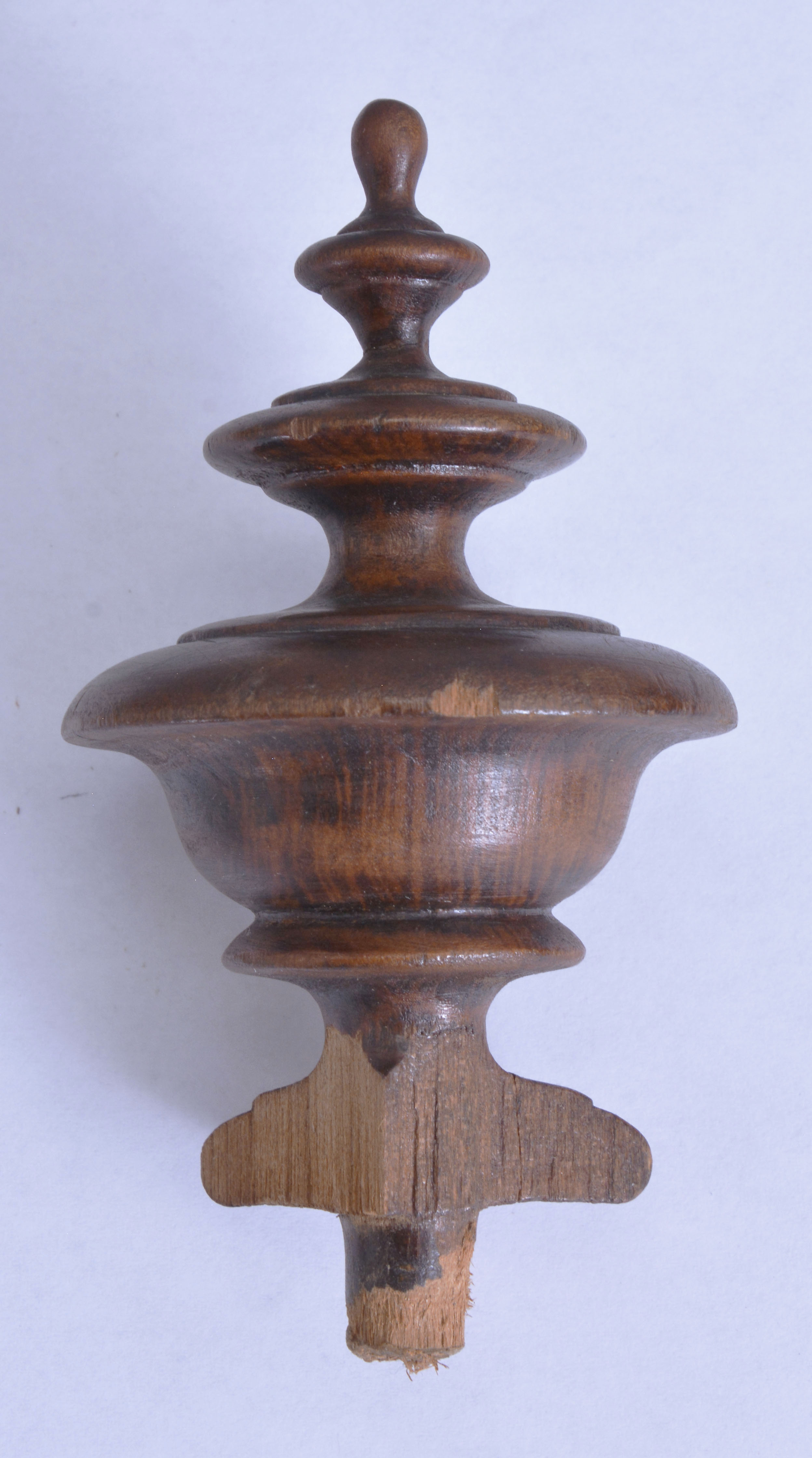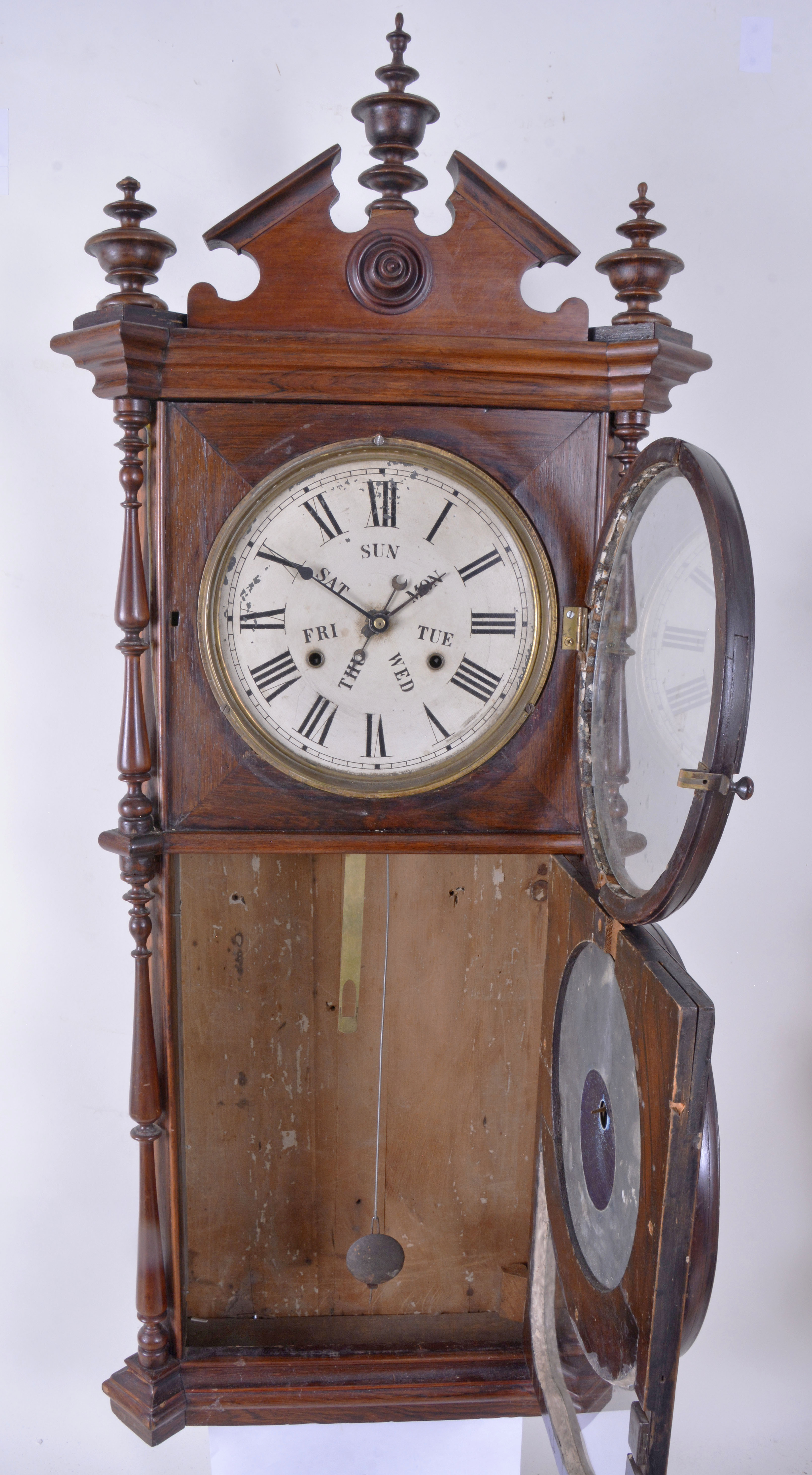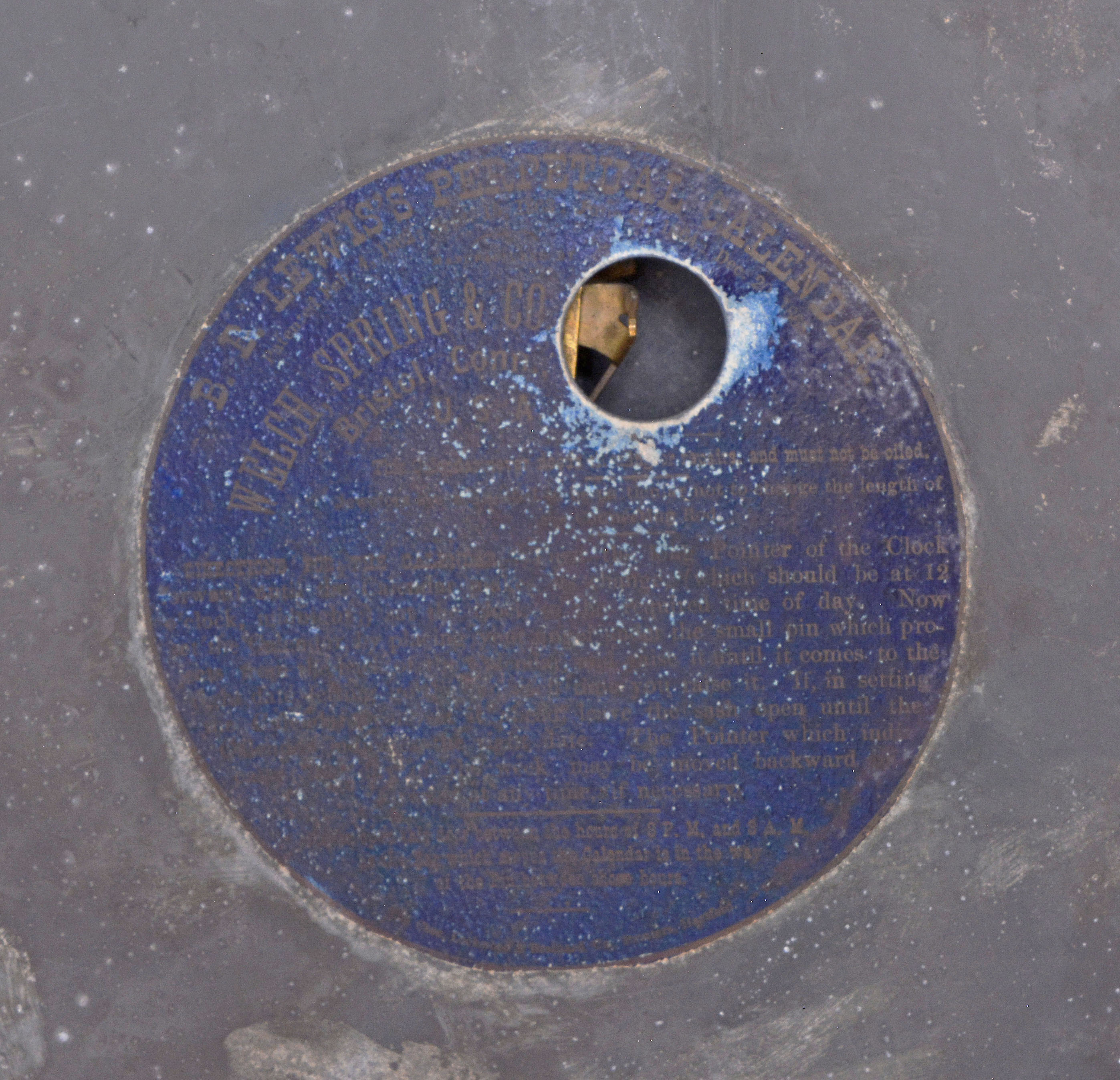 The case, with an old finish, has several areas of veneer loss and several areas of joint separation. All three finials have some loss. The unsigned strap brass movement was produced earlier by S. C. Spring & Co. and later used by Welch, usually without rolling pinions. The original painted time dial is in good condition with some minor flaking in several areas. The original painted calendar dial is in excellent condition. All 3 calendar hands are original. The hour hand is period while the minute hand is new. The clear door glasses are replacements. A nearly identical example of this scarce model is in the collection of the American Clock & Watch Museum, Bristol, Conn.,.