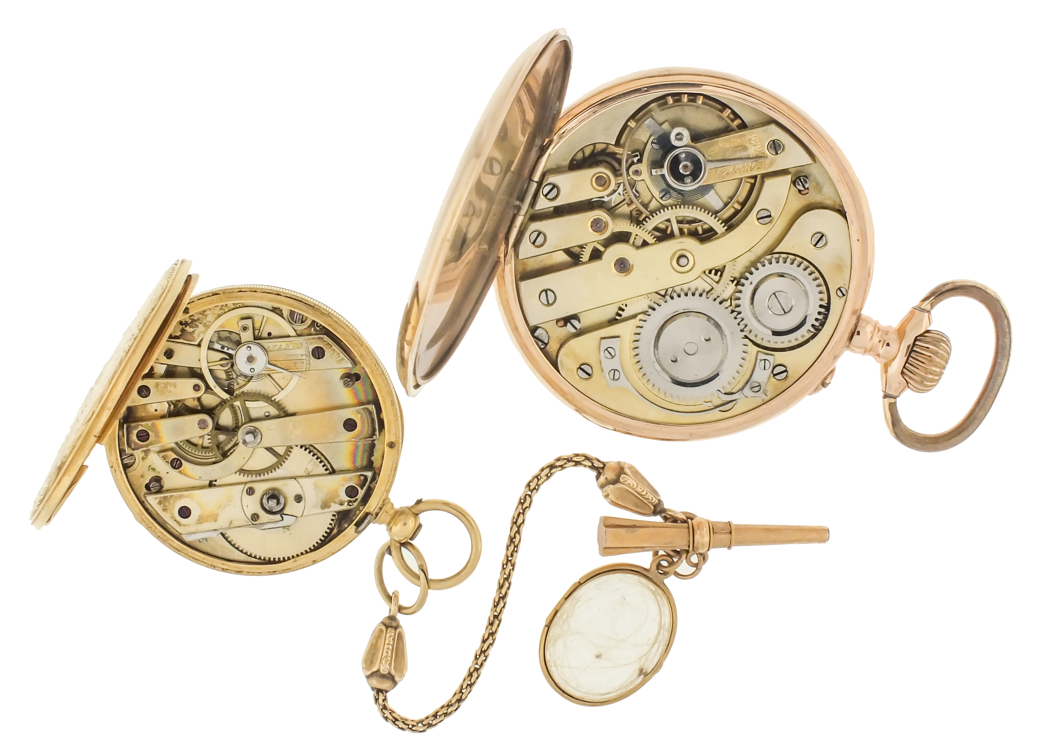 Pocket watches- 2 (Two), both Swiss, the first by Jarrioir a Geneve, 10 jewel gilt bar movement with cylinder escapement, roman numeral white enamel dial, in an 18 karat yellow gold open face case, with a short, 10 karat chain, gold clad key and gold rimmed locket, 35.6g TW, the other with 15 jewel gilt bar movement and lever escapement, arabic numeral white enamel dial, and 14 karat rose gold open face case, 67.4g TW