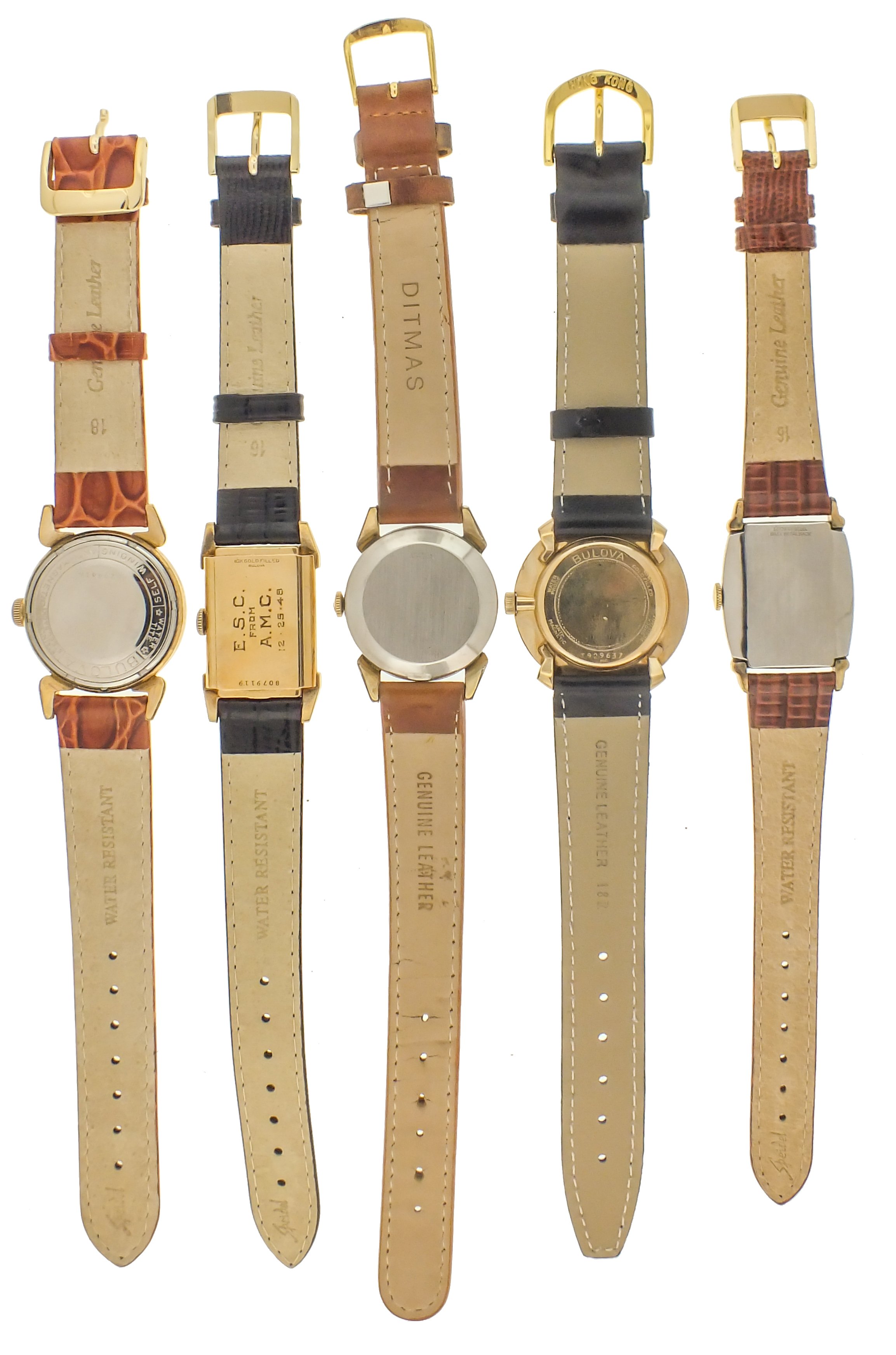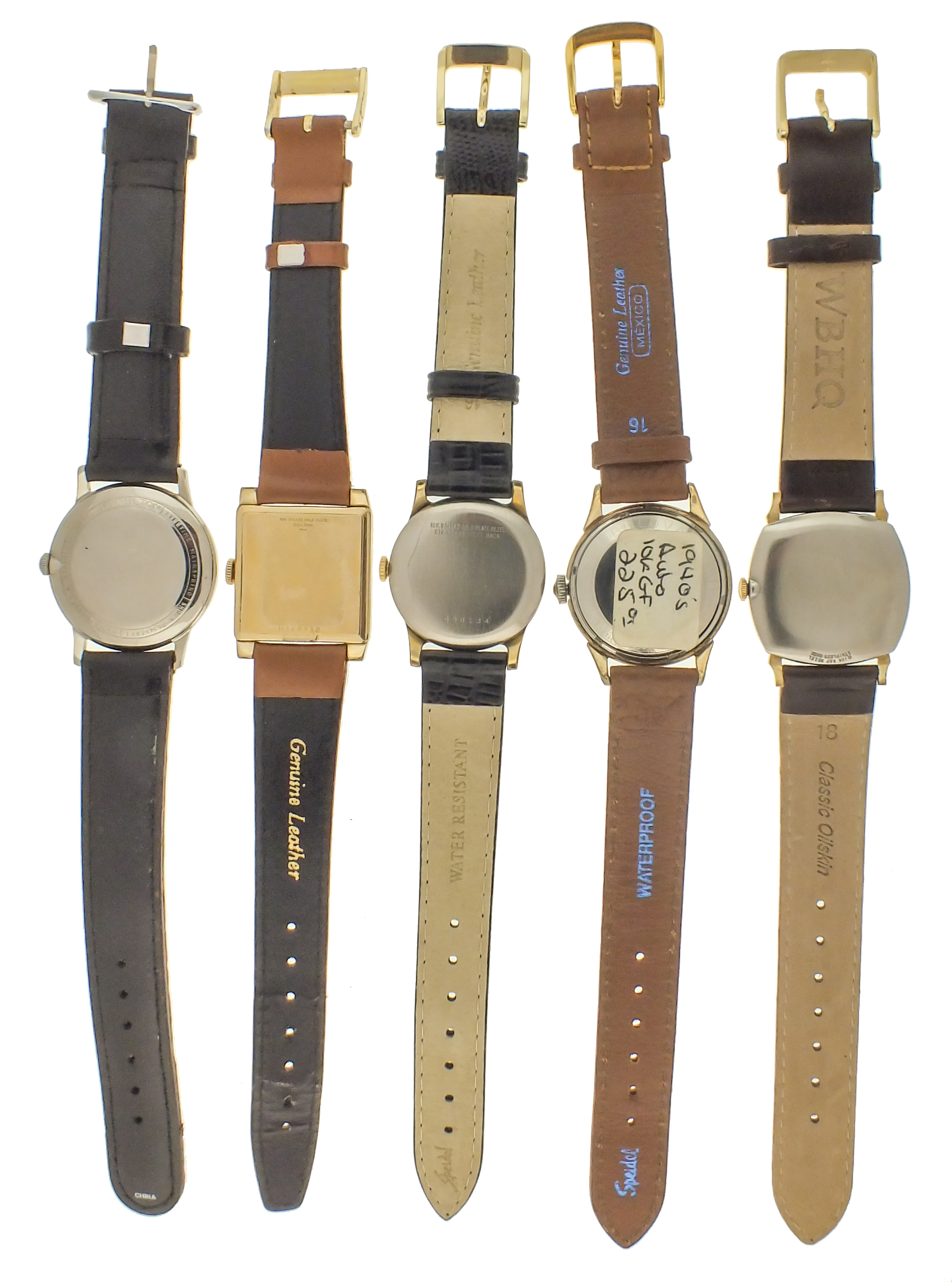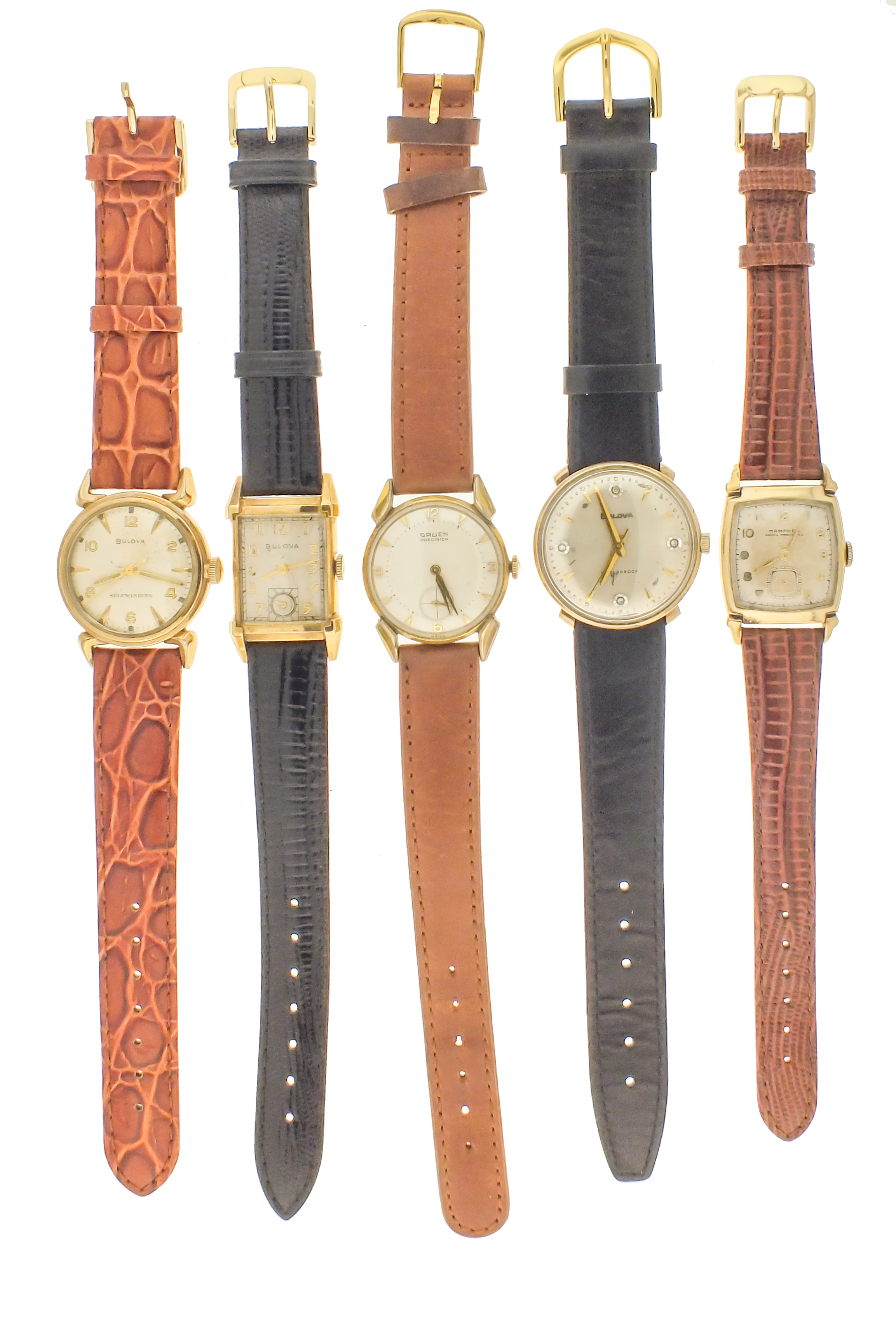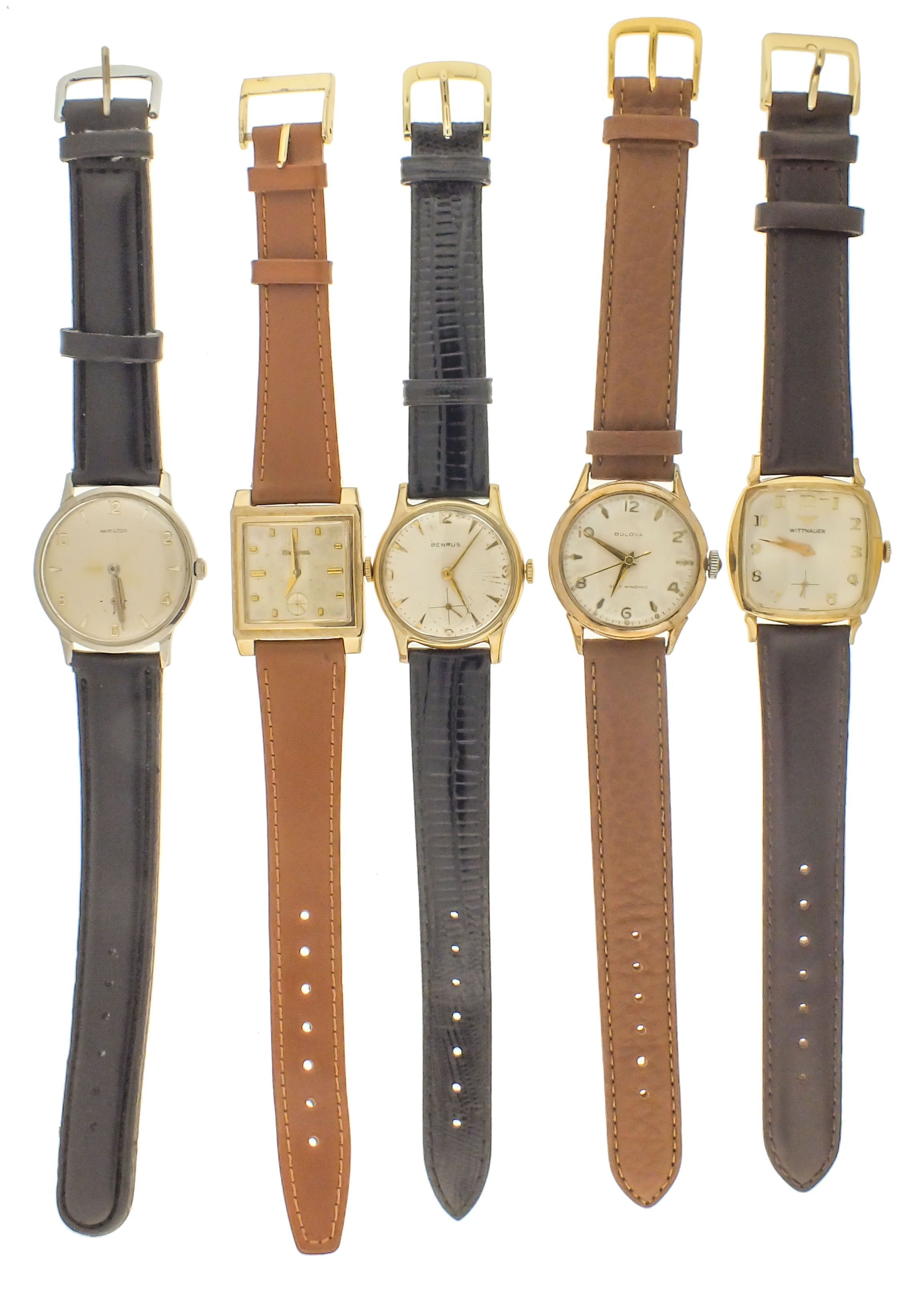 Wrist watches- 10 (Ten), makers including Bulova, Hamilton, Wittnauer, Hampden, Benrus, and Gruen, 17- 21 jewel movements, metal dials, stainless steel and gold filled cases, and leather straps