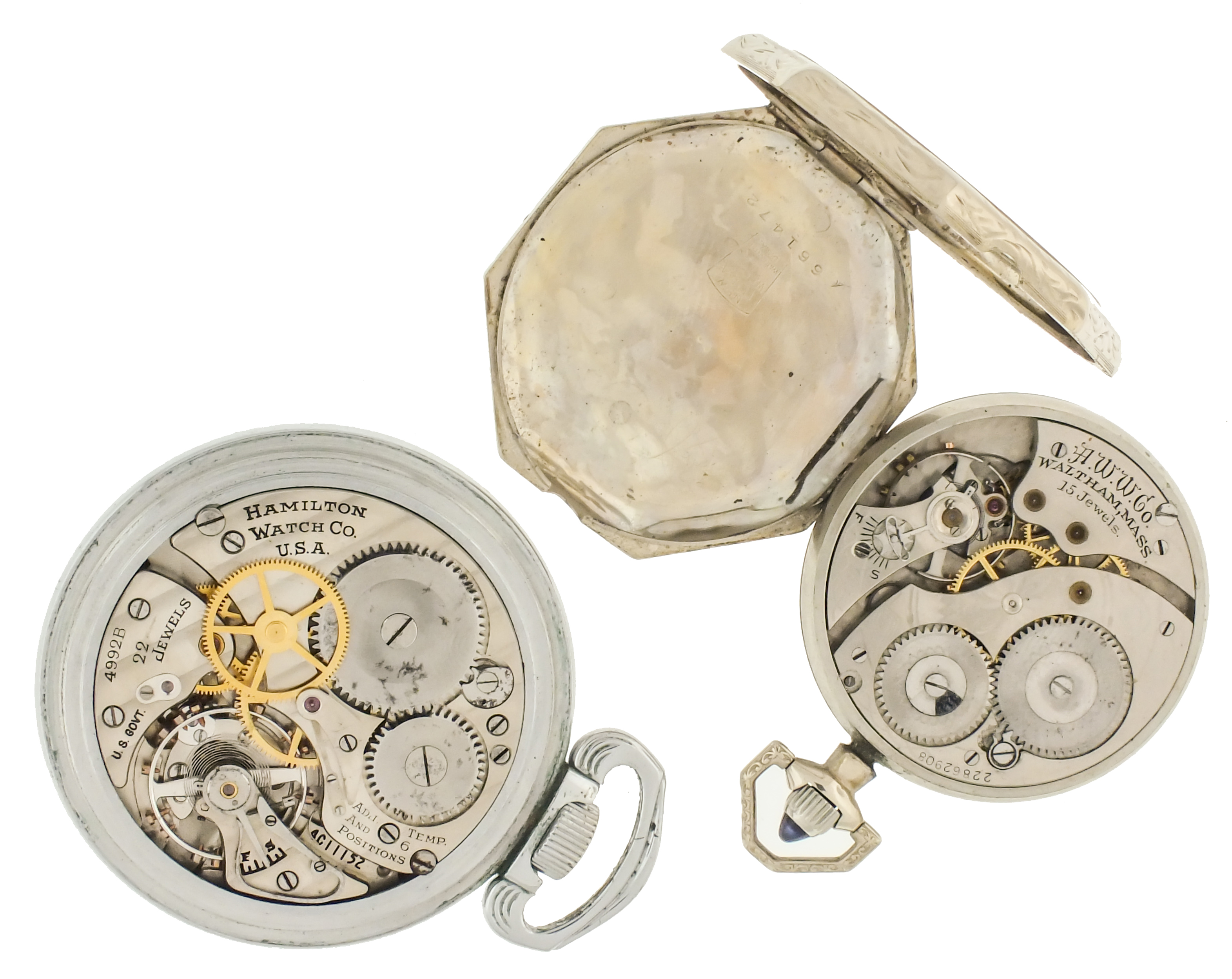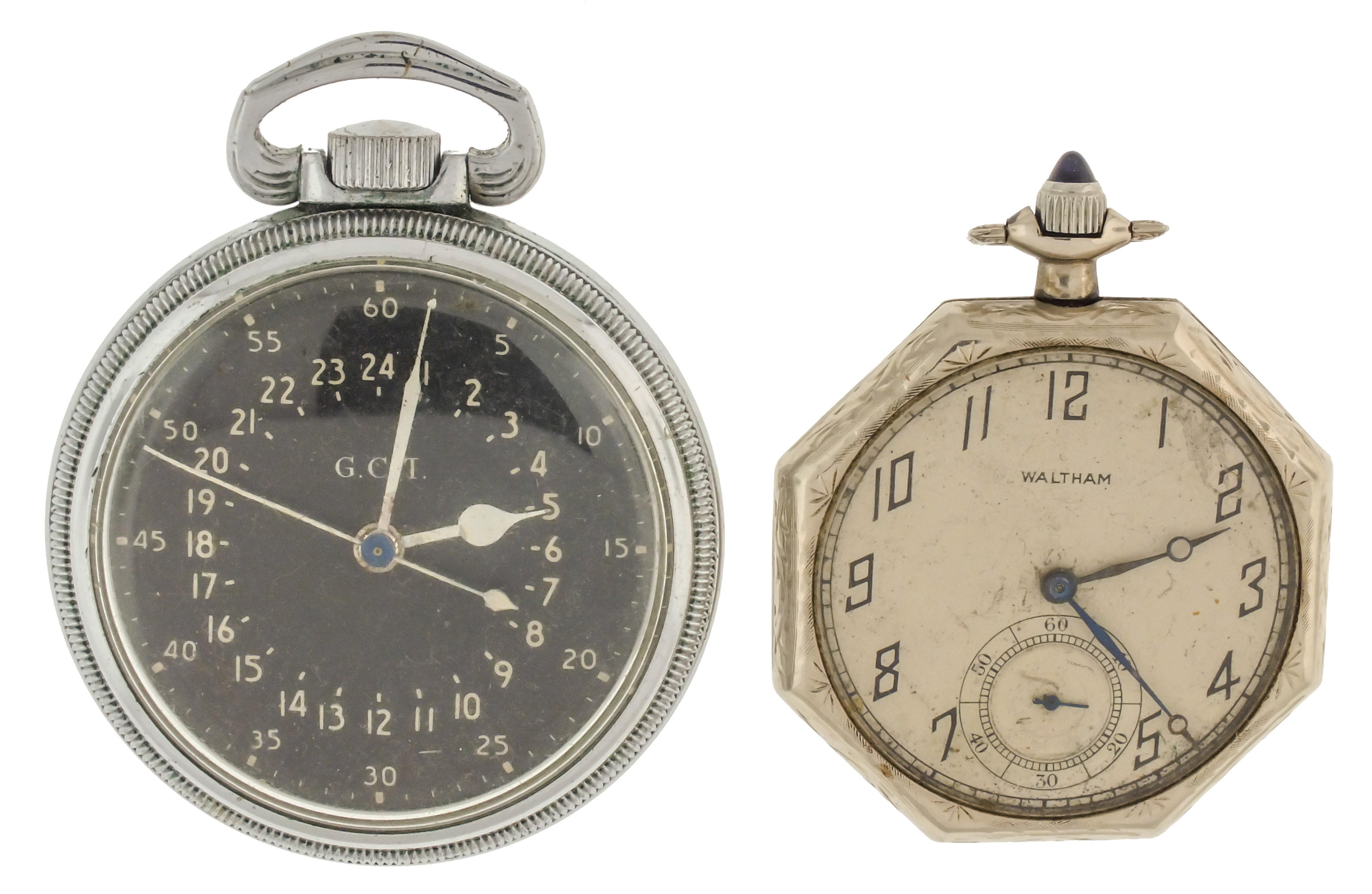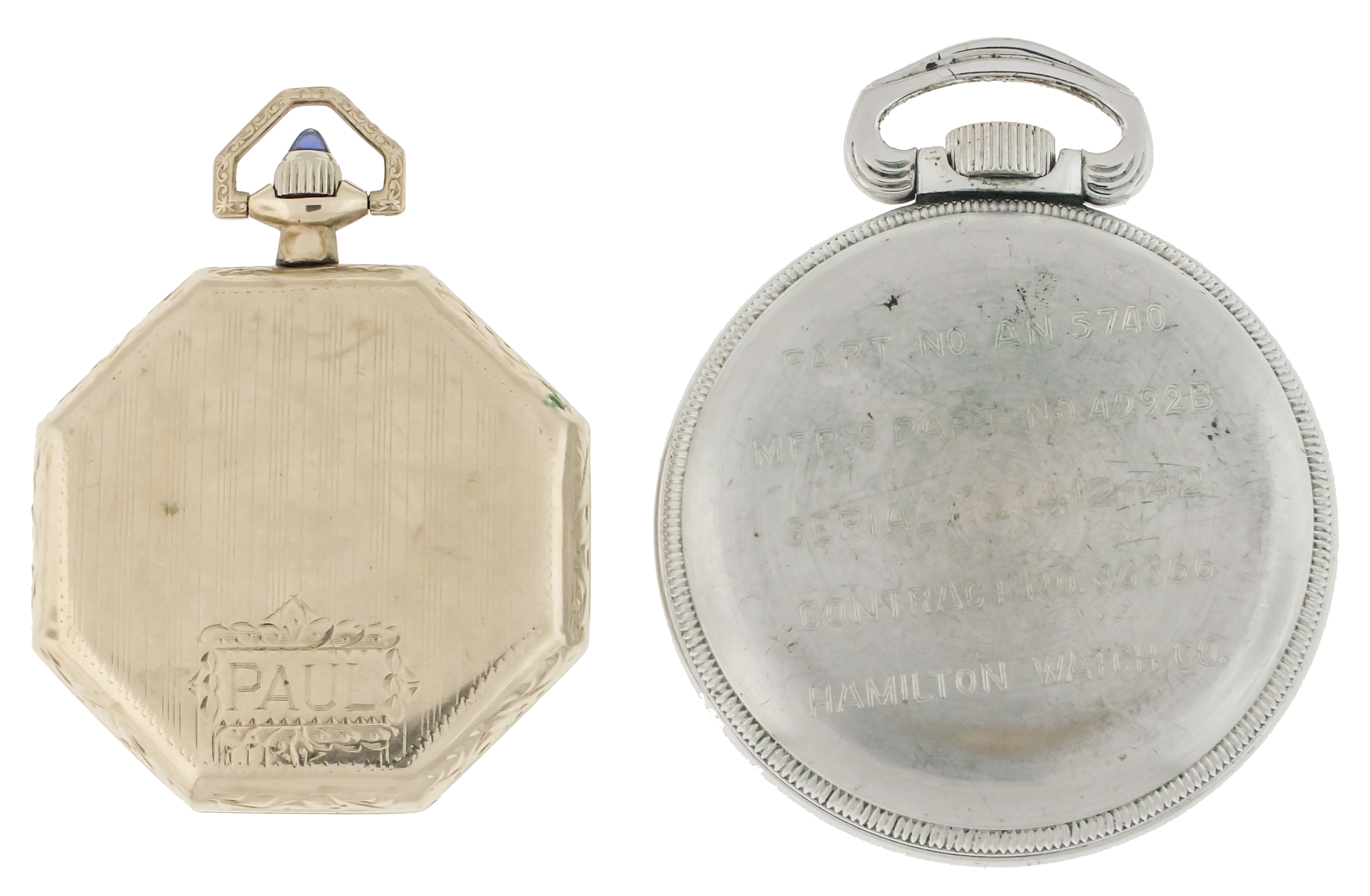 Pocket watches- 2 (Two), the first a Hamilton 4992B, 22 jewel nickel movement, arabic numeral, black painted 24 hour dial with sweep seconds, and base metal open face case with ordnance department information on back cover, serial #4C11152, the other a 12 size Waltham, 15 jewel nickel movement, arabic numeral silvered dial, 14 karat white gold, octagonal swing-out case, serial #22862908, 55.8g TW