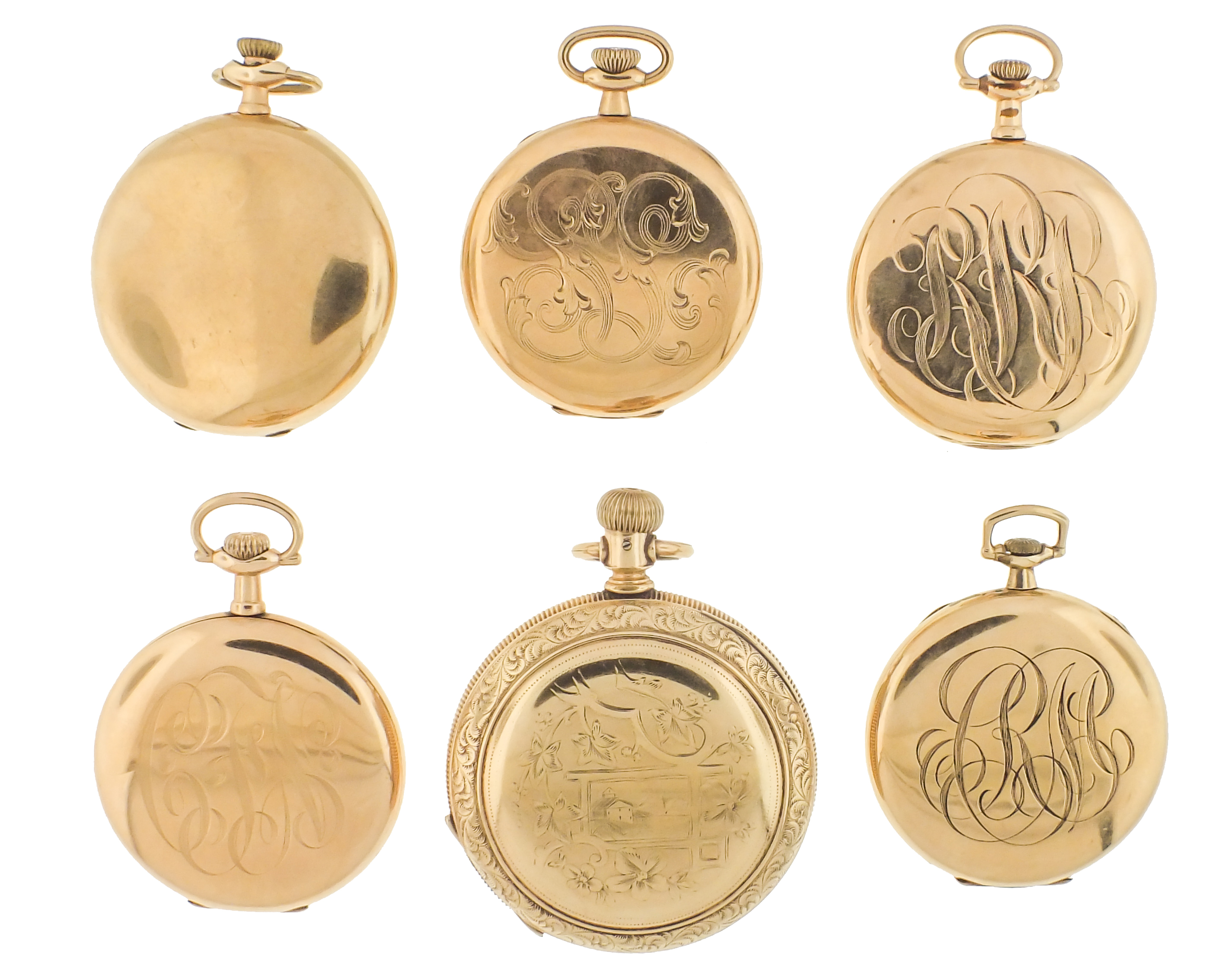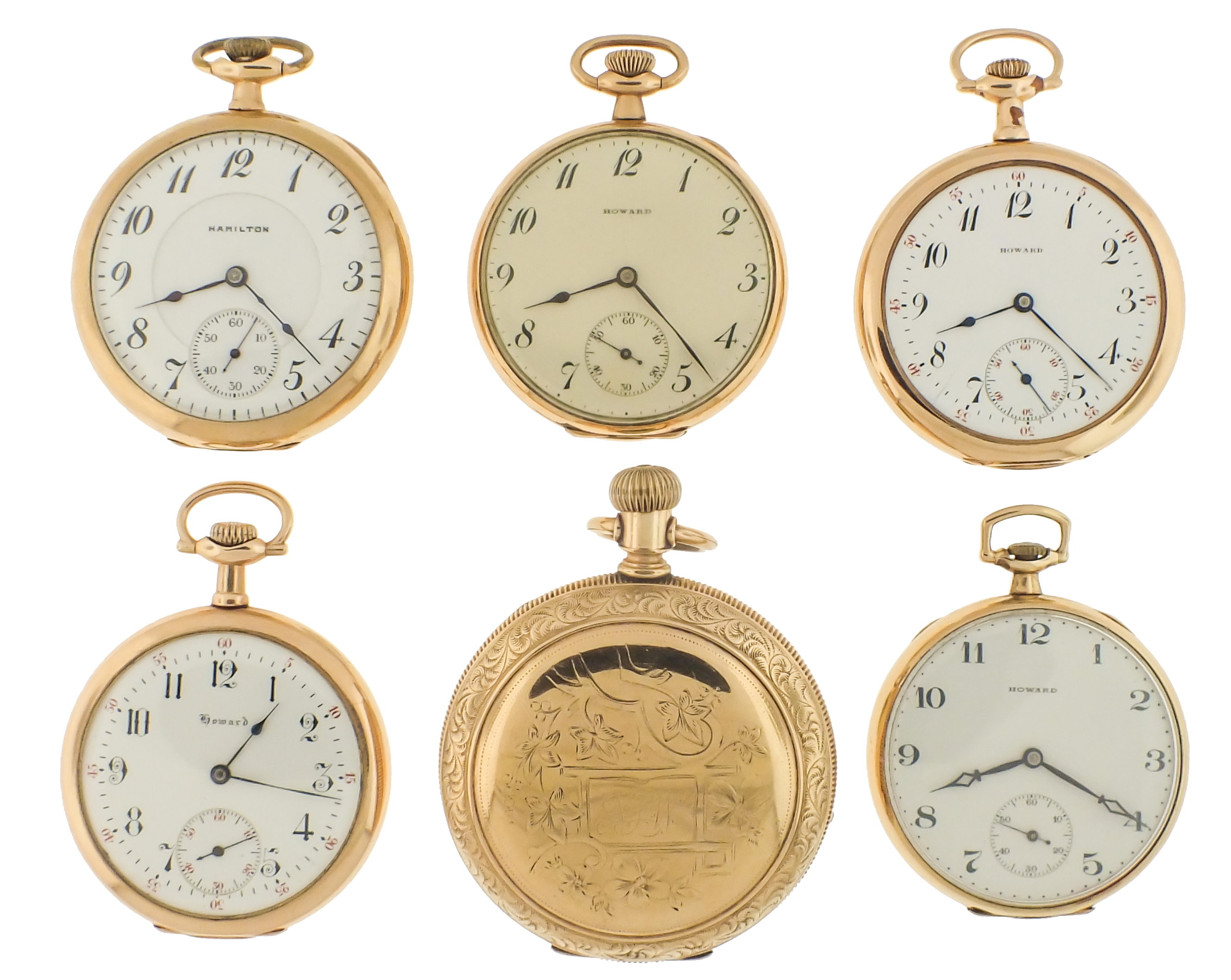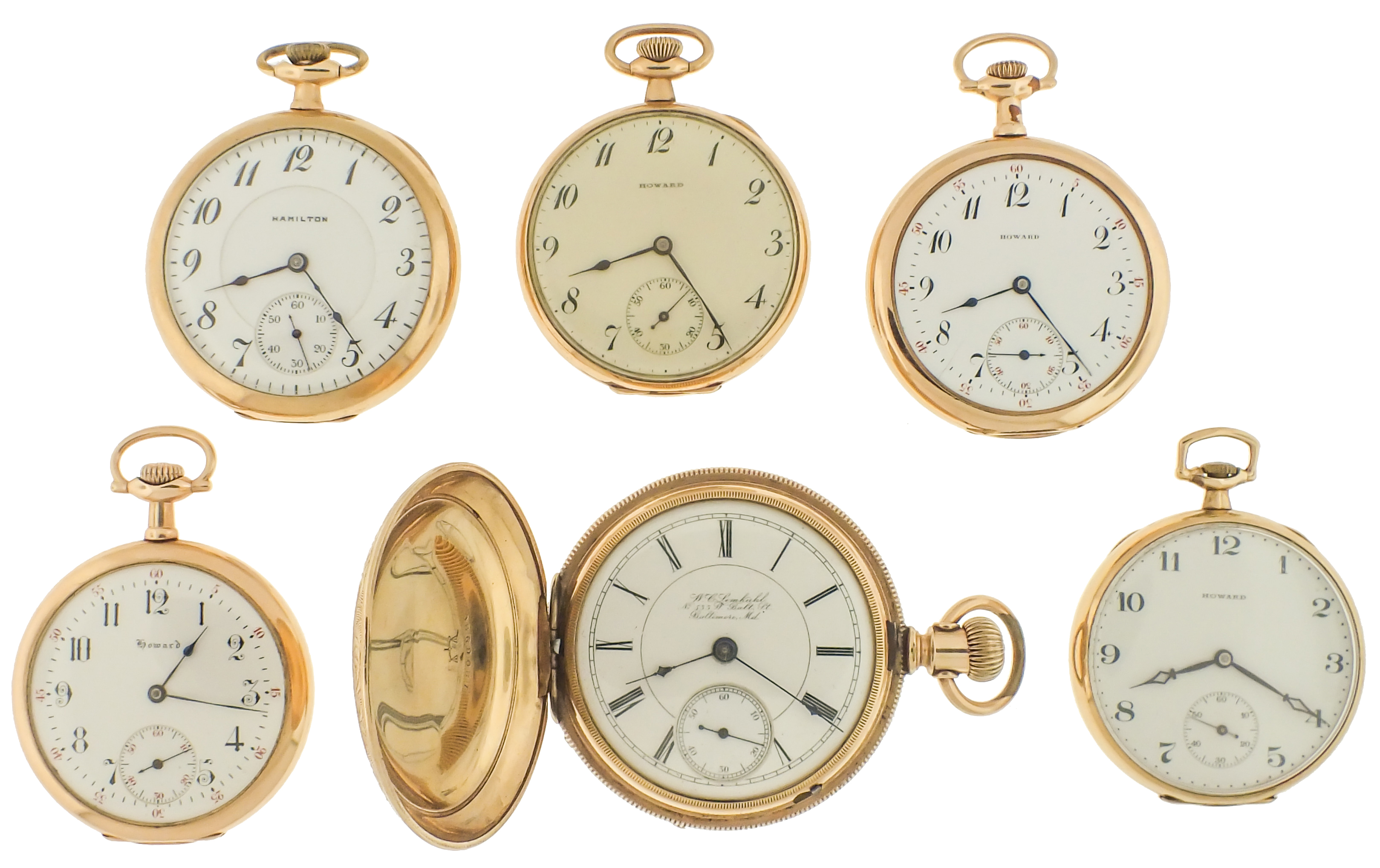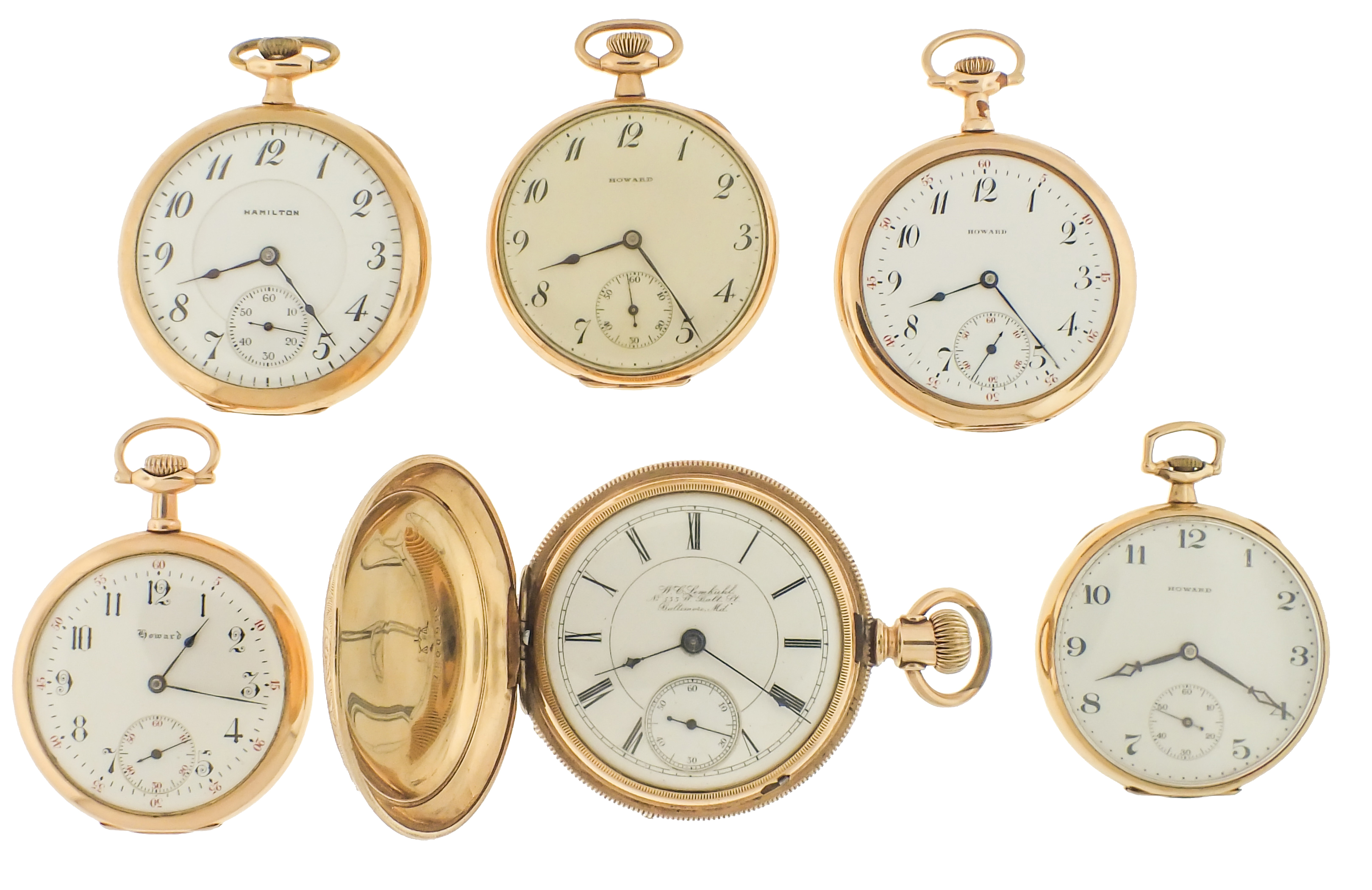 Pocket watches- 6 (Six), including four 12 size Howard Keystone, 17 and 19 jewel nickel movements, with arabic numeral white enamel dials and gold filled cases, serial #1199300, 1091275, 997954, 1178351, an 18 size Rockford model 6, 15 jewel gilt movement, roman numeral white enamel dial, gold filled hunting case, serial #190328, and a 16 size Hamilton 956, 17 jewel nickel movement, arabic numeral white enamel dial, gold filled swing-out case, serial #1285733