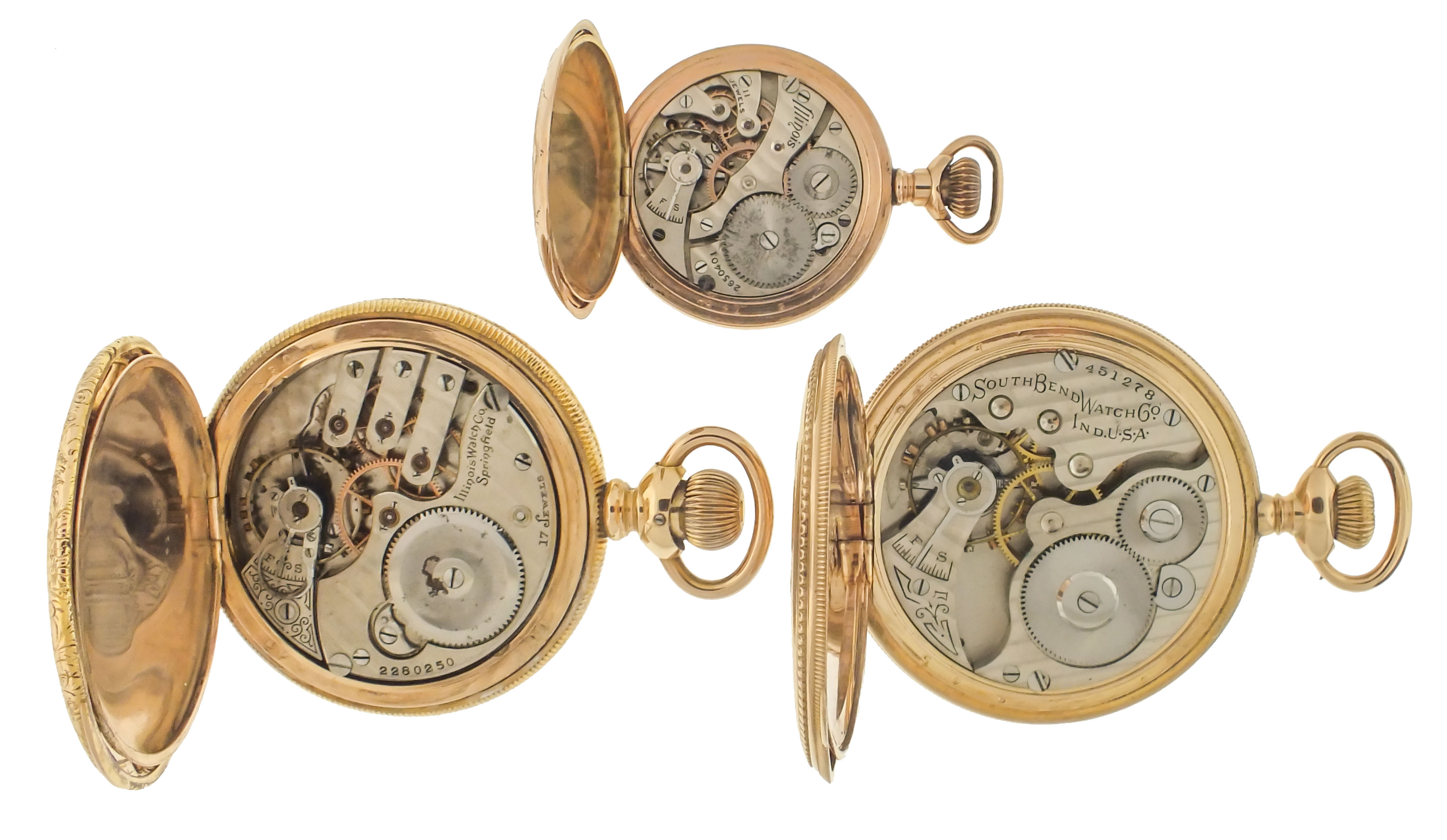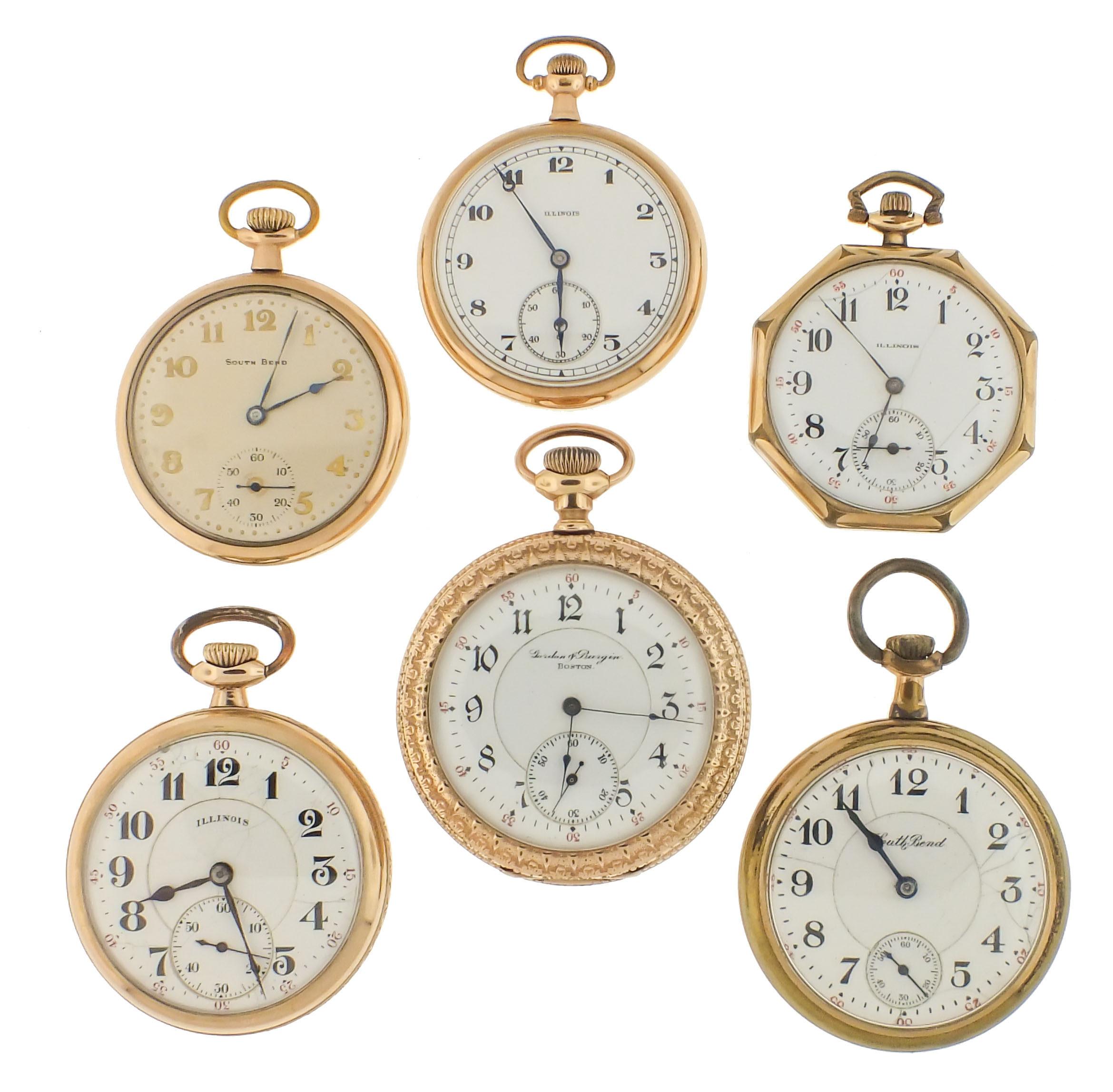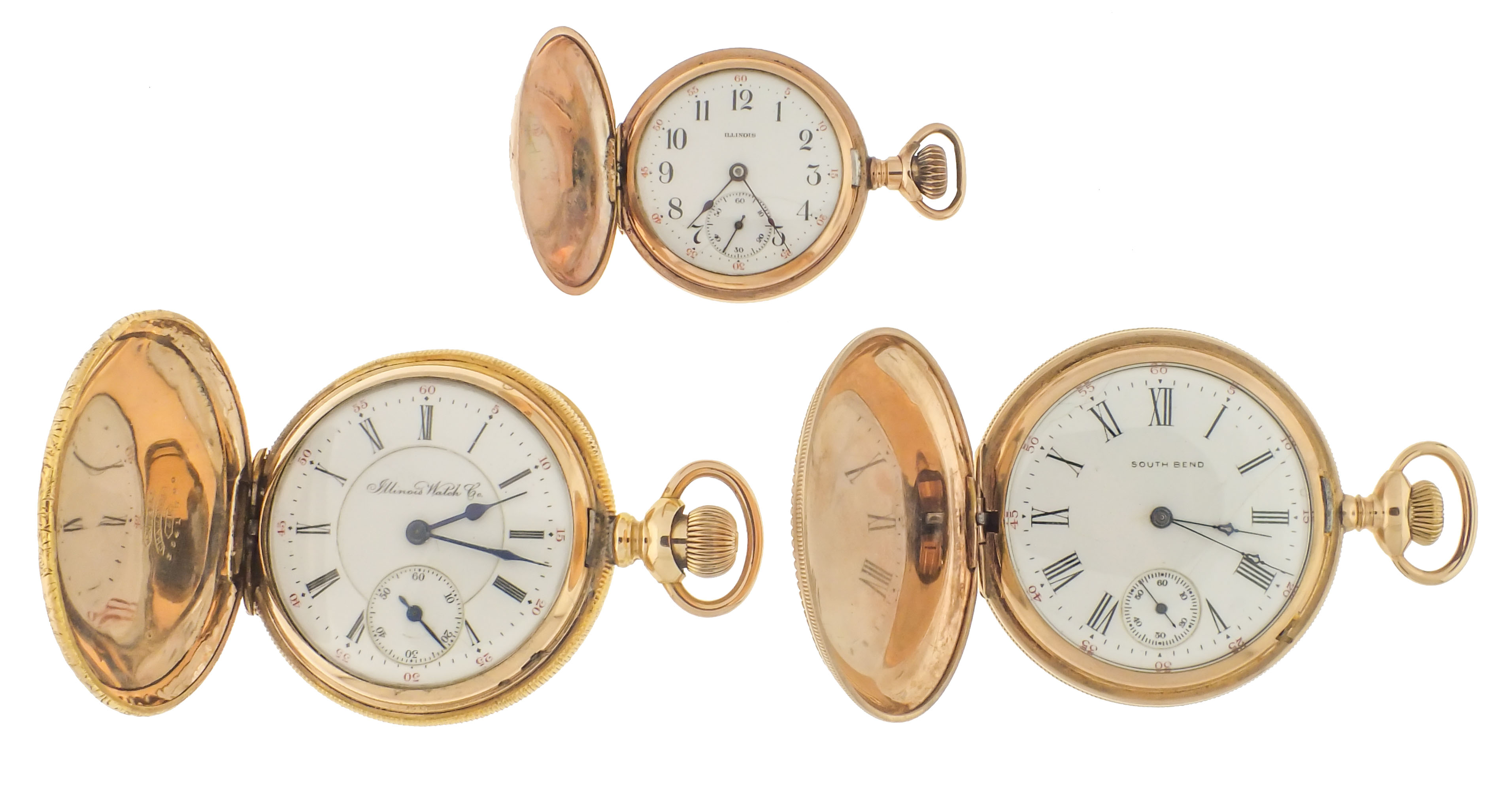 Pocket watches- 9 (Nine), six Illinois and three South Bend, 7- 19 jewel movements, white enamel and metal dials, gold filled hunting and open face cases